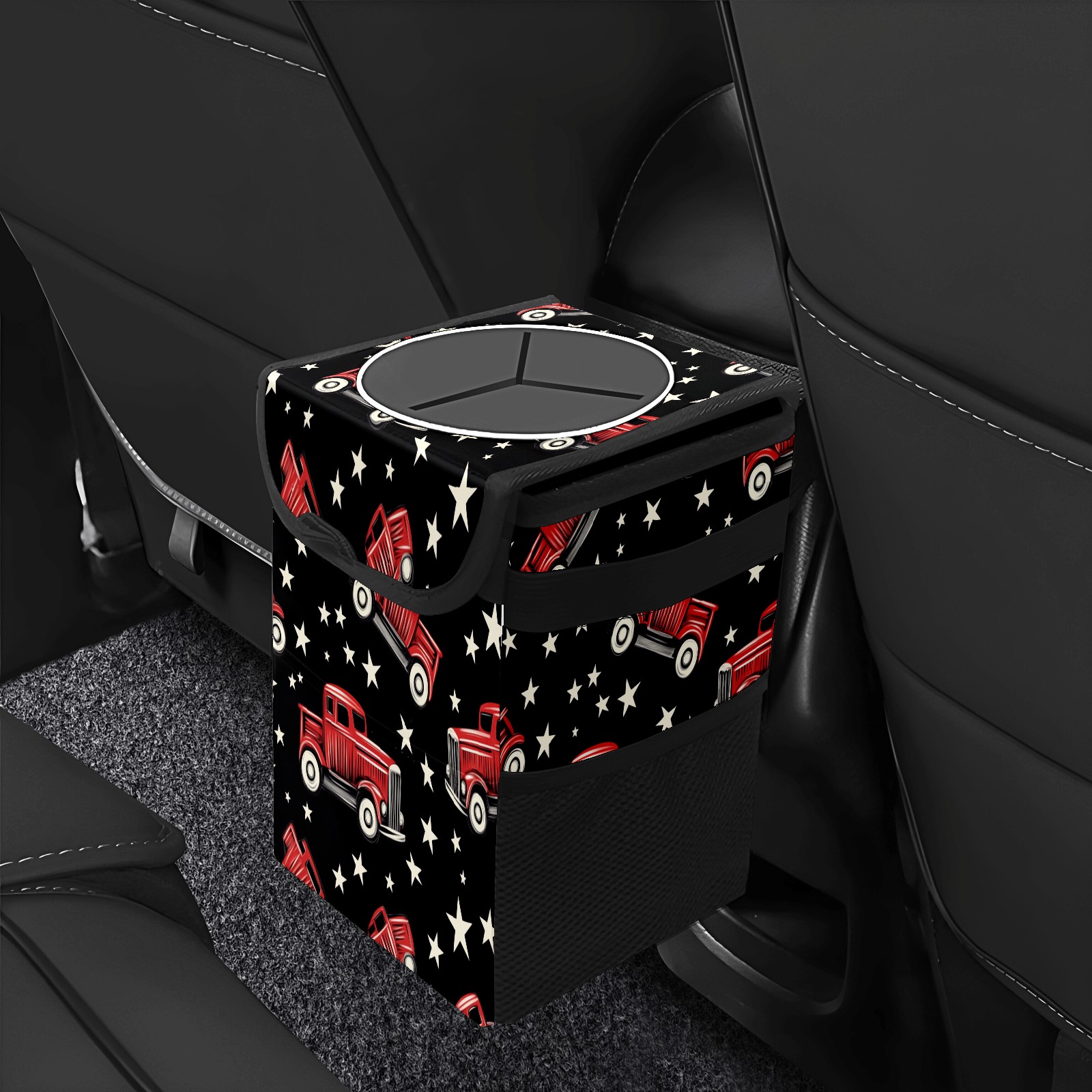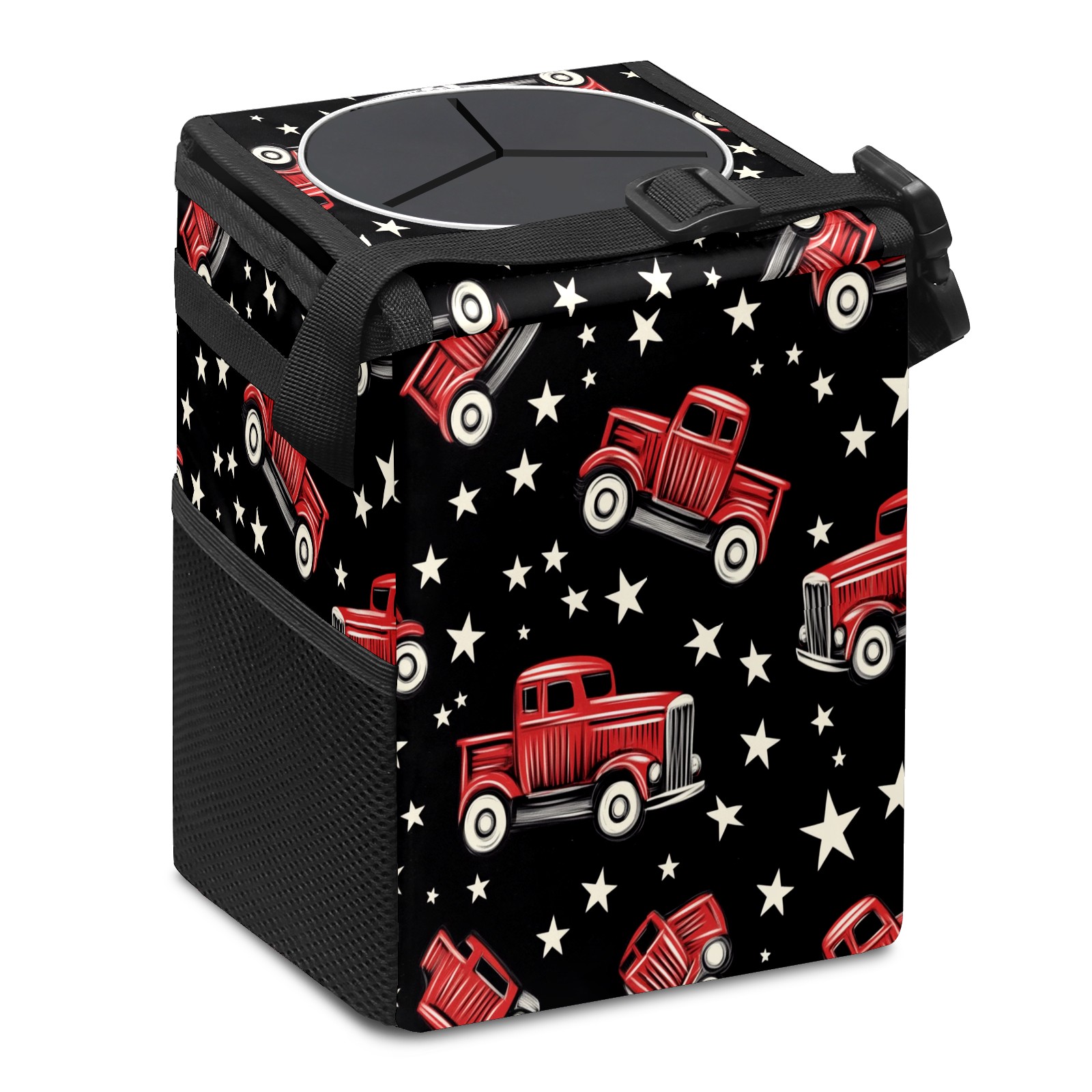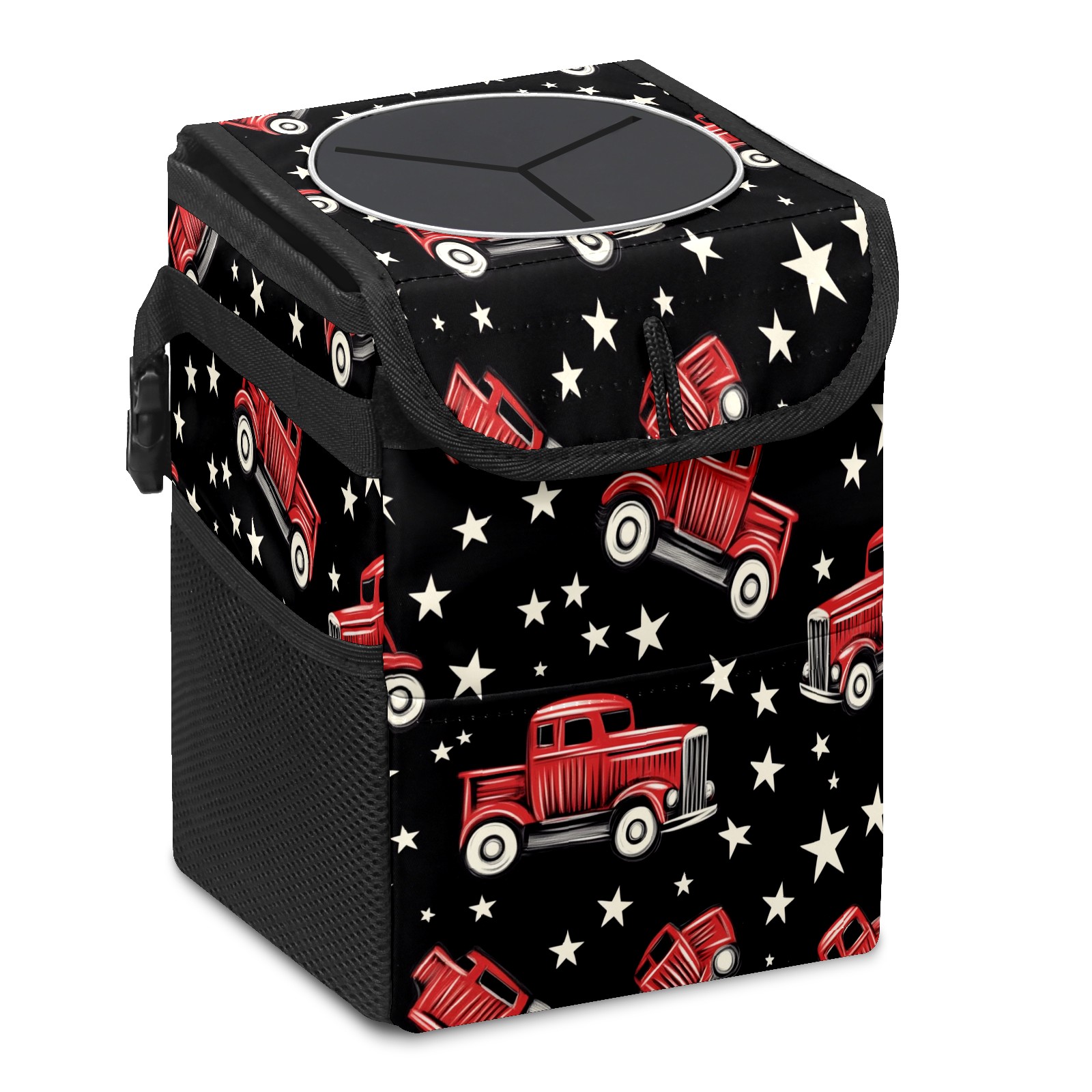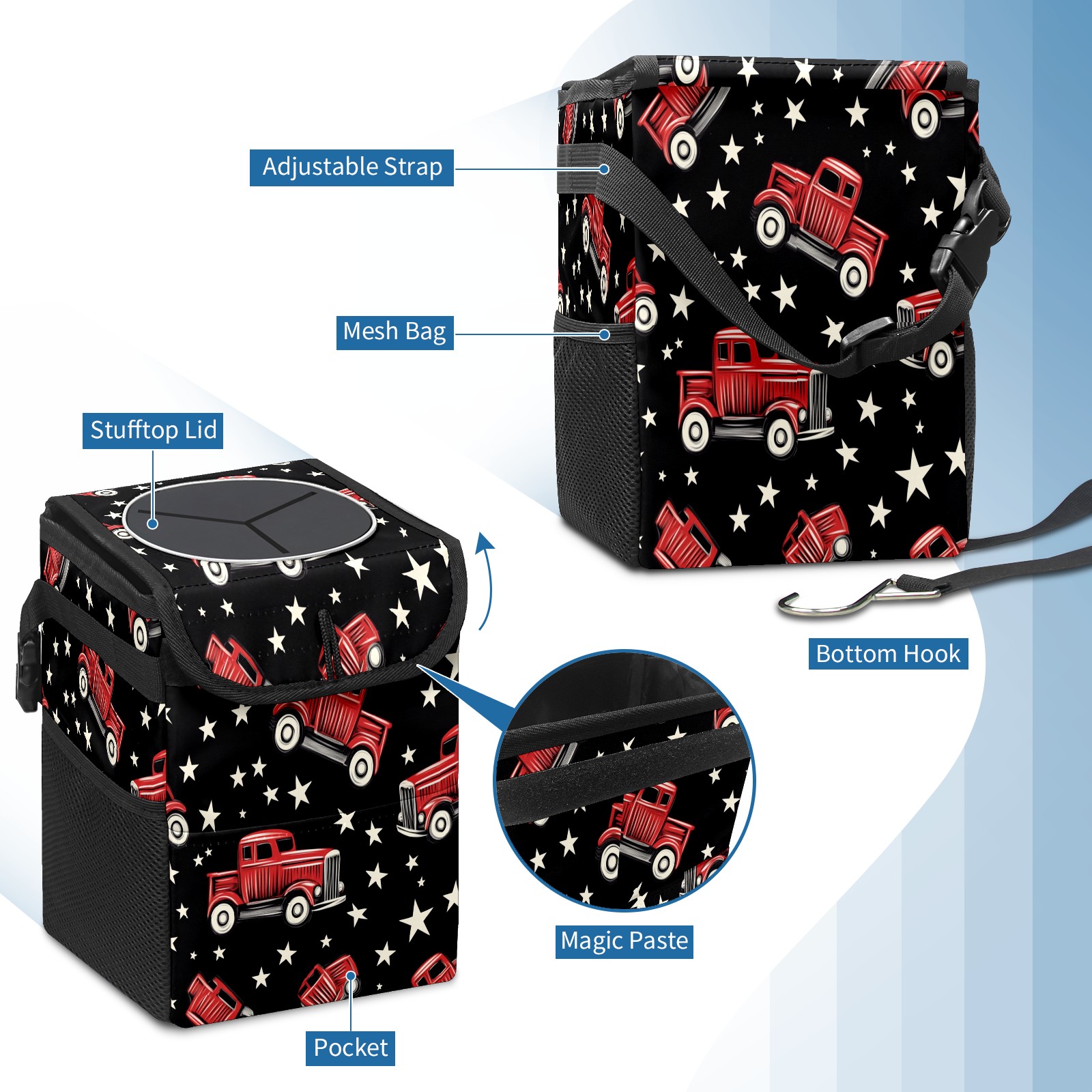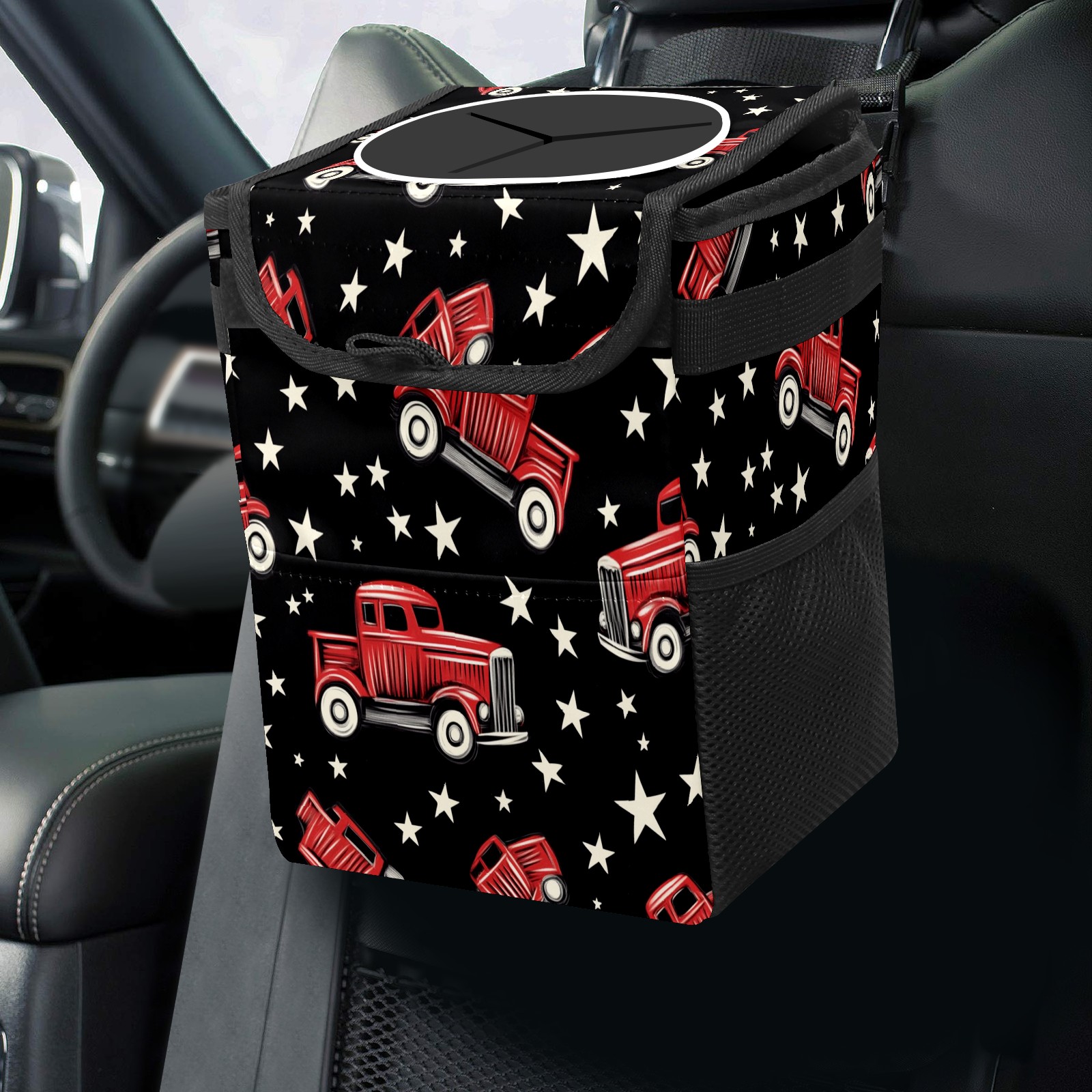 Car Trash Can with Lid, Small Portable Hanging Automotive Garbage Bin for Vehicles, Leakproof Waste Bag Container for SUV Truck Van Interior Auto Travel Road Trips(Red Vintage Trucks)