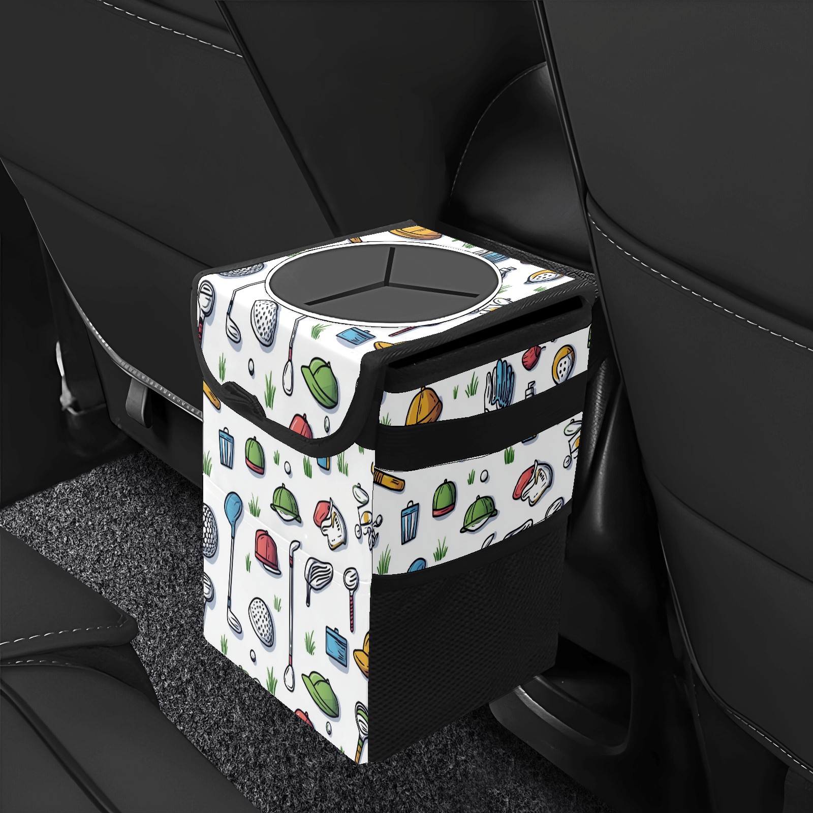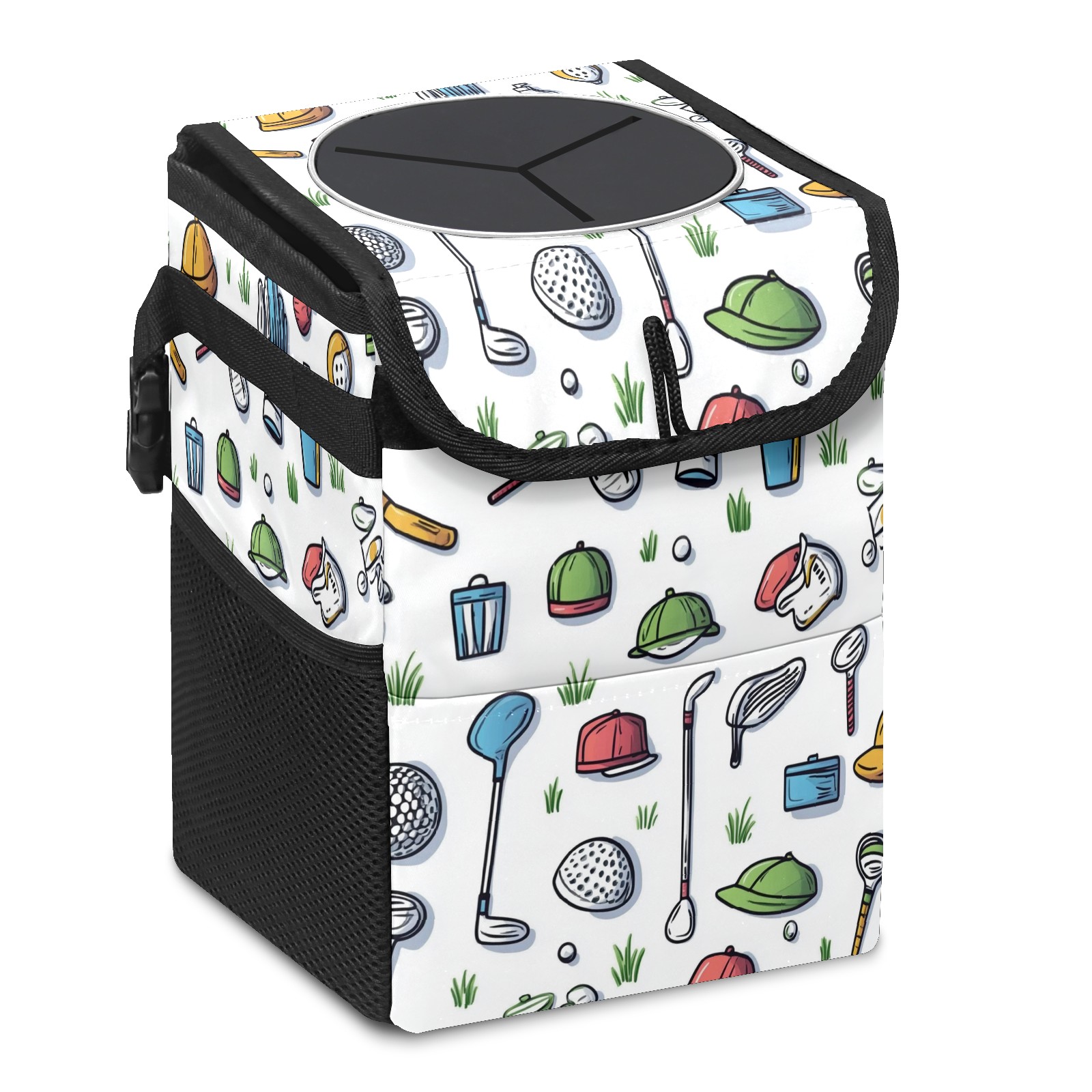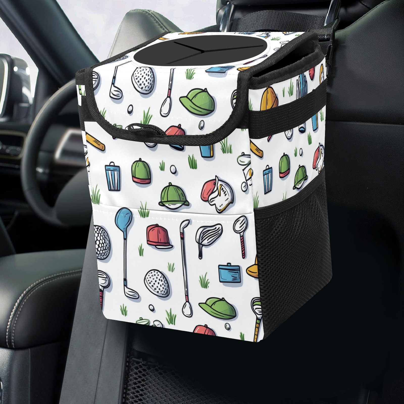 Car Trash Can with Lid, Small Portable Hanging Automotive Garbage Bin for Vehicles, Leakproof Waste Bag Container for SUV Truck Van Interior Auto Travel Road Trips(Golf Elements)