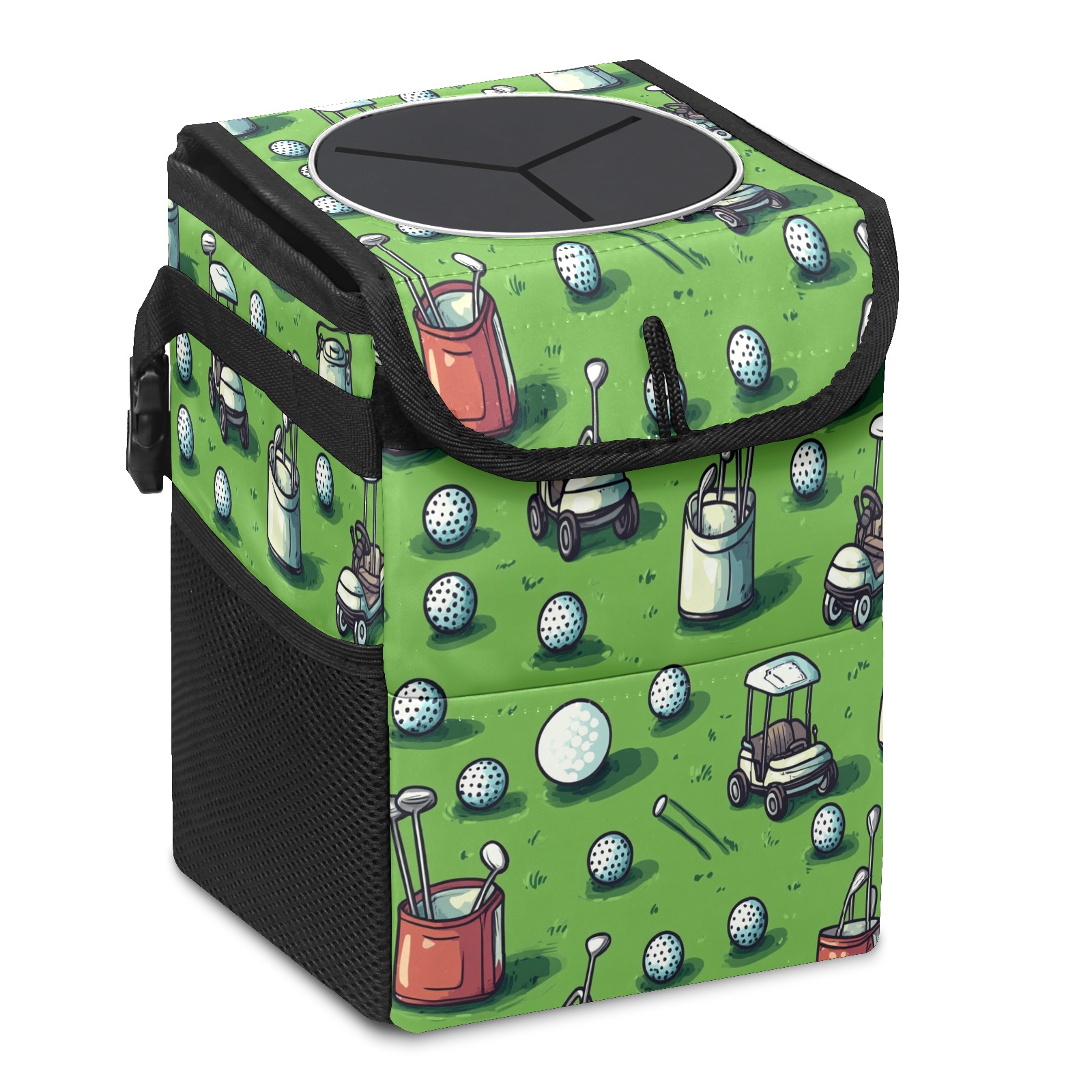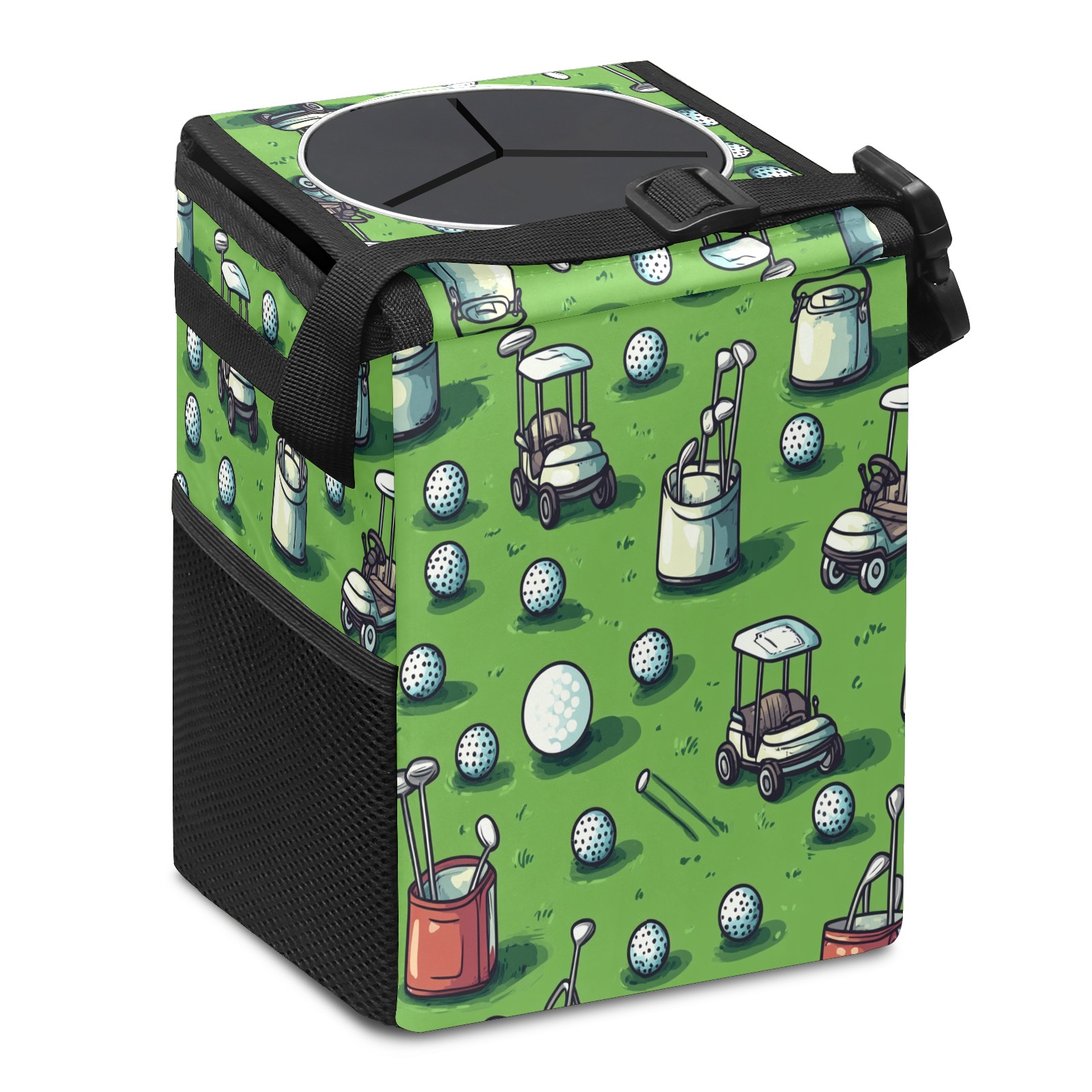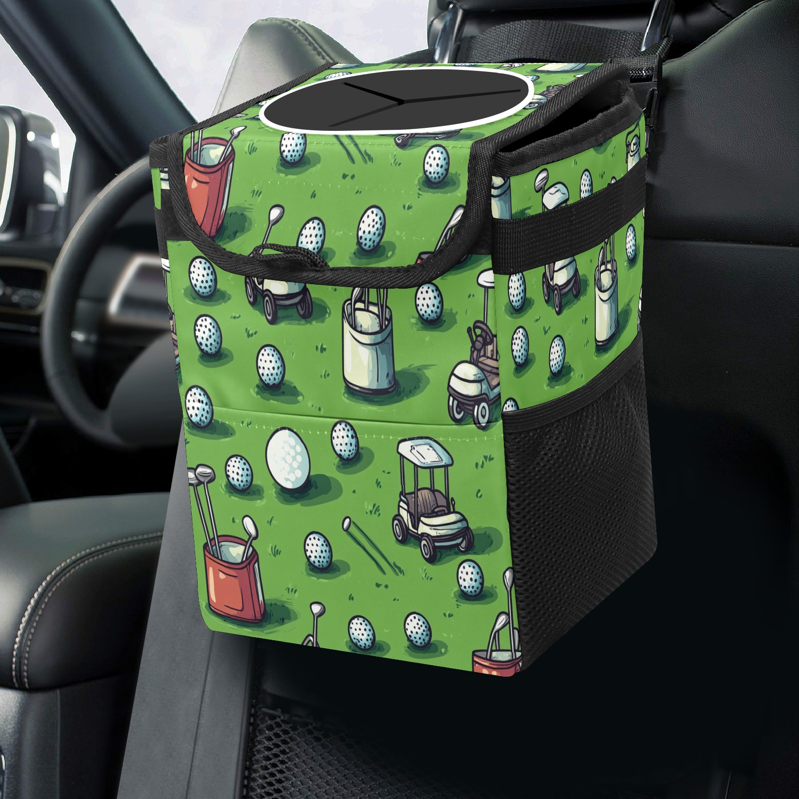 Car Trash Can with Lid, Small Portable Hanging Automotive Garbage Bin for Vehicles, Leakproof Waste Bag Container for SUV Truck Van Interior Auto Travel Road Trips(Golf Balls And Carts)