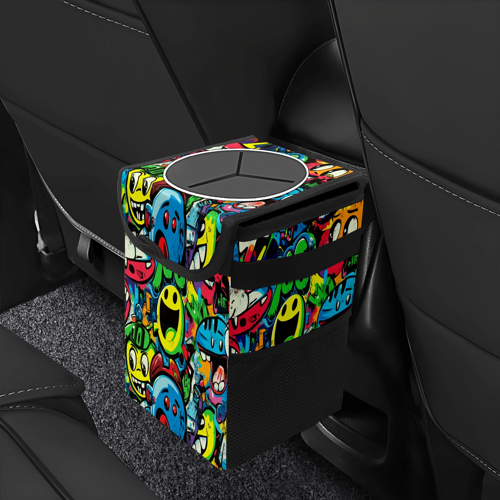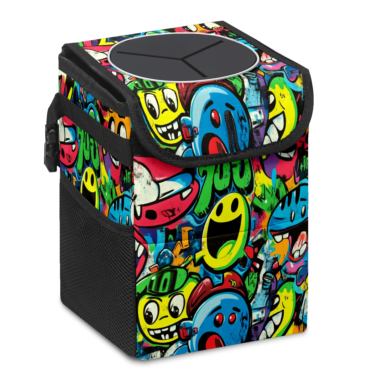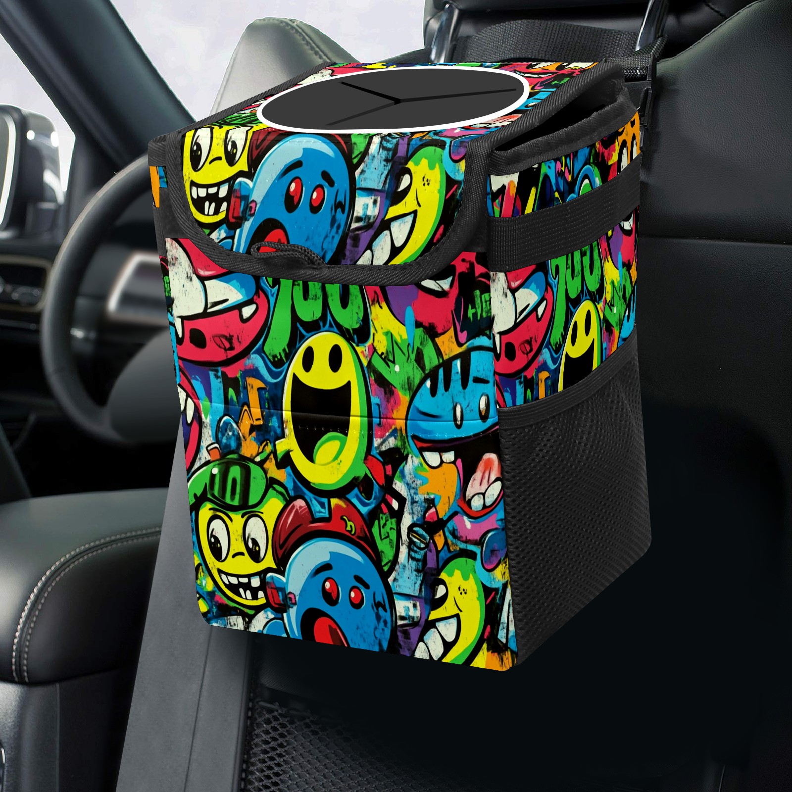 Car Trash Can with Lid, Small Portable Hanging Automotive Garbage Bin for Vehicles, Leakproof Waste Bag Container for SUV Truck Van Interior Auto Travel Road Trips(Vibrant Cartoon-style Pattern)