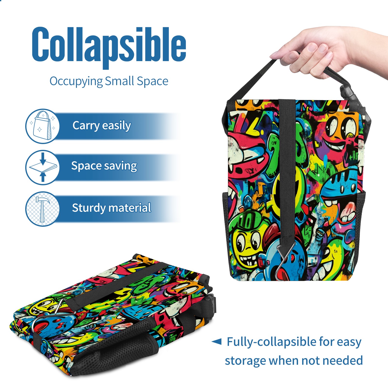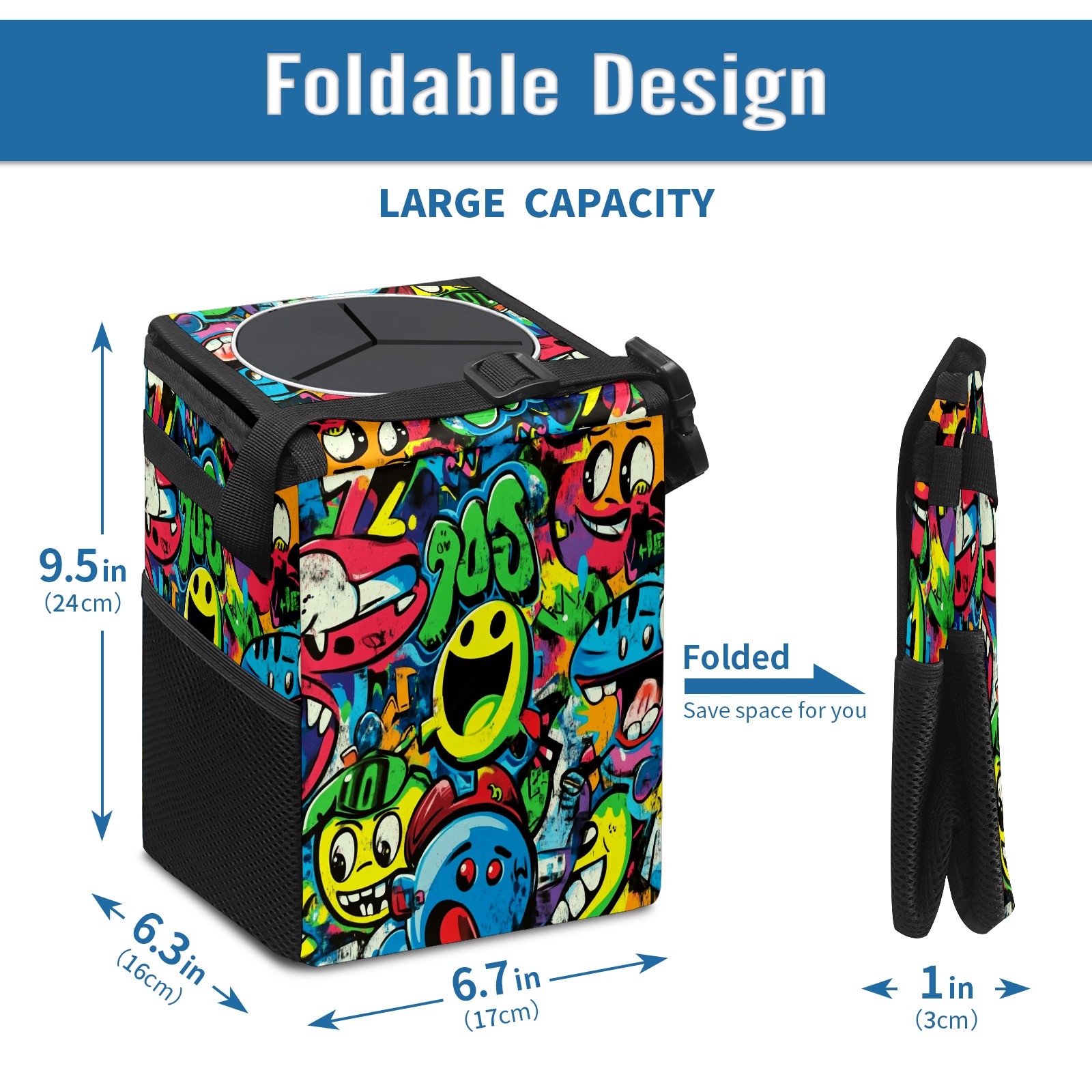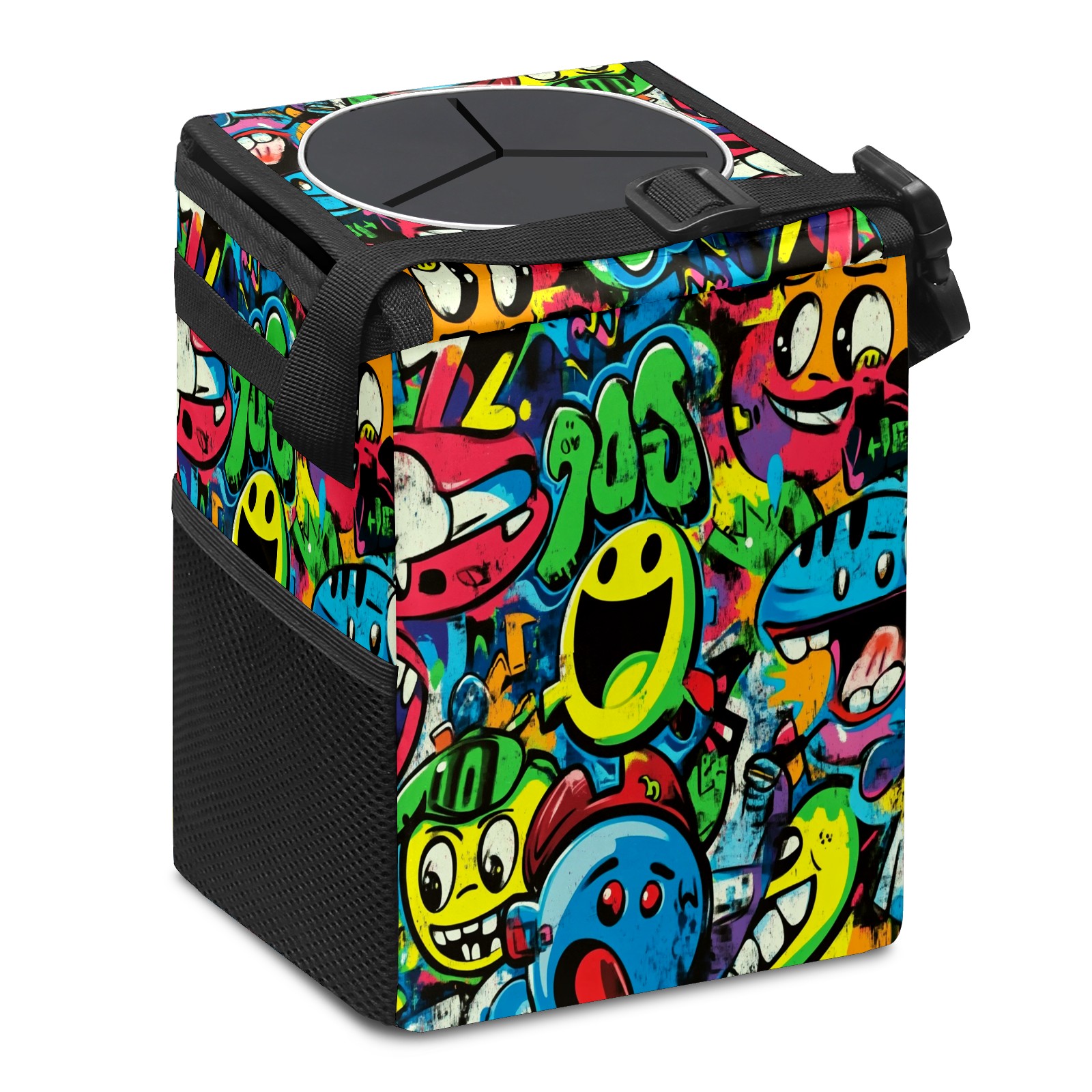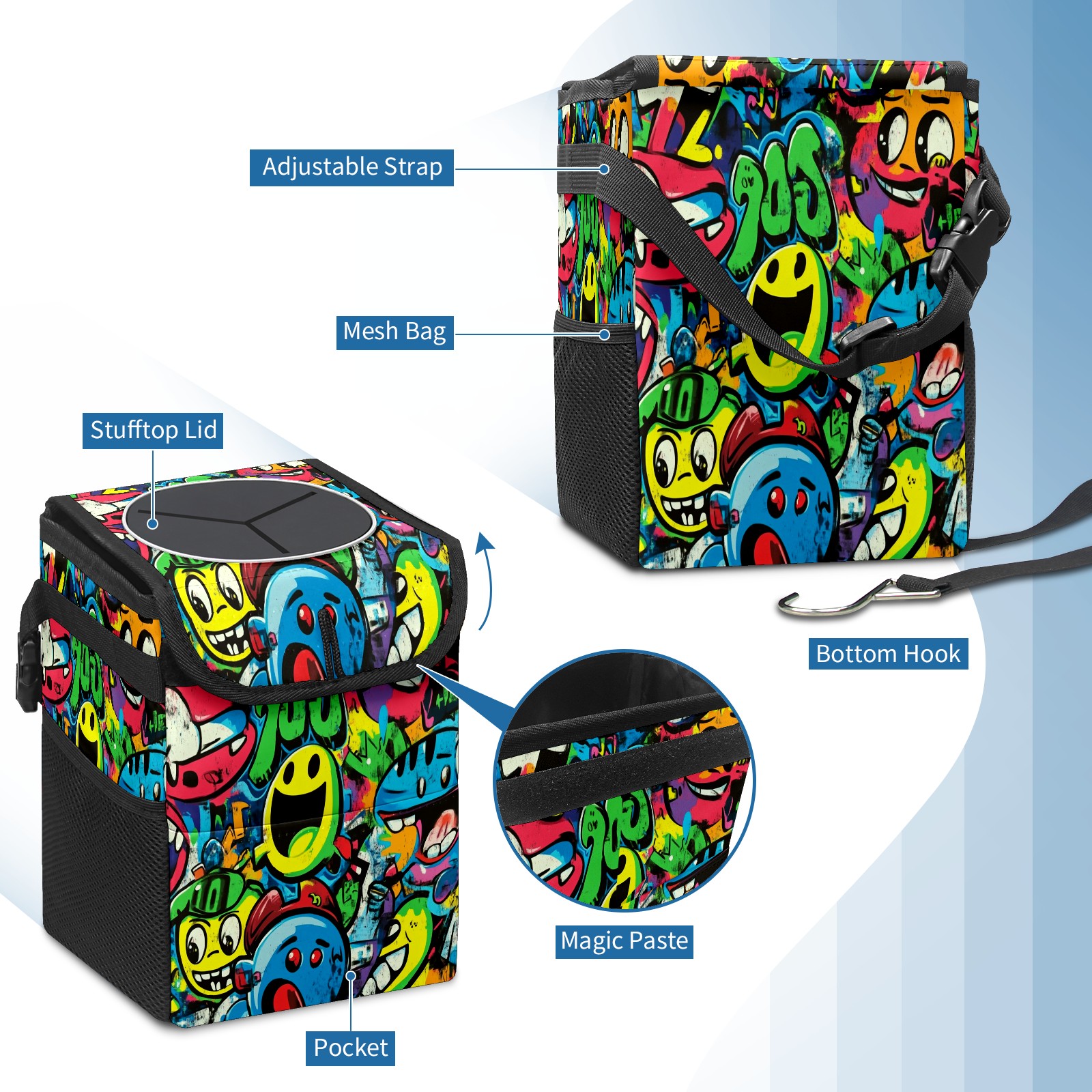 Car Trash Can with Lid, Small Portable Hanging Automotive Garbage Bin for Vehicles, Leakproof Waste Bag Container for SUV Truck Van Interior Auto Travel Road Trips(Vibrant Cartoon-style Pattern)