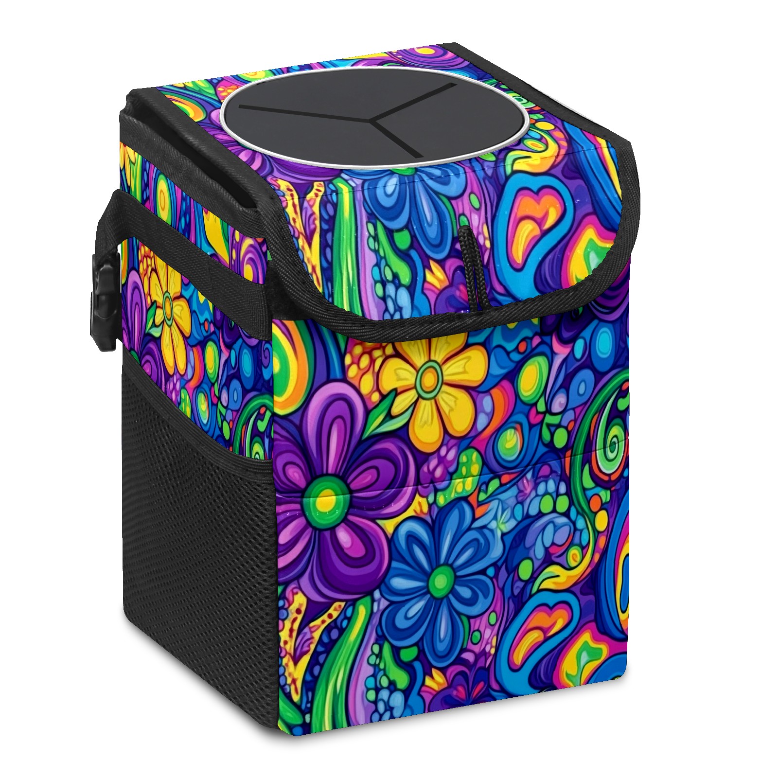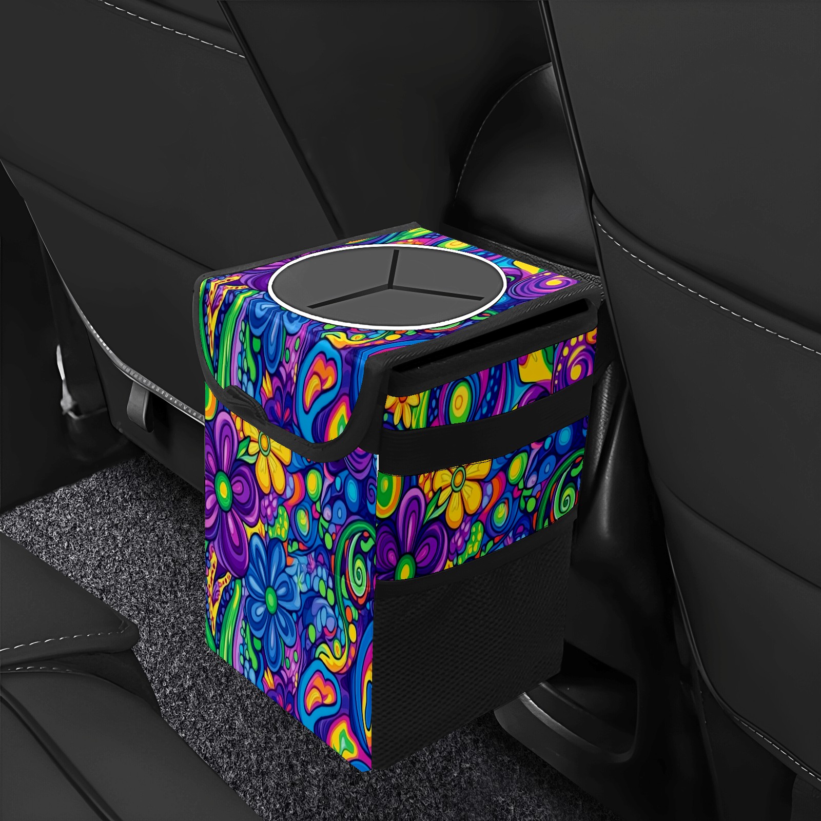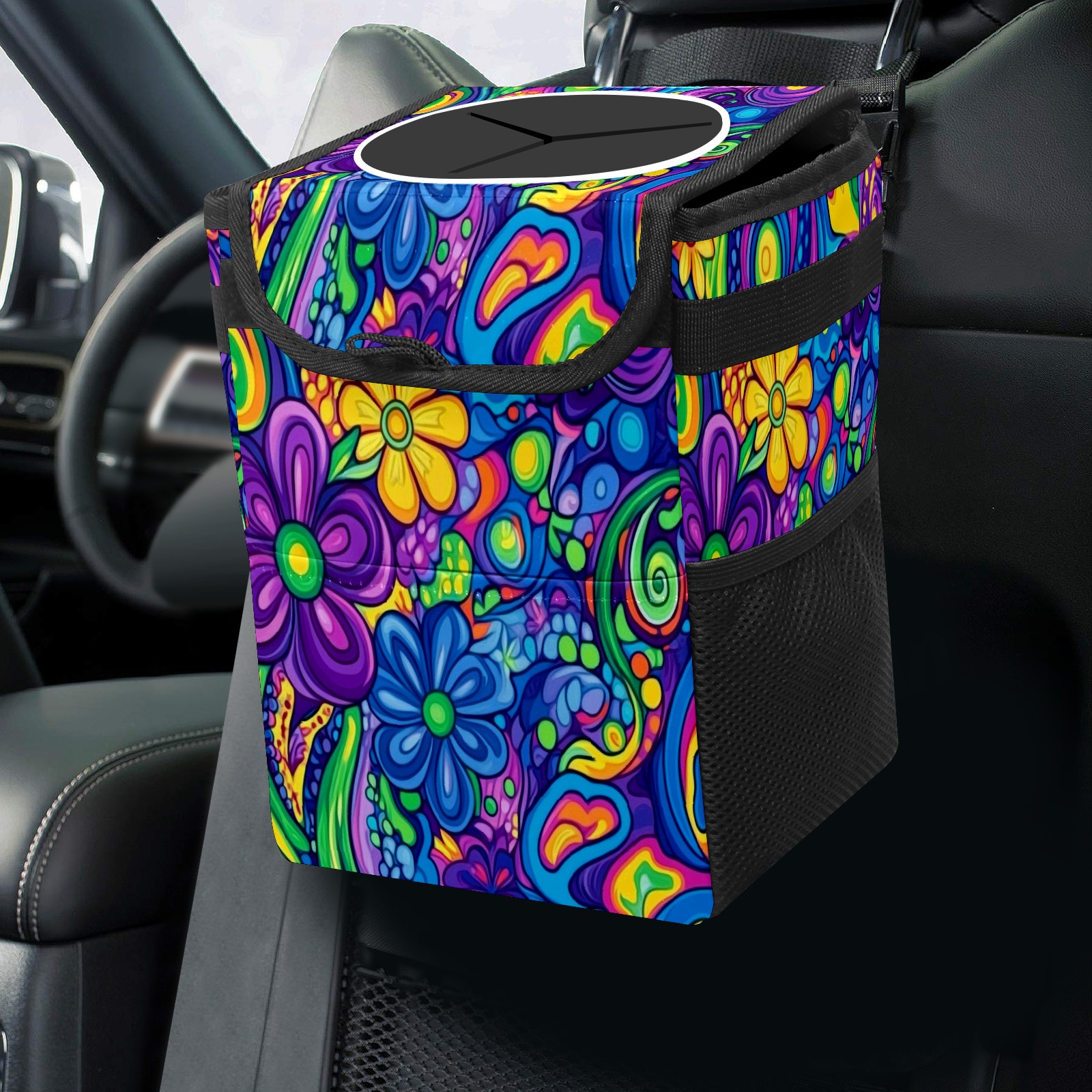 Car Trash Can with Lid, Small Portable Hanging Automotive Garbage Bin for Vehicles, Leakproof Waste Bag Container for SUV Truck Van Interior Auto Travel Road Trips(Psychedelic Patterns)