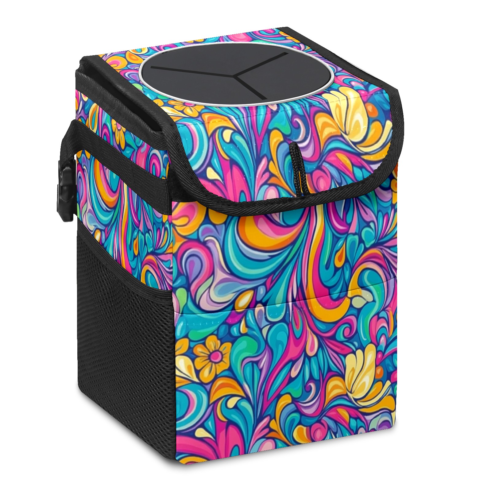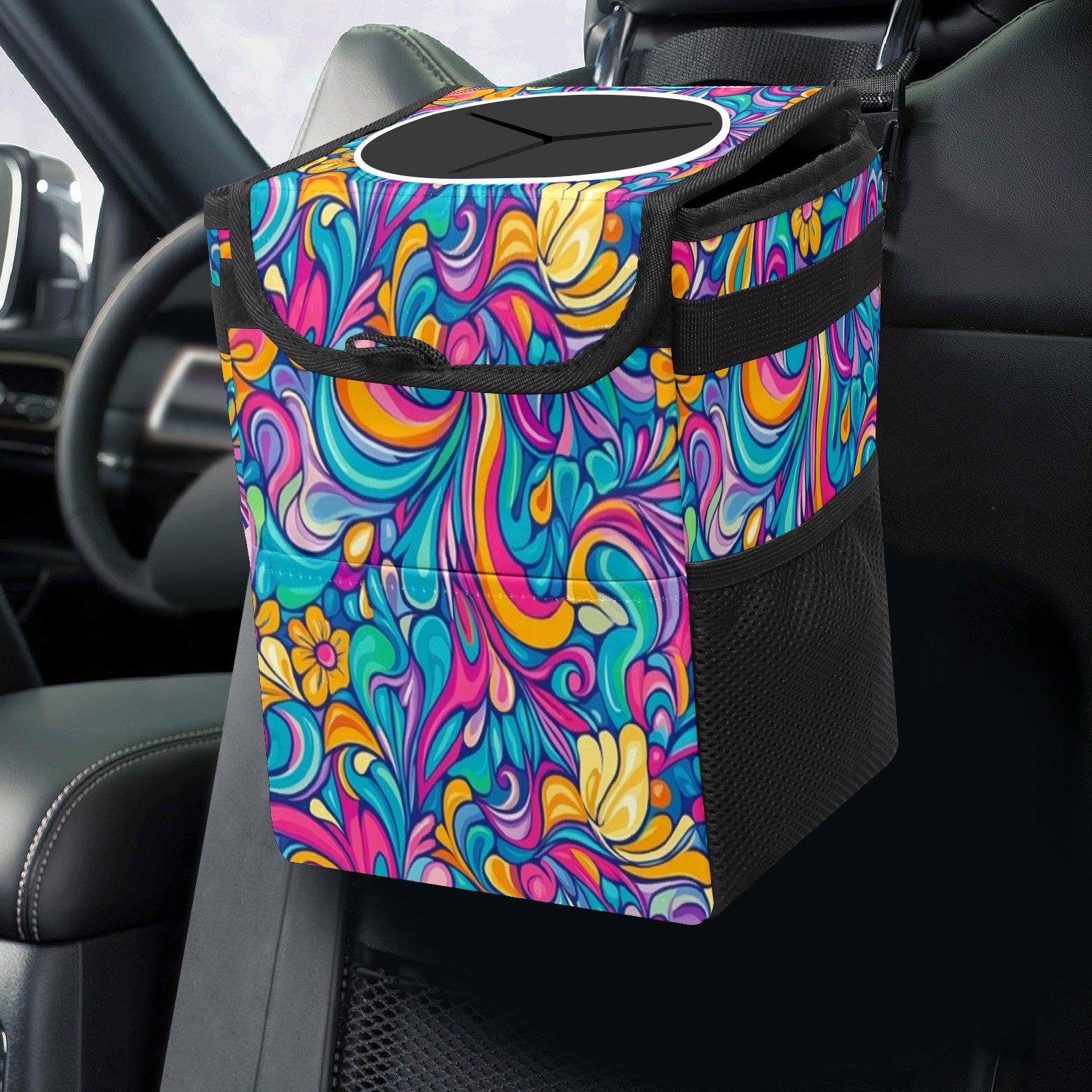 Car Trash Can with Lid, Small Portable Hanging Automotive Garbage Bin for Vehicles, Leakproof Waste Bag Container for SUV Truck Van Interior Auto Travel Road Trips(Intricate Pattern)