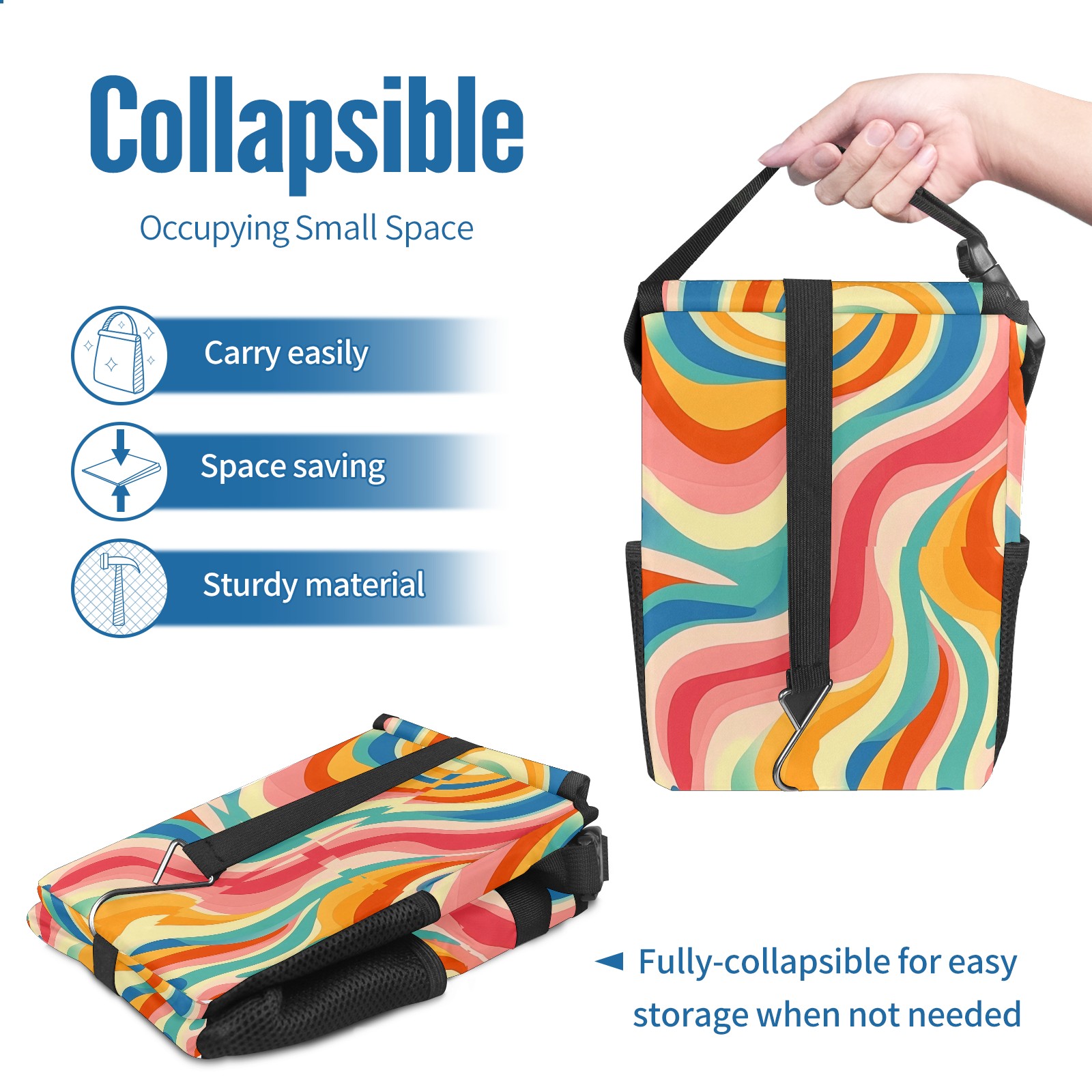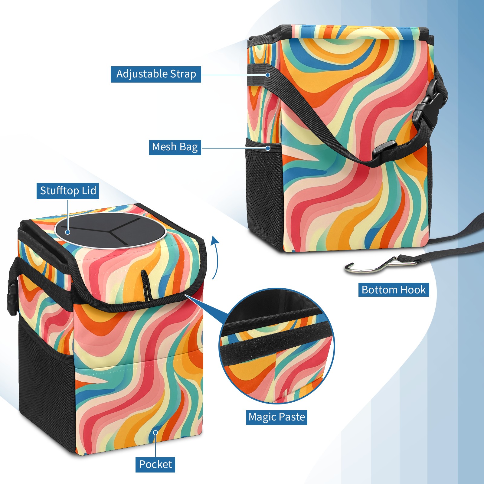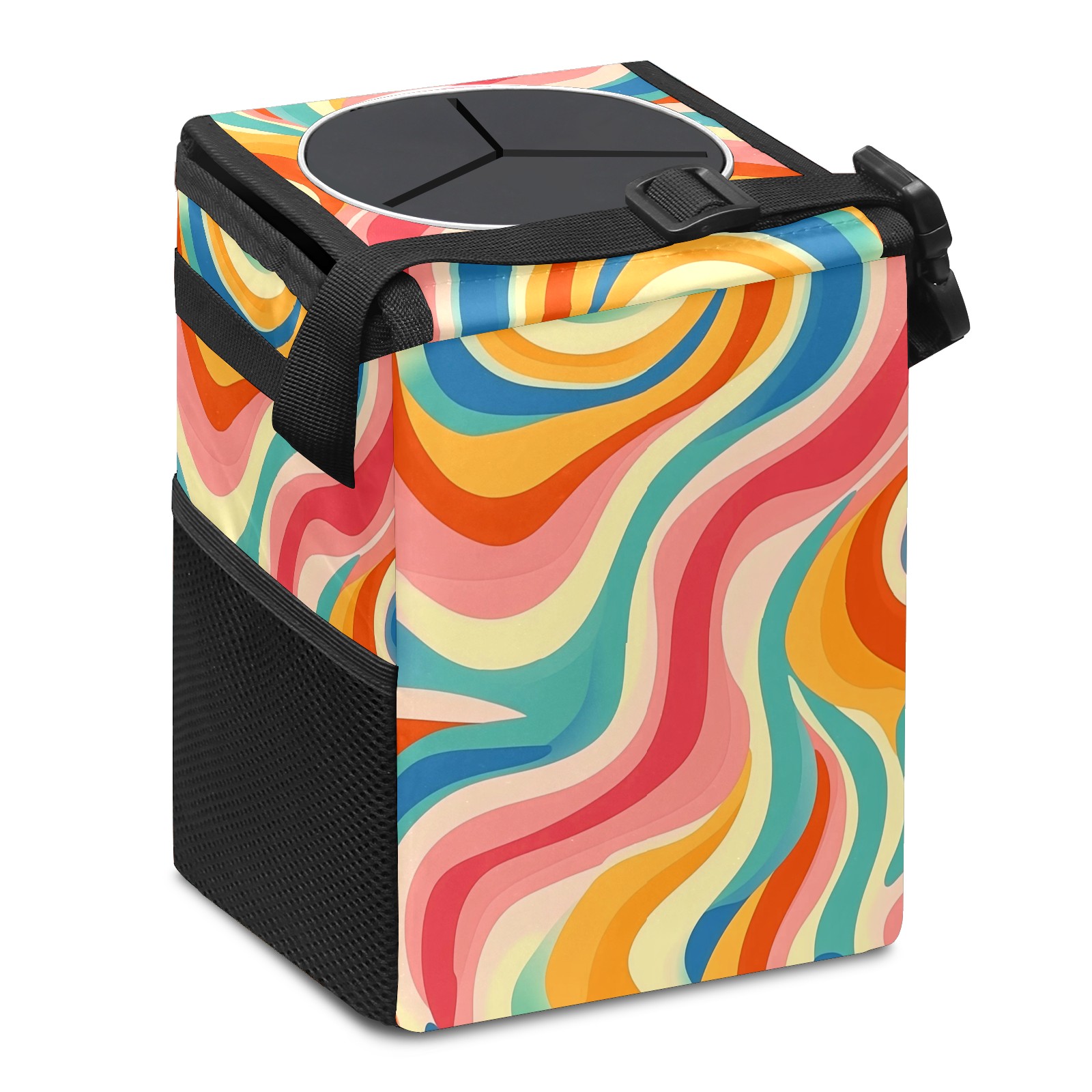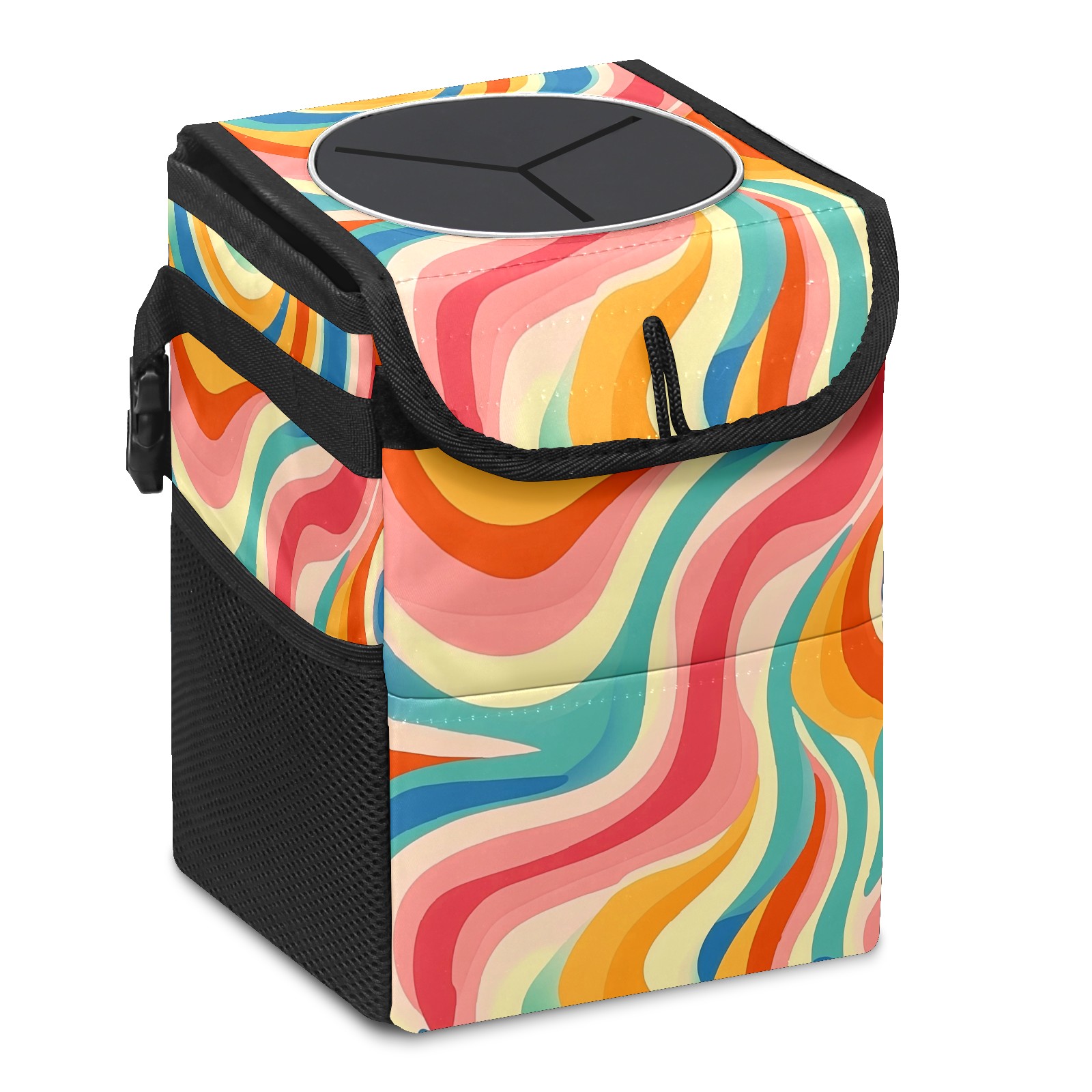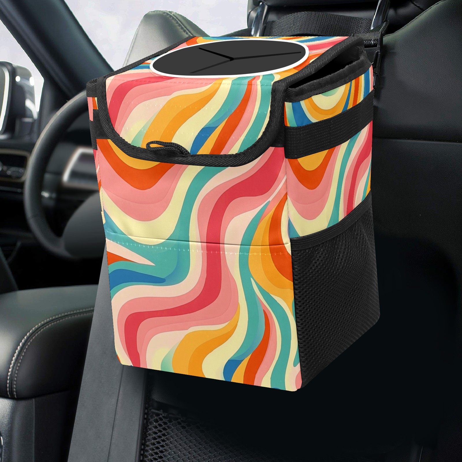 Car Trash Can with Lid, Small Portable Hanging Automotive Garbage Bin for Vehicles, Leakproof Waste Bag Container for SUV Truck Van Interior Auto Travel Road Trips(Colorful Wavy Patterns)