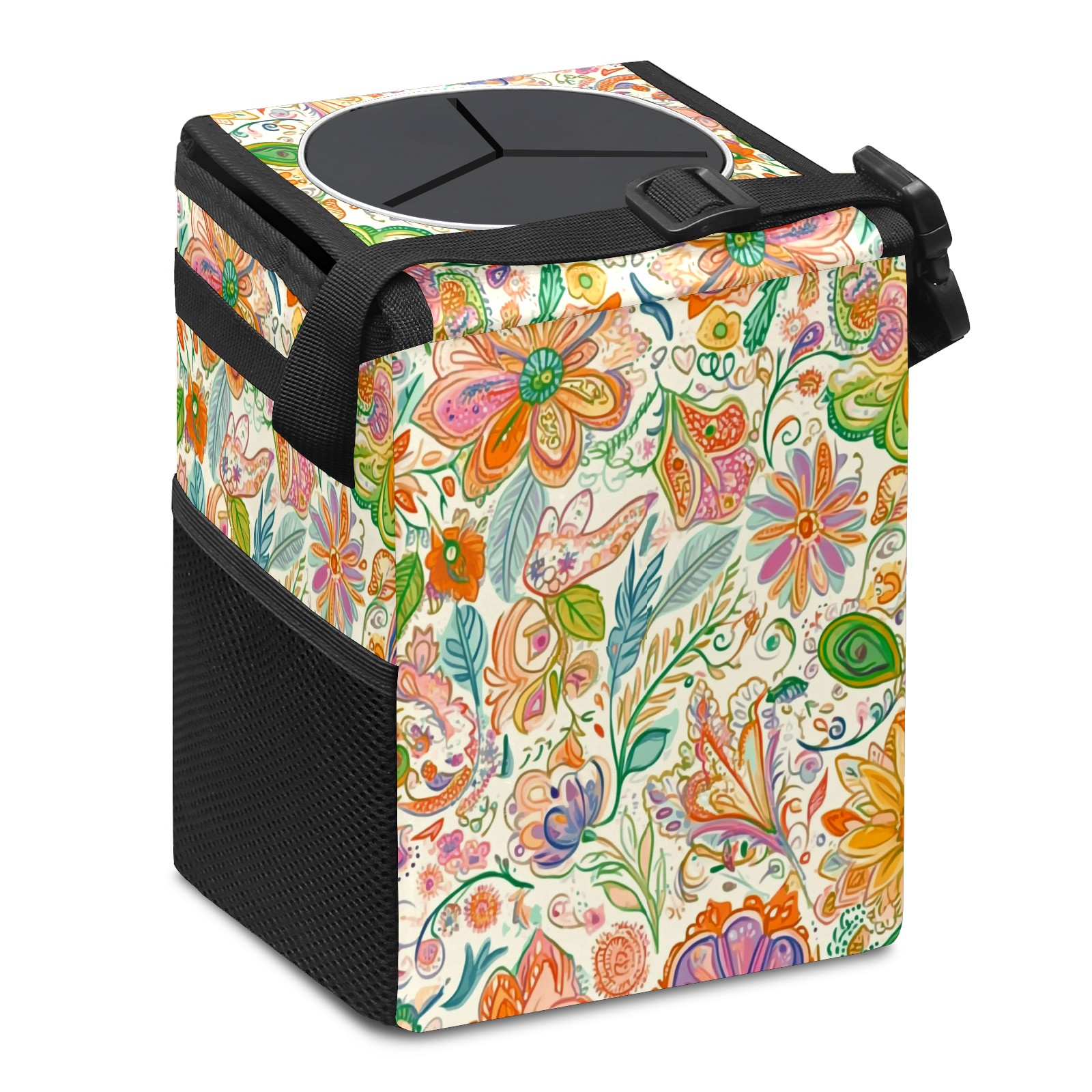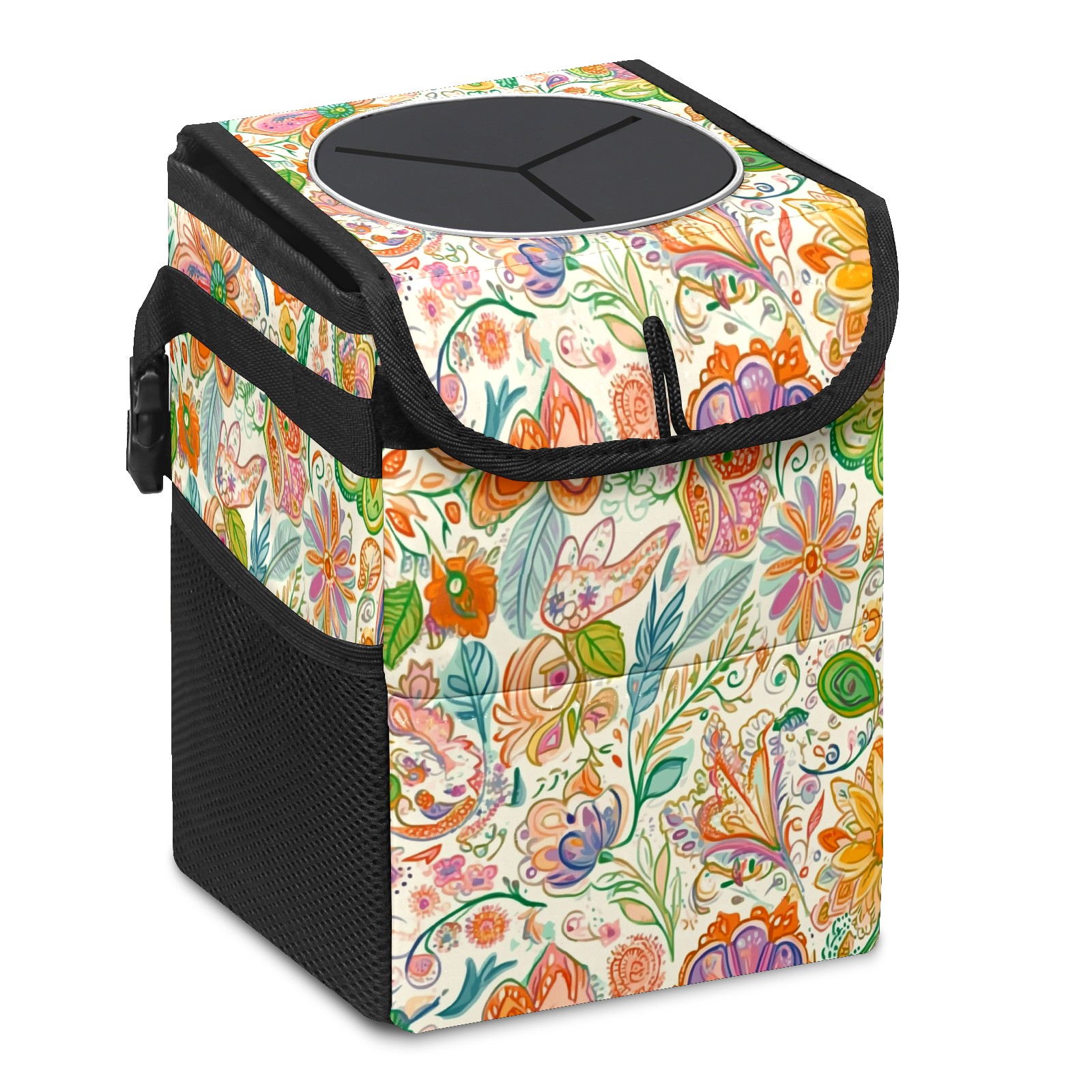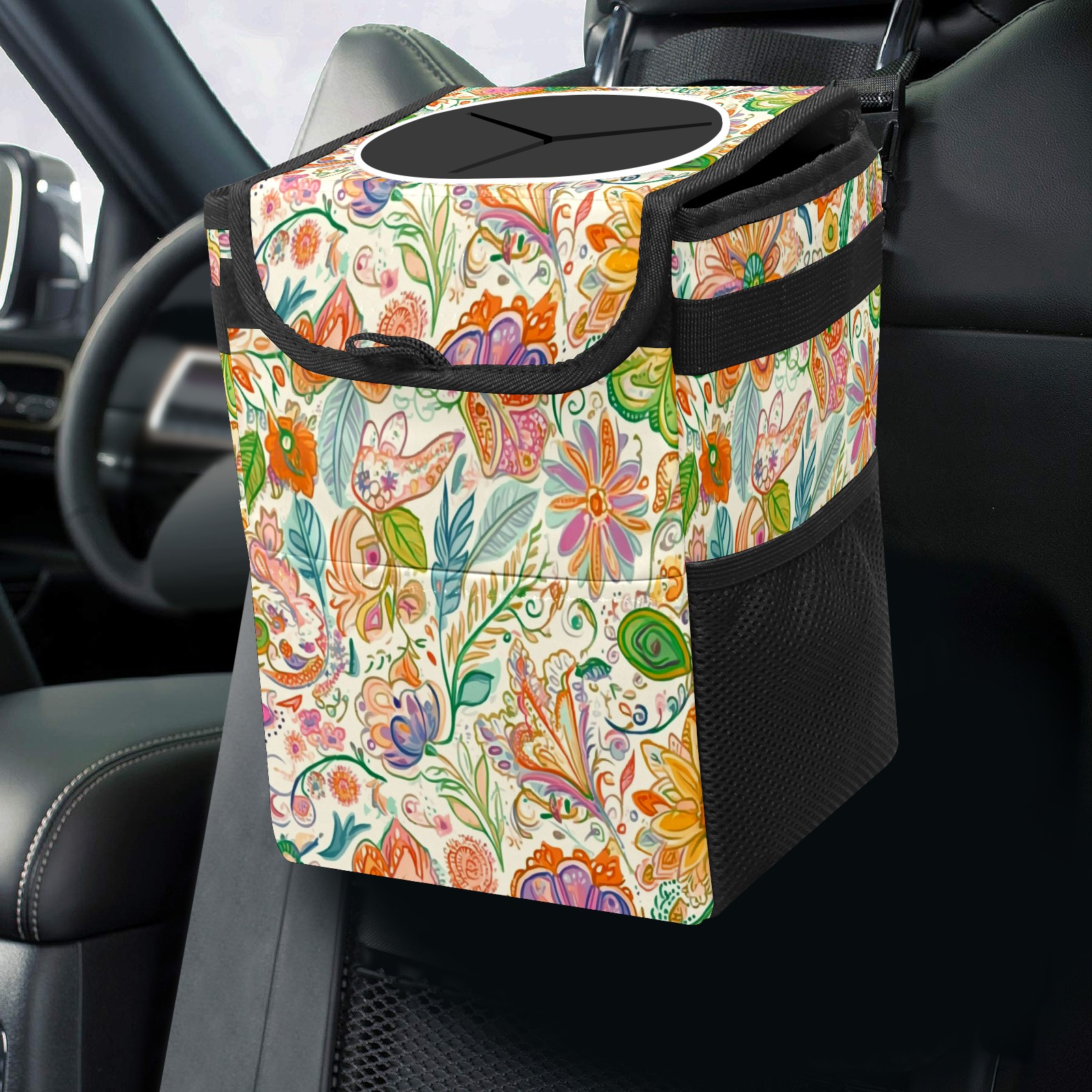 Car Trash Can with Lid, Small Portable Hanging Automotive Garbage Bin for Vehicles, Leakproof Waste Bag Container for SUV Truck Van Interior Auto Travel Road Trips(Intricate Doodle)