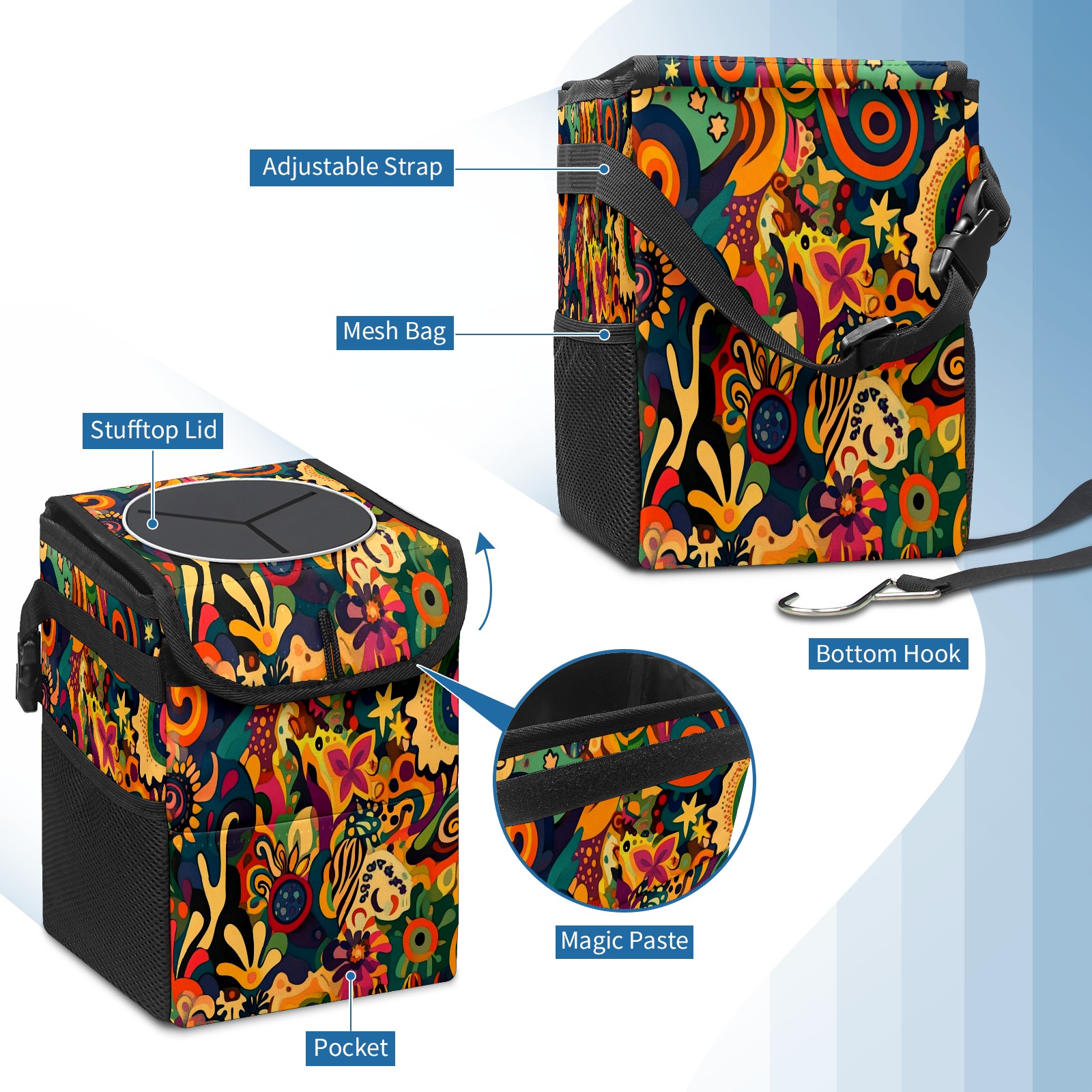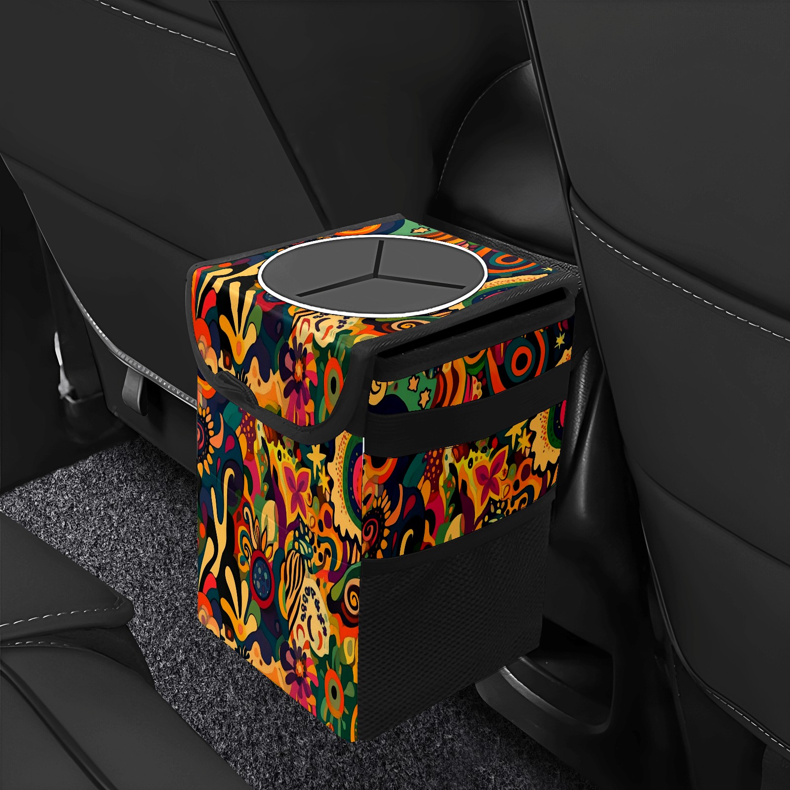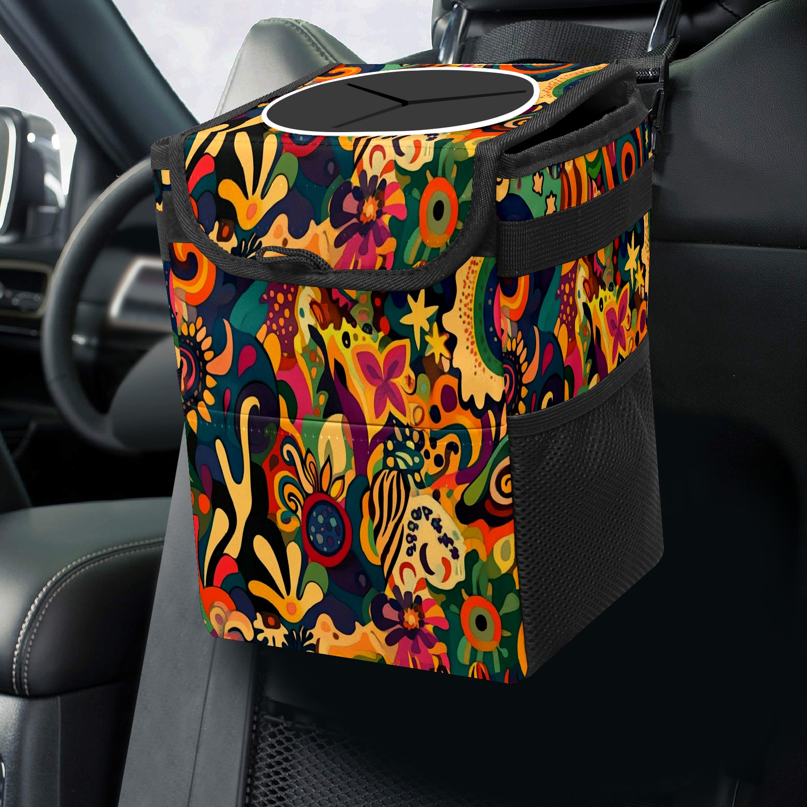 Car Trash Can with Lid, Small Portable Hanging Automotive Garbage Bin for Vehicles, Leakproof Waste Bag Container for SUV Truck Van Interior Auto Travel Road Trips(Abstract Pattern)