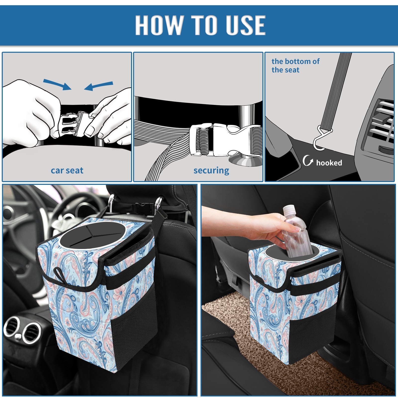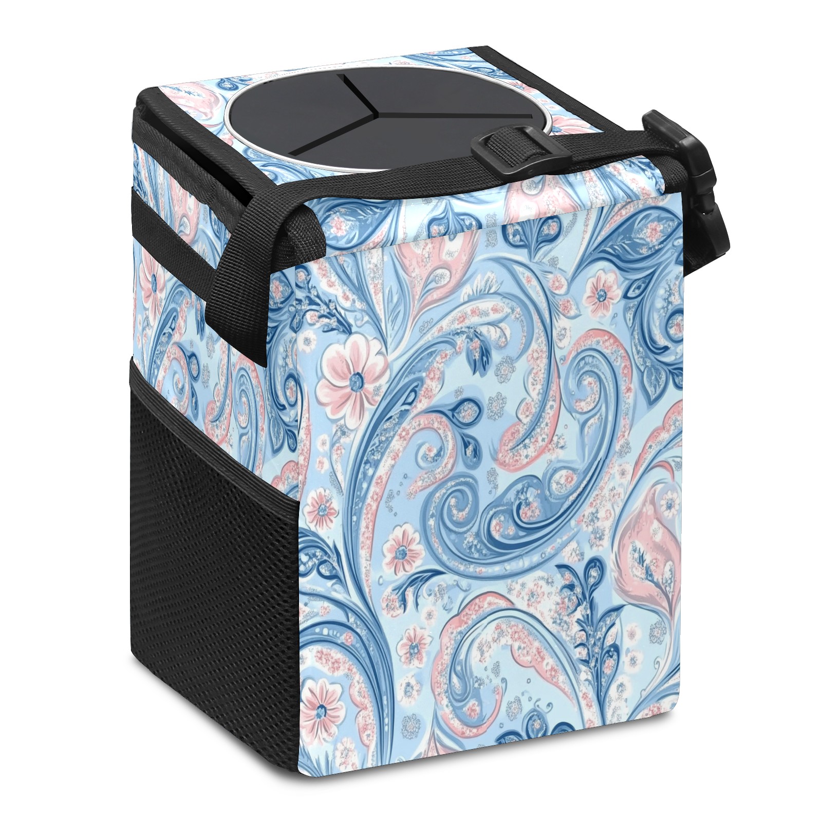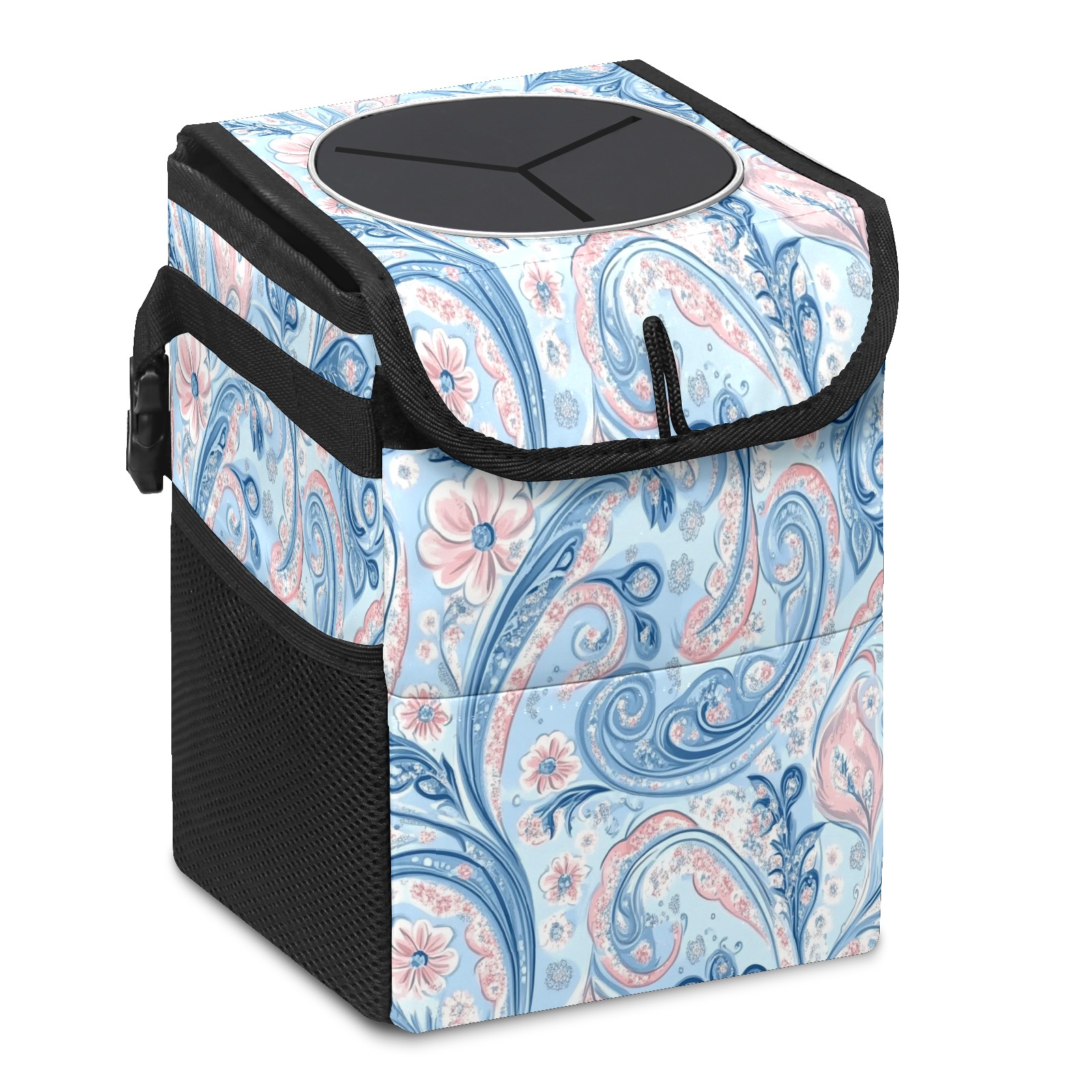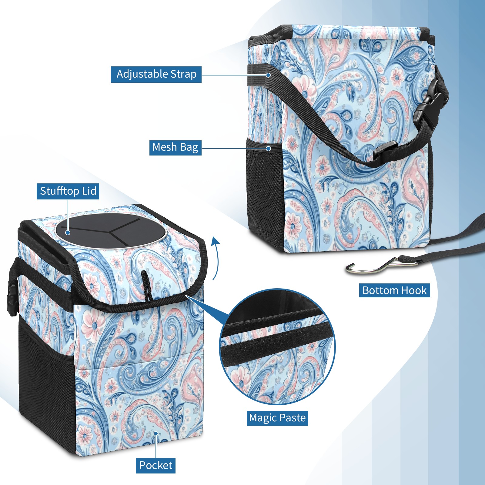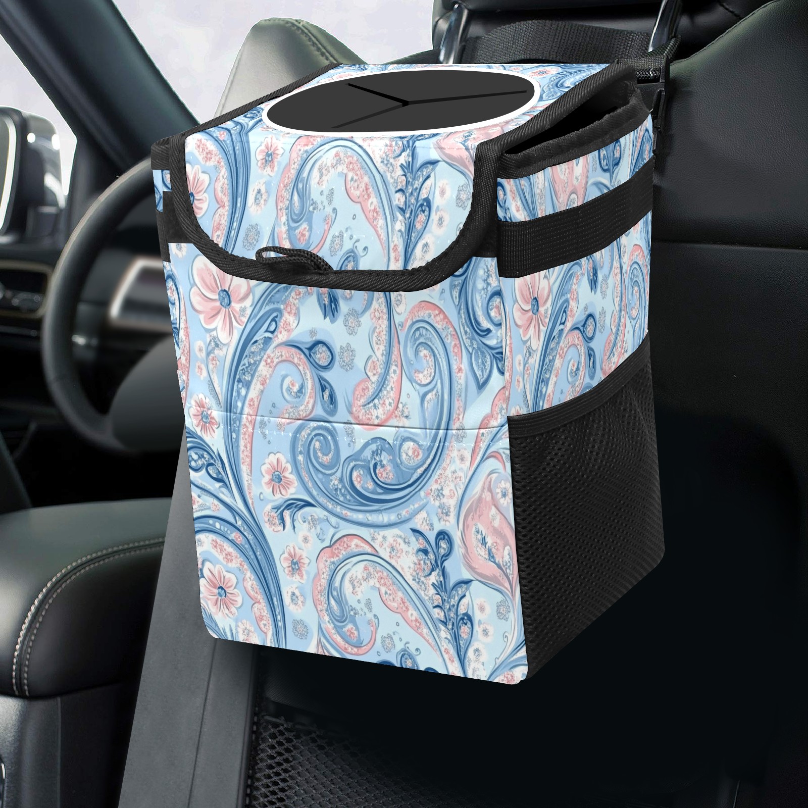 Car Trash Can with Lid, Small Portable Hanging Automotive Garbage Bin for Vehicles, Leakproof Waste Bag Container for SUV Truck Van Interior Auto Travel Road Trips(Pastel Blue Paisley)