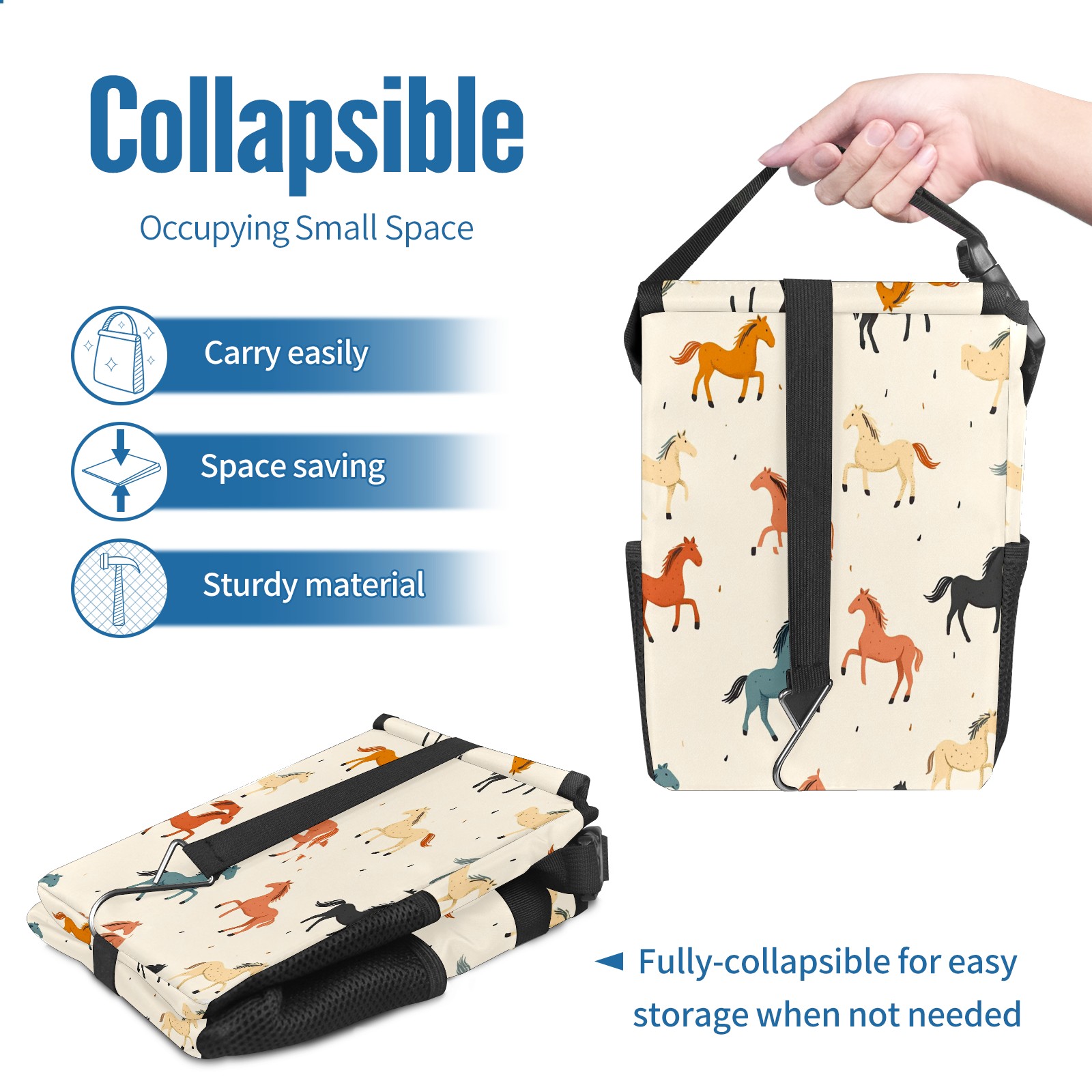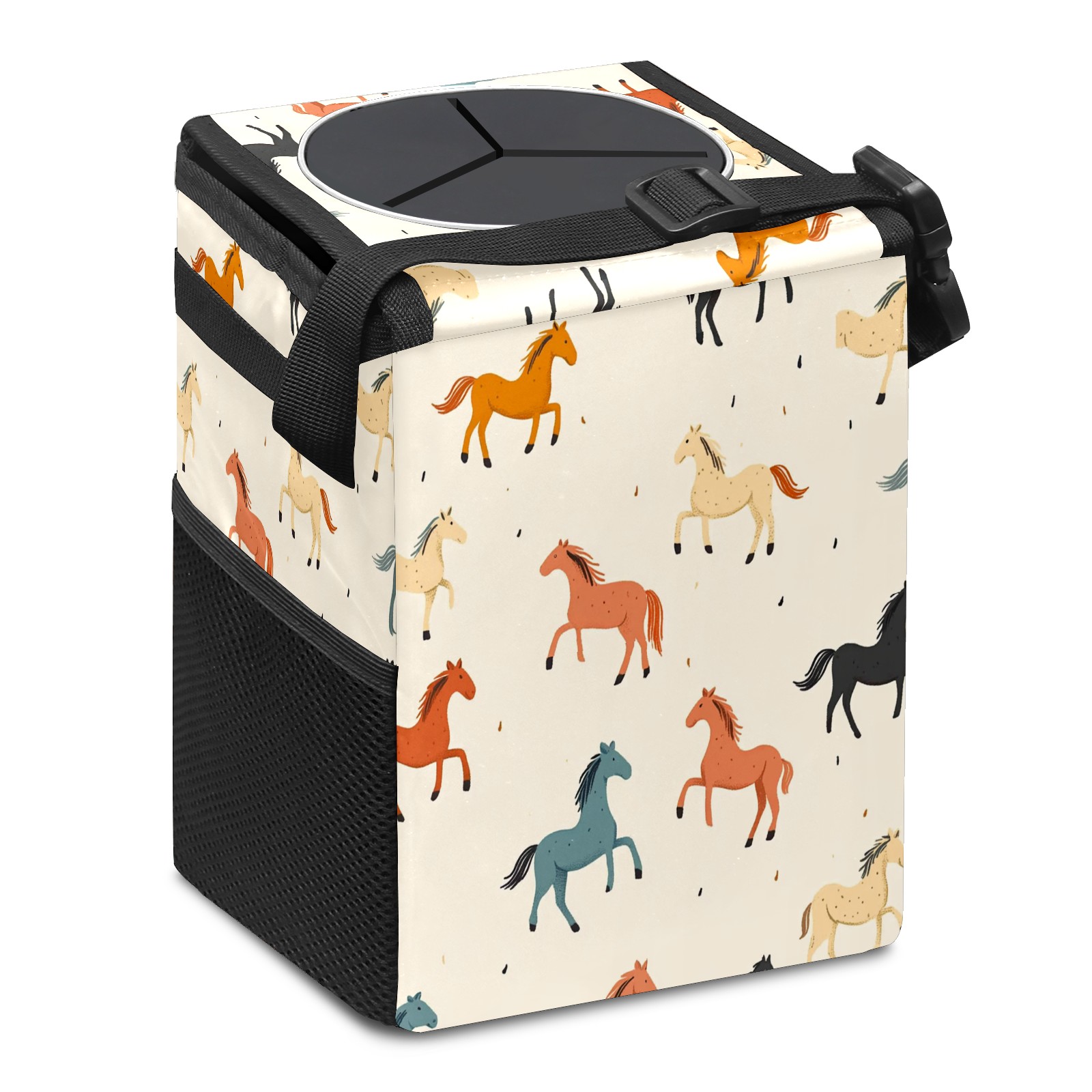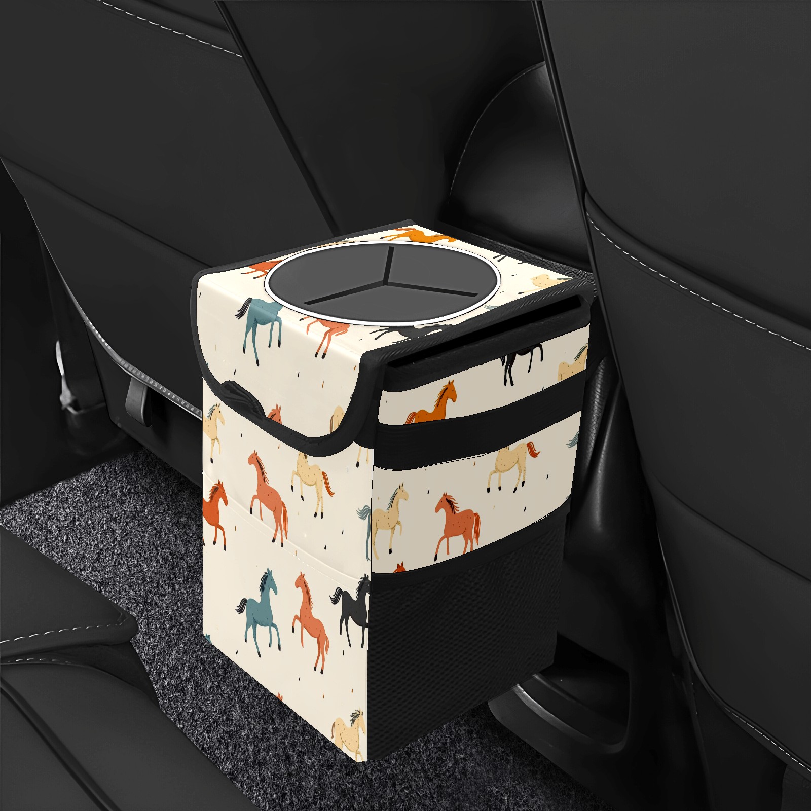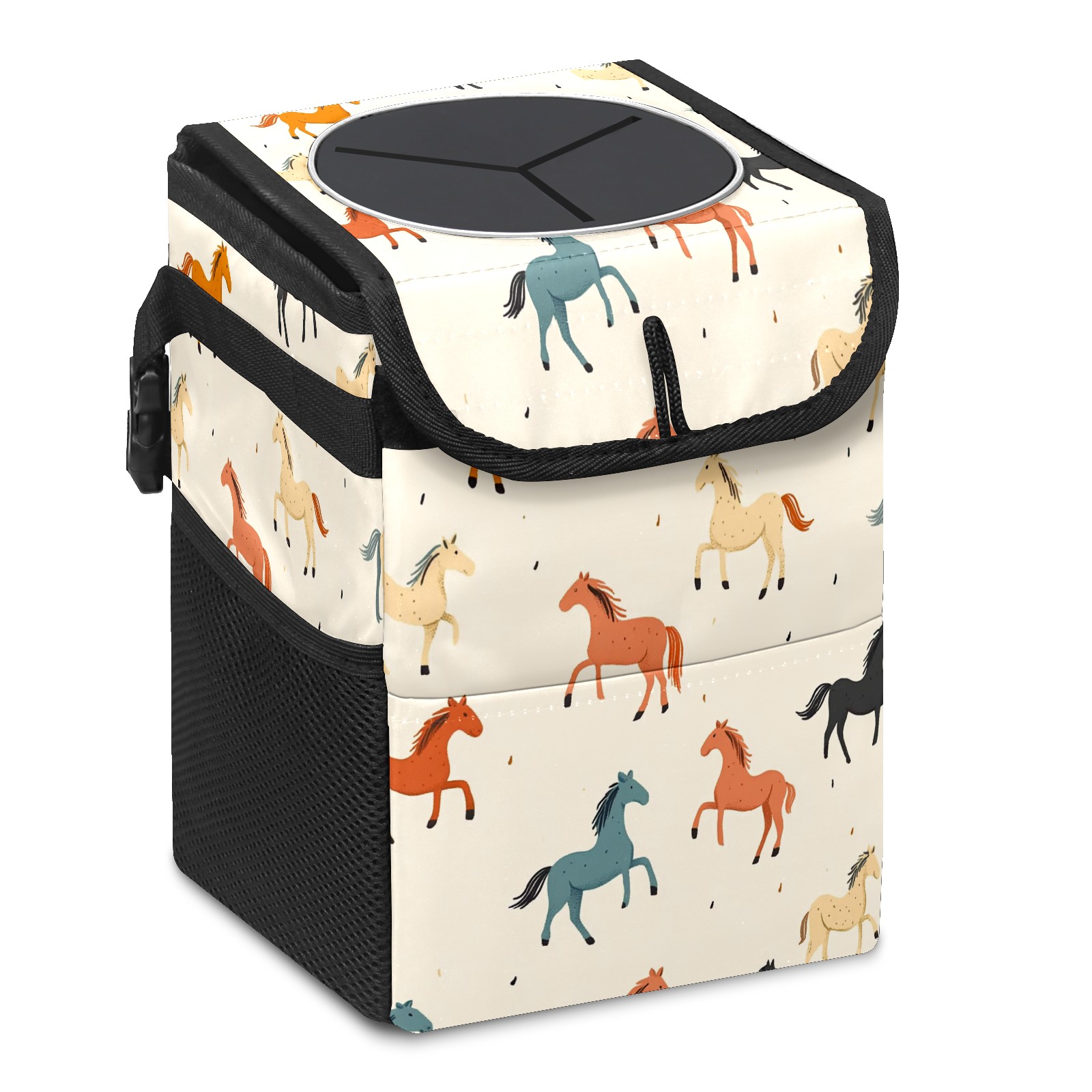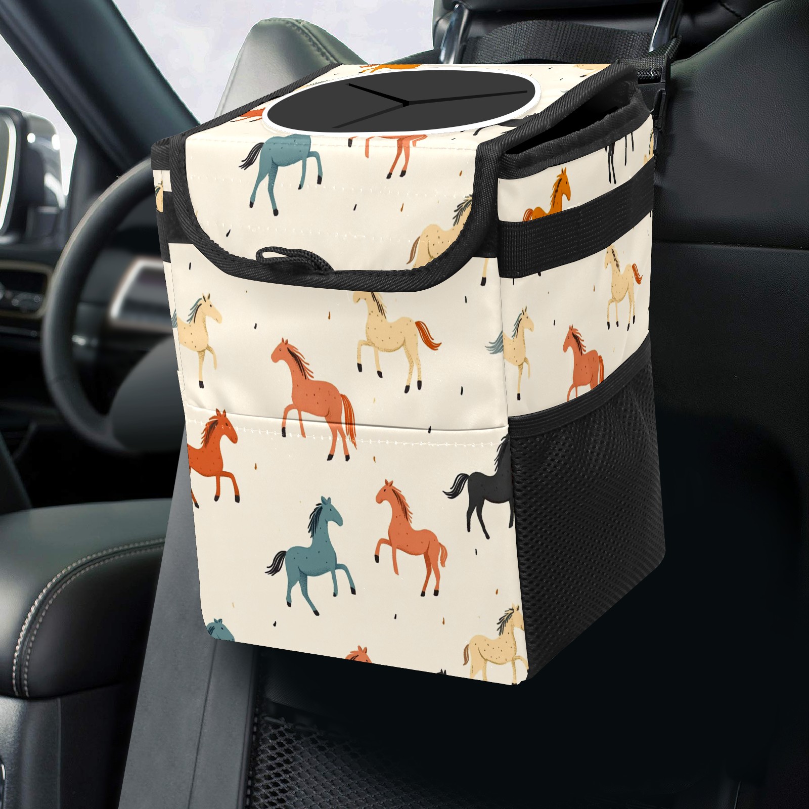 Car Trash Can with Lid, Small Portable Hanging Automotive Garbage Bin for Vehicles, Leakproof Waste Bag Container for SUV Truck Van Interior Auto Travel Road Trips(Horses)
