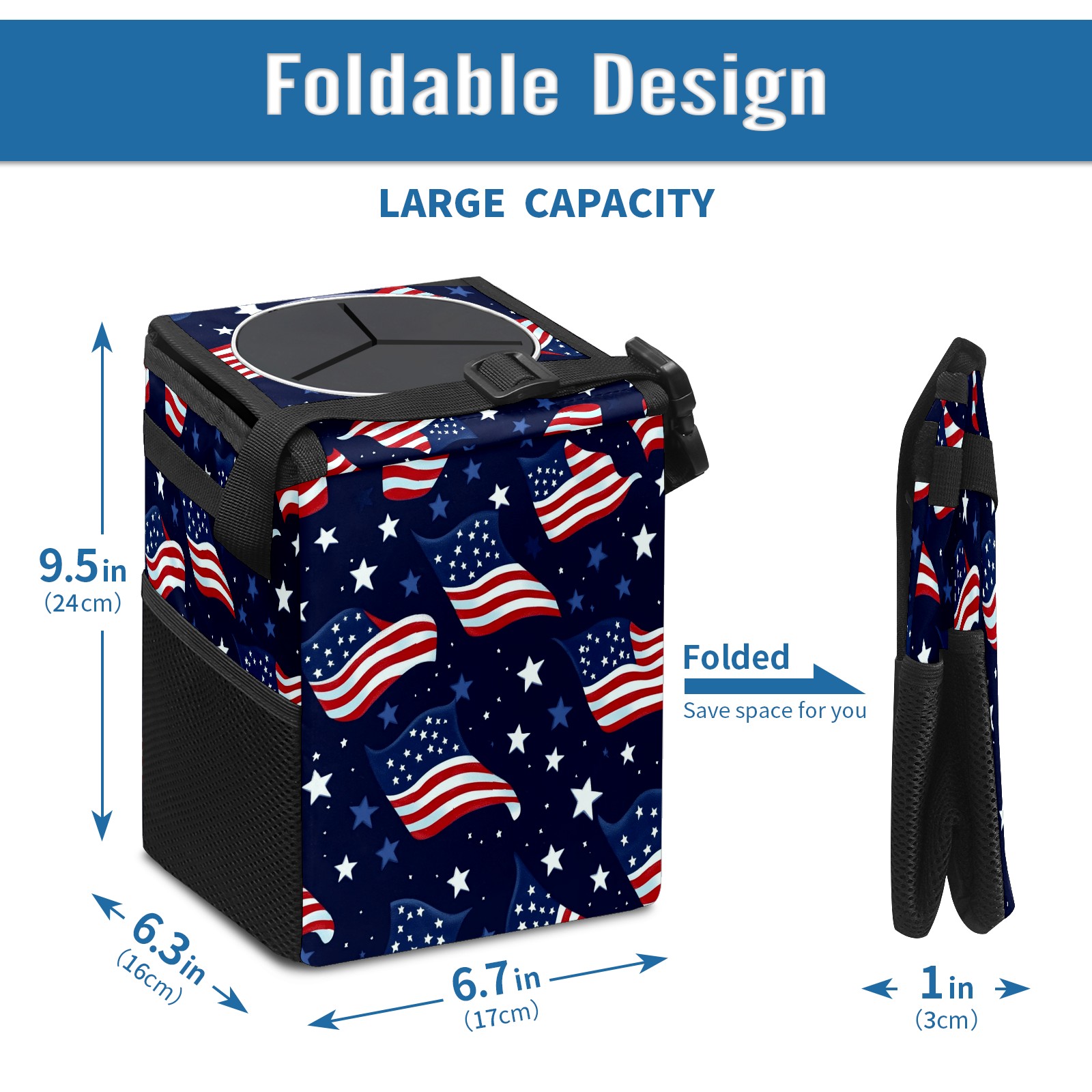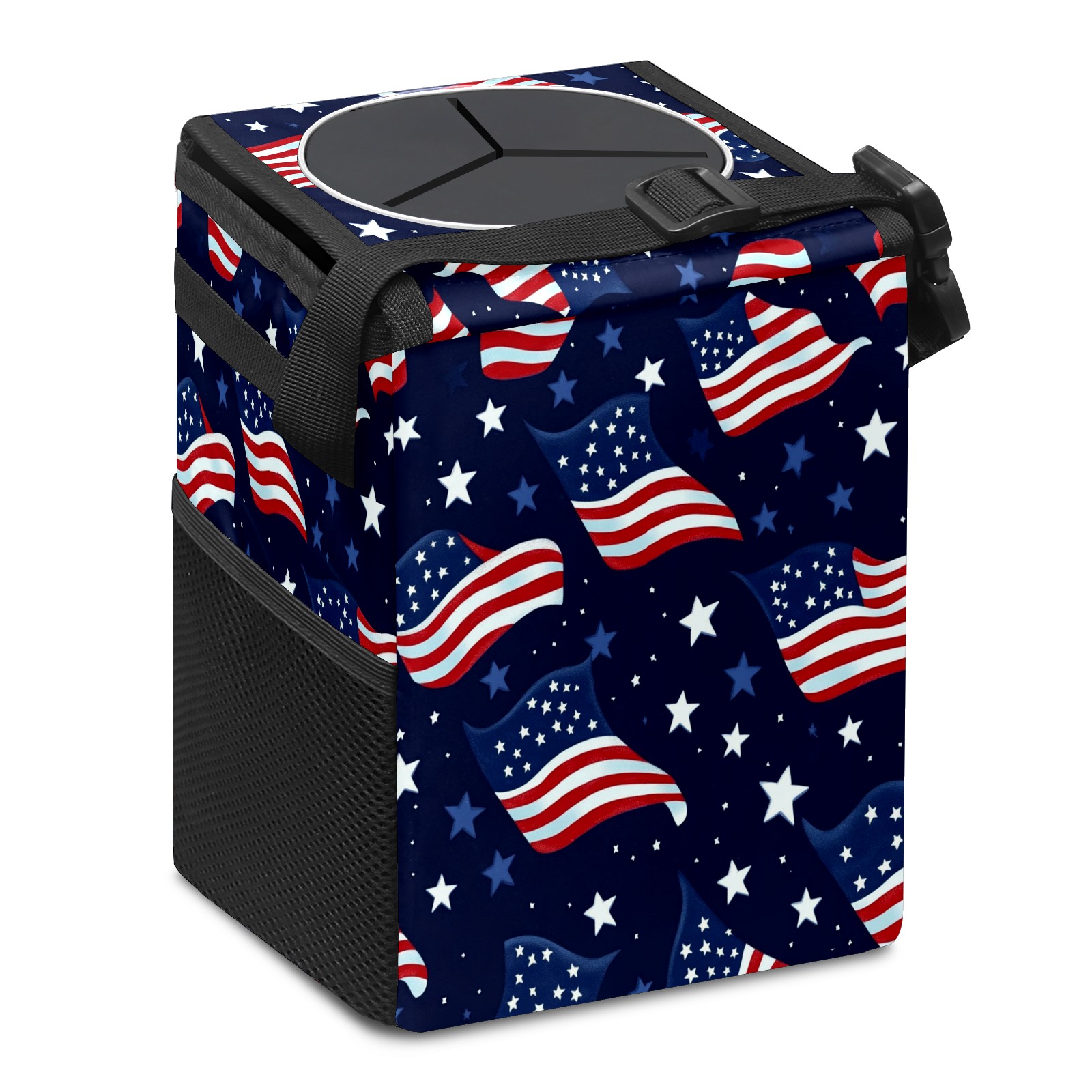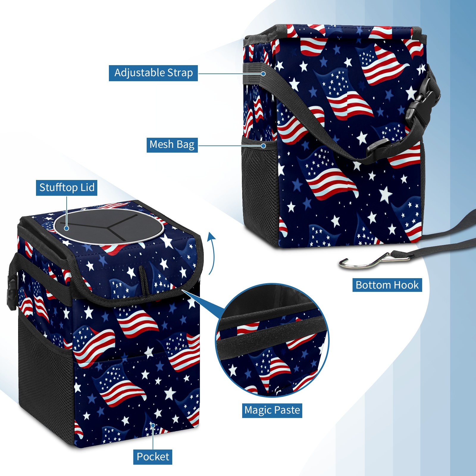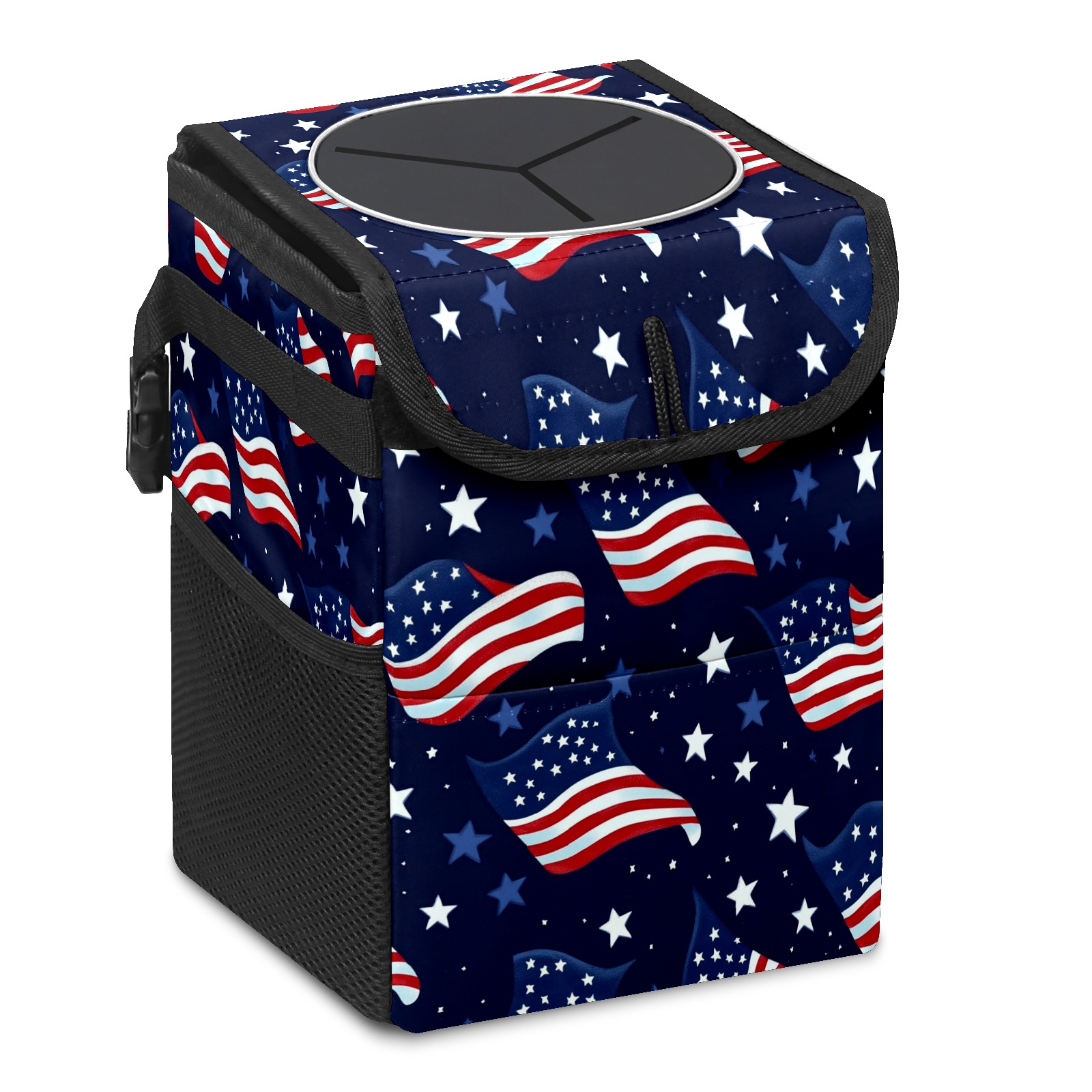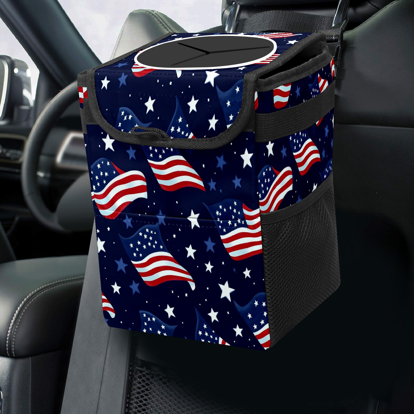 Car Trash Can with Lid, Small Portable Hanging Automotive Garbage Bin for Vehicles, Leakproof Waste Bag Container for SUV Truck Van Interior Auto Travel Road Trips(Realistic Waving American Flags)