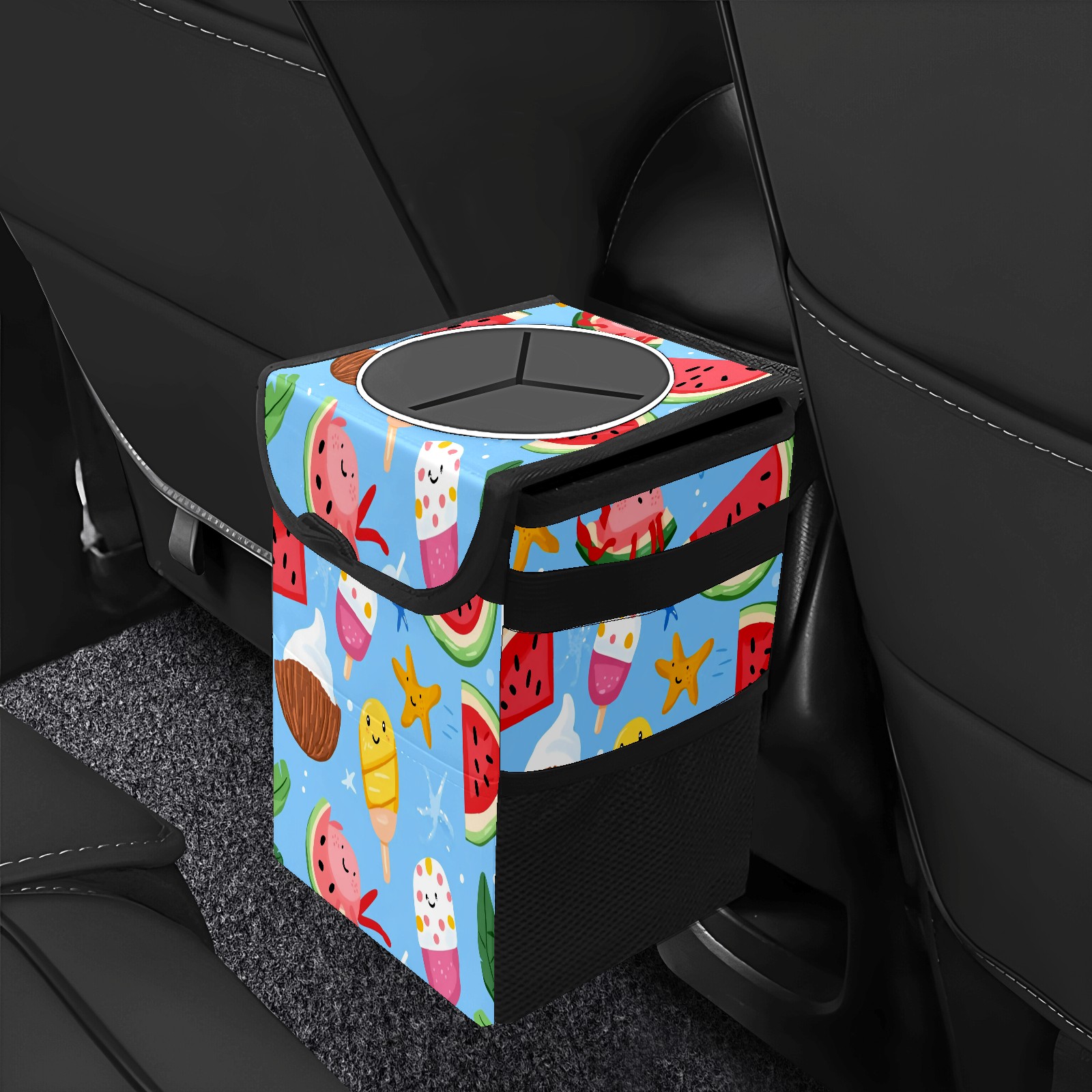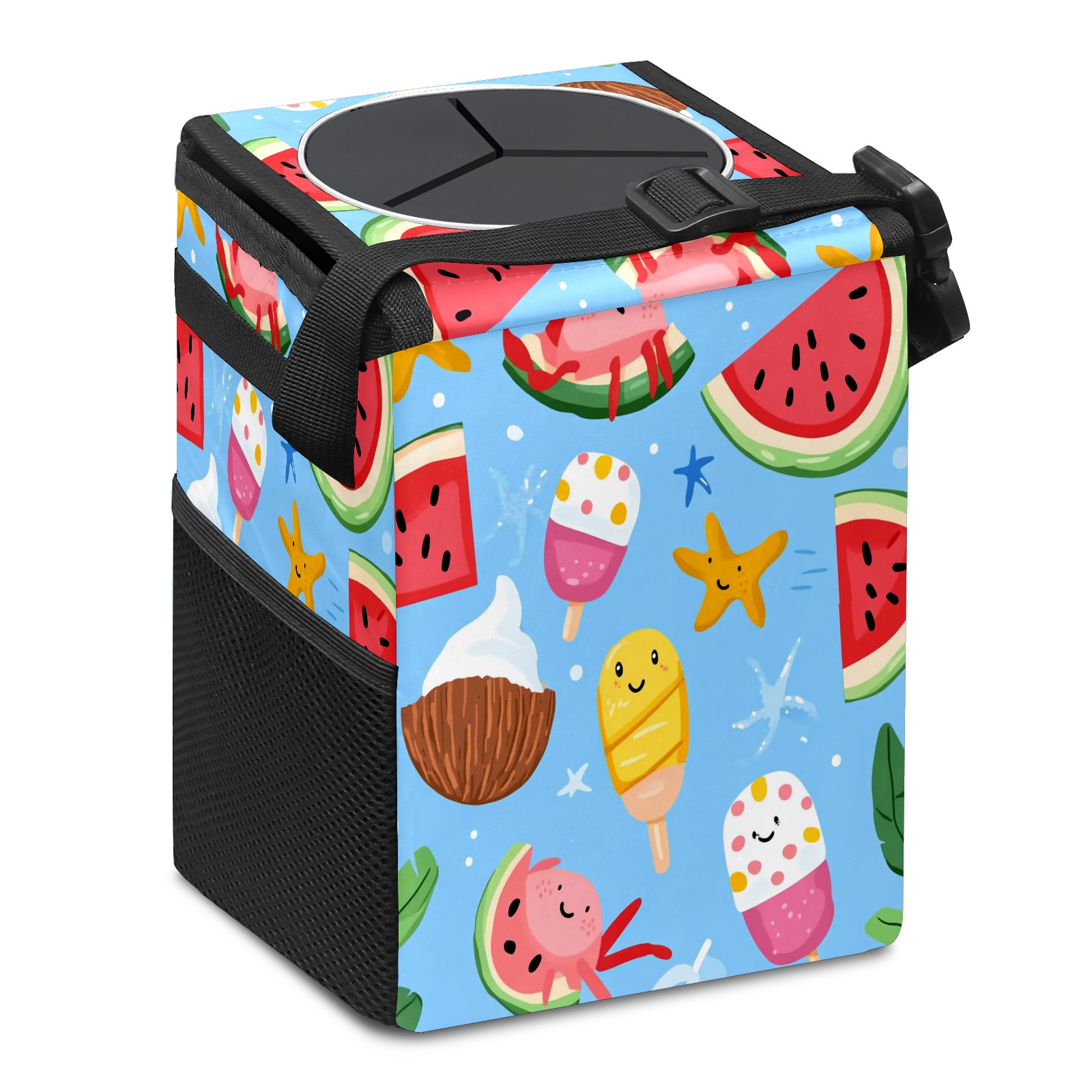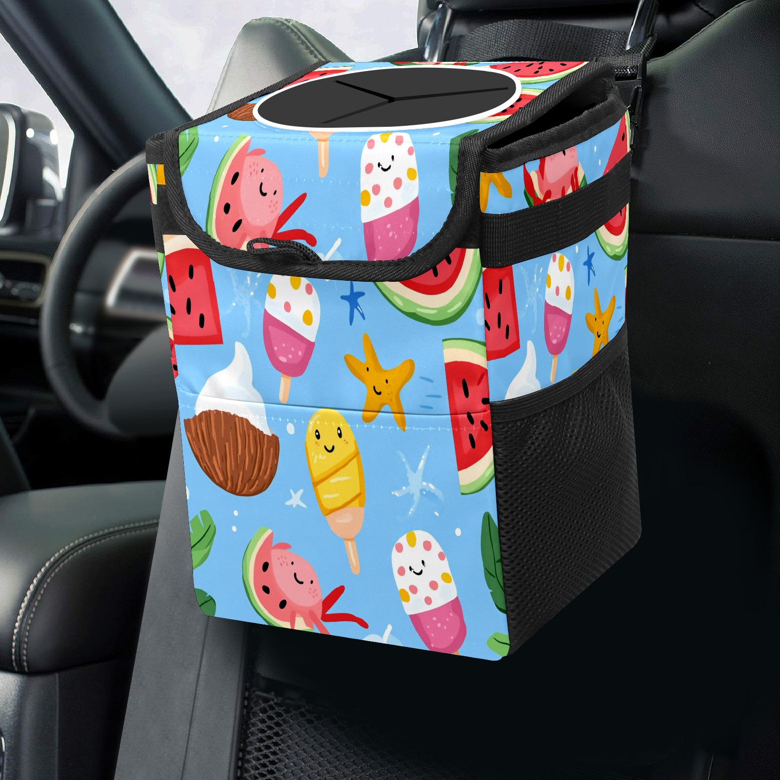Car Trash Can with Lid, Small Portable Hanging Automotive Garbage Bin for Vehicles, Leakproof Waste Bag Container for SUV Truck Van Interior Auto Travel Road Trips(Ice Cream And Watermelon)