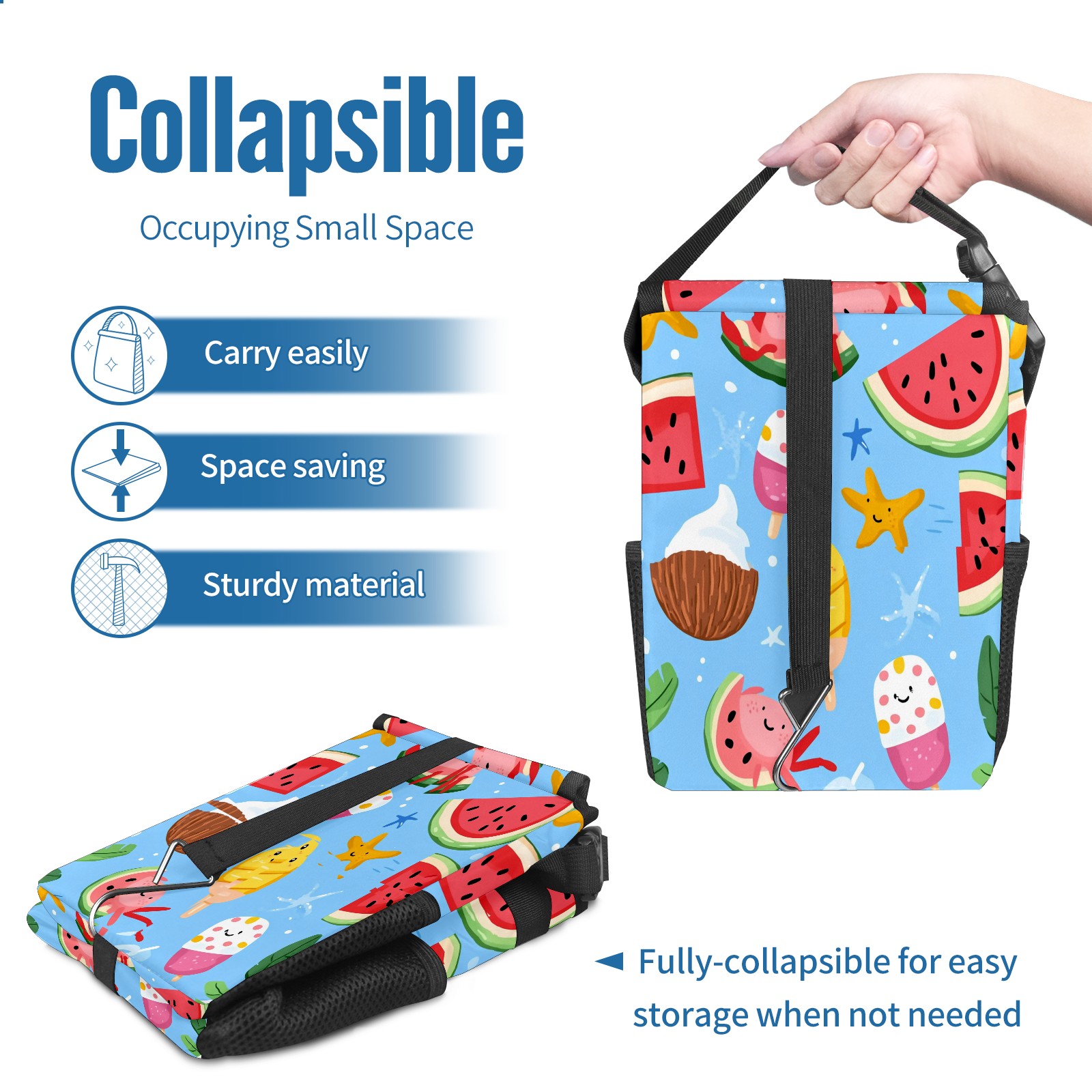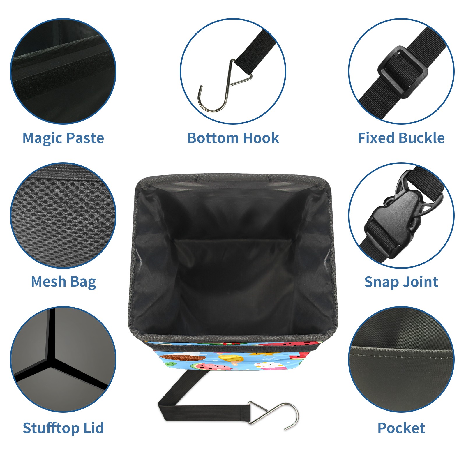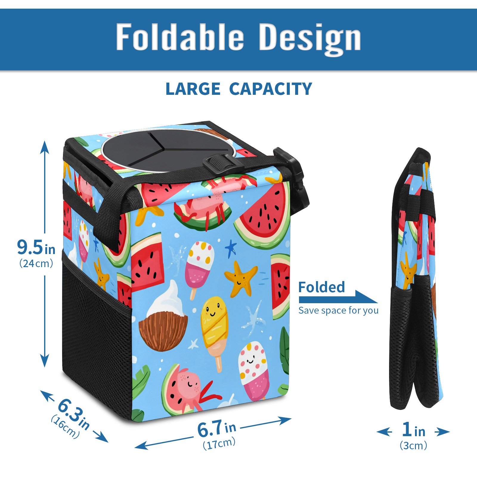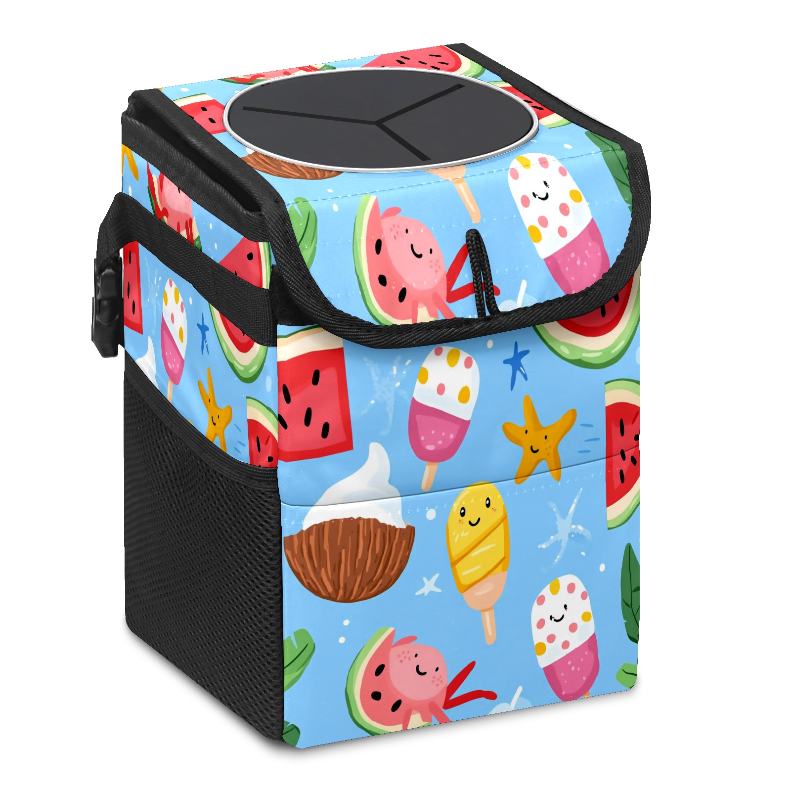 Car Trash Can with Lid, Small Portable Hanging Automotive Garbage Bin for Vehicles, Leakproof Waste Bag Container for SUV Truck Van Interior Auto Travel Road Trips(Ice Cream And Watermelon)