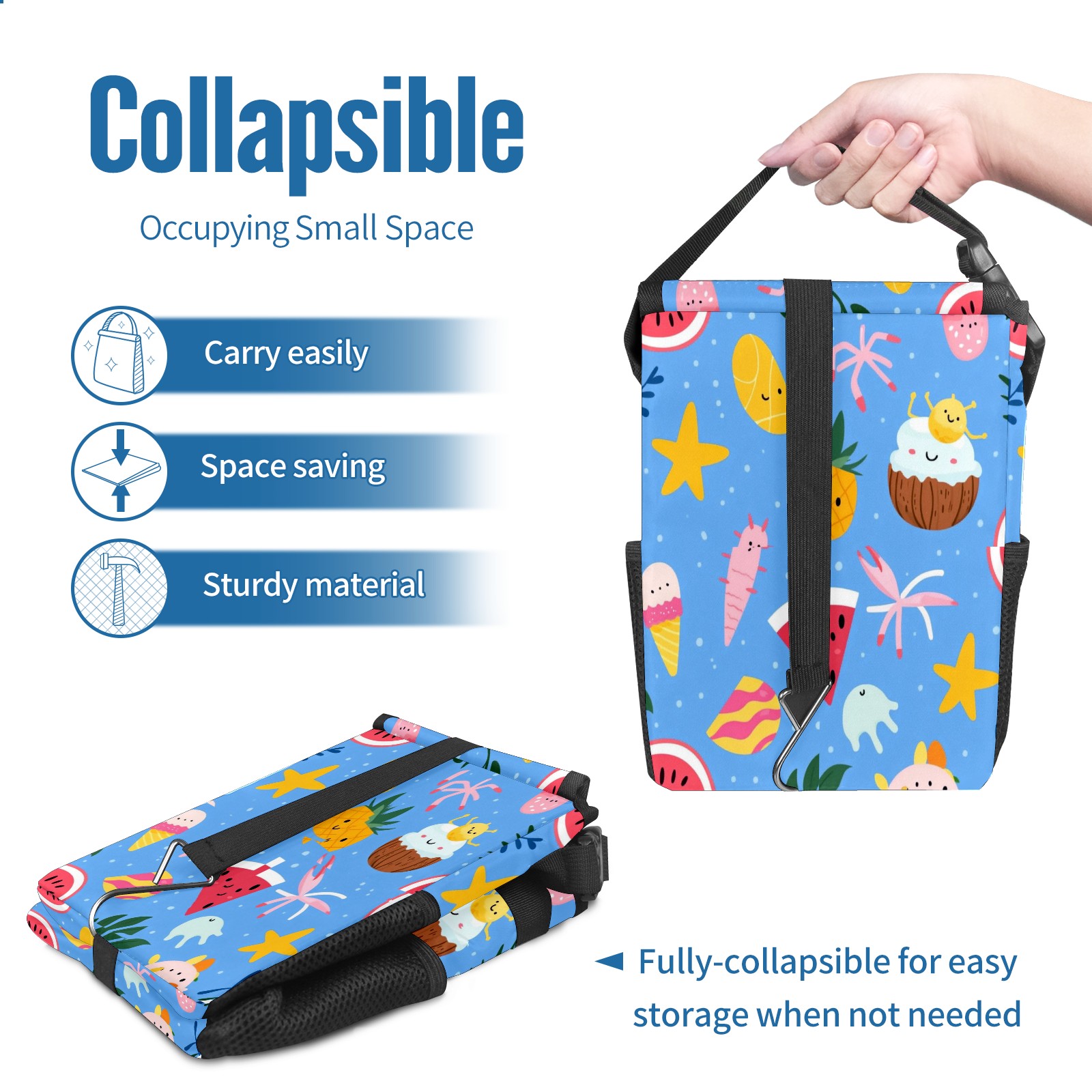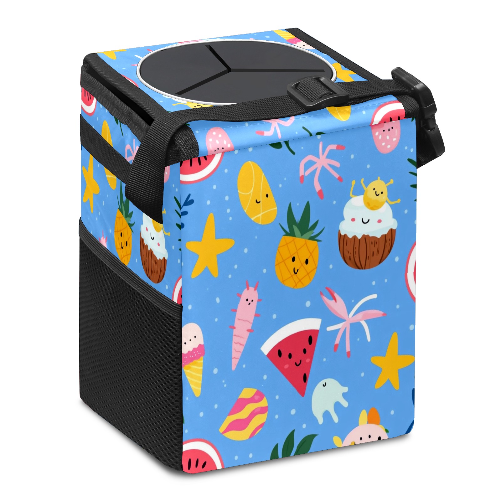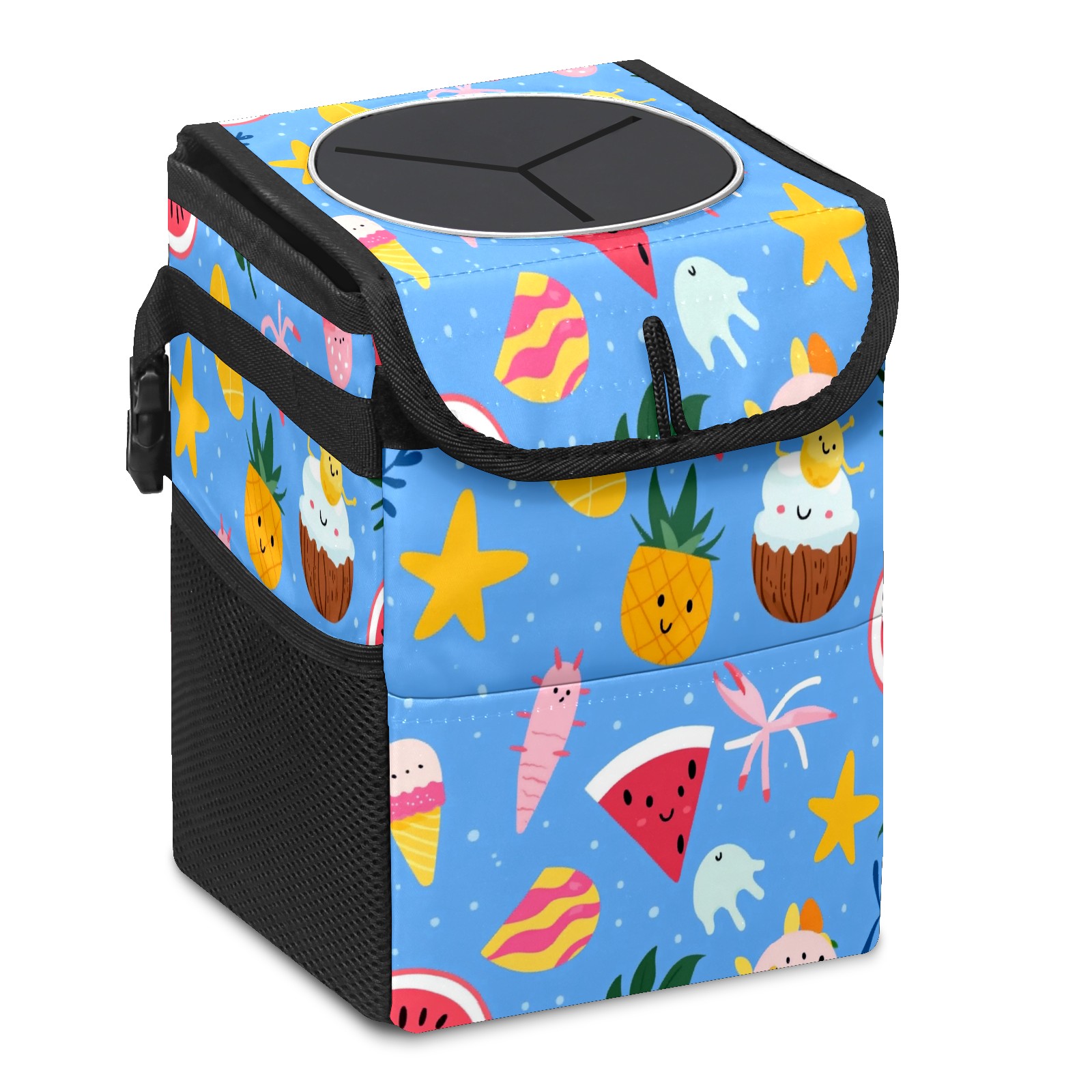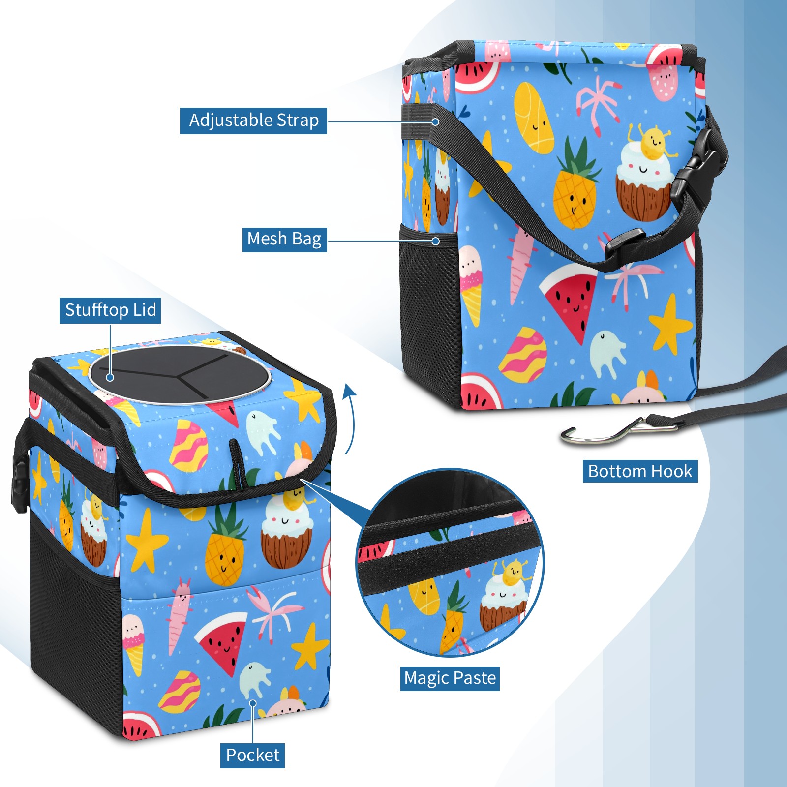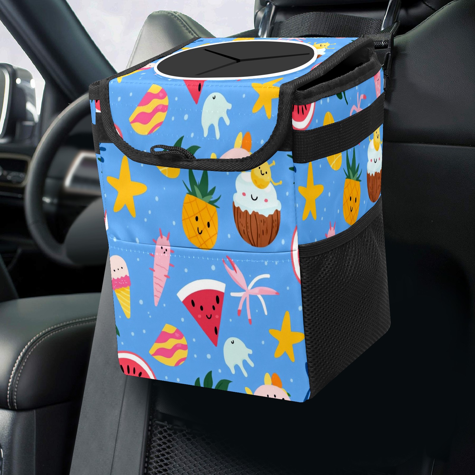 Car Trash Can with Lid, Small Portable Hanging Automotive Garbage Bin for Vehicles, Leakproof Waste Bag Container for SUV Truck Van Interior Auto Travel Road Trips(Beach Elements)