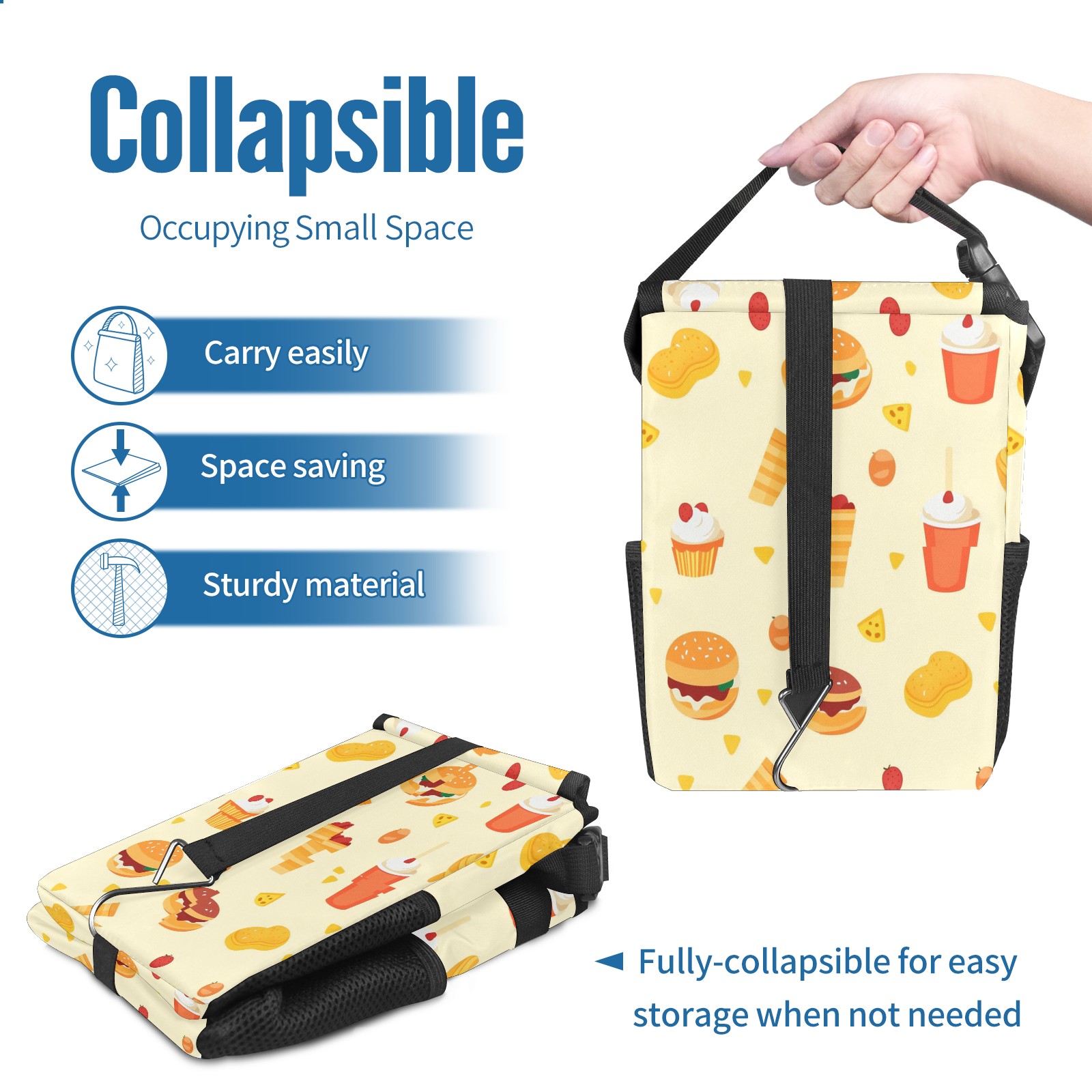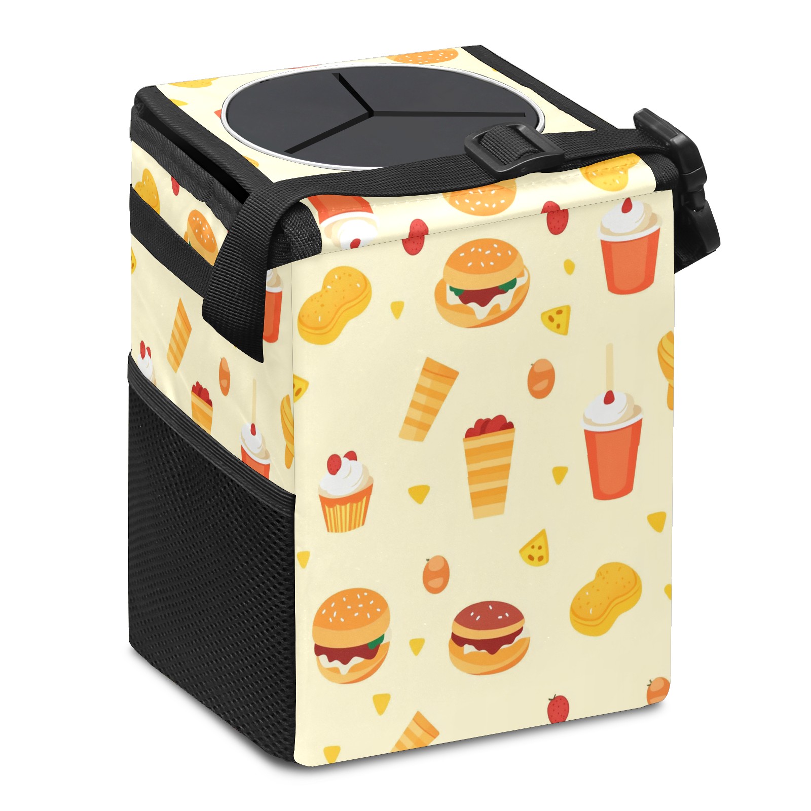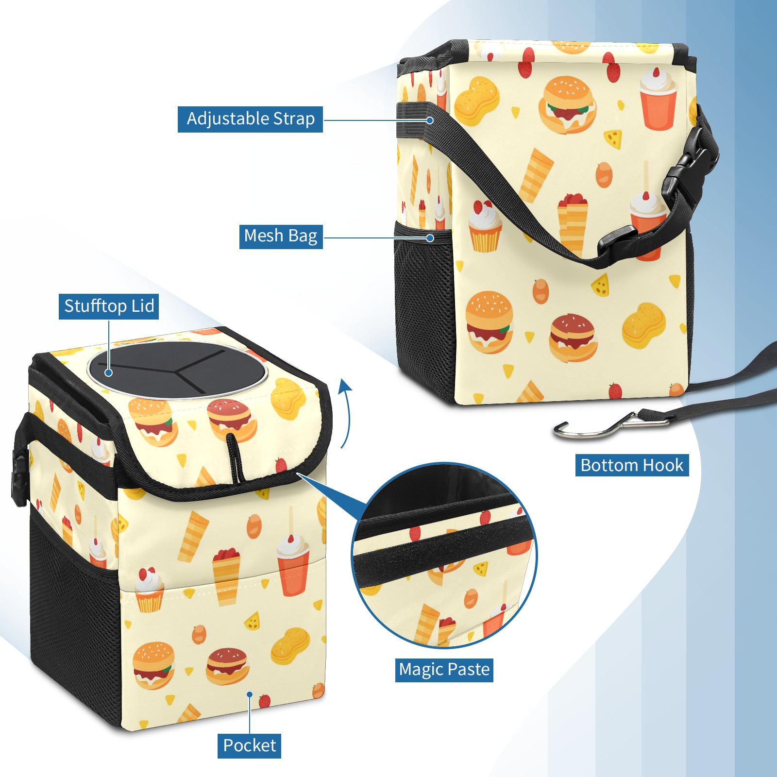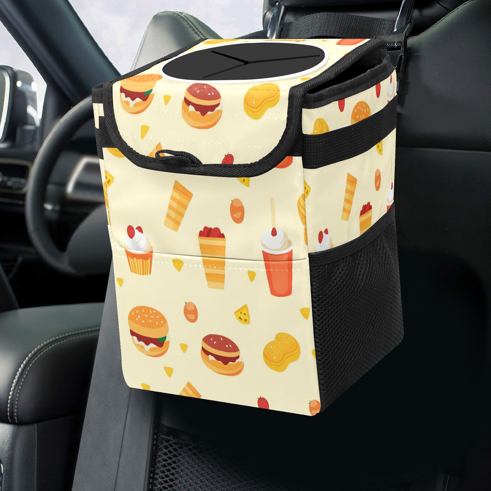 Car Trash Can with Lid, Small Portable Hanging Automotive Garbage Bin for Vehicles, Leakproof Waste Bag Container for SUV Truck Van Interior Auto Travel Road Trips(Fast Food Pattern)