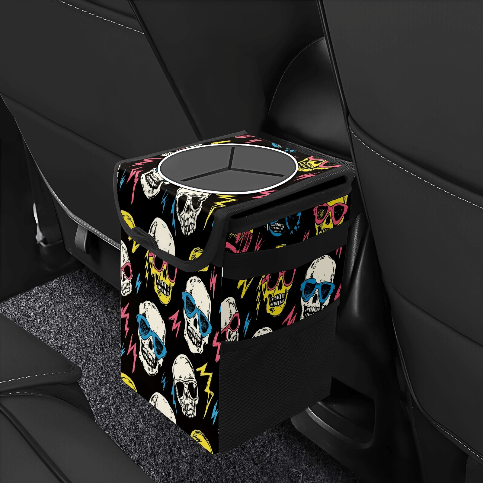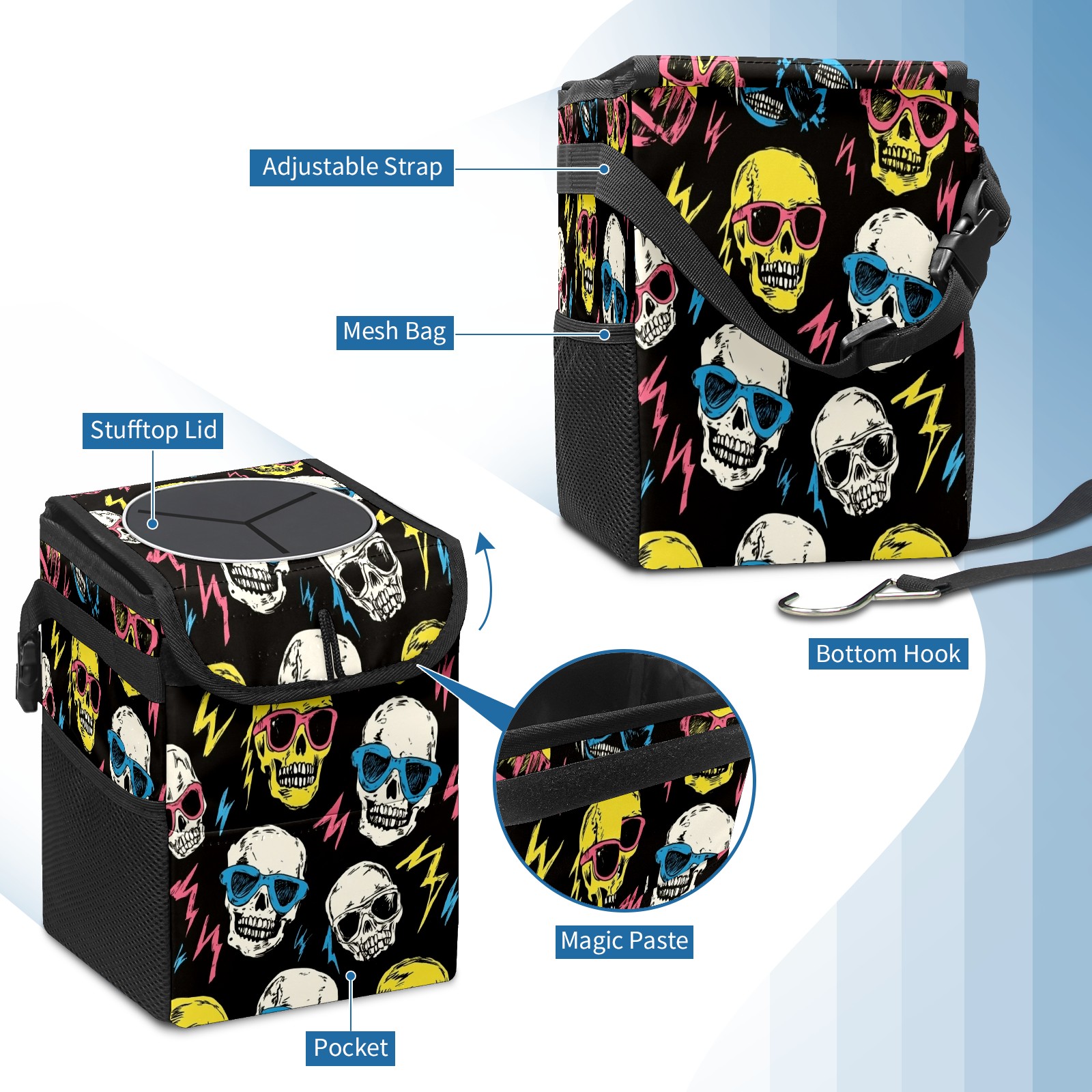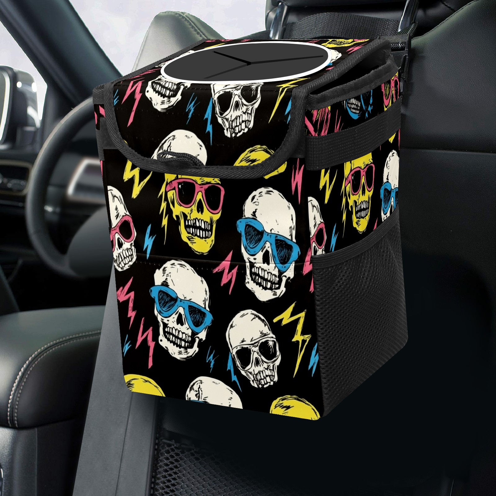 Car Trash Can with Lid, Small Portable Hanging Automotive Garbage Bin for Vehicles, Leakproof Waste Bag Container for SUV Truck Van Interior Auto Travel Road Trips(Colorful Cartoon Skulls)