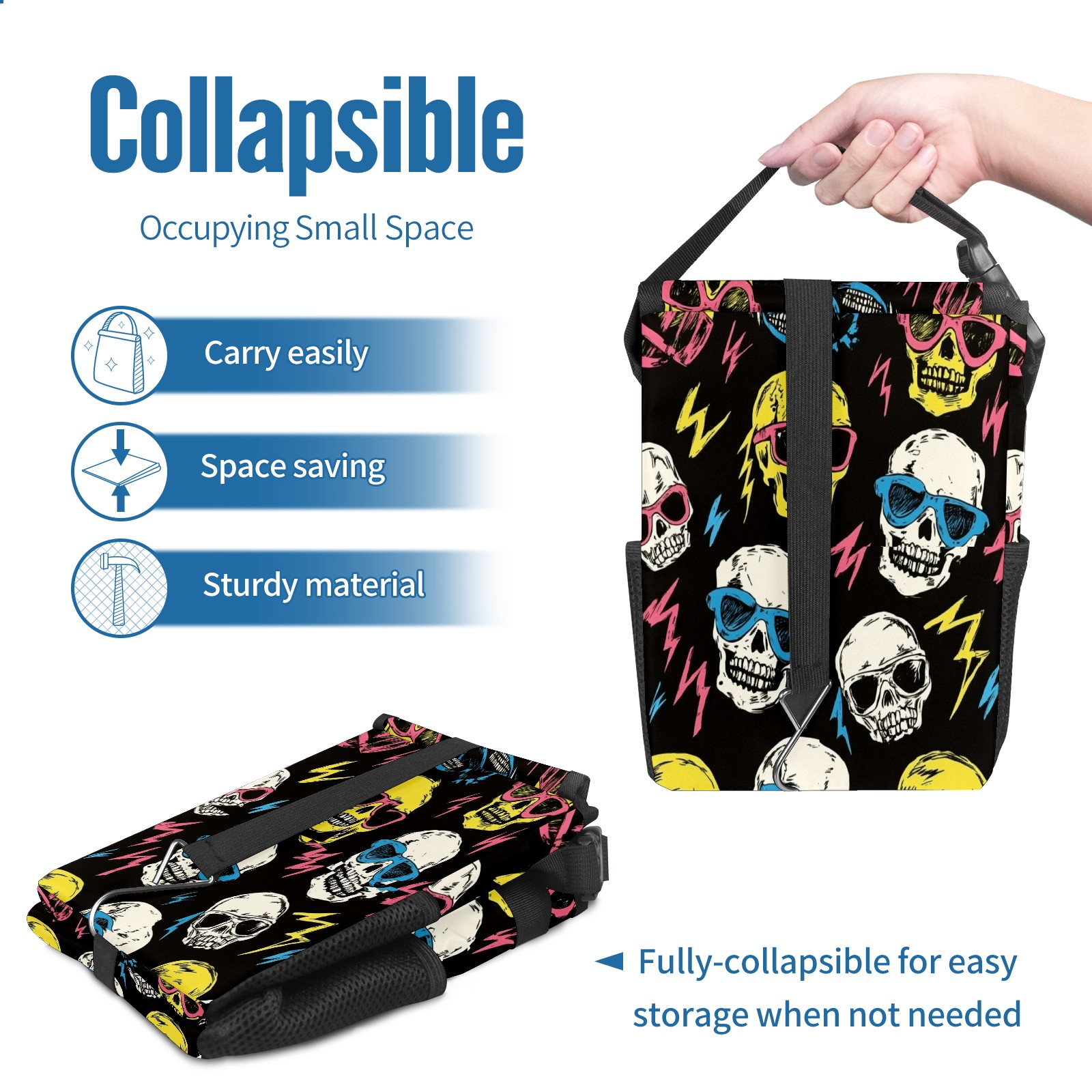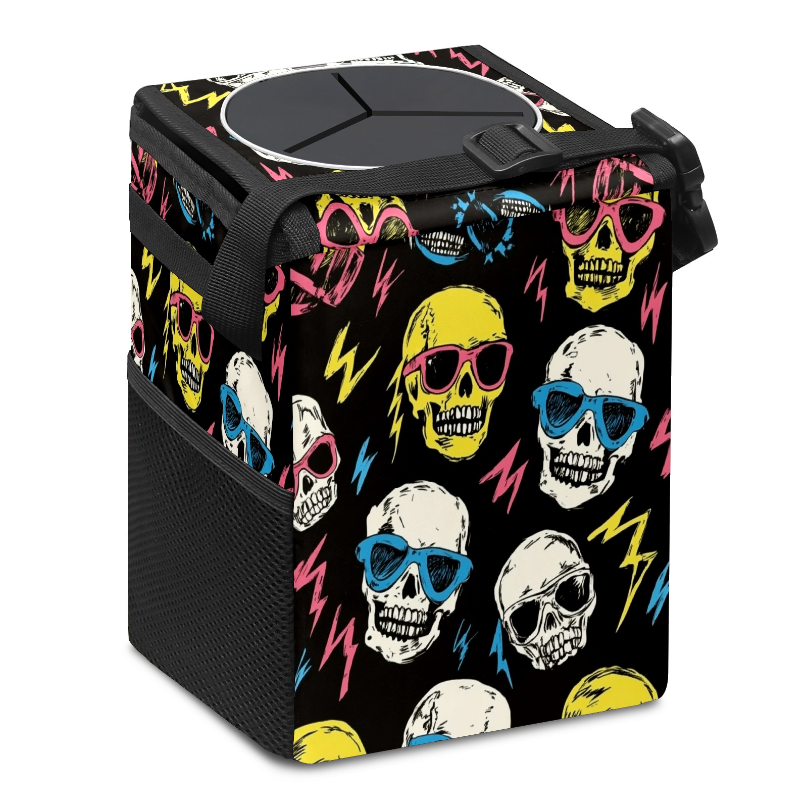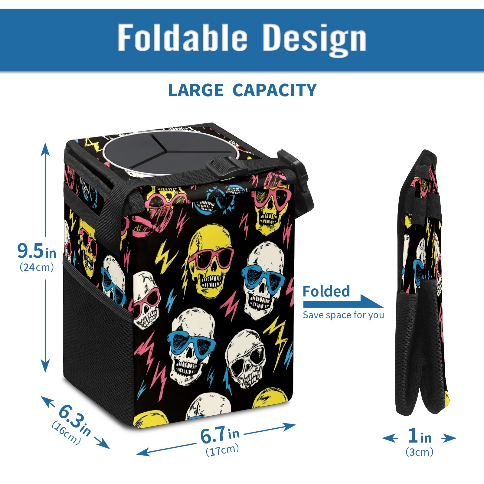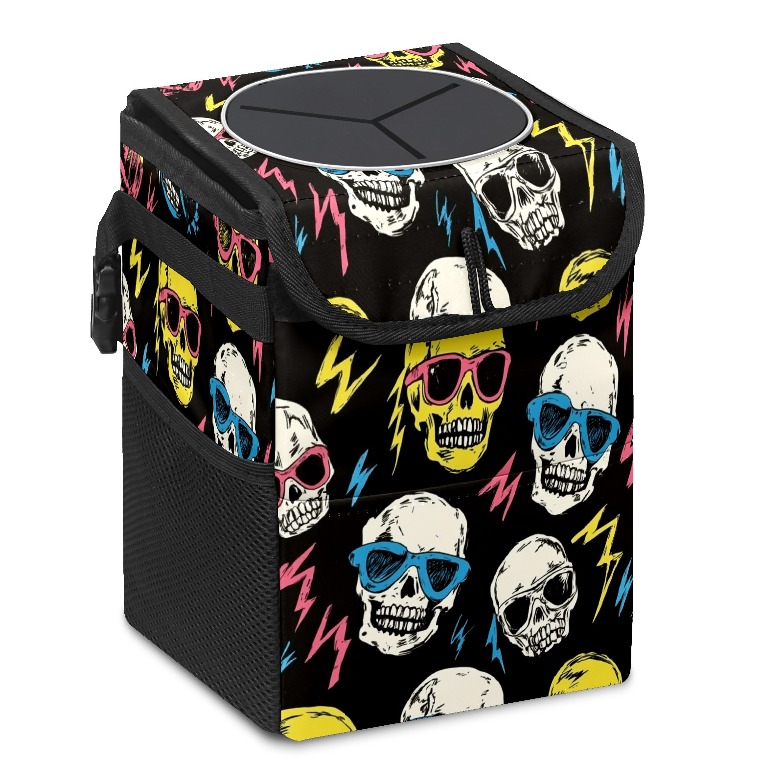 Car Trash Can with Lid, Small Portable Hanging Automotive Garbage Bin for Vehicles, Leakproof Waste Bag Container for SUV Truck Van Interior Auto Travel Road Trips(Colorful Cartoon Skulls)
