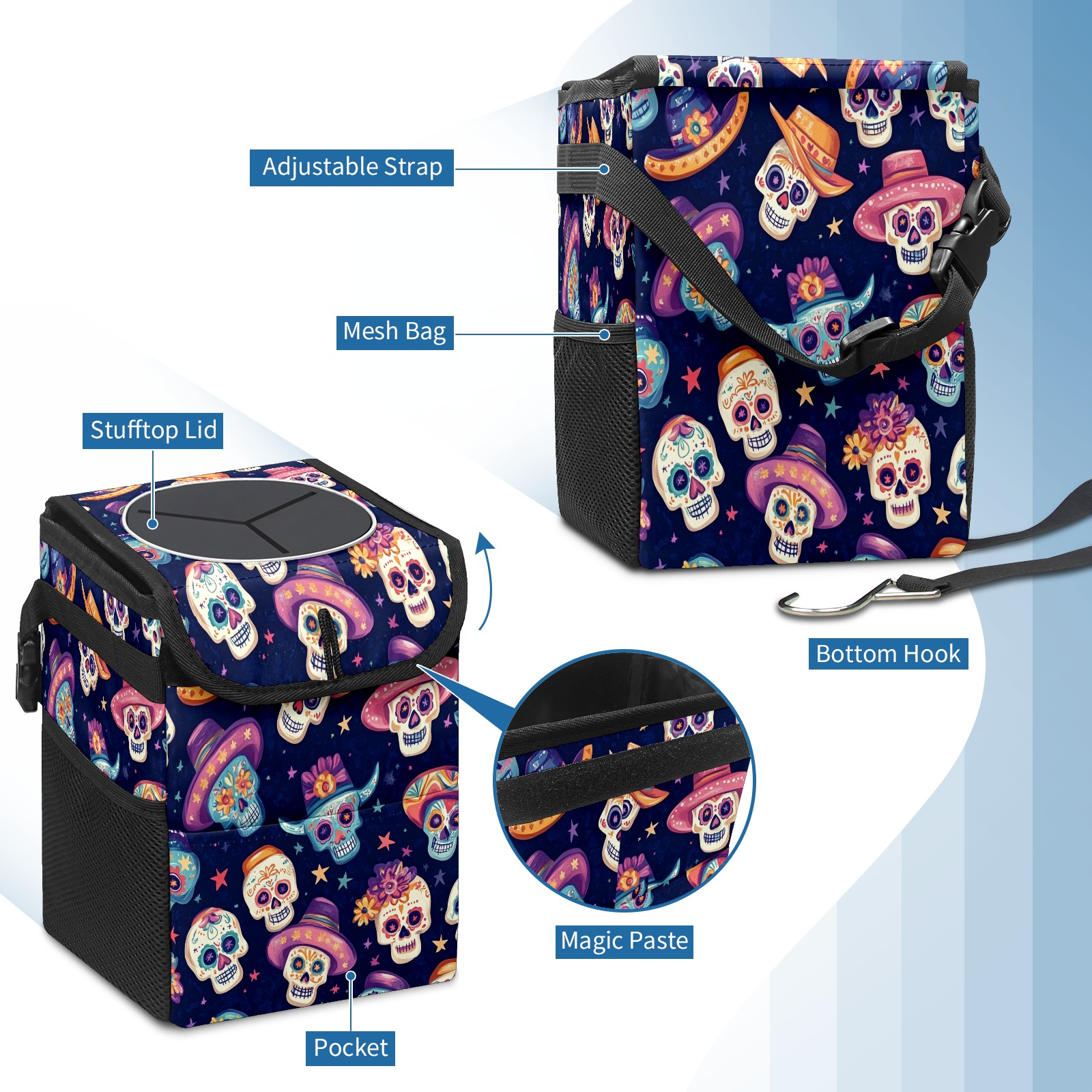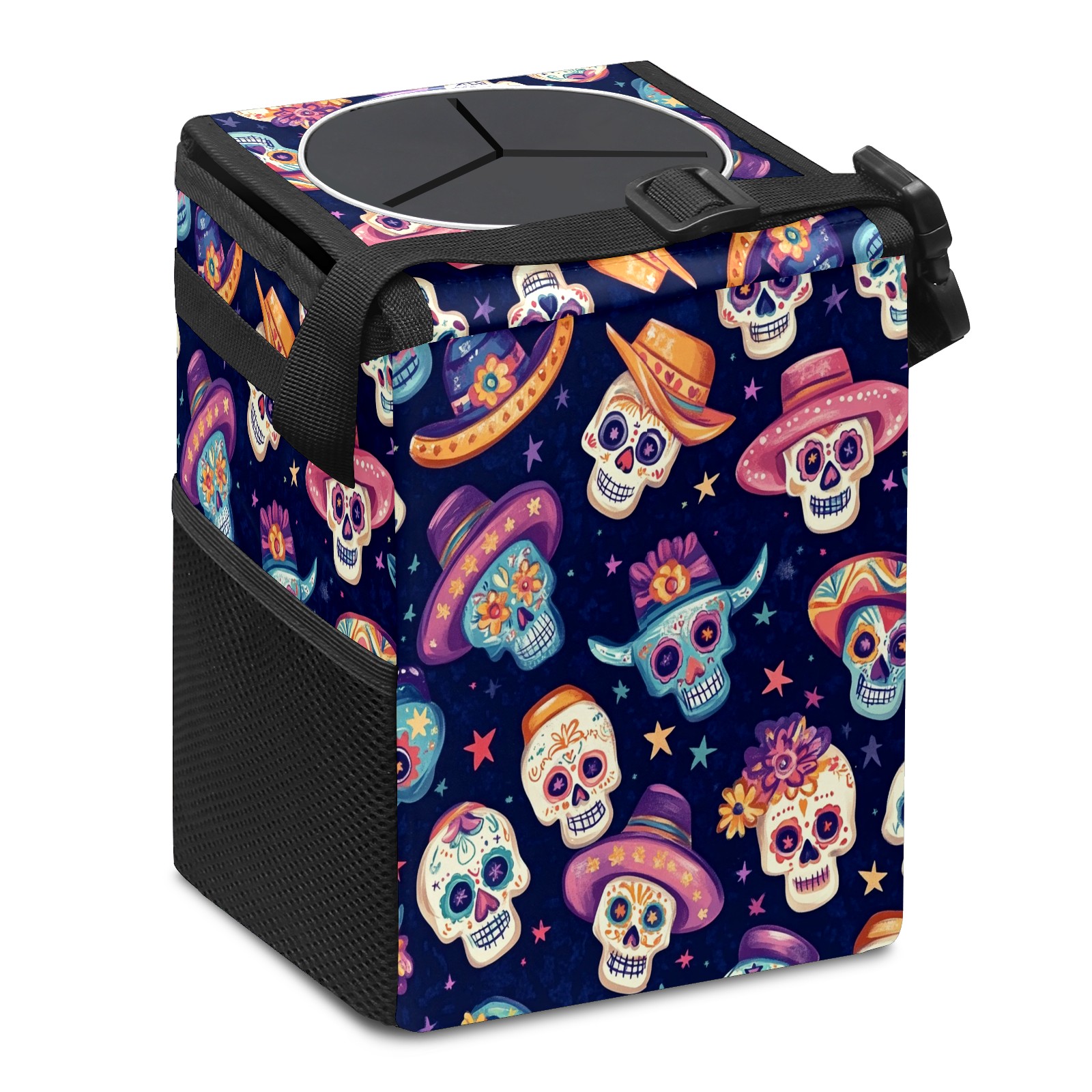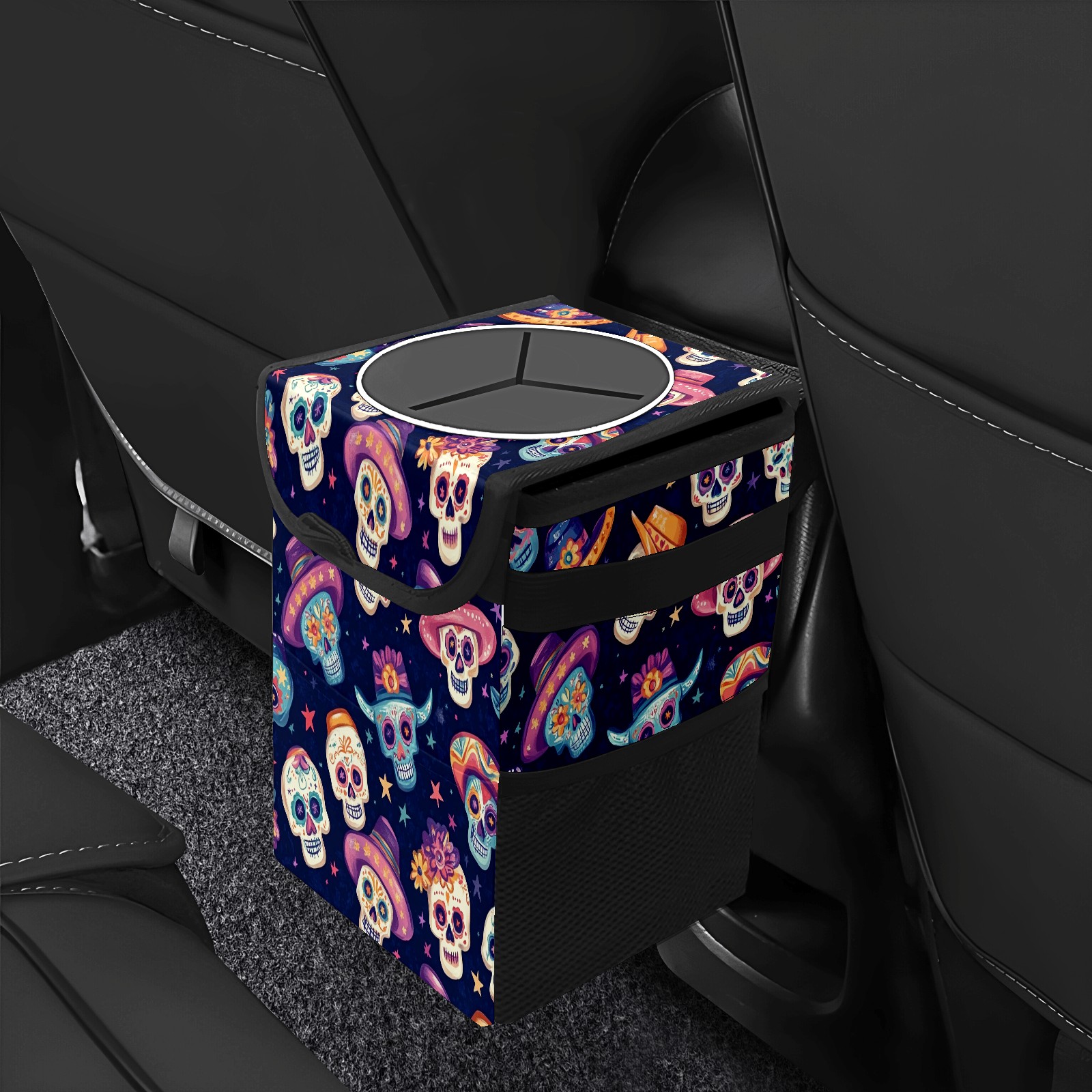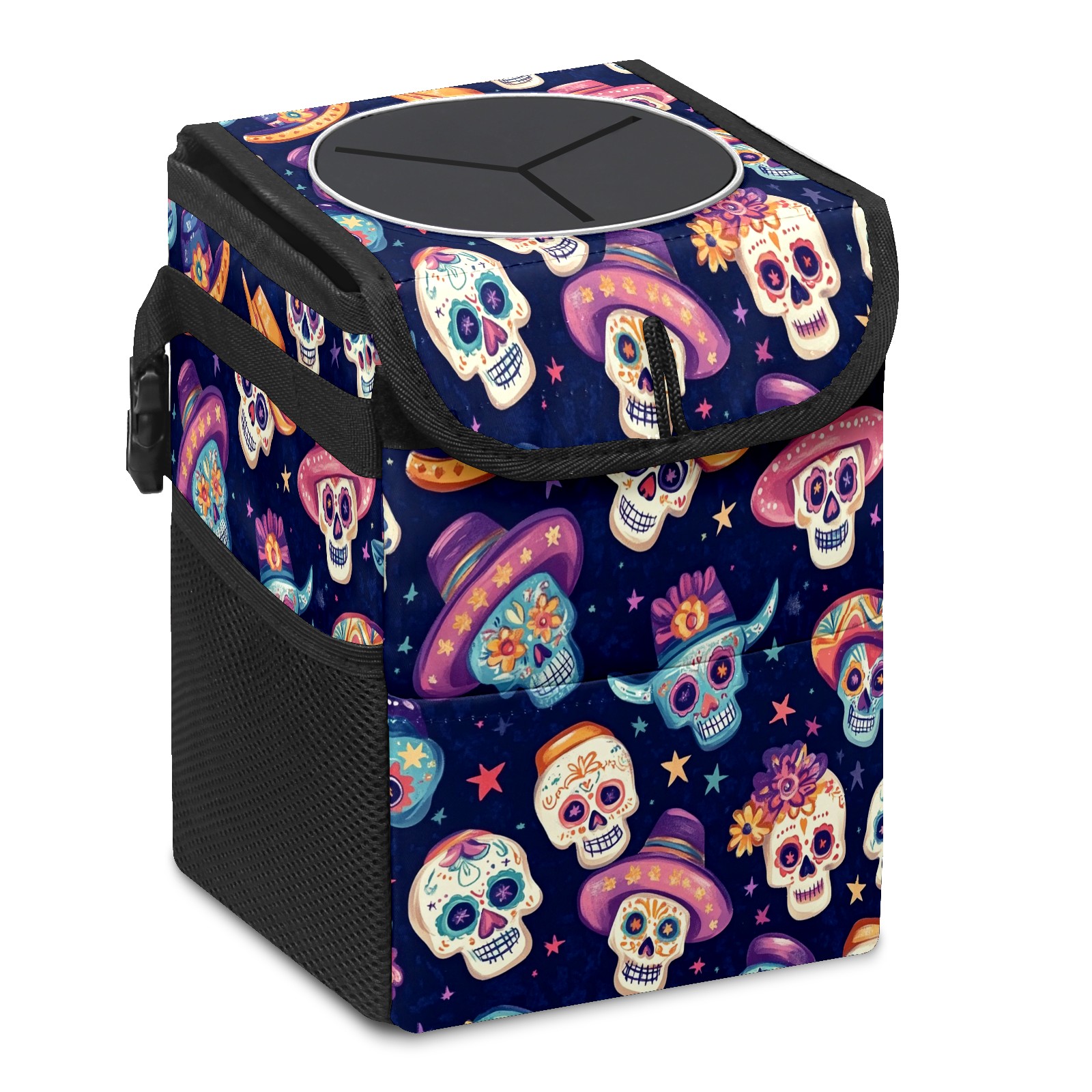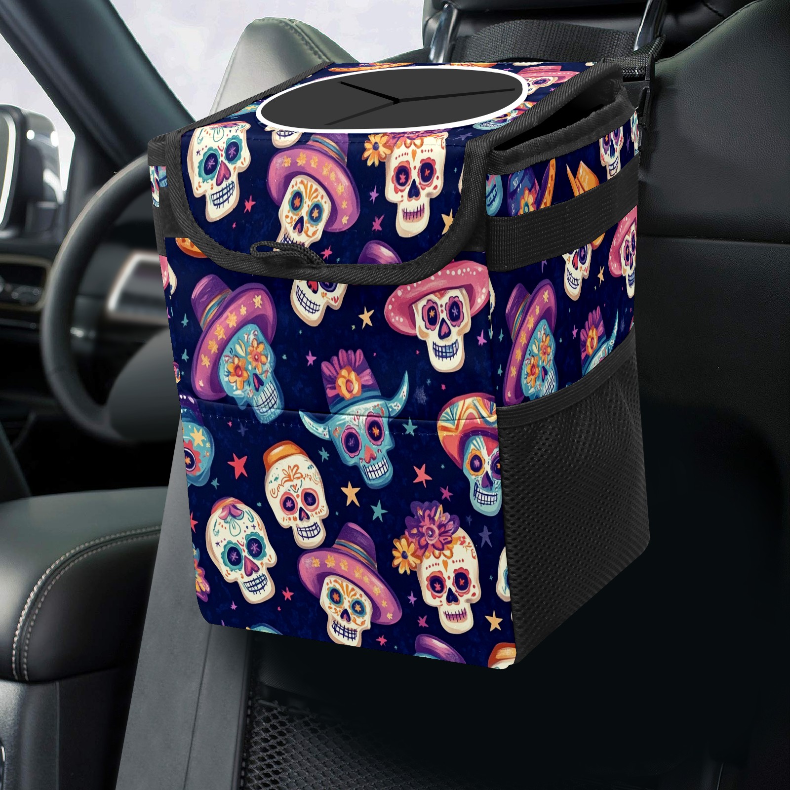 Car Trash Can with Lid, Small Portable Hanging Automotive Garbage Bin for Vehicles, Leakproof Waste Bag Container for SUV Truck Van Interior Auto Travel Road Trips(Sugar Skulls And Mexican Hat)