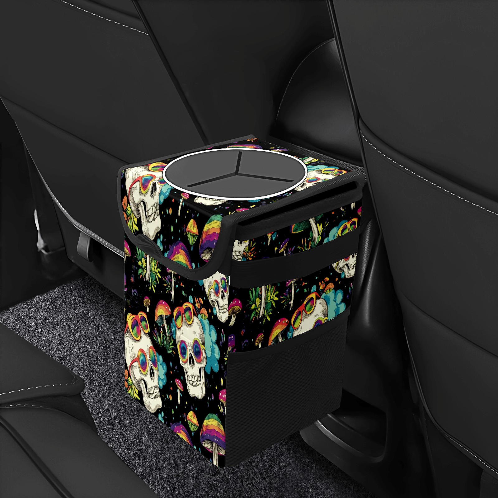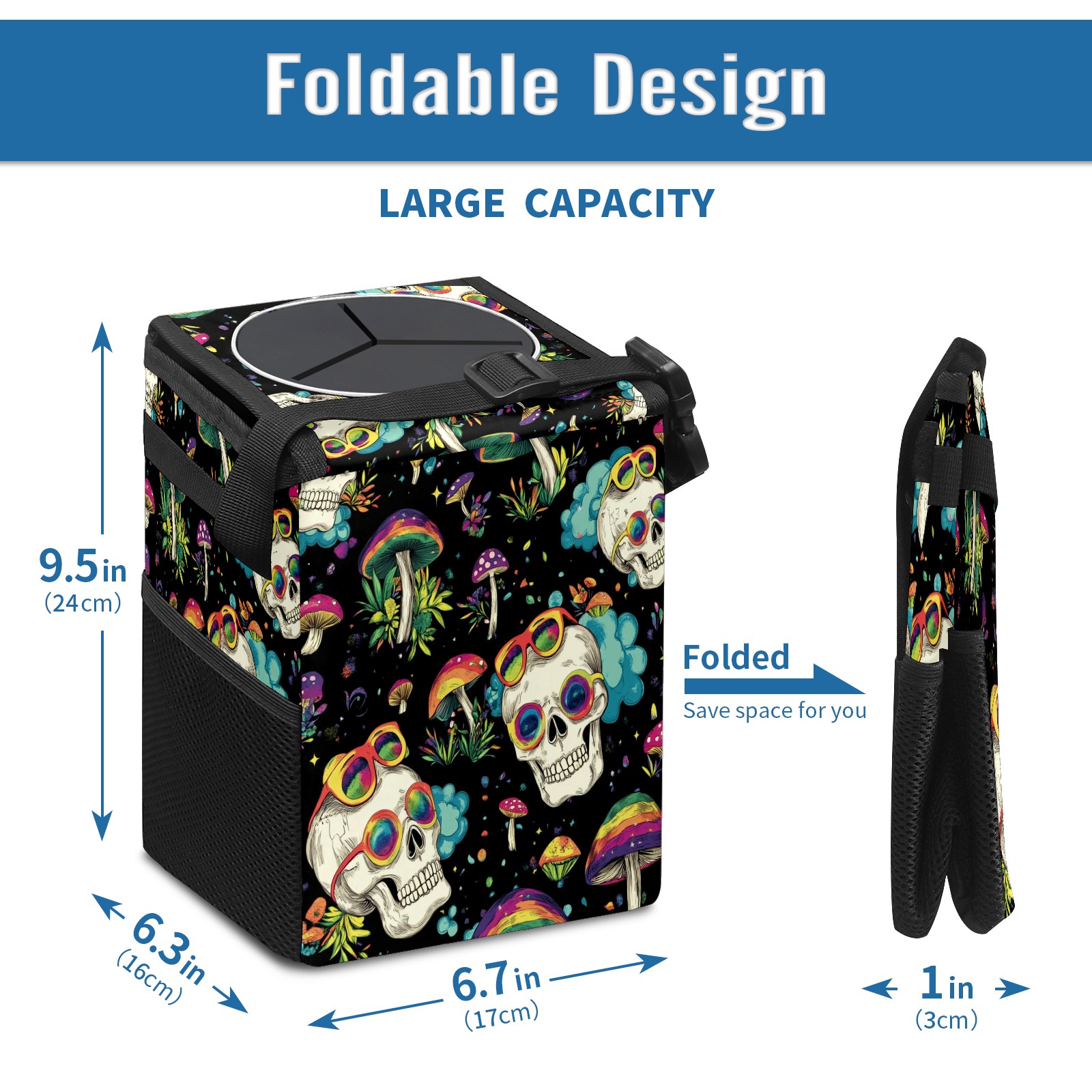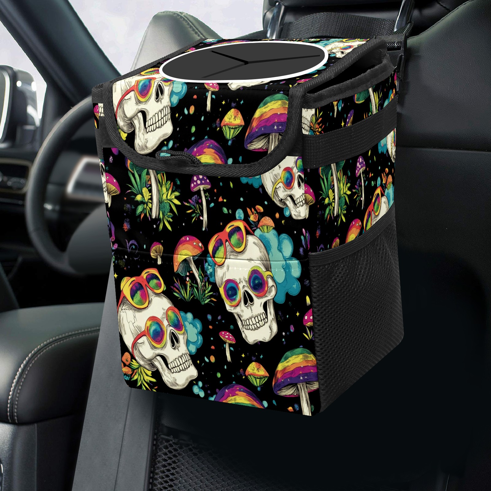 Car Trash Can with Lid, Small Portable Hanging Automotive Garbage Bin for Vehicles, Leakproof Waste Bag Container for SUV Truck Van Interior Auto Travel Road Trips(Skulls With Rainbow Eyes)