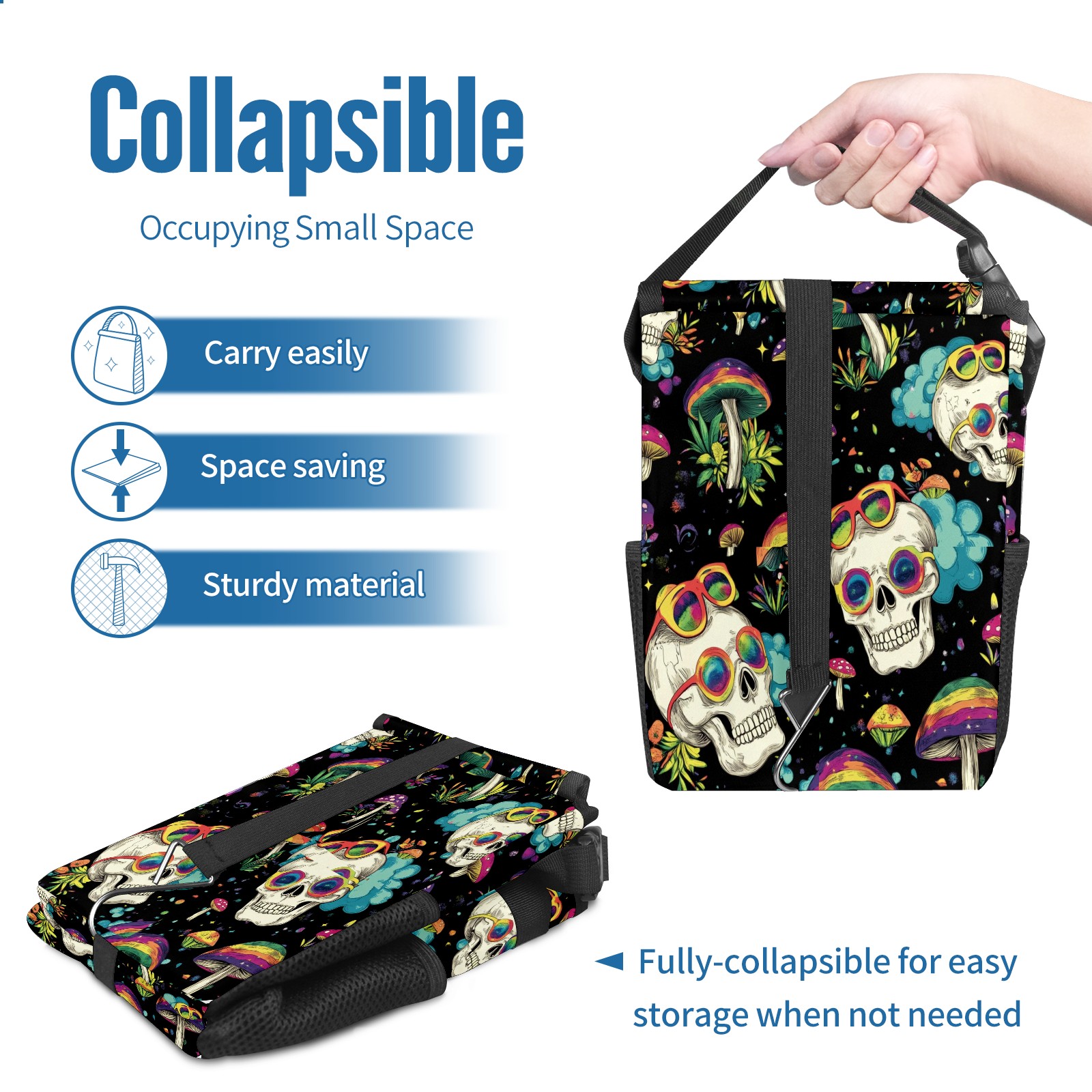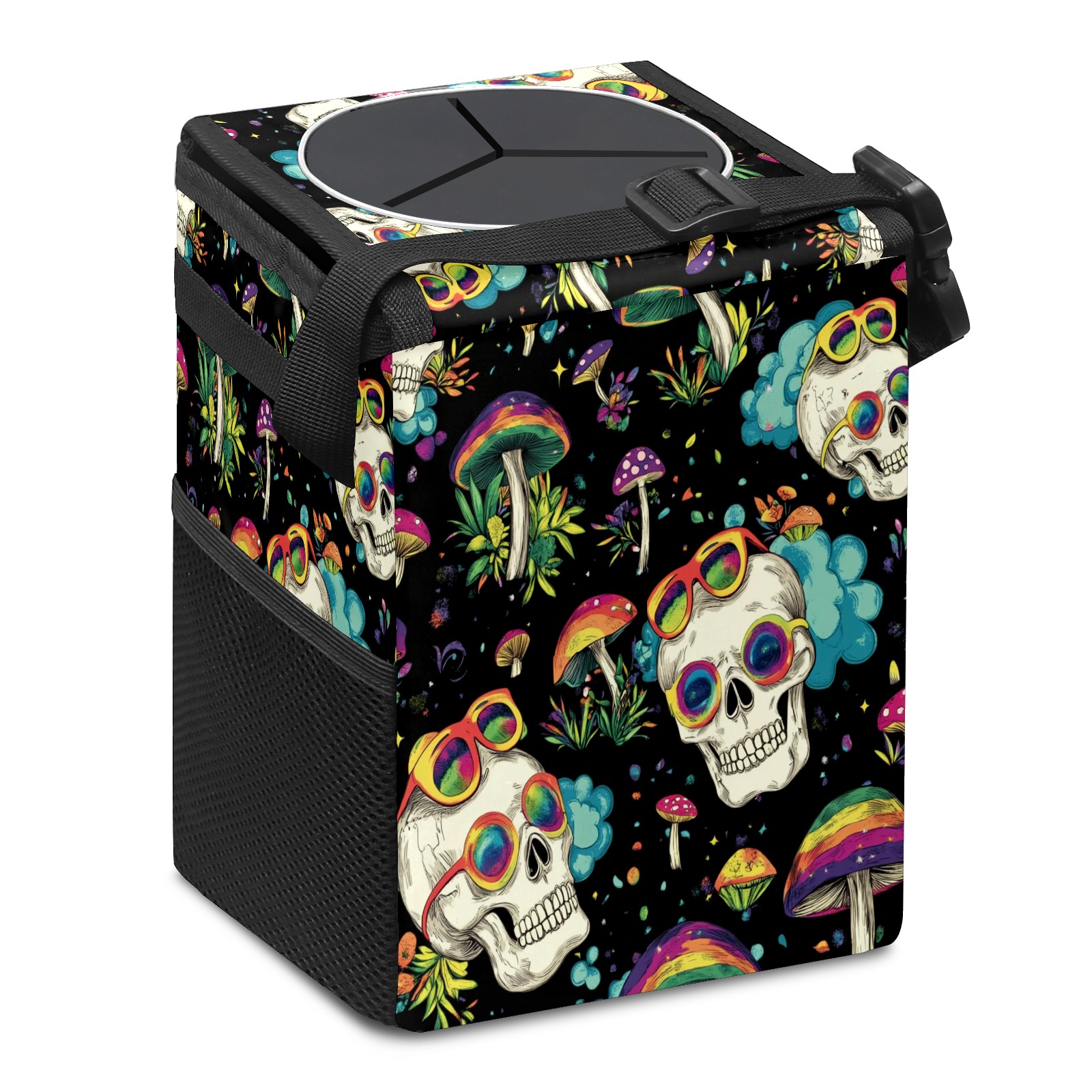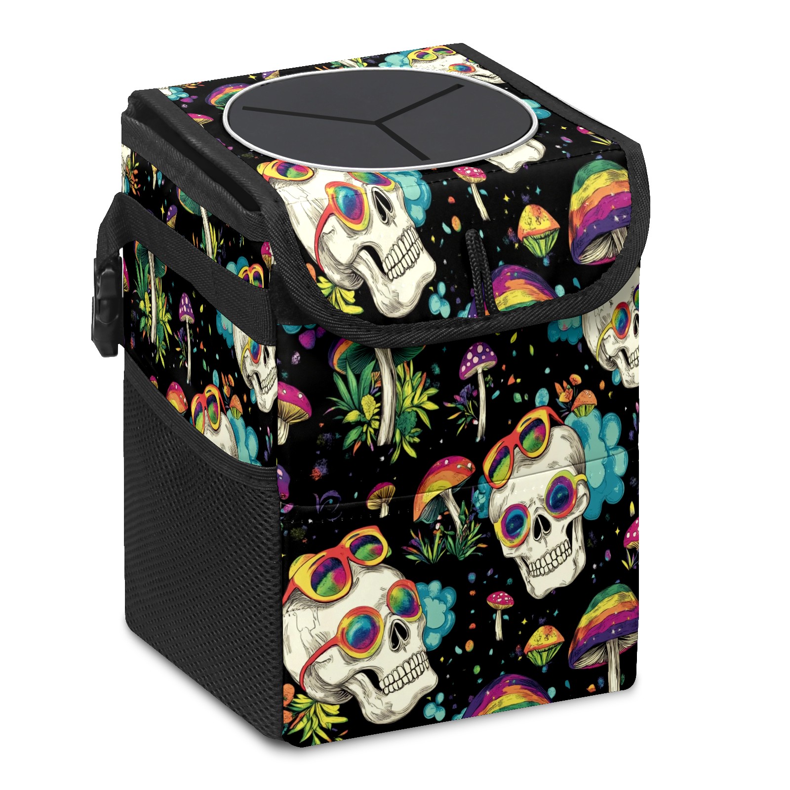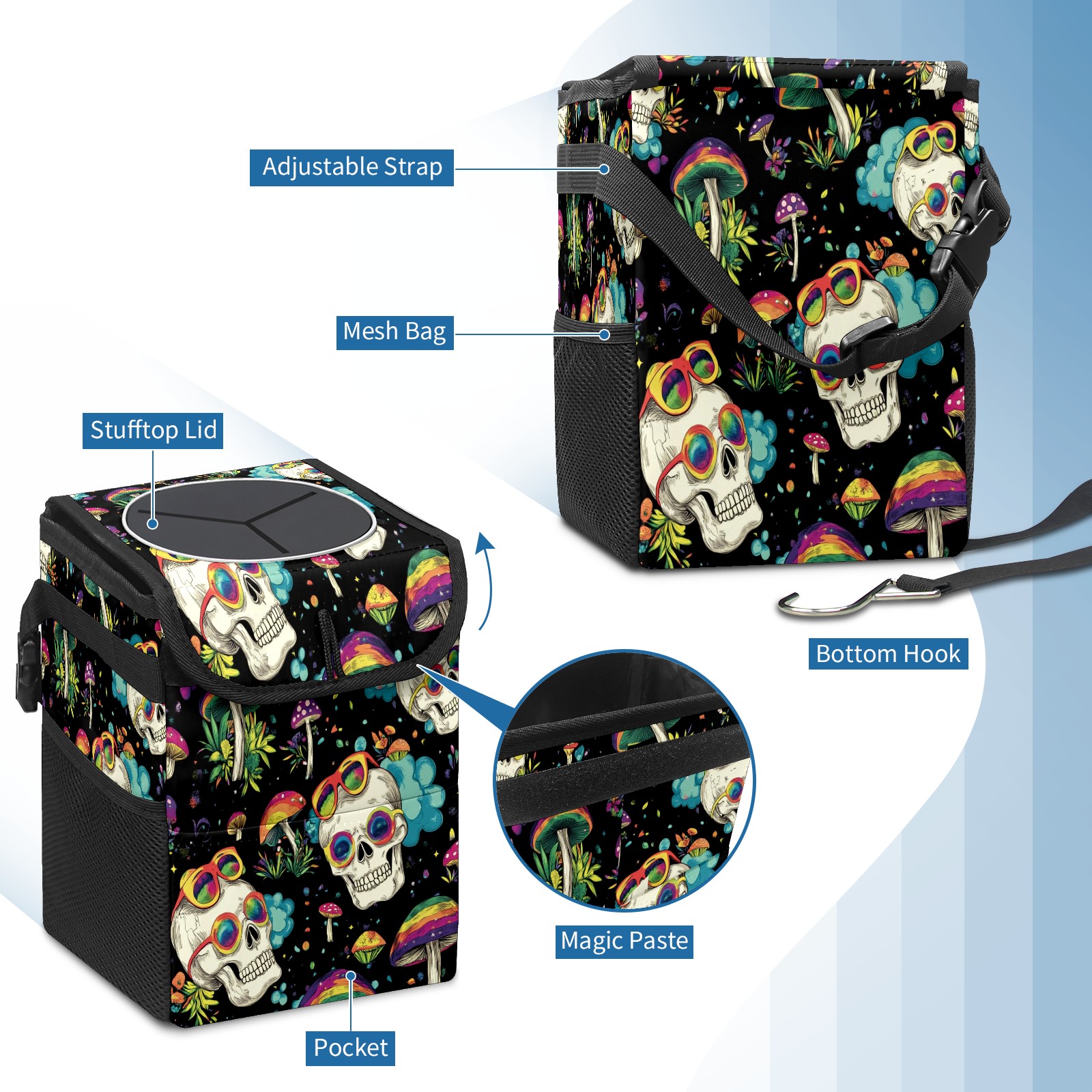 Car Trash Can with Lid, Small Portable Hanging Automotive Garbage Bin for Vehicles, Leakproof Waste Bag Container for SUV Truck Van Interior Auto Travel Road Trips(Skulls With Rainbow Eyes)