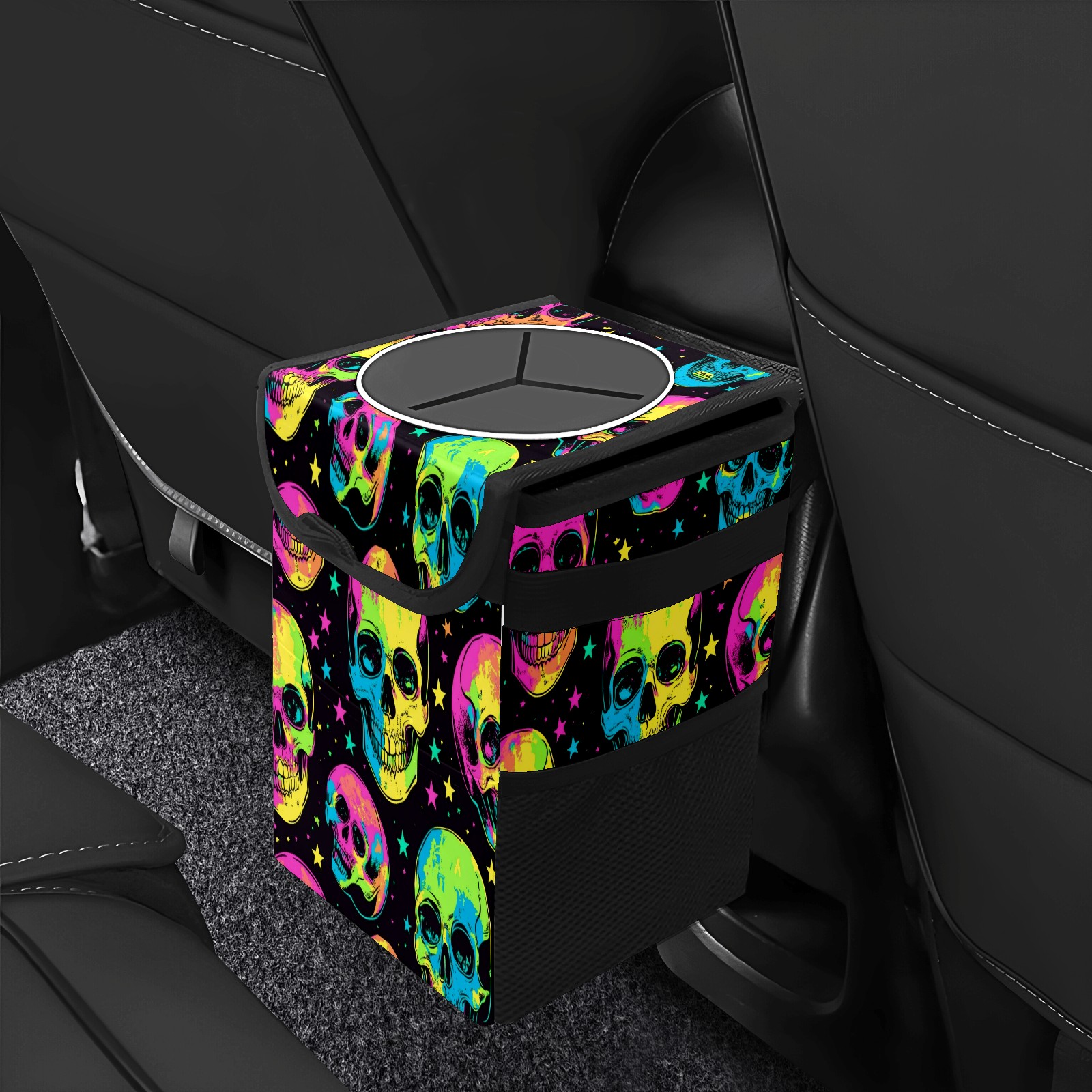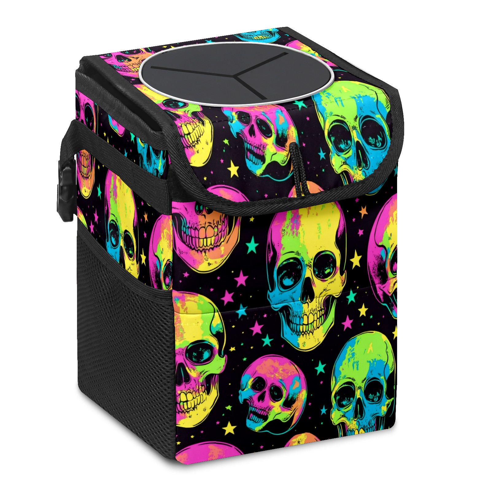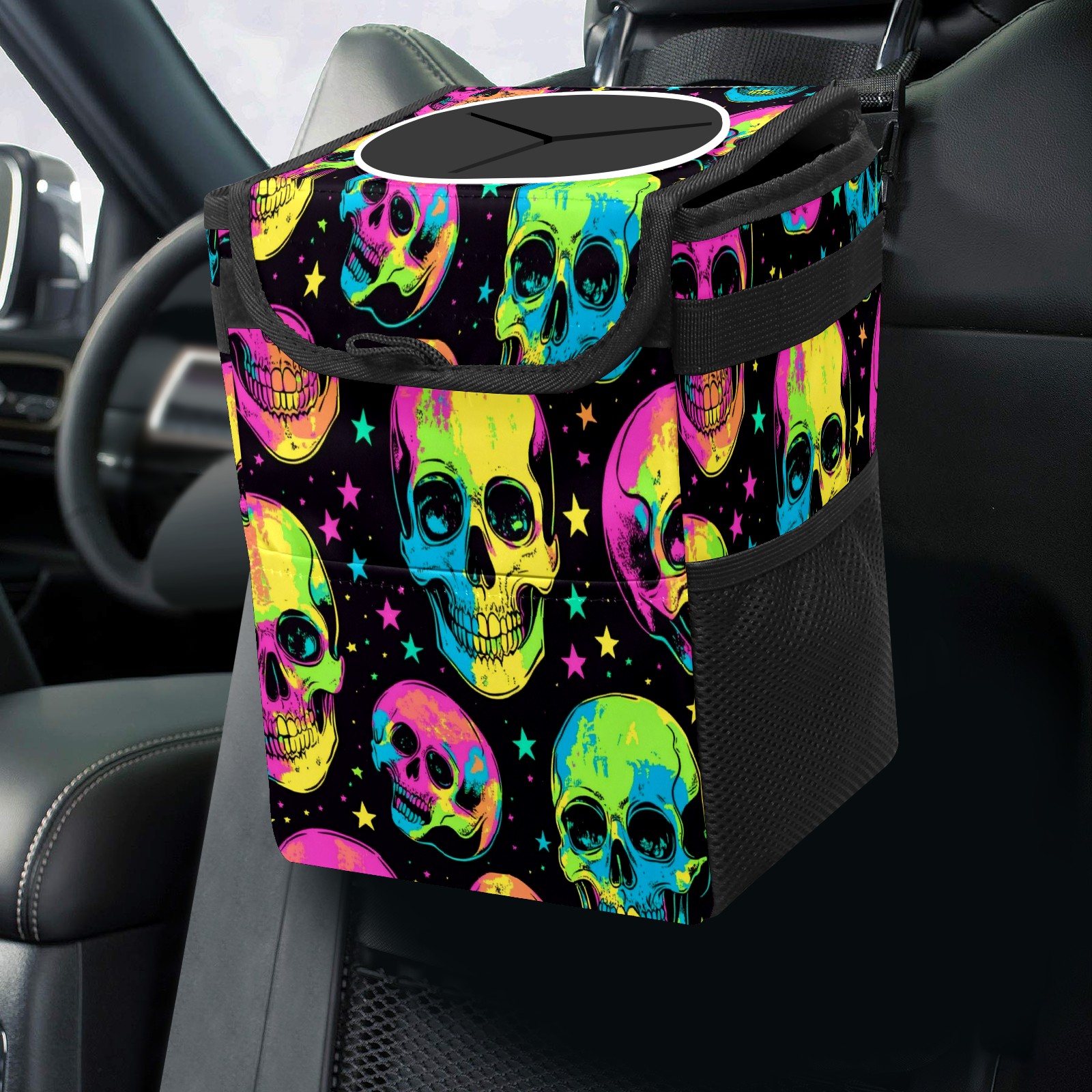 Car Trash Can with Lid, Small Portable Hanging Automotive Garbage Bin for Vehicles, Leakproof Waste Bag Container for SUV Truck Van Interior Auto Travel Road Trips(Skulls In Neon Colors)