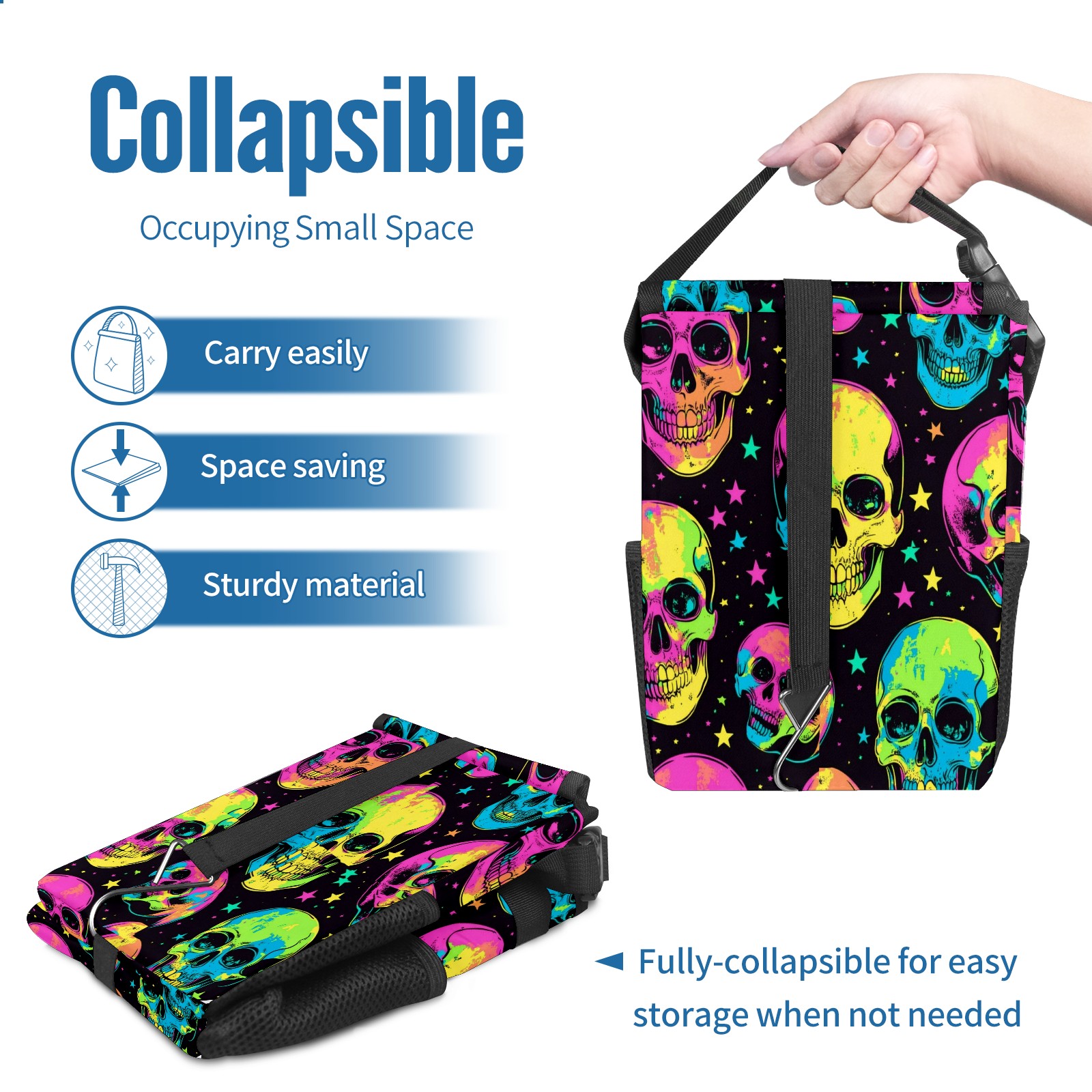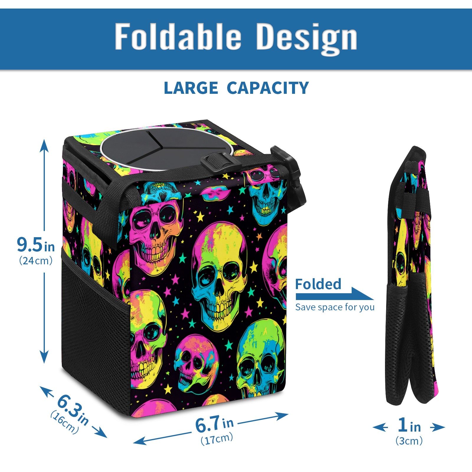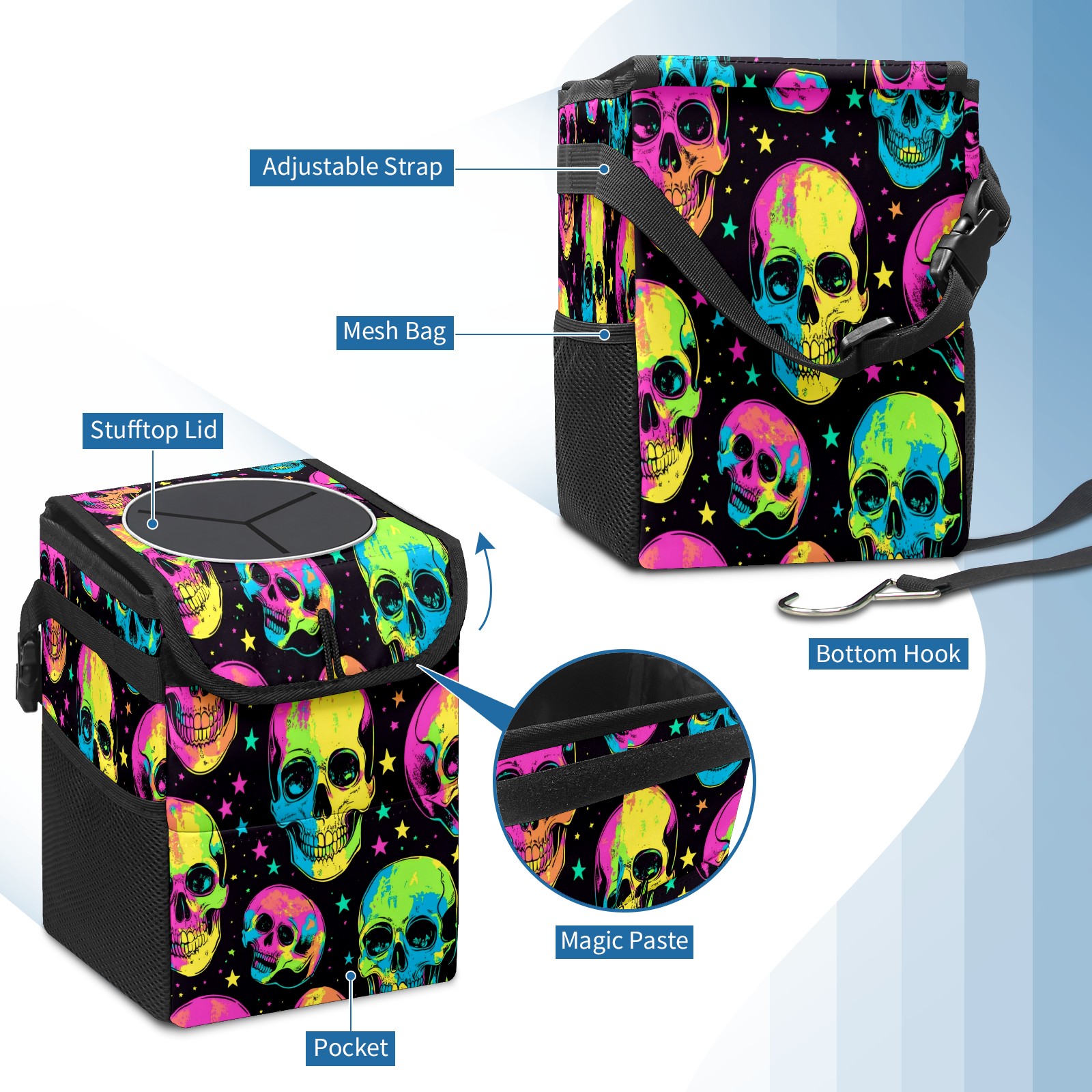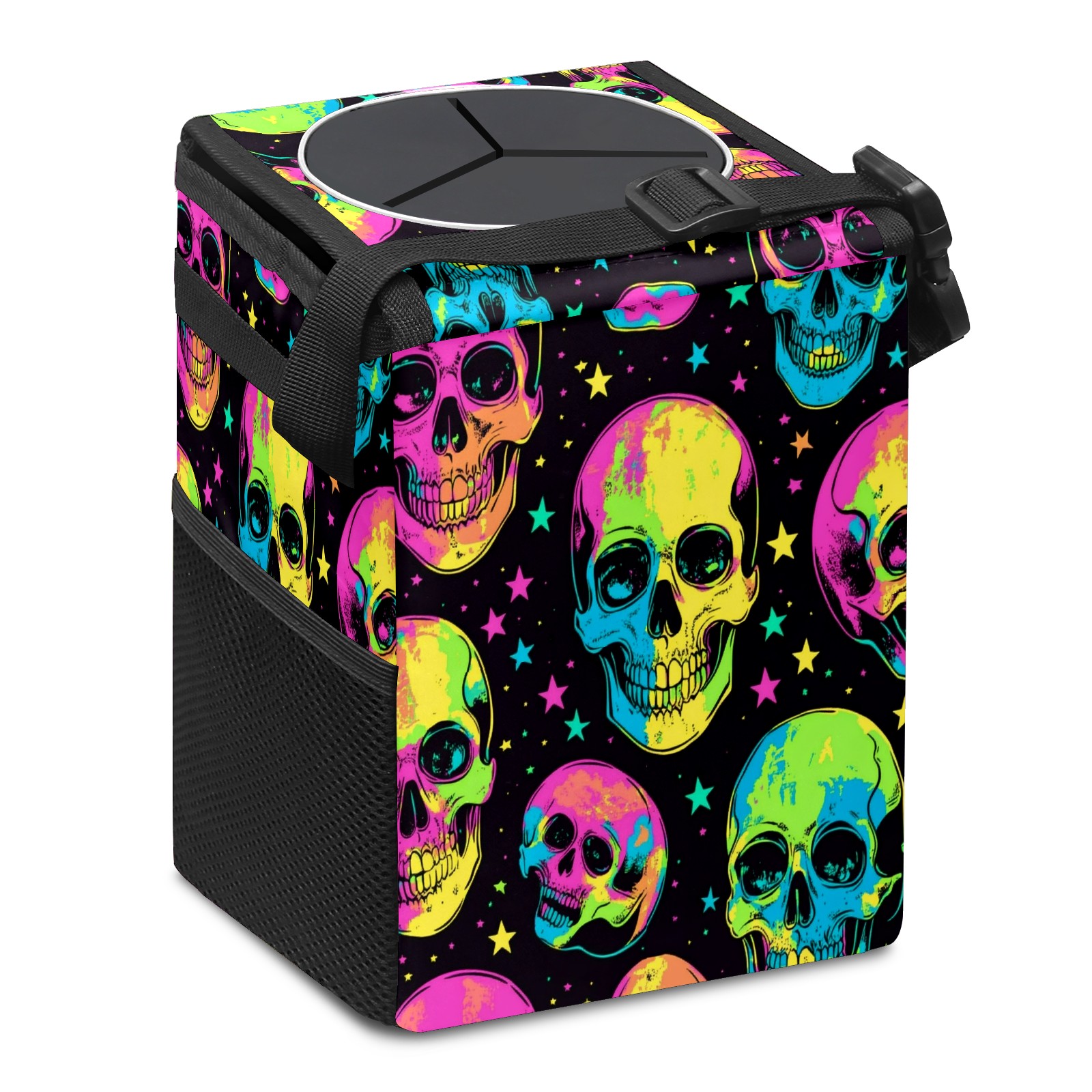Car Trash Can with Lid, Small Portable Hanging Automotive Garbage Bin for Vehicles, Leakproof Waste Bag Container for SUV Truck Van Interior Auto Travel Road Trips(Skulls In Neon Colors)