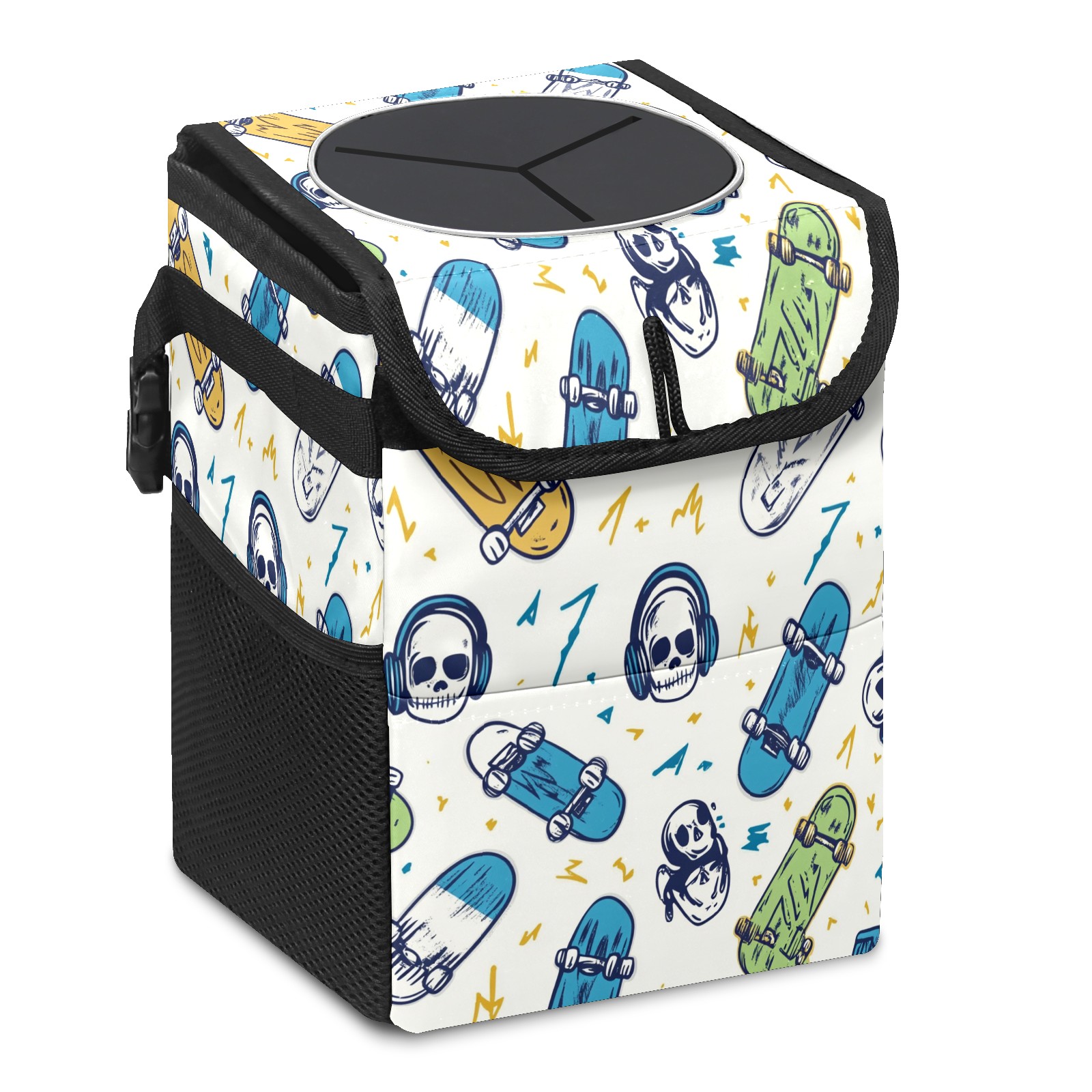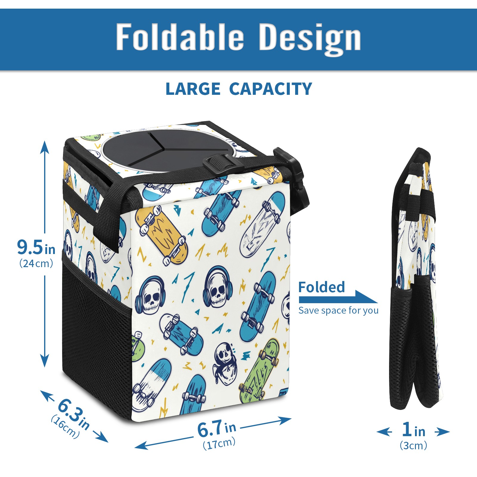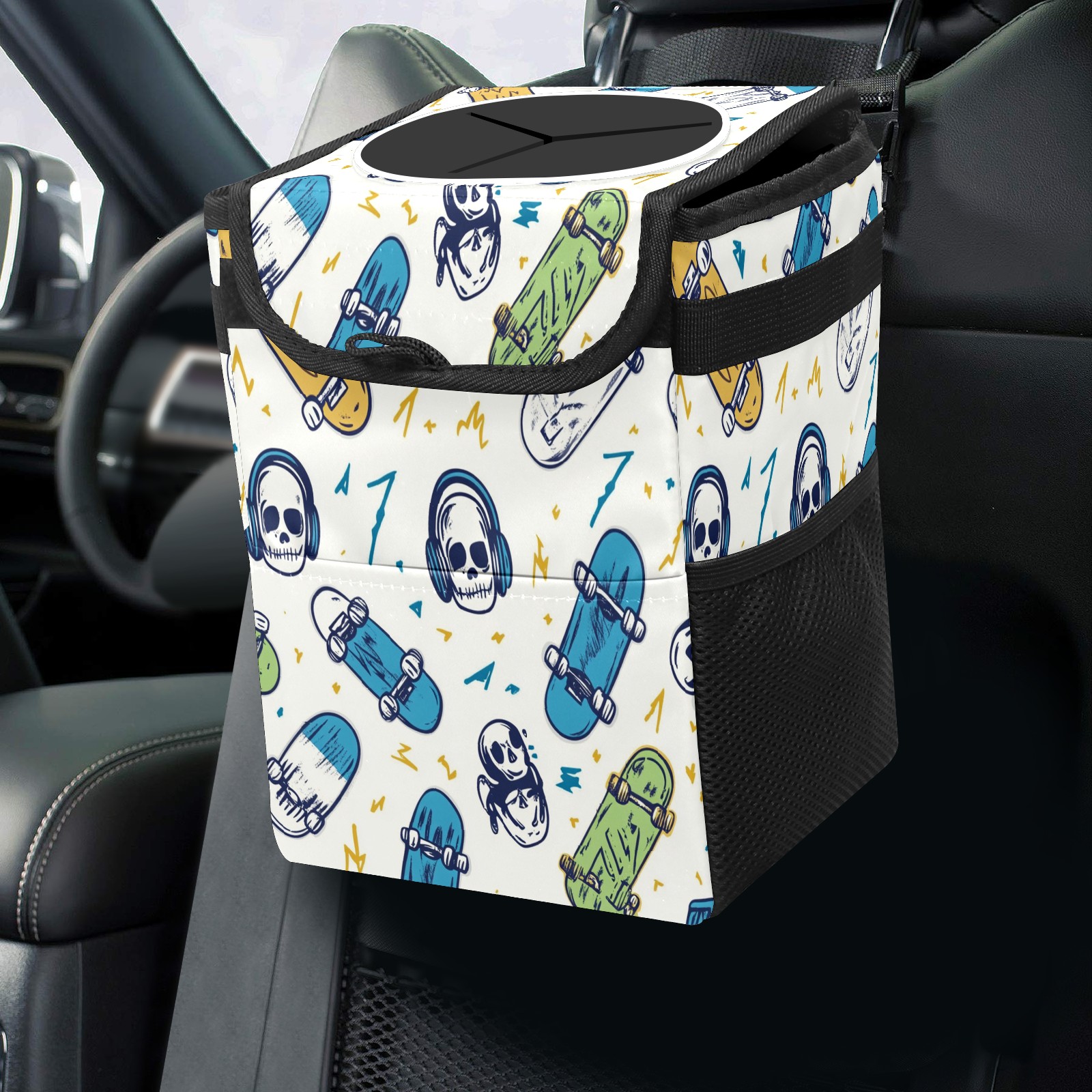 Car Trash Can with Lid, Small Portable Hanging Automotive Garbage Bin for Vehicles, Leakproof Waste Bag Container for SUV Truck Van Interior Auto Travel Road Trips(Skateboards And Skulls)