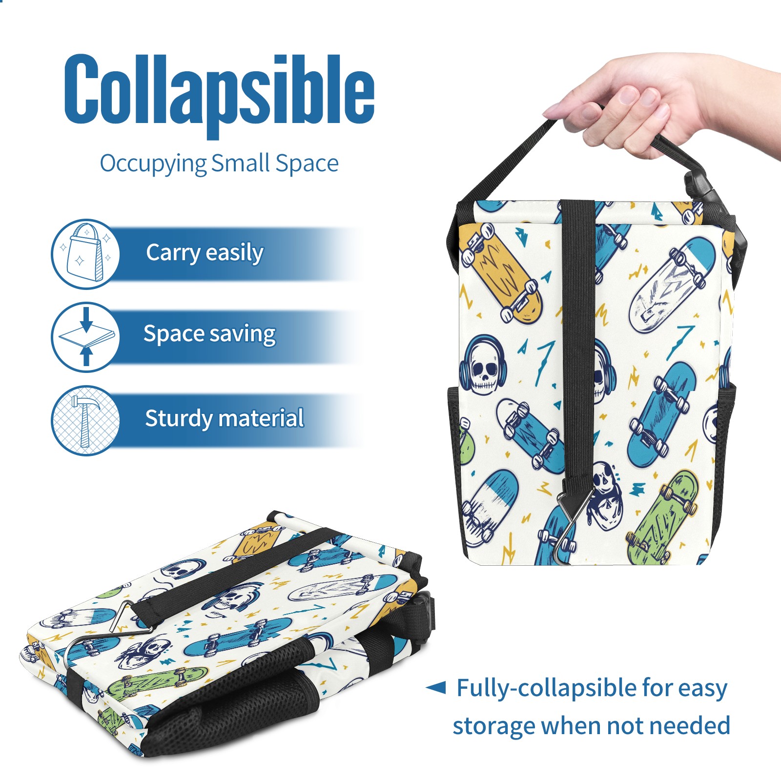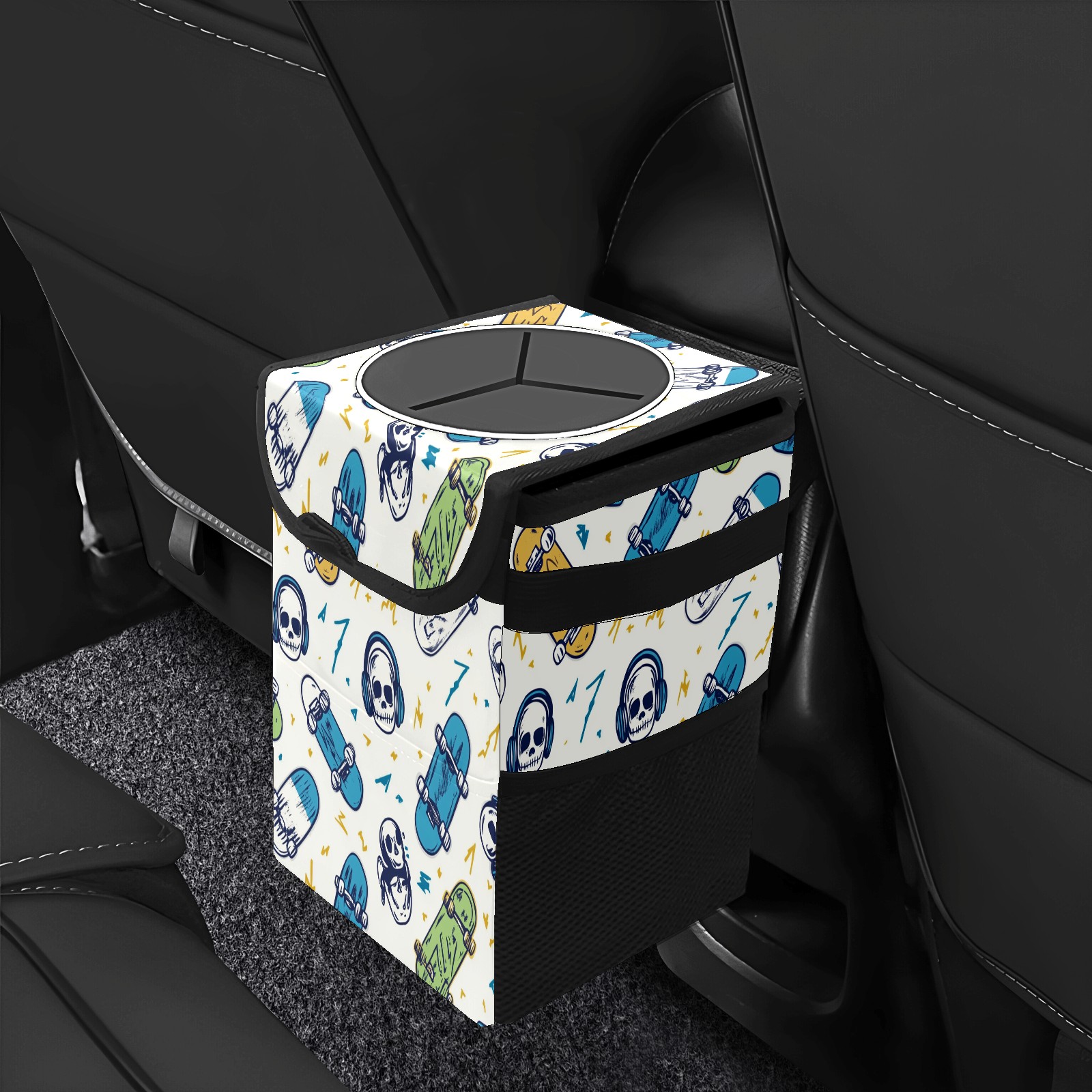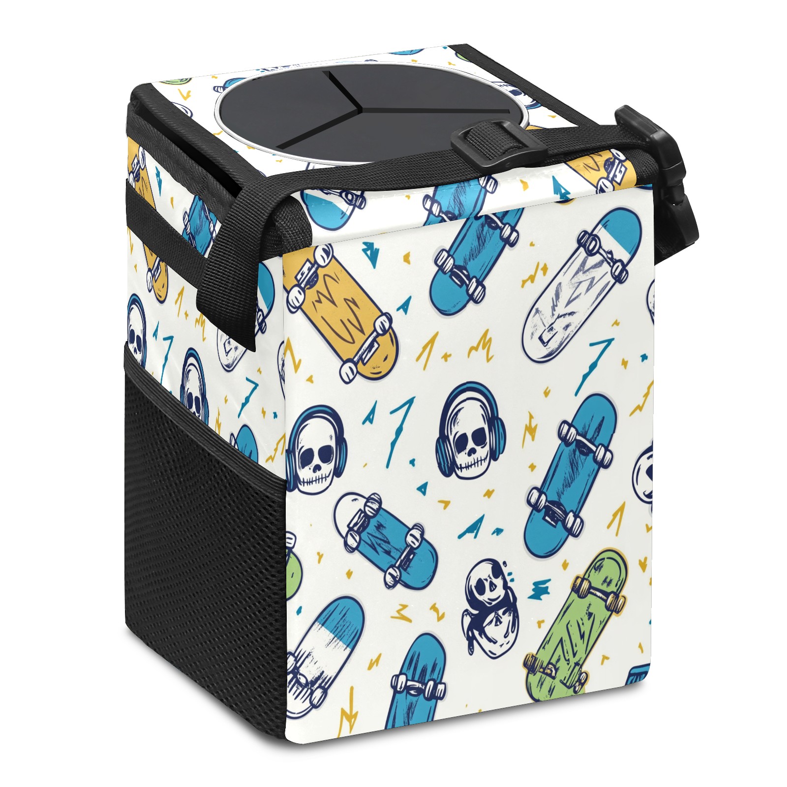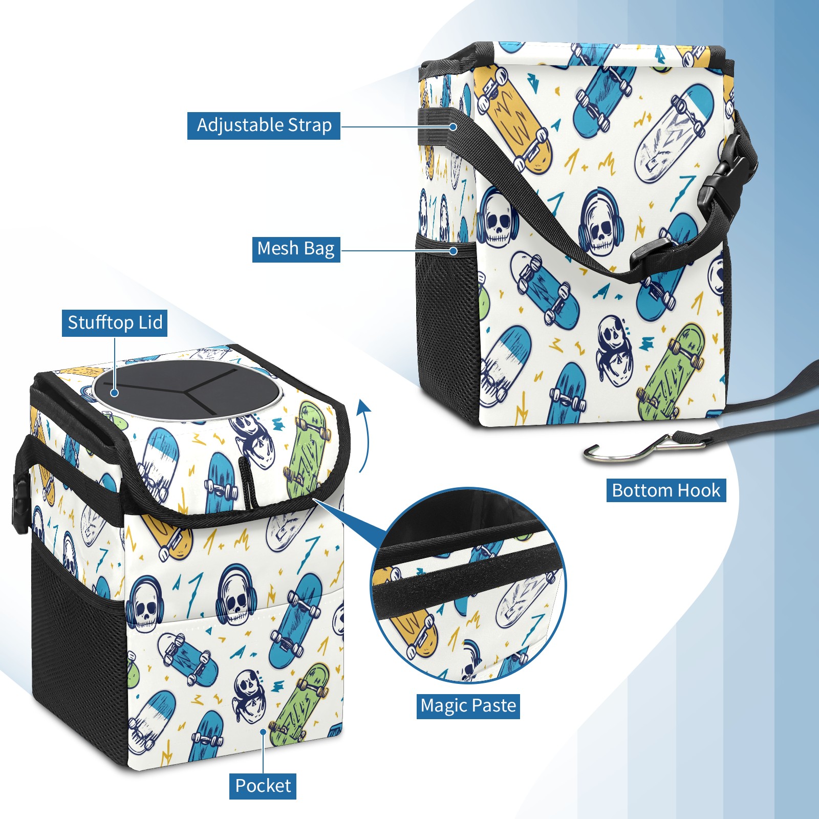 Car Trash Can with Lid, Small Portable Hanging Automotive Garbage Bin for Vehicles, Leakproof Waste Bag Container for SUV Truck Van Interior Auto Travel Road Trips(Skateboards And Skulls)