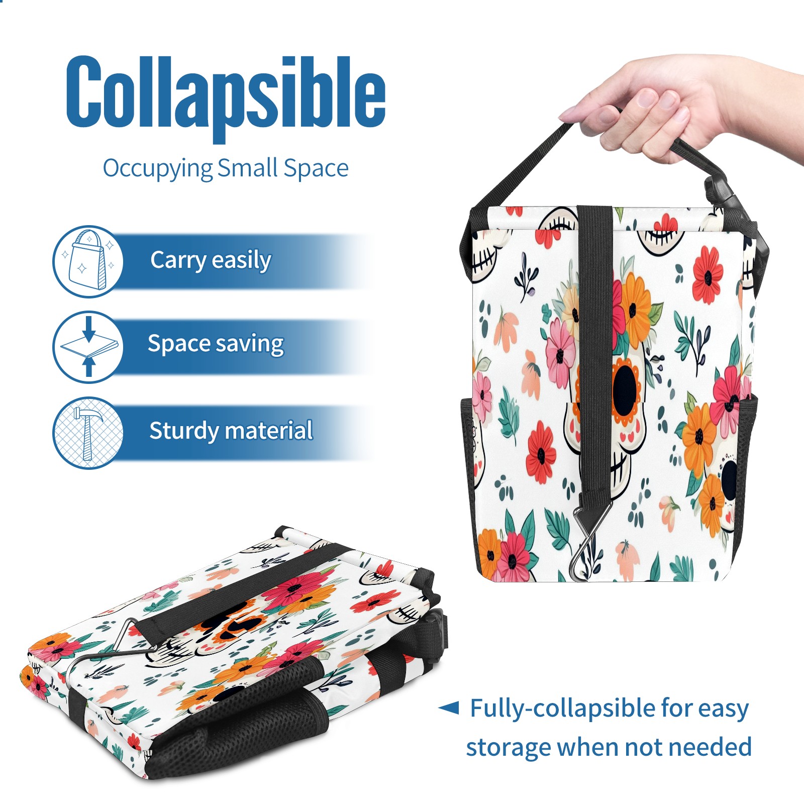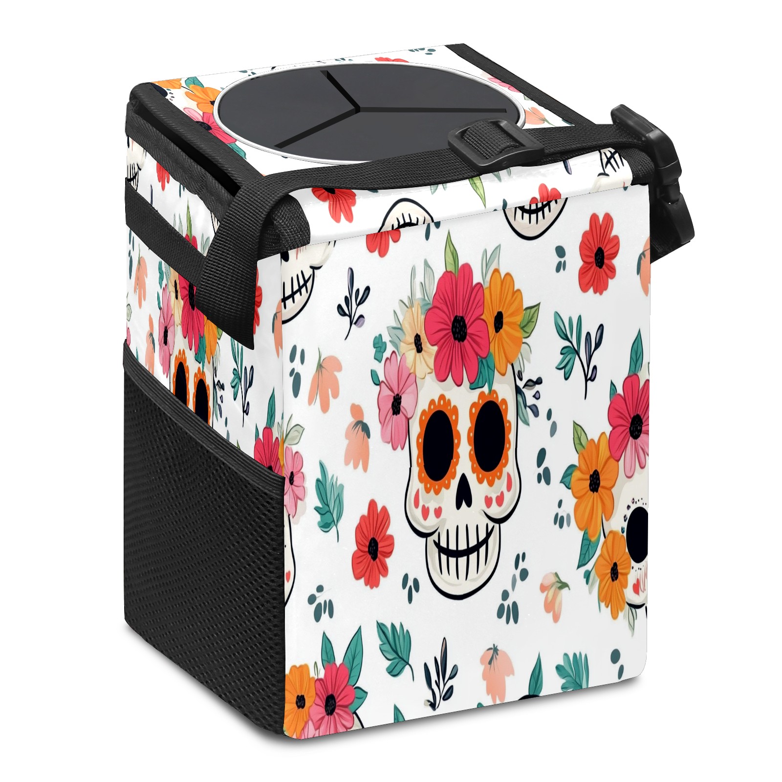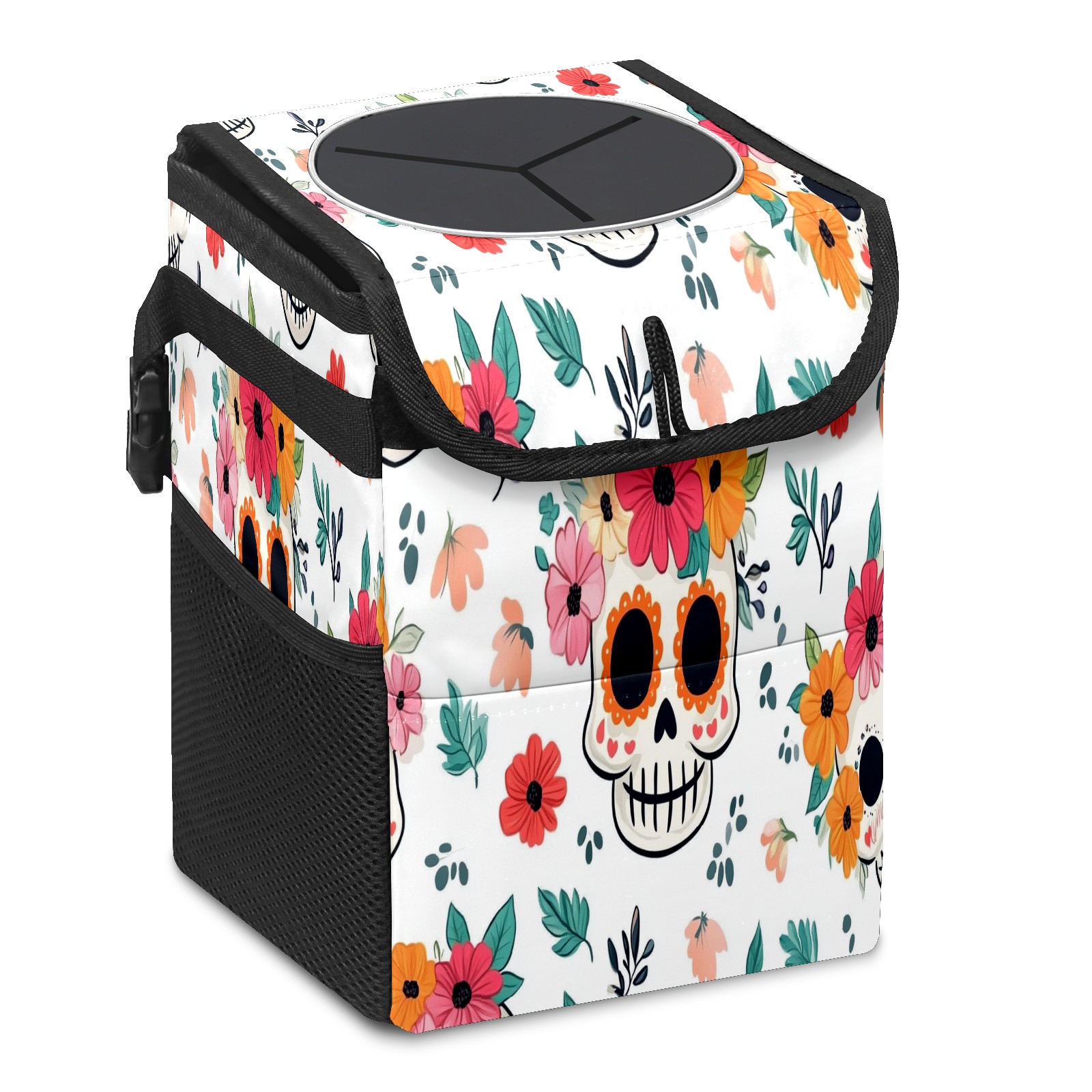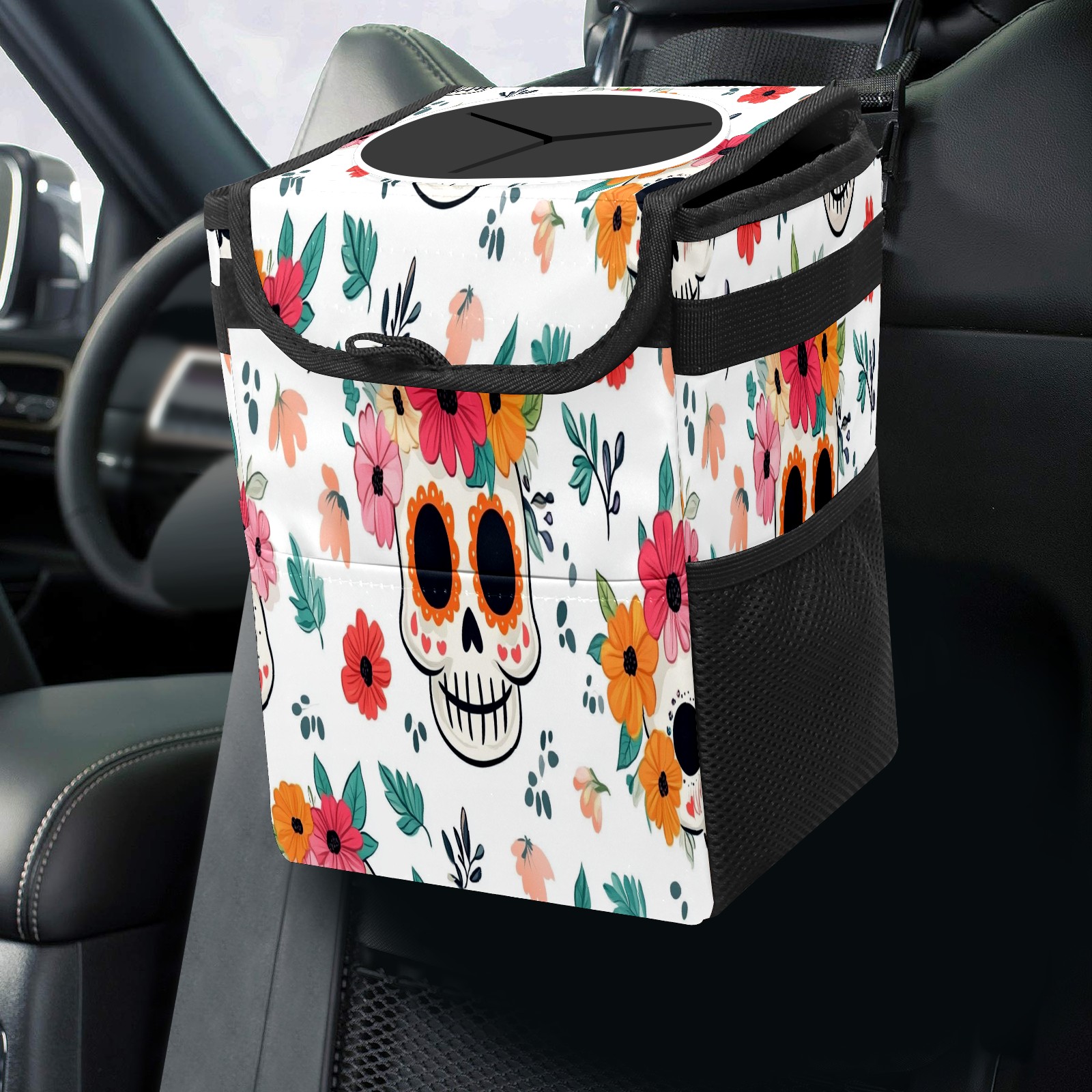 Car Trash Can with Lid, Small Portable Hanging Automotive Garbage Bin for Vehicles, Leakproof Waste Bag Container for SUV Truck Van Interior Auto Travel Road Trips(Cute Skull And Floral)