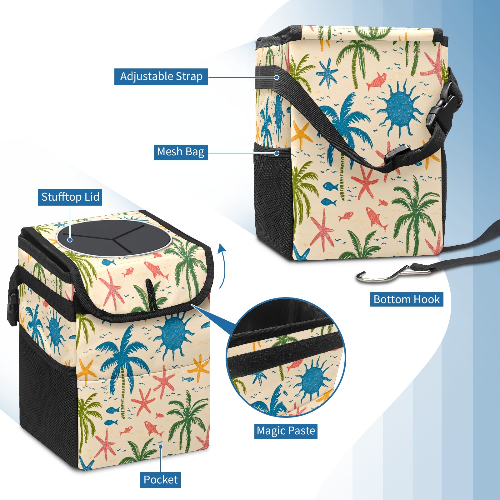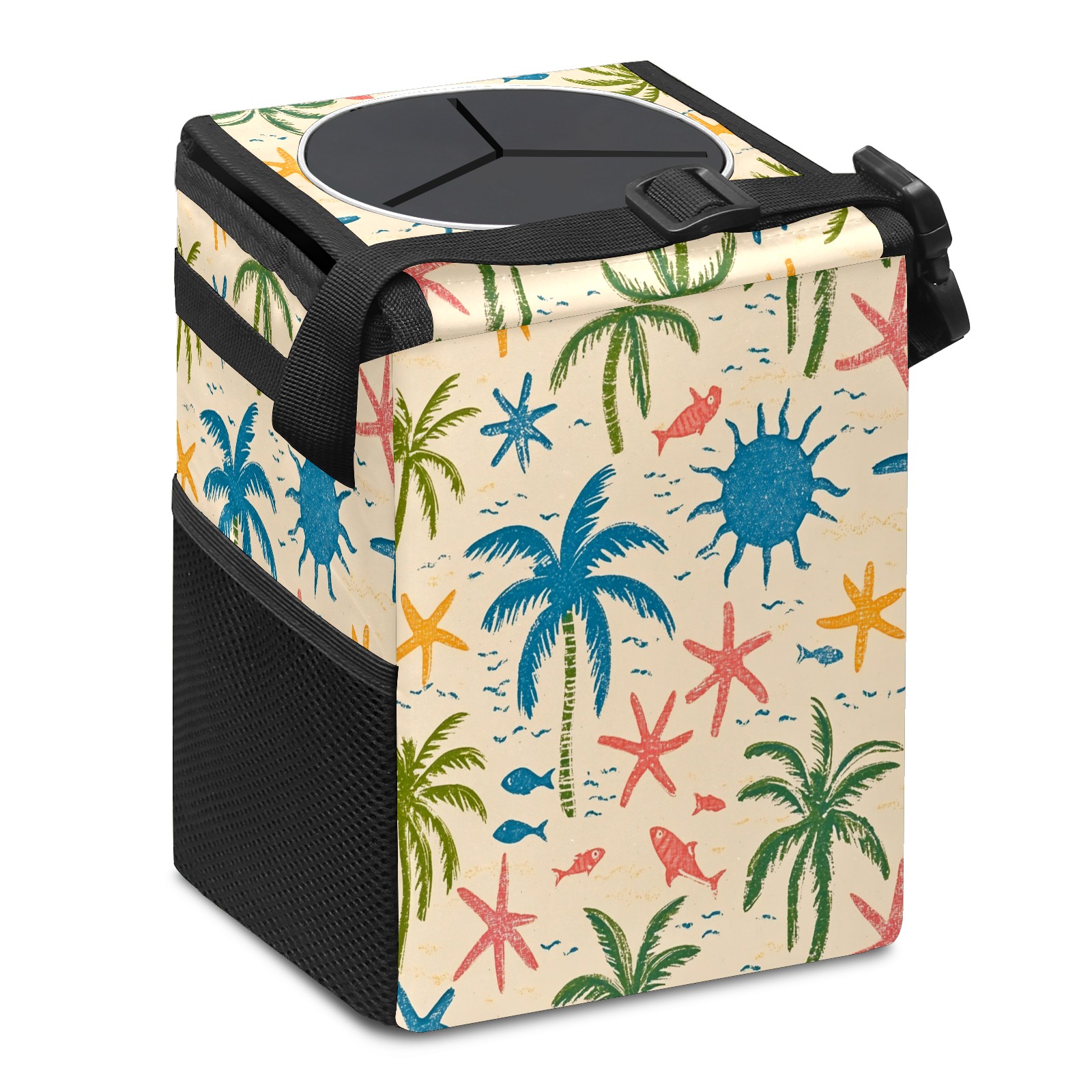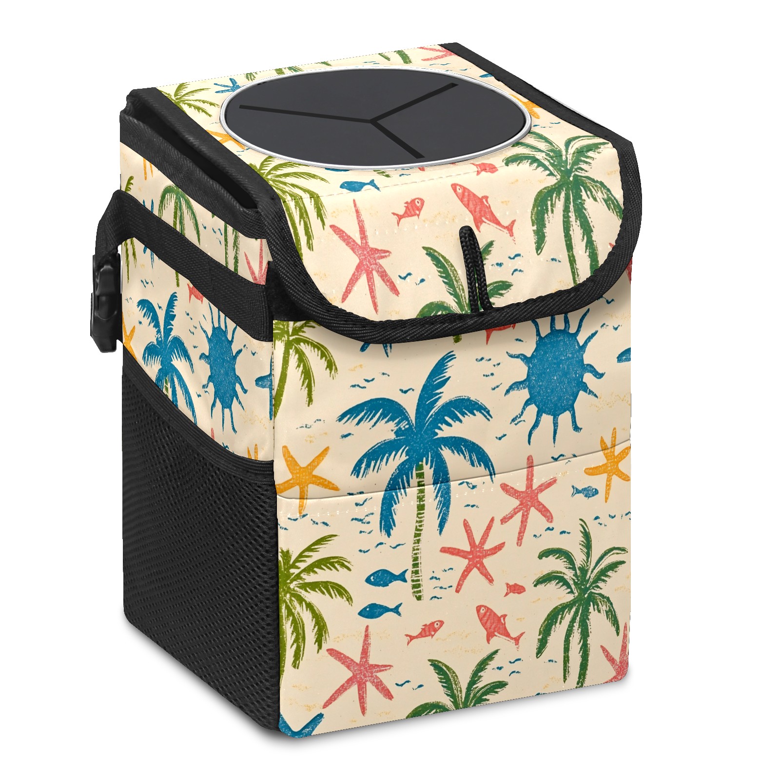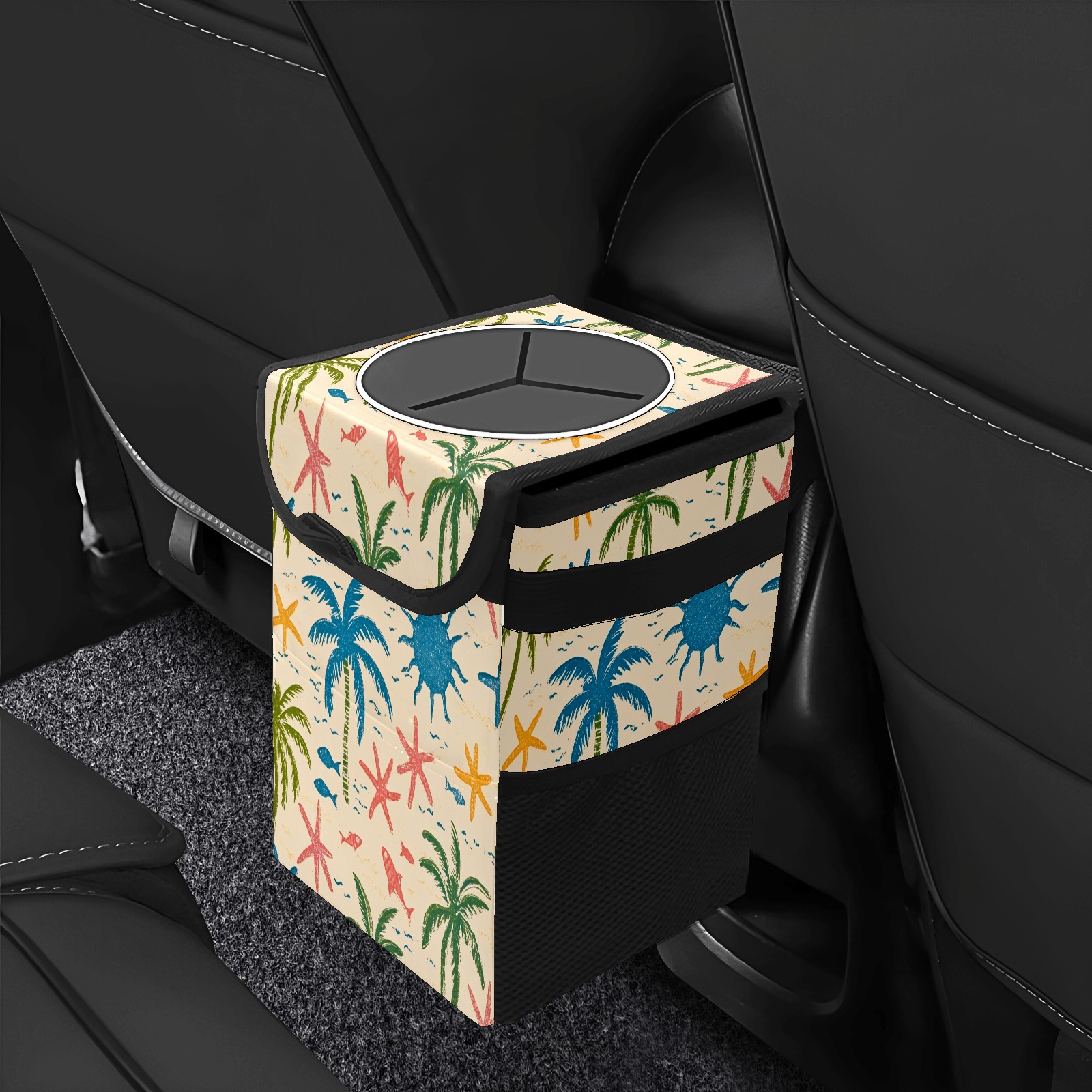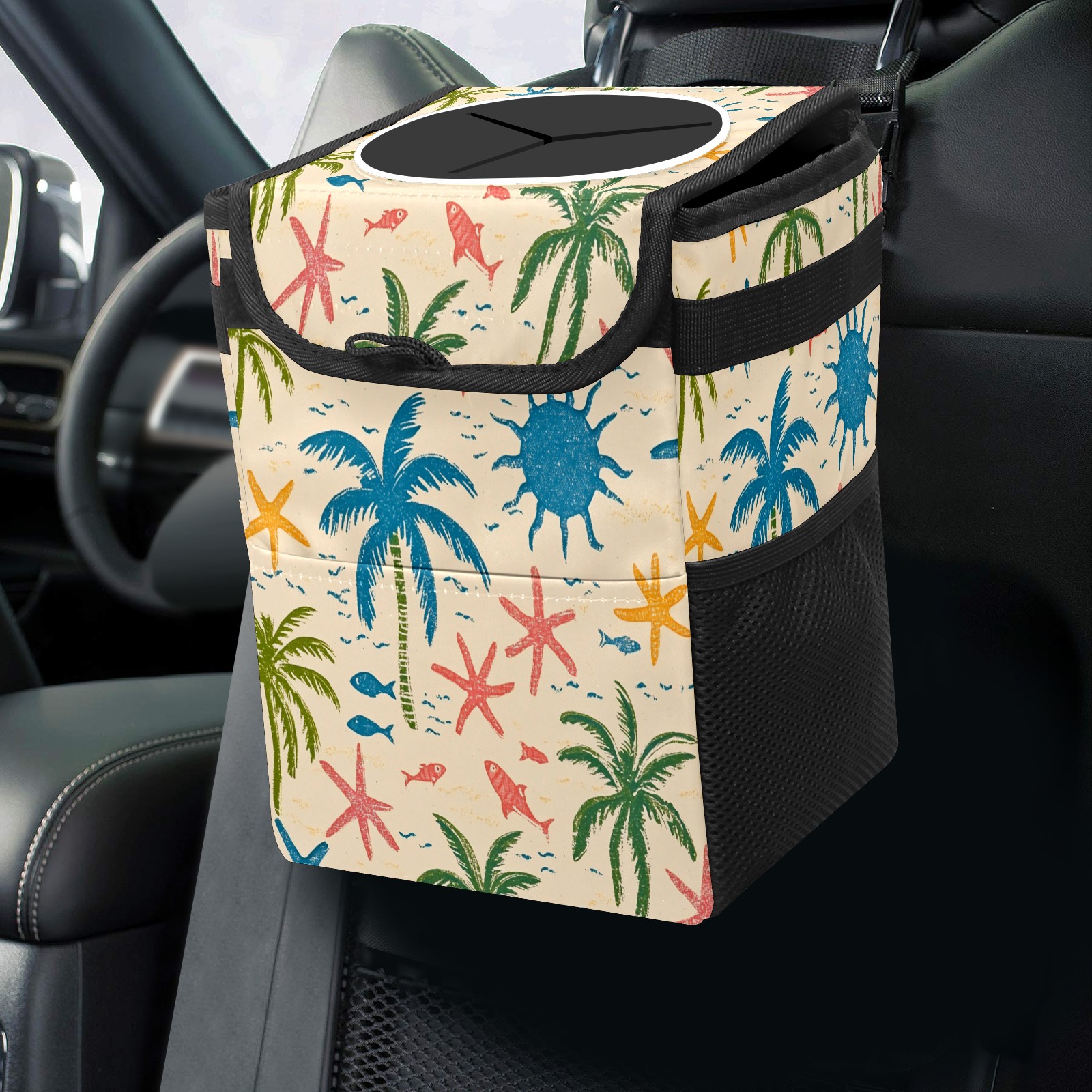 Car Trash Can with Lid, Small Portable Hanging Automotive Garbage Bin for Vehicles, Leakproof Waste Bag Container for SUV Truck Van Interior Auto Travel Road Trips(Palm Trees And Starfish)