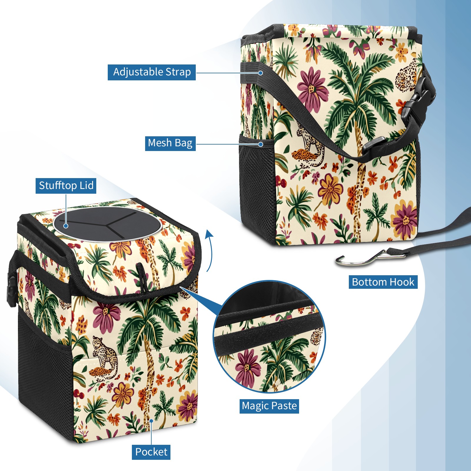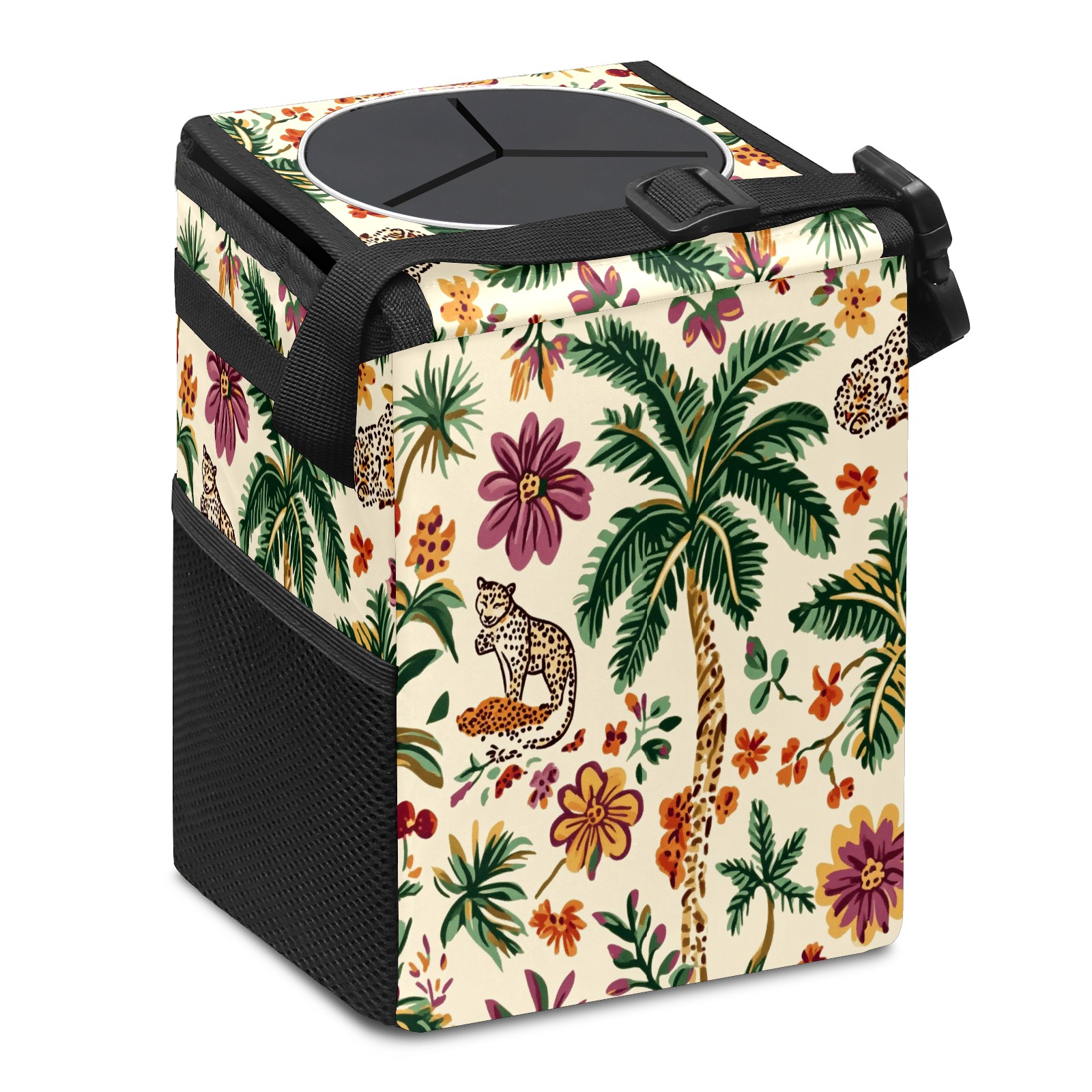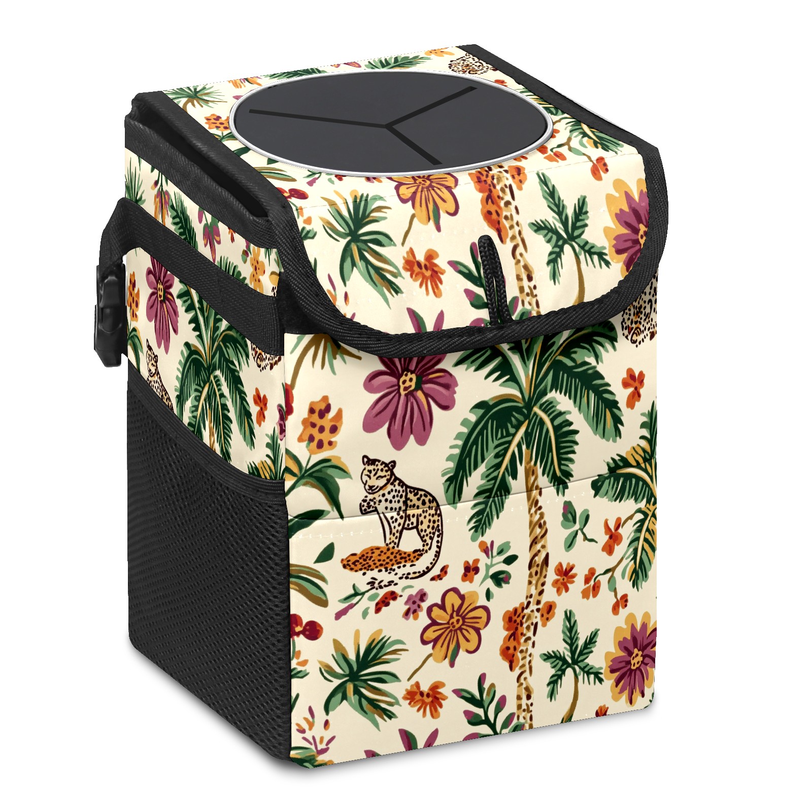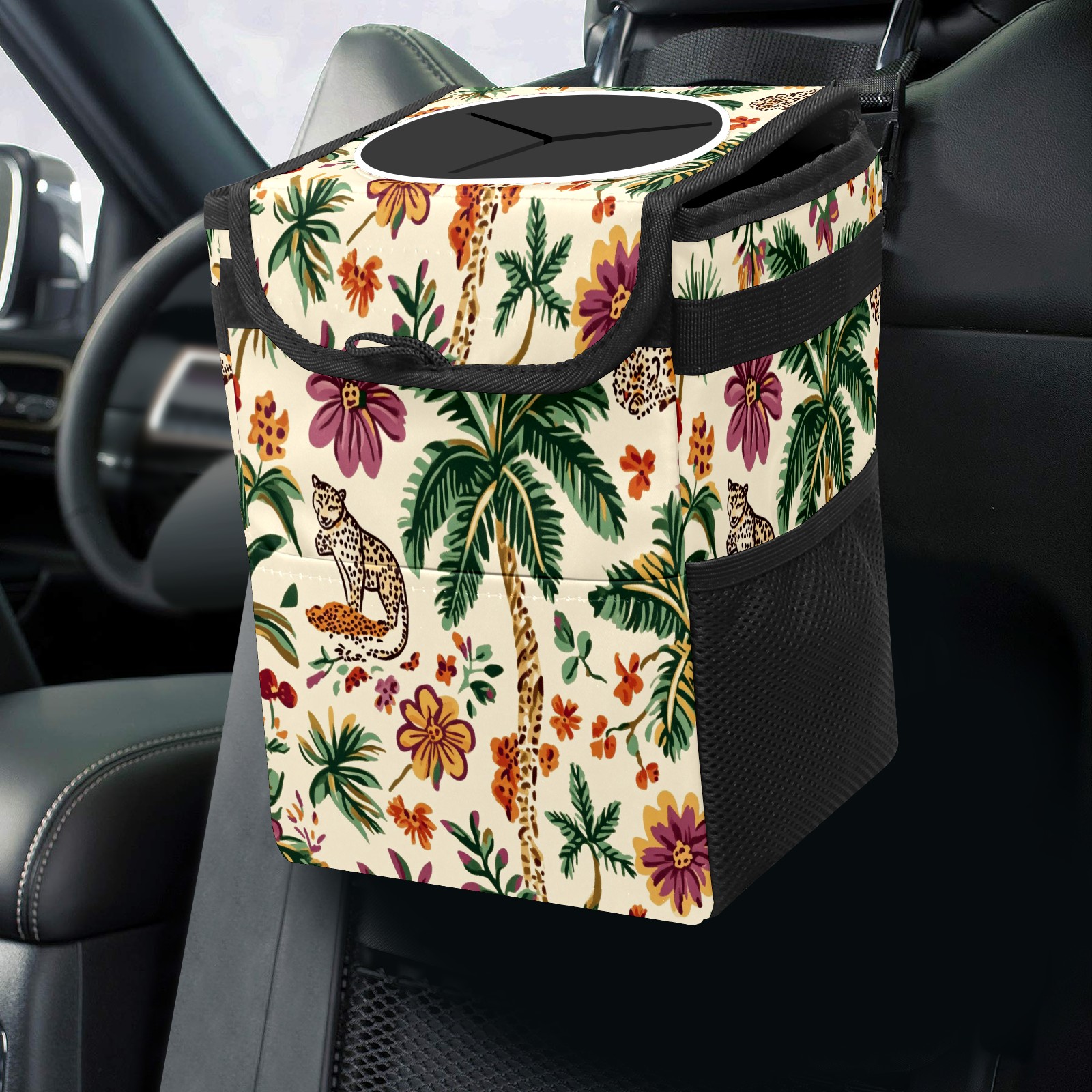 Car Trash Can with Lid, Small Portable Hanging Automotive Garbage Bin for Vehicles, Leakproof Waste Bag Container for SUV Truck Van Interior Auto Travel Road Trips(Tropical Jungle Theme)
