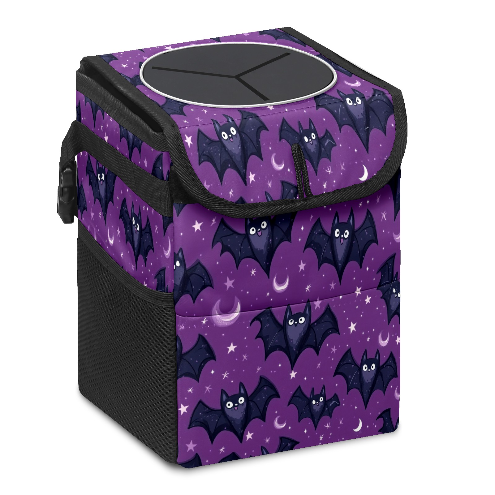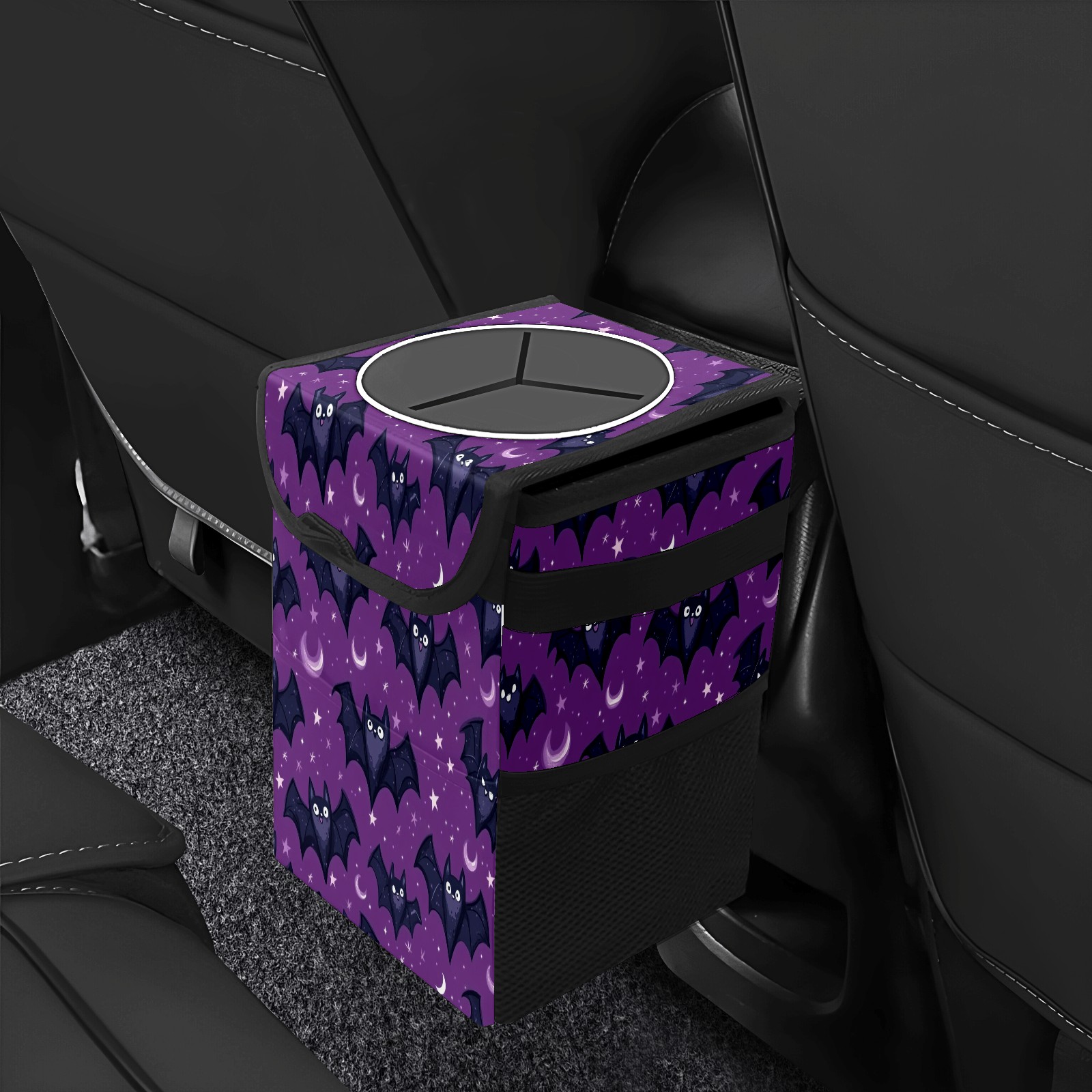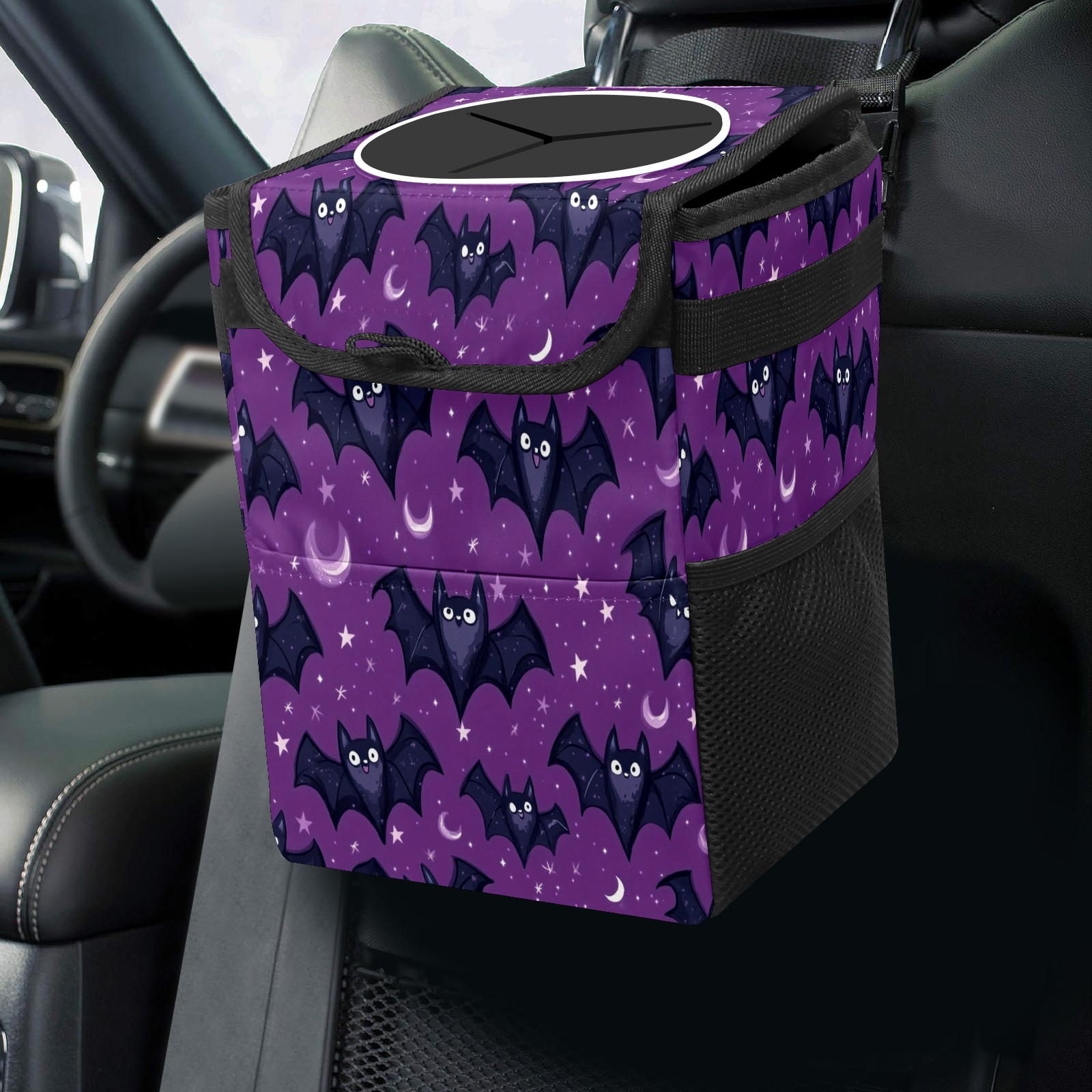 Car Trash Can with Lid, Small Portable Hanging Automotive Garbage Bin for Vehicles, Leakproof Waste Bag Container for SUV Truck Van Interior Auto Travel Road Trips(Bats With Tiny Stars)