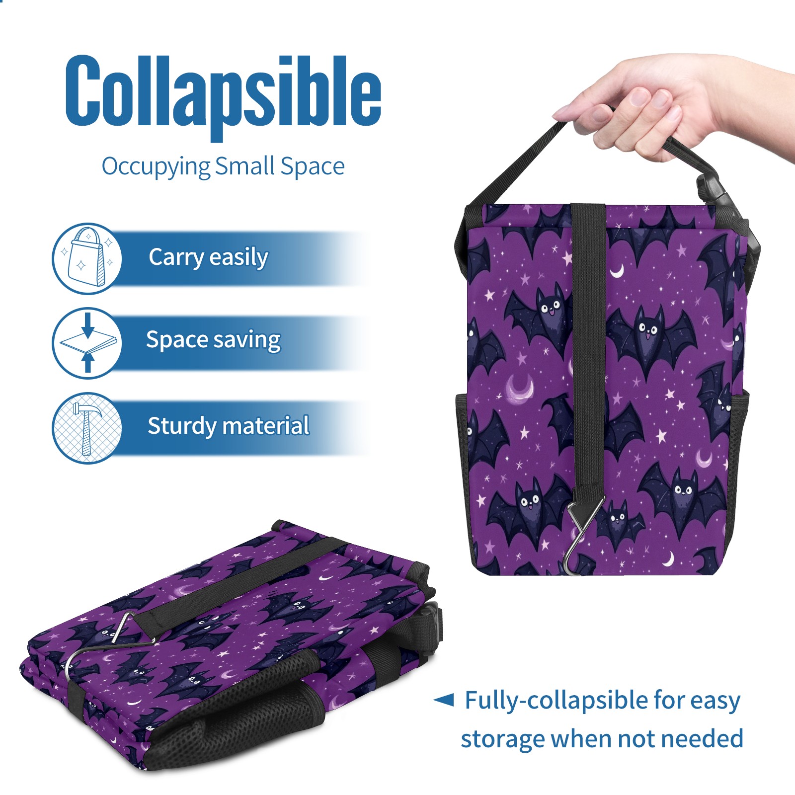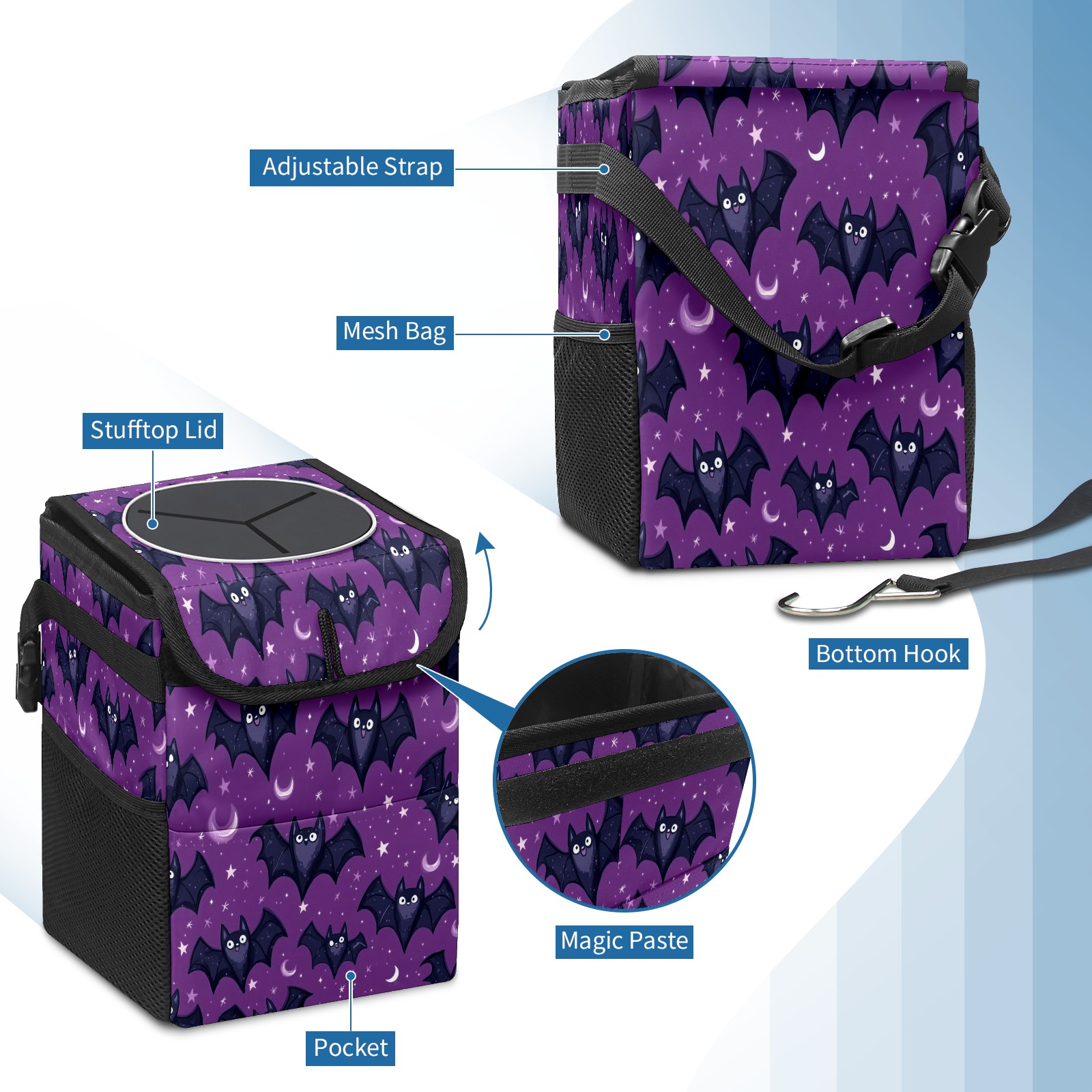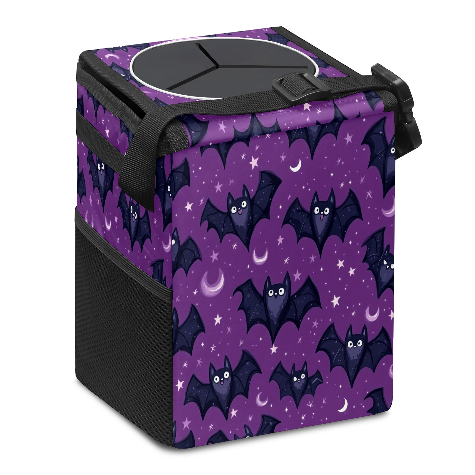 Car Trash Can with Lid, Small Portable Hanging Automotive Garbage Bin for Vehicles, Leakproof Waste Bag Container for SUV Truck Van Interior Auto Travel Road Trips(Bats With Tiny Stars)