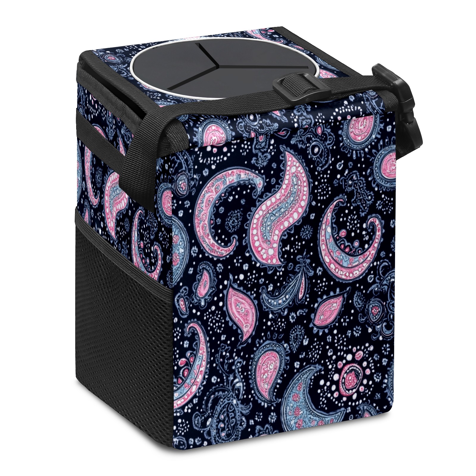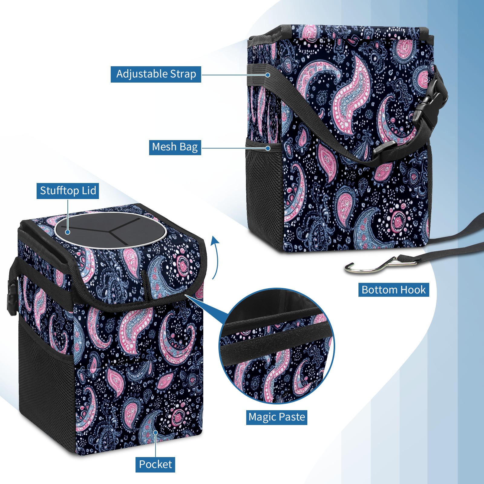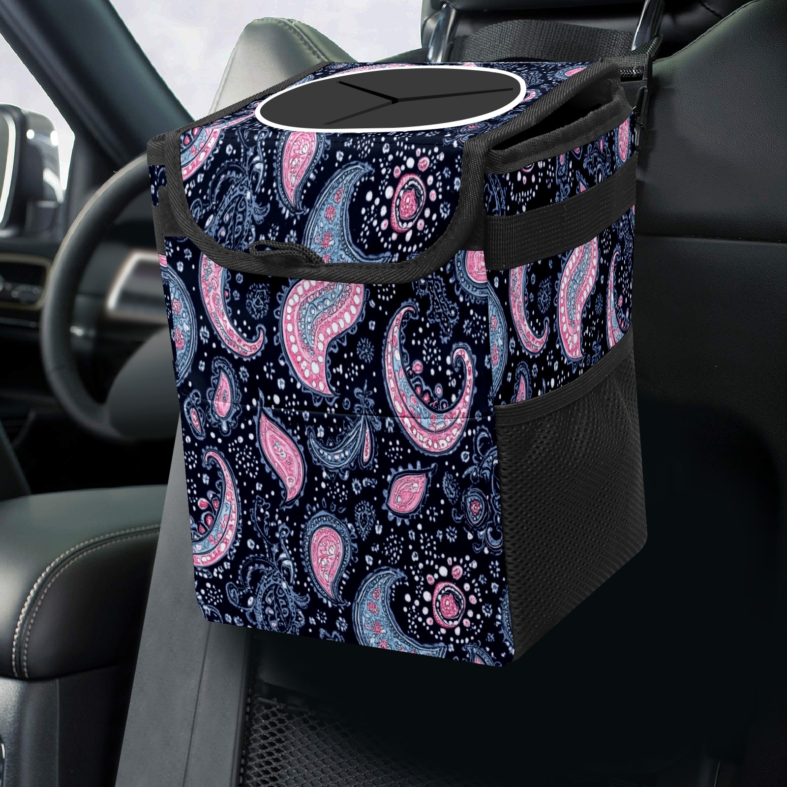 Car Trash Can with Lid, Small Portable Hanging Automotive Garbage Bin for Vehicles, Leakproof Waste Bag Container for SUV Truck Van Interior Auto Travel Road Trips(Dark Blue And Pink Paisley)