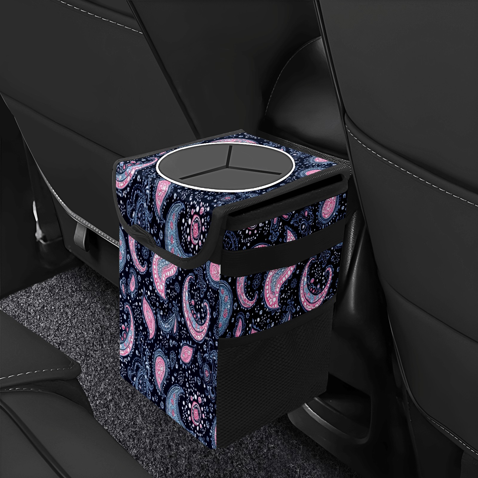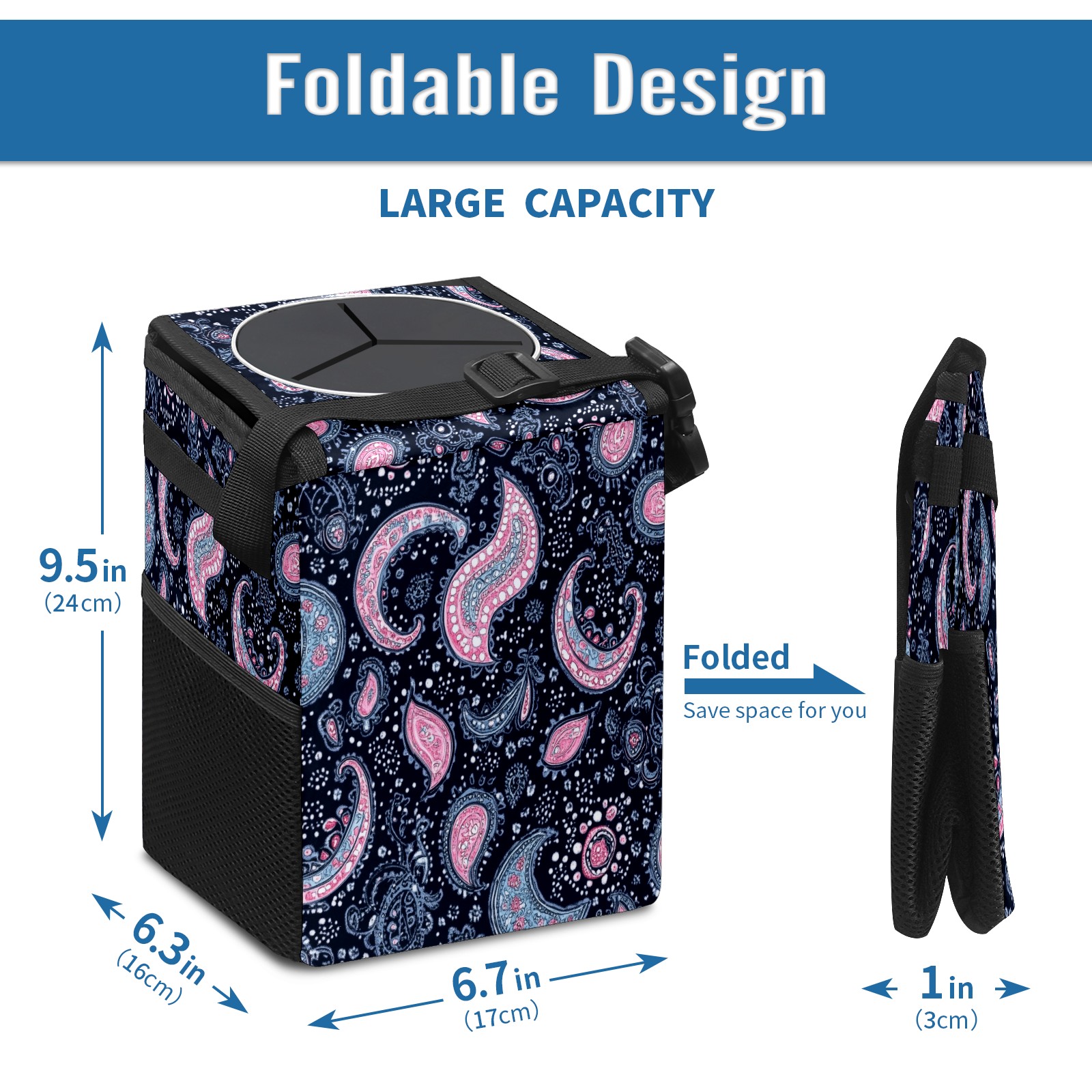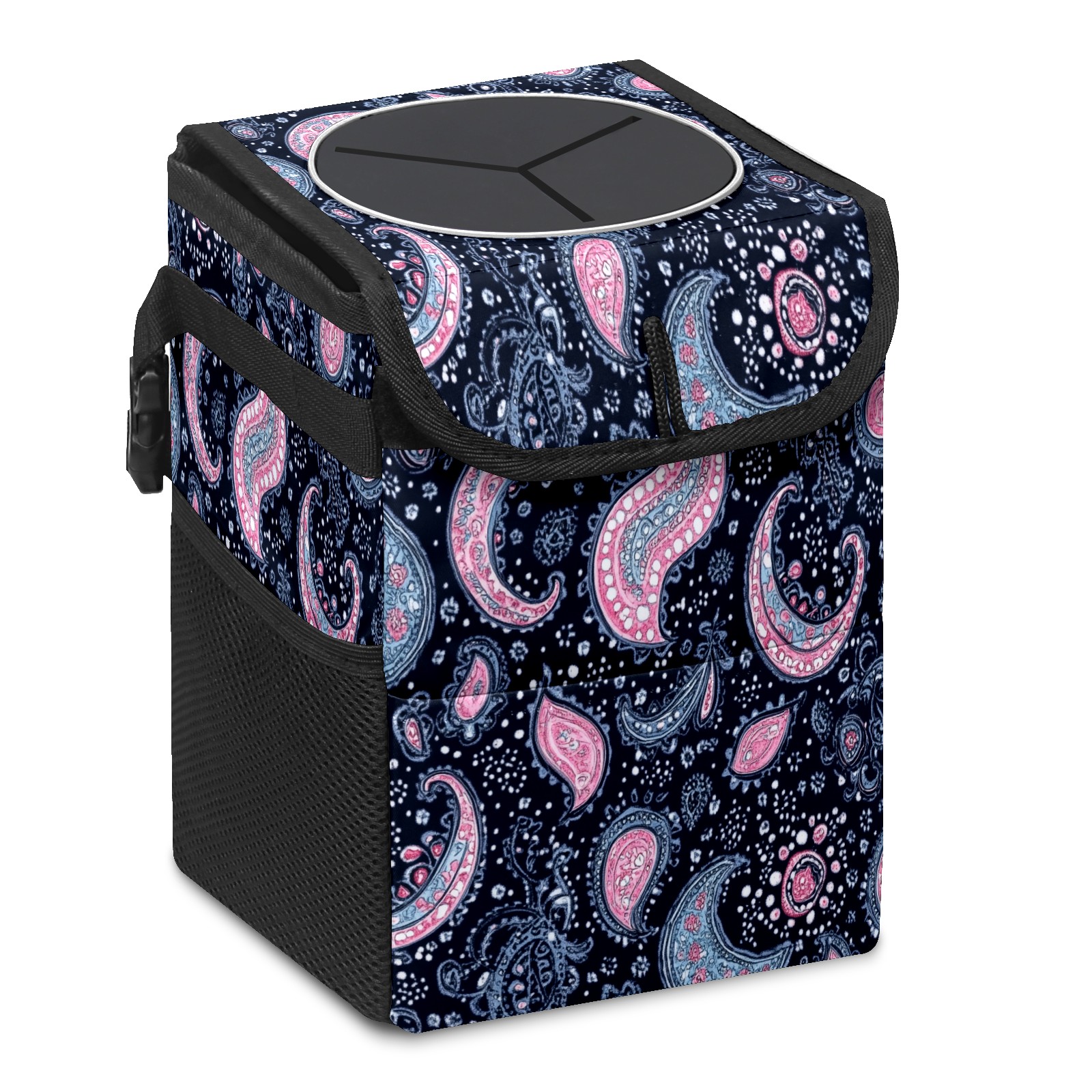 Car Trash Can with Lid, Small Portable Hanging Automotive Garbage Bin for Vehicles, Leakproof Waste Bag Container for SUV Truck Van Interior Auto Travel Road Trips(Dark Blue And Pink Paisley)