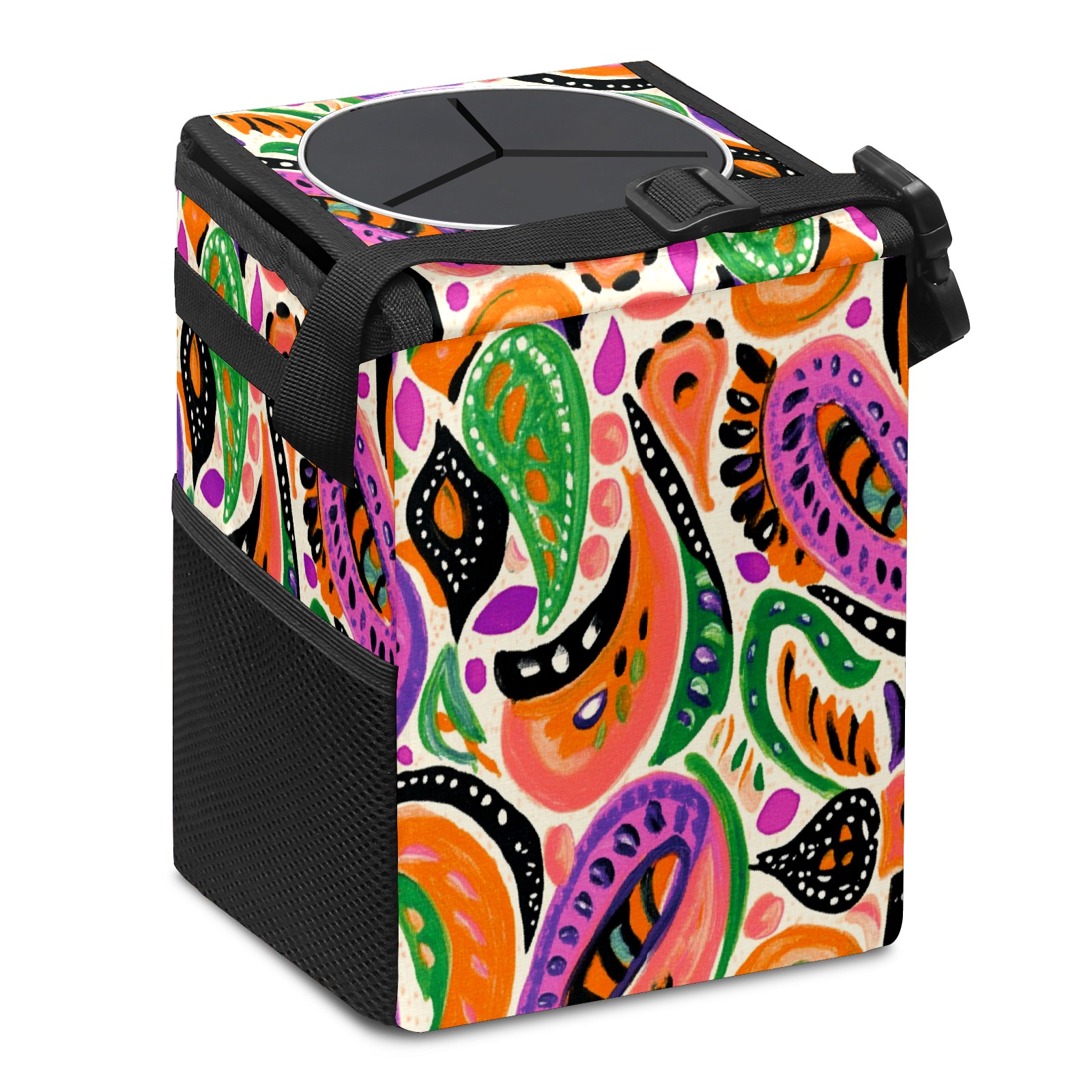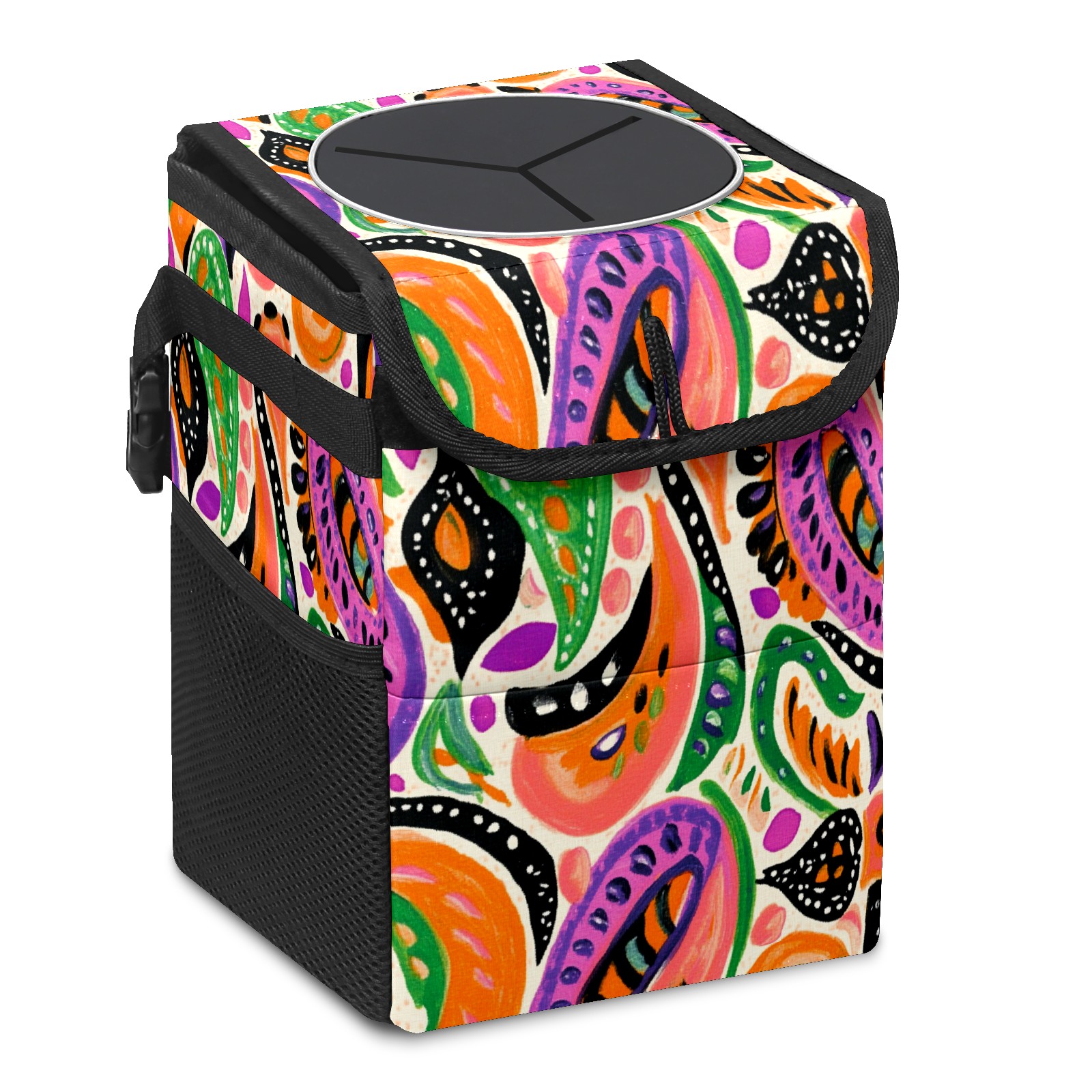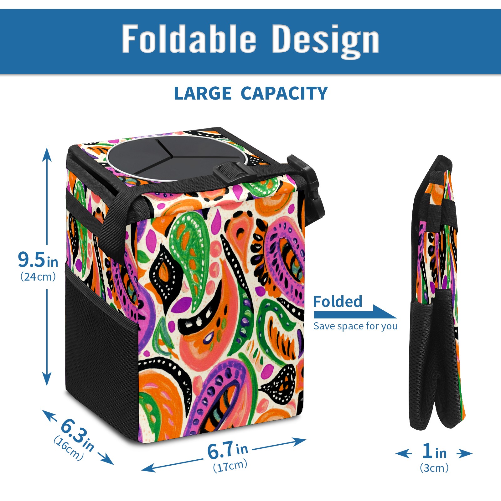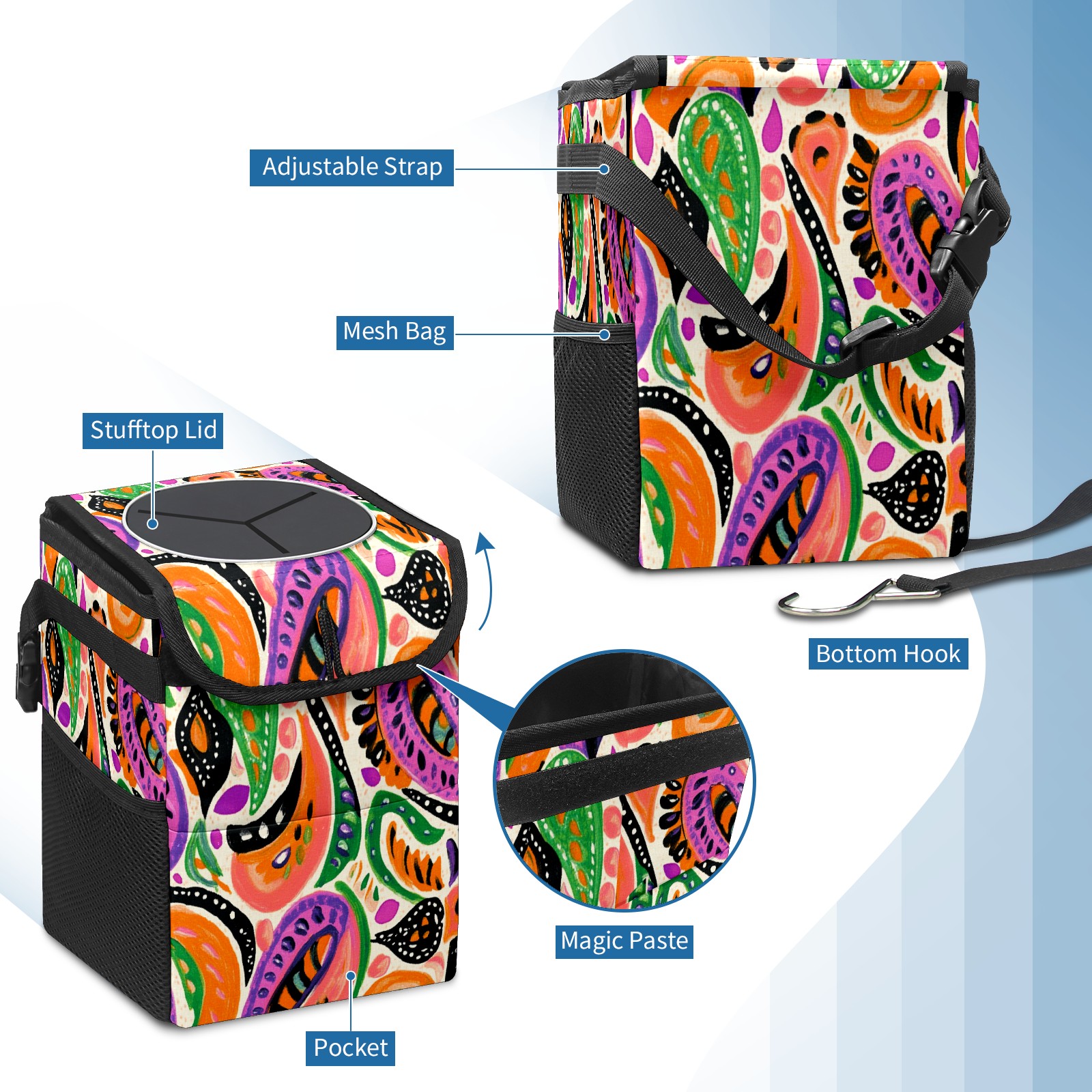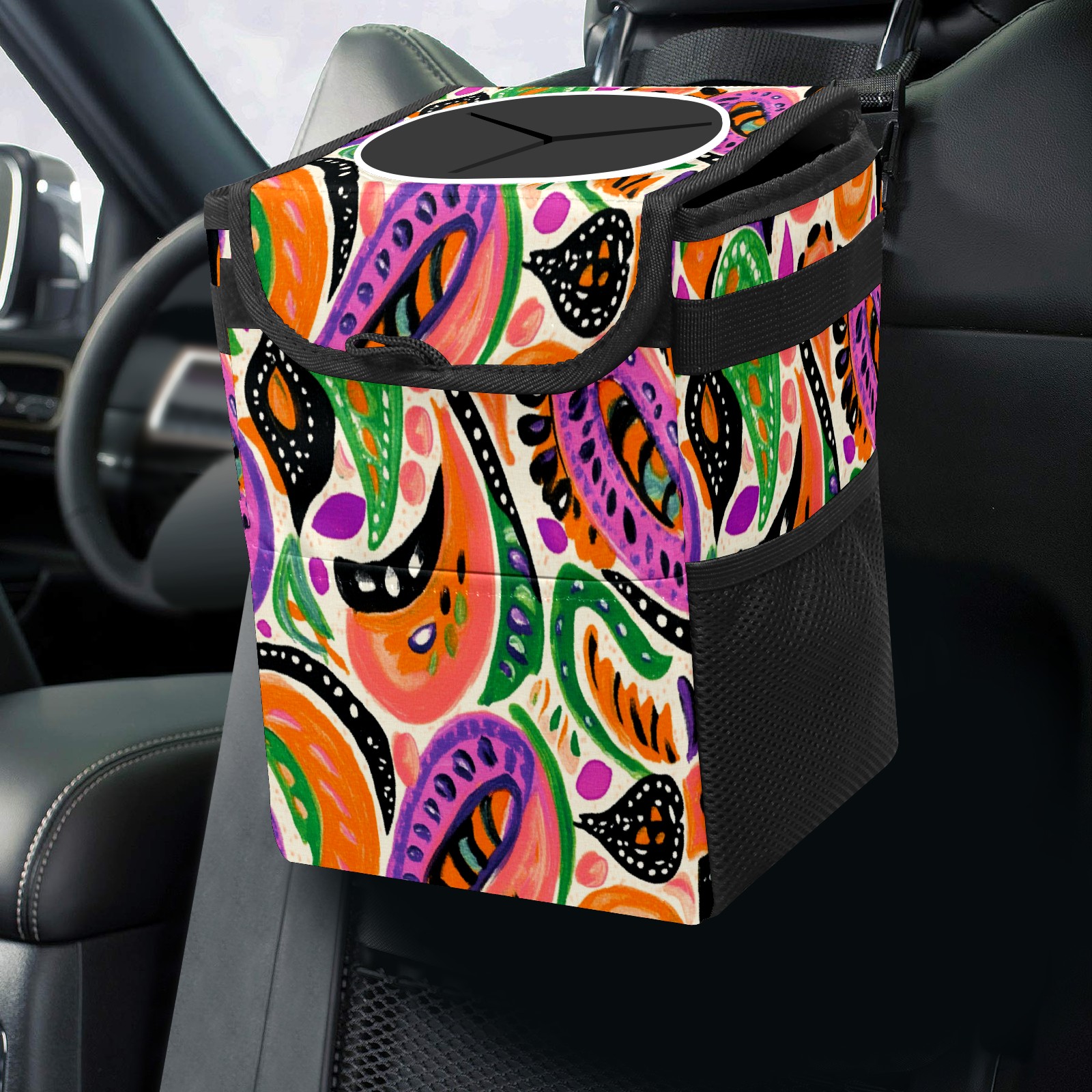 Car Trash Can with Lid, Small Portable Hanging Automotive Garbage Bin for Vehicles, Leakproof Waste Bag Container for SUV Truck Van Interior Auto Travel Road Trips(Paisley)