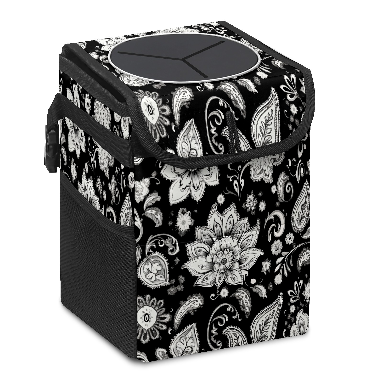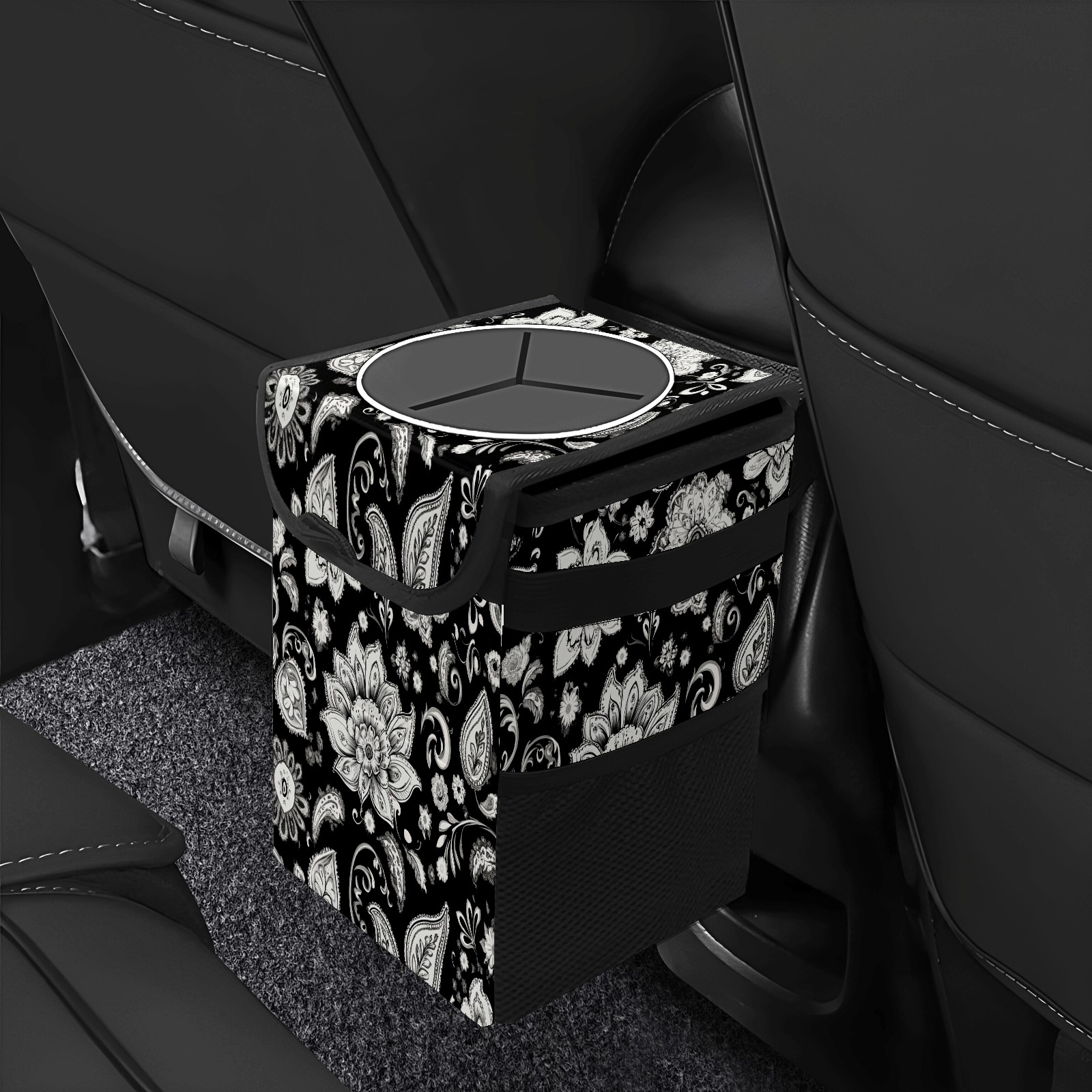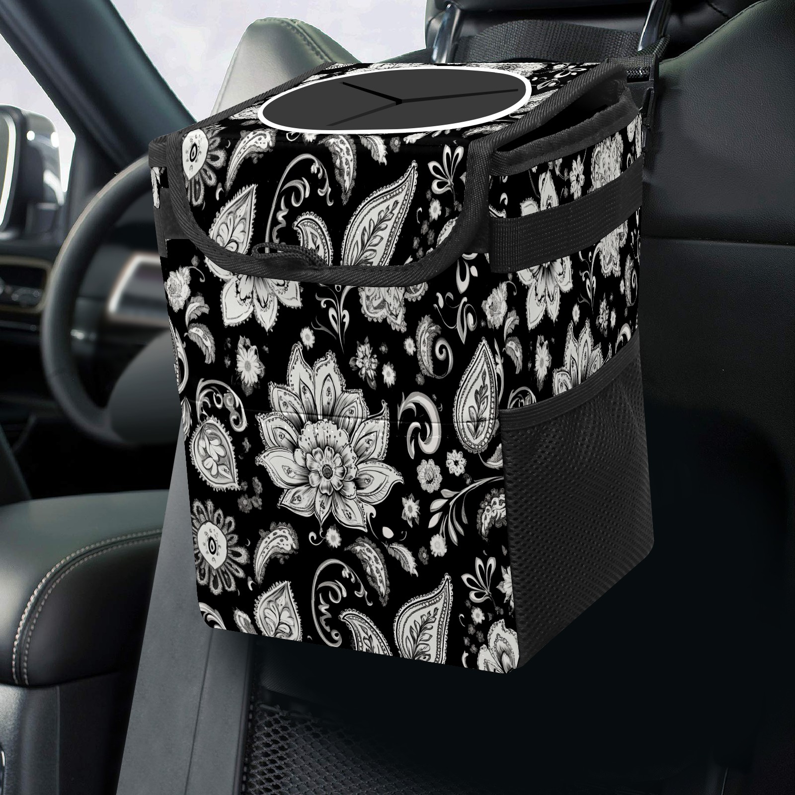 Car Trash Can with Lid, Small Portable Hanging Automotive Garbage Bin for Vehicles, Leakproof Waste Bag Container for SUV Truck Van Interior Auto Travel Road Trips(Black And White Paisley Pattern)