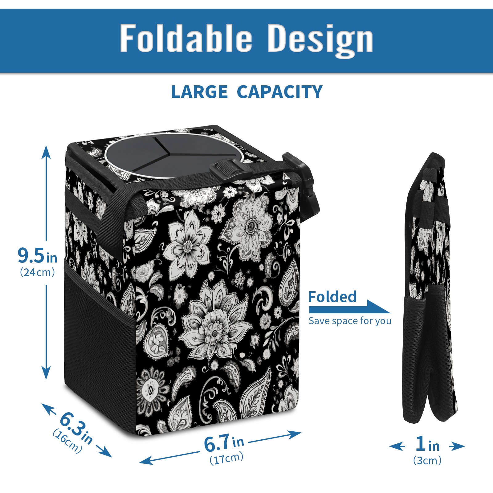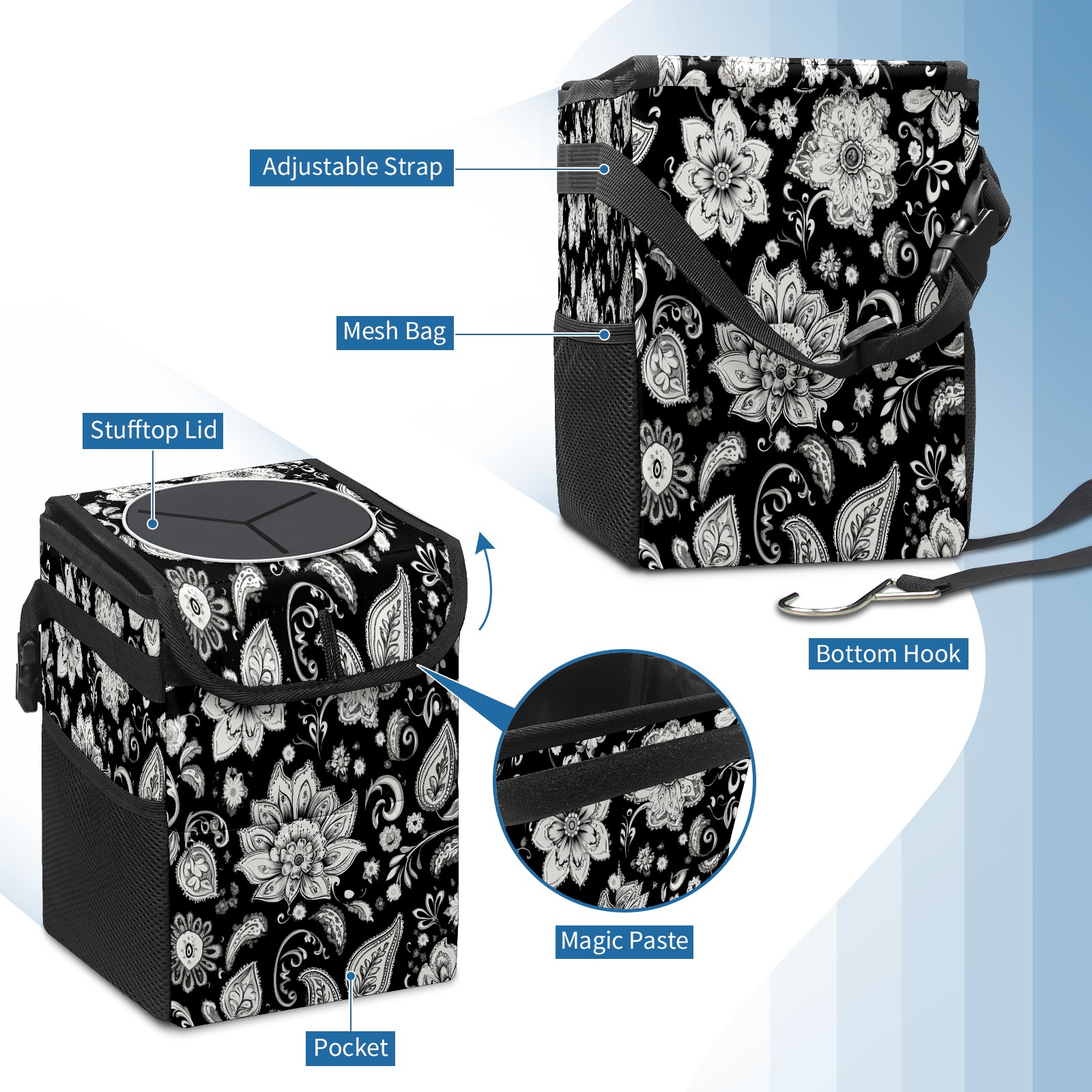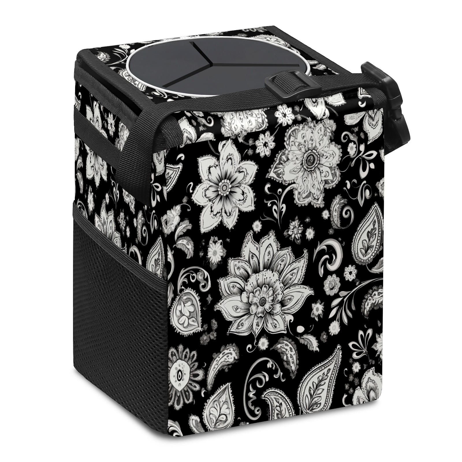 Car Trash Can with Lid, Small Portable Hanging Automotive Garbage Bin for Vehicles, Leakproof Waste Bag Container for SUV Truck Van Interior Auto Travel Road Trips(Black And White Paisley Pattern)