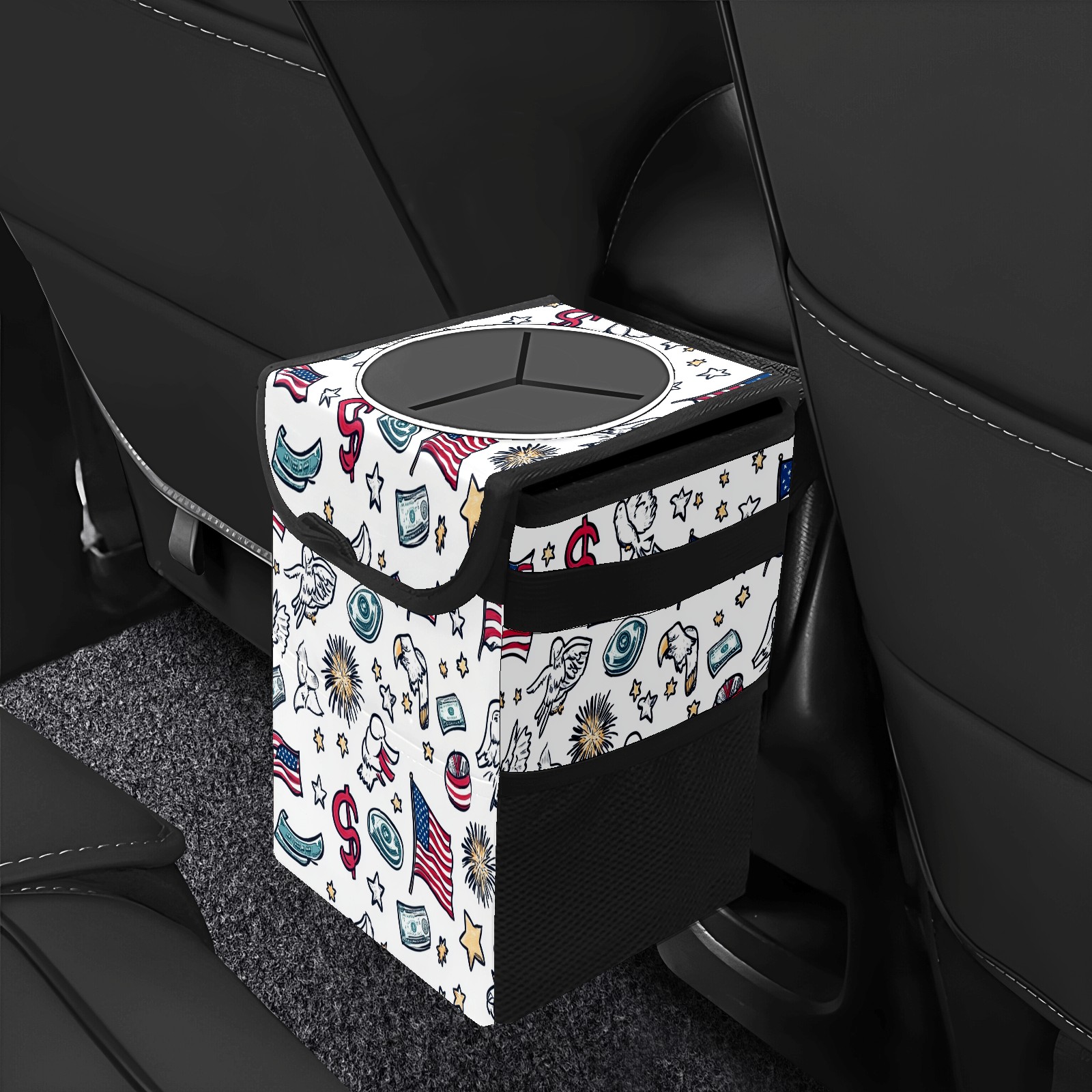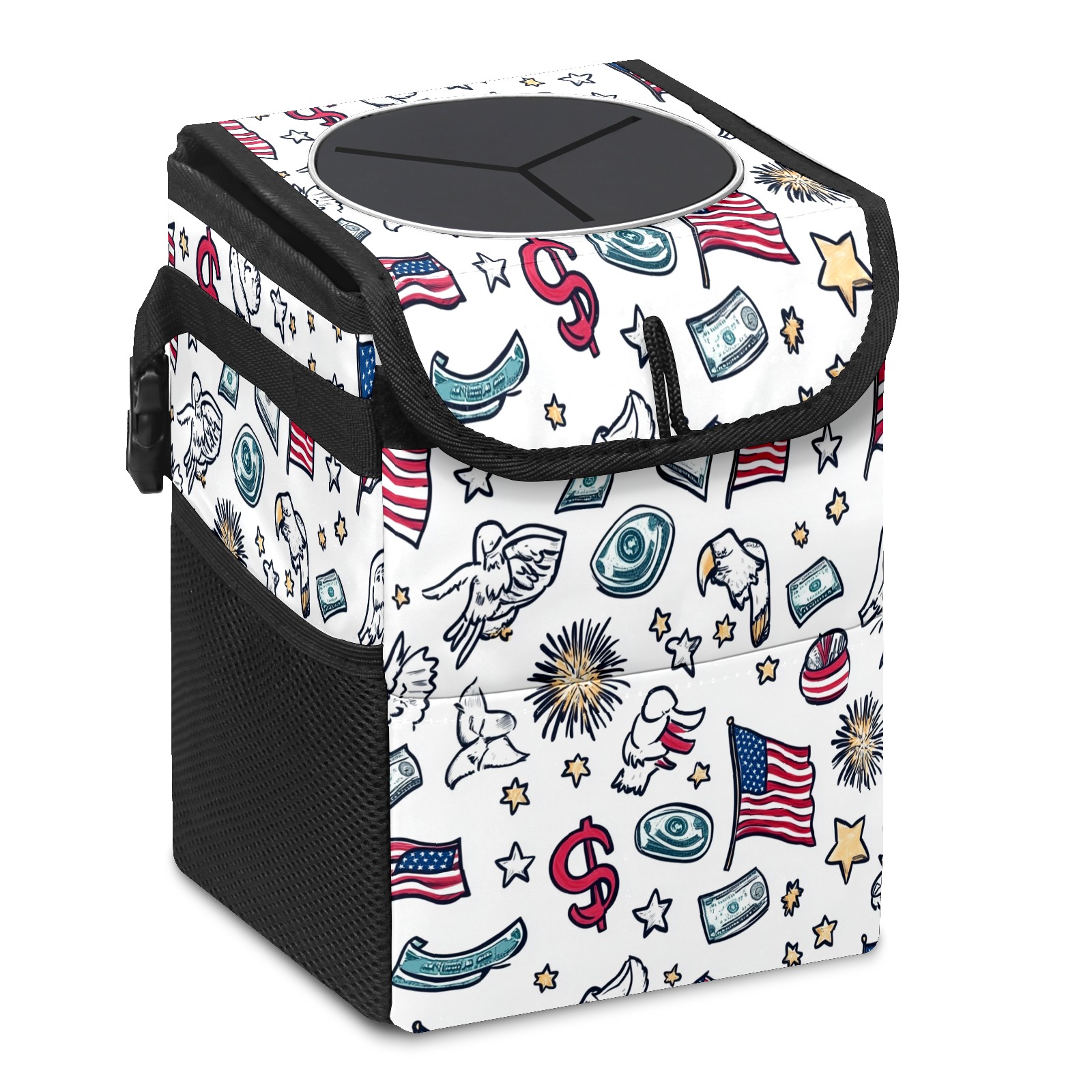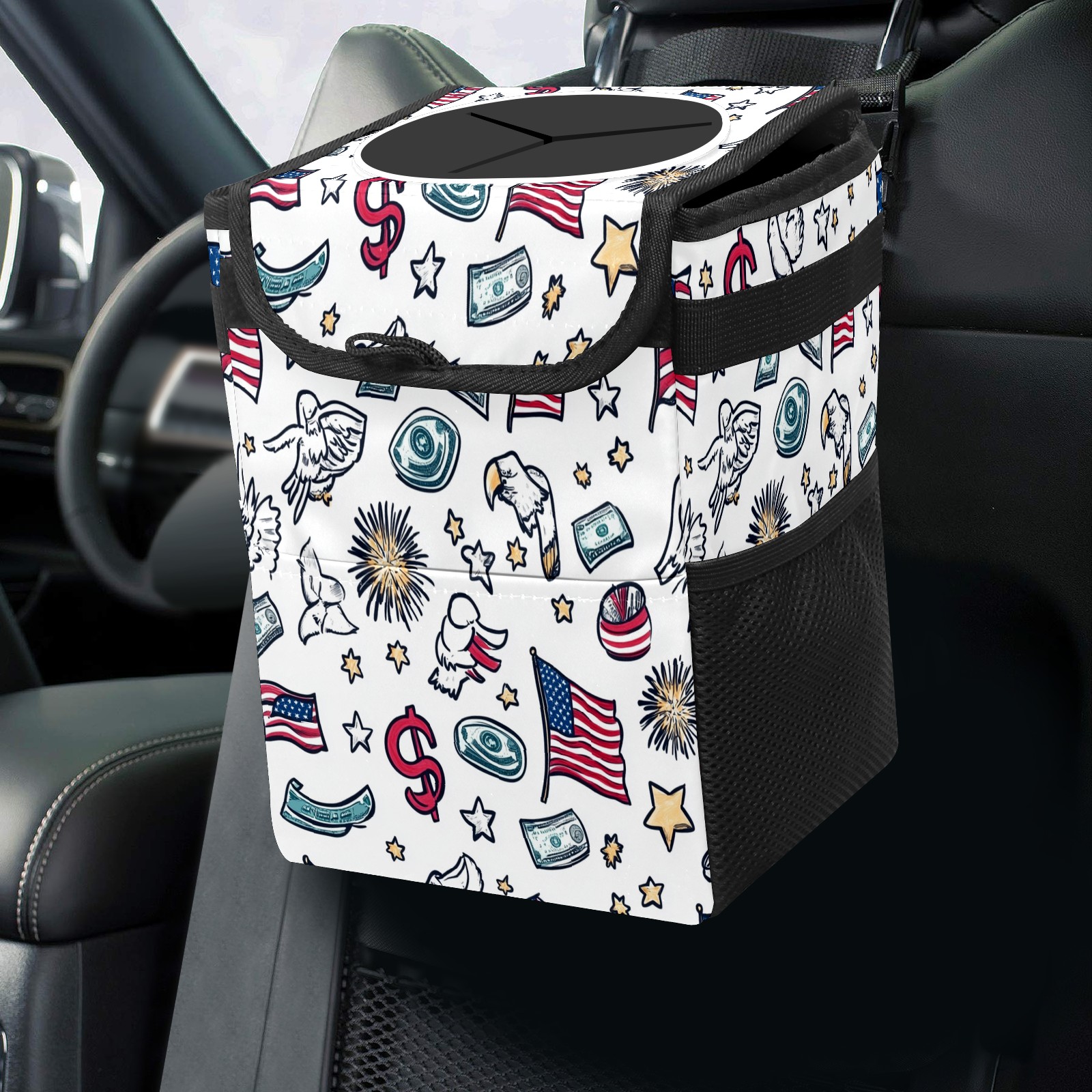 Car Trash Can with Lid, Small Portable Hanging Automotive Garbage Bin for Vehicles, Leakproof Waste Bag Container for SUV Truck Van Interior Auto Travel Road Trips(Patriotic Symbols)