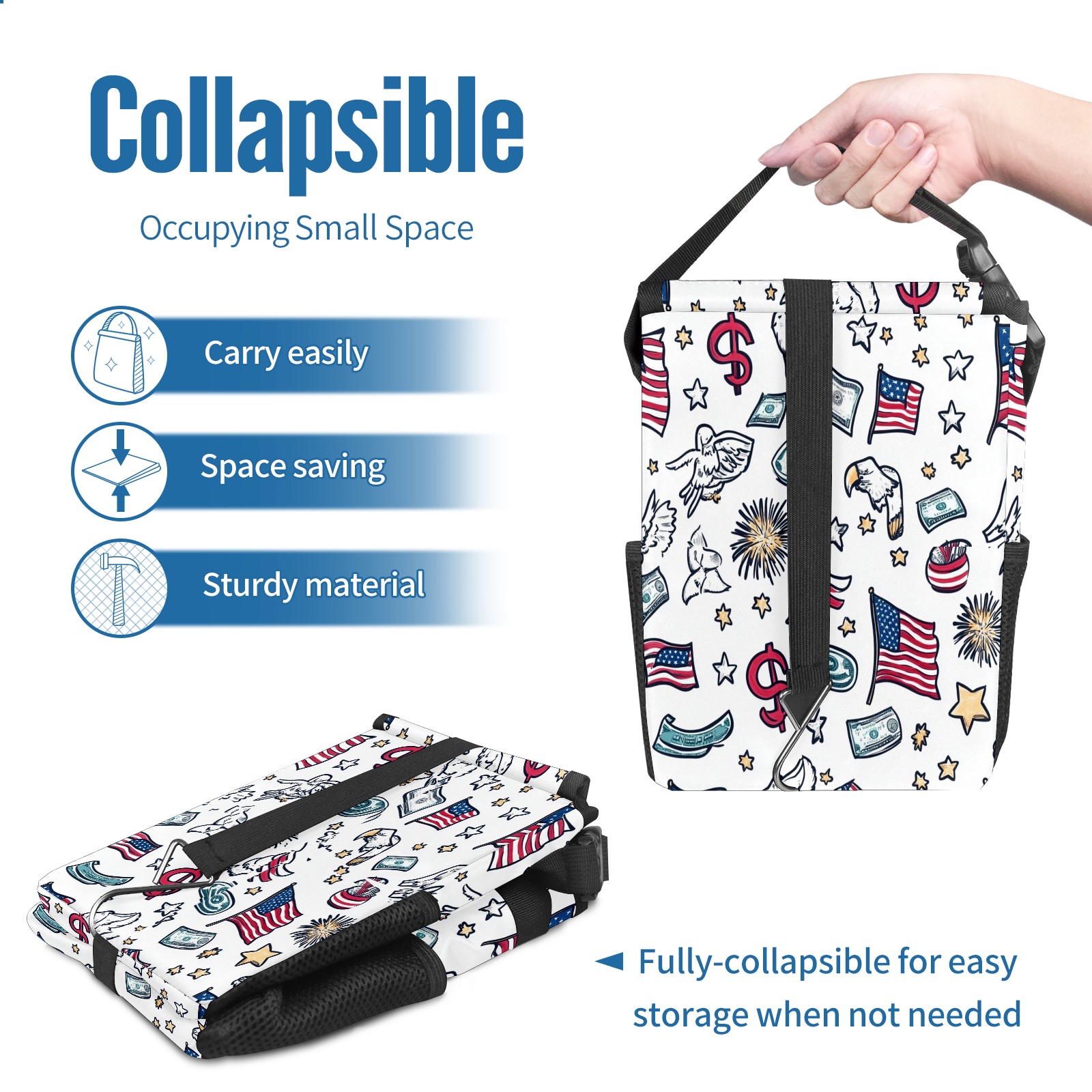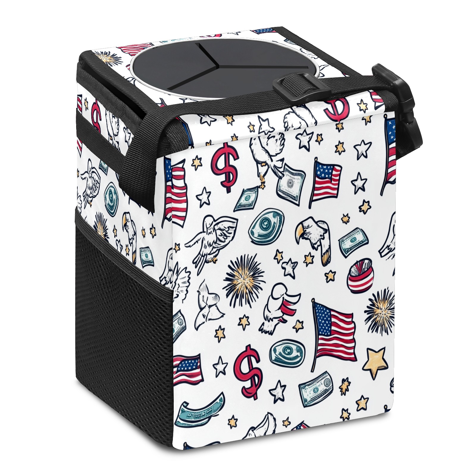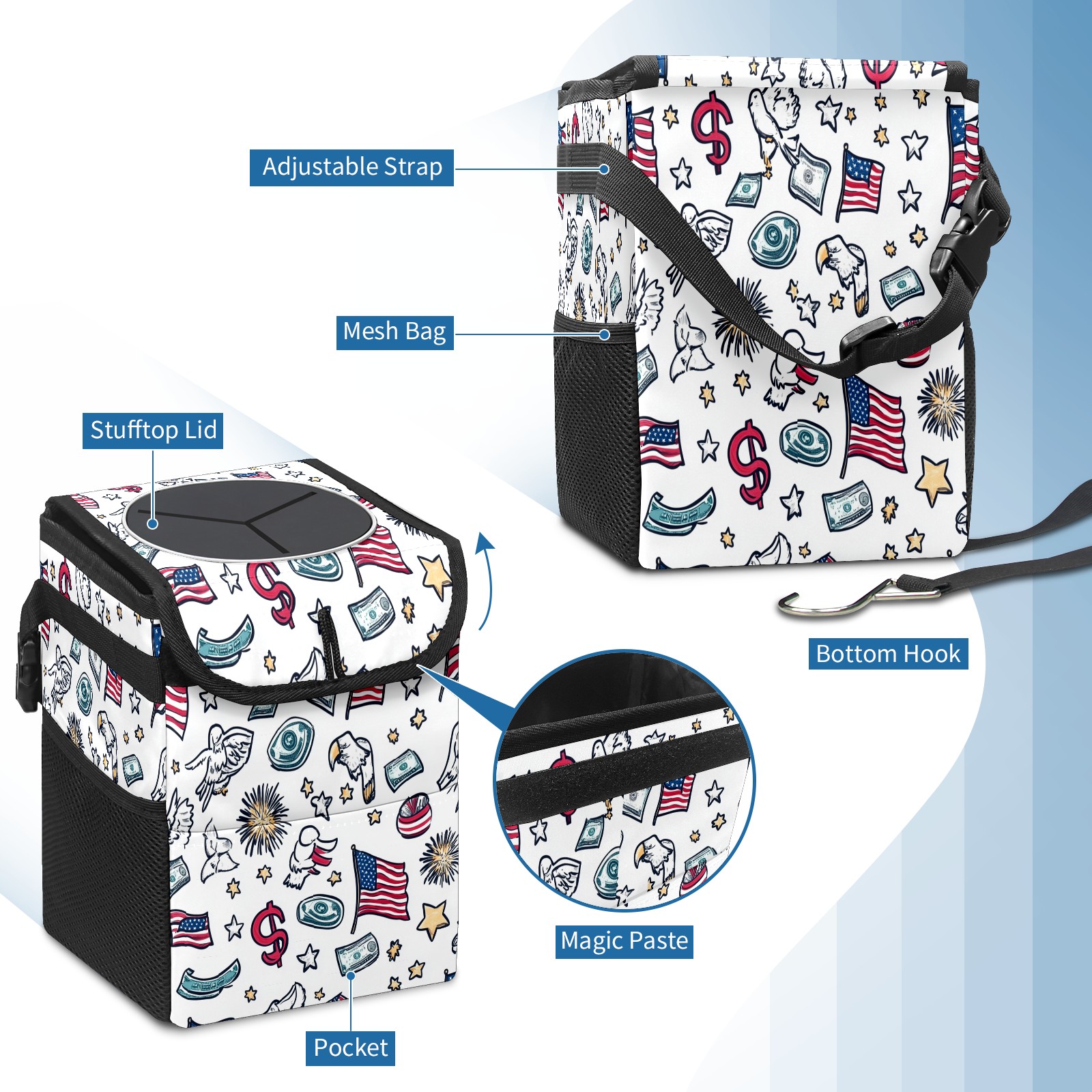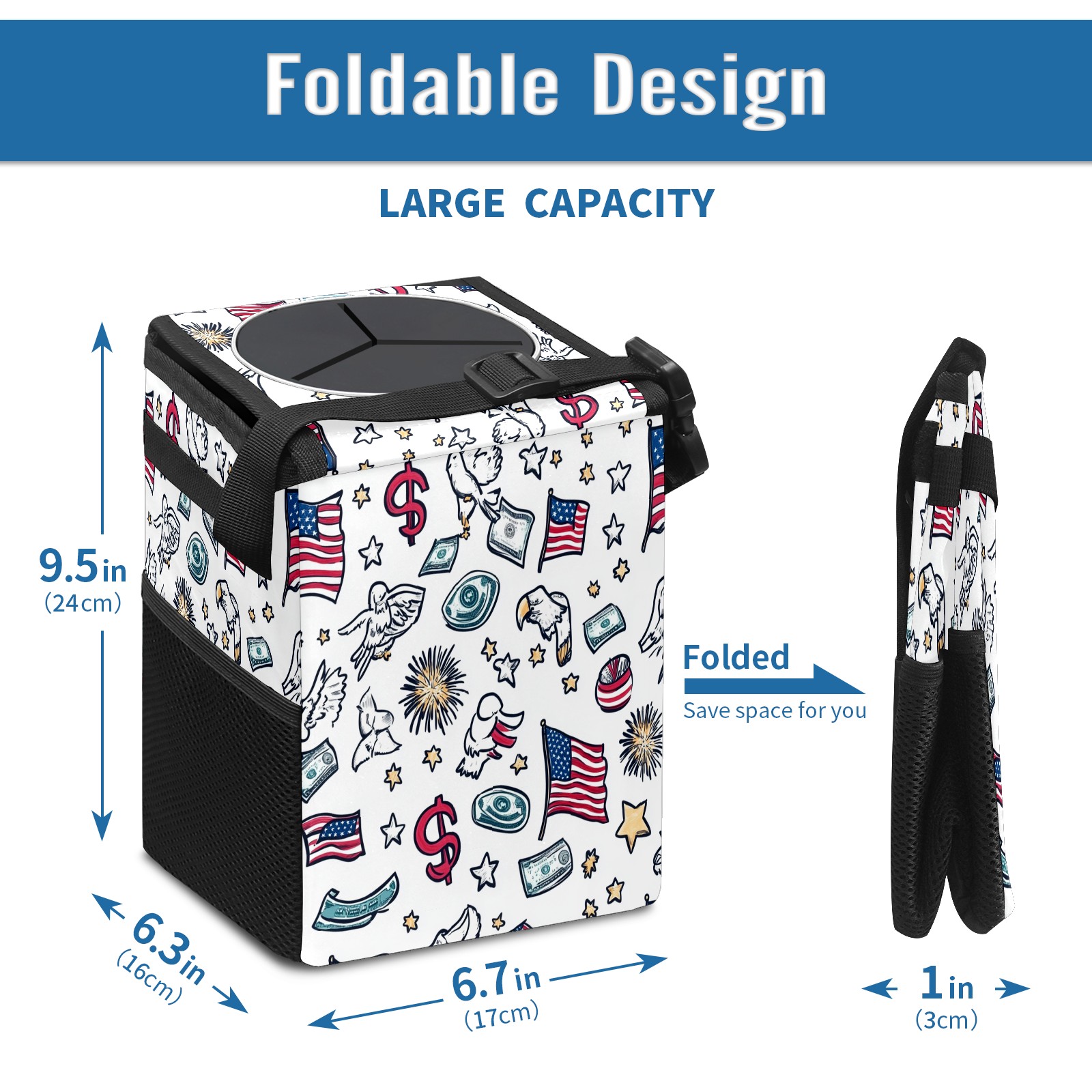Car Trash Can with Lid, Small Portable Hanging Automotive Garbage Bin for Vehicles, Leakproof Waste Bag Container for SUV Truck Van Interior Auto Travel Road Trips(Patriotic Symbols)