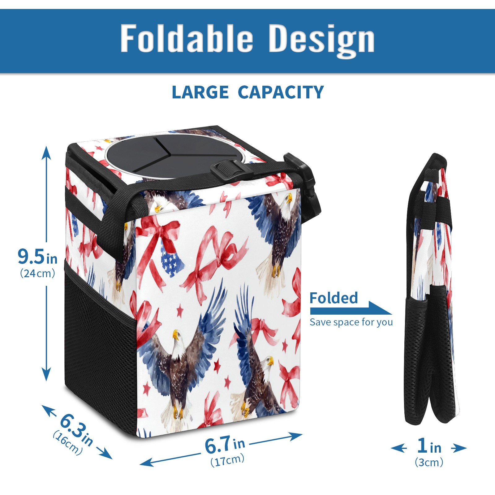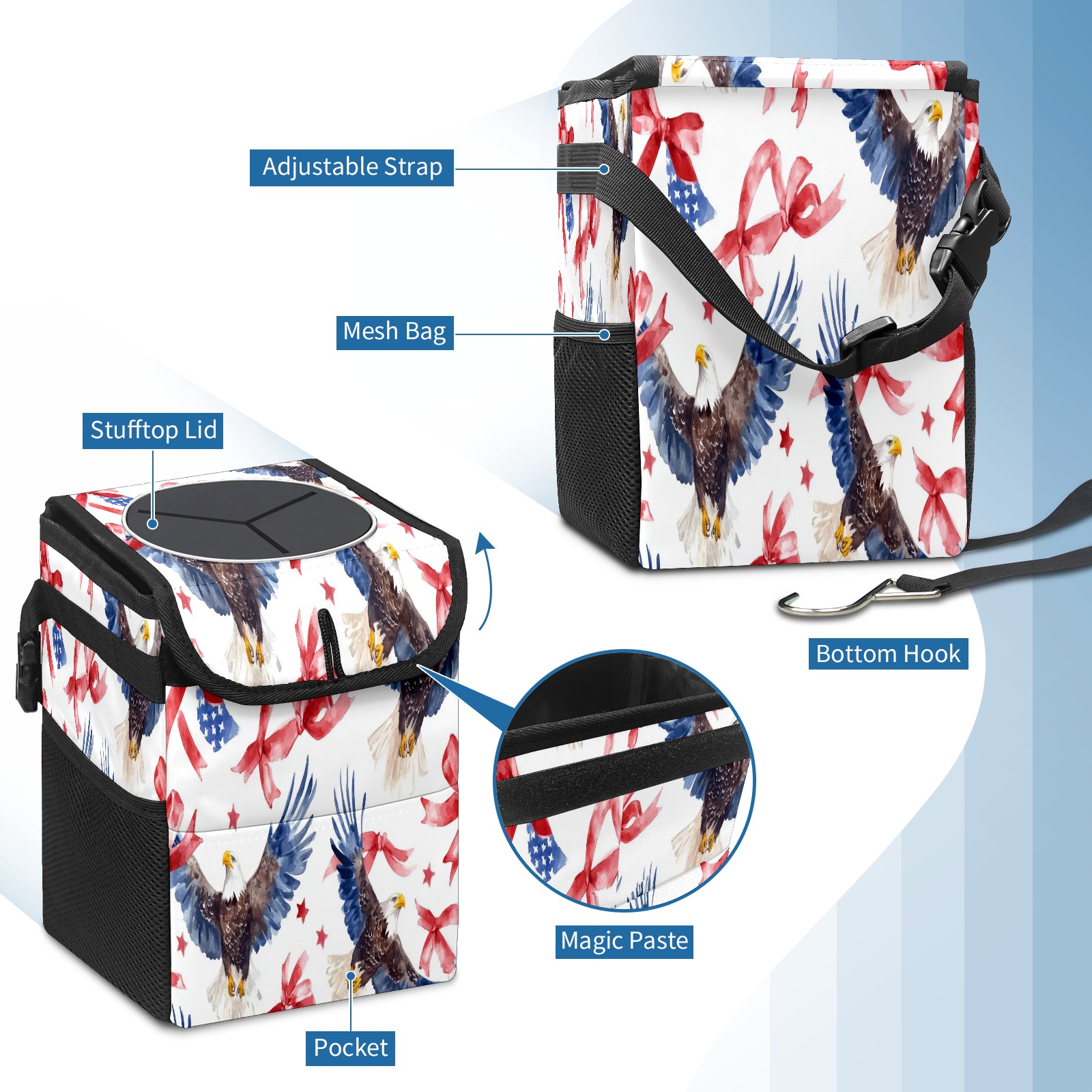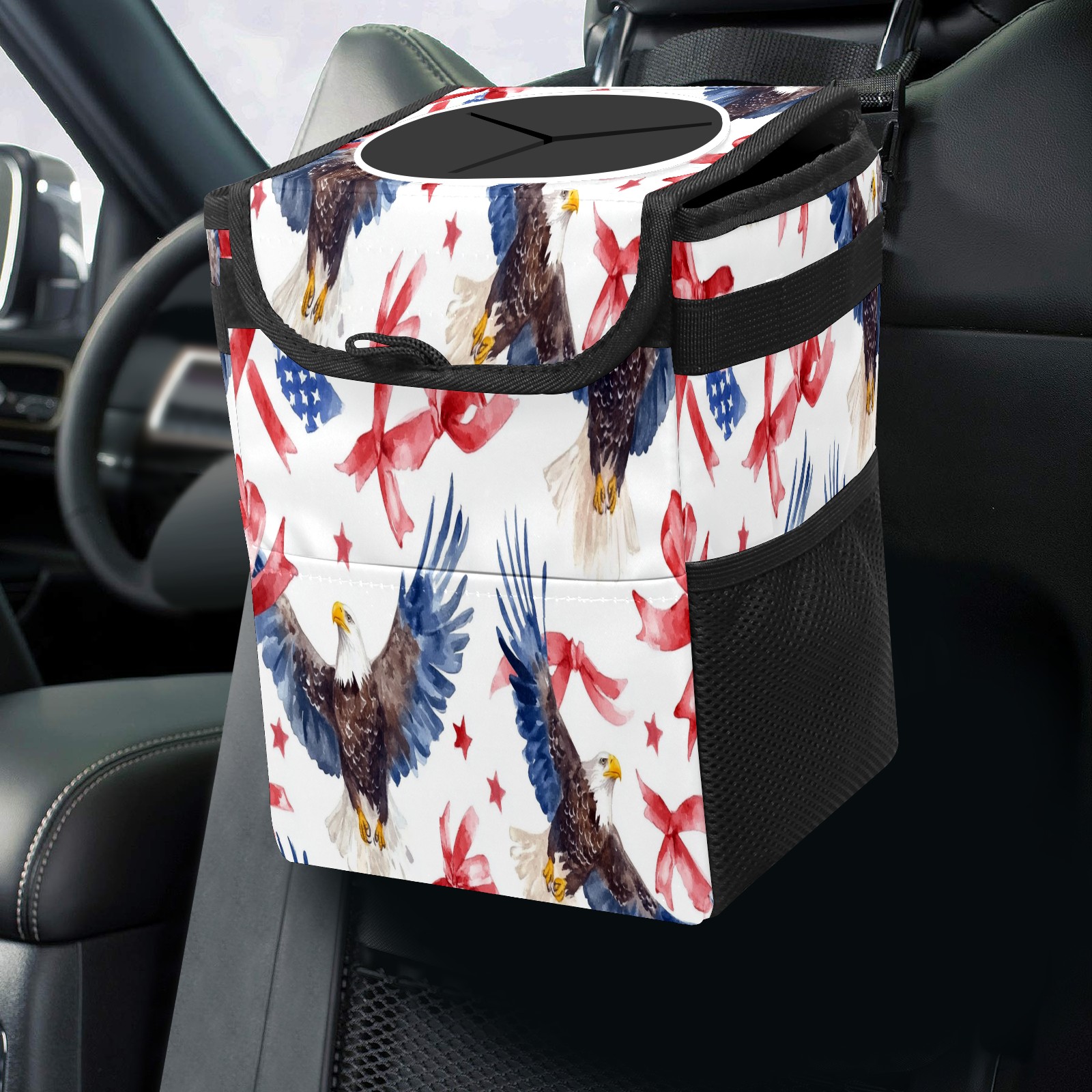Car Trash Can with Lid, Small Portable Hanging Automotive Garbage Bin for Vehicles, Leakproof Waste Bag Container for SUV Truck Van Interior Auto Travel Road Trips(American Flag Bows And Eagles)
