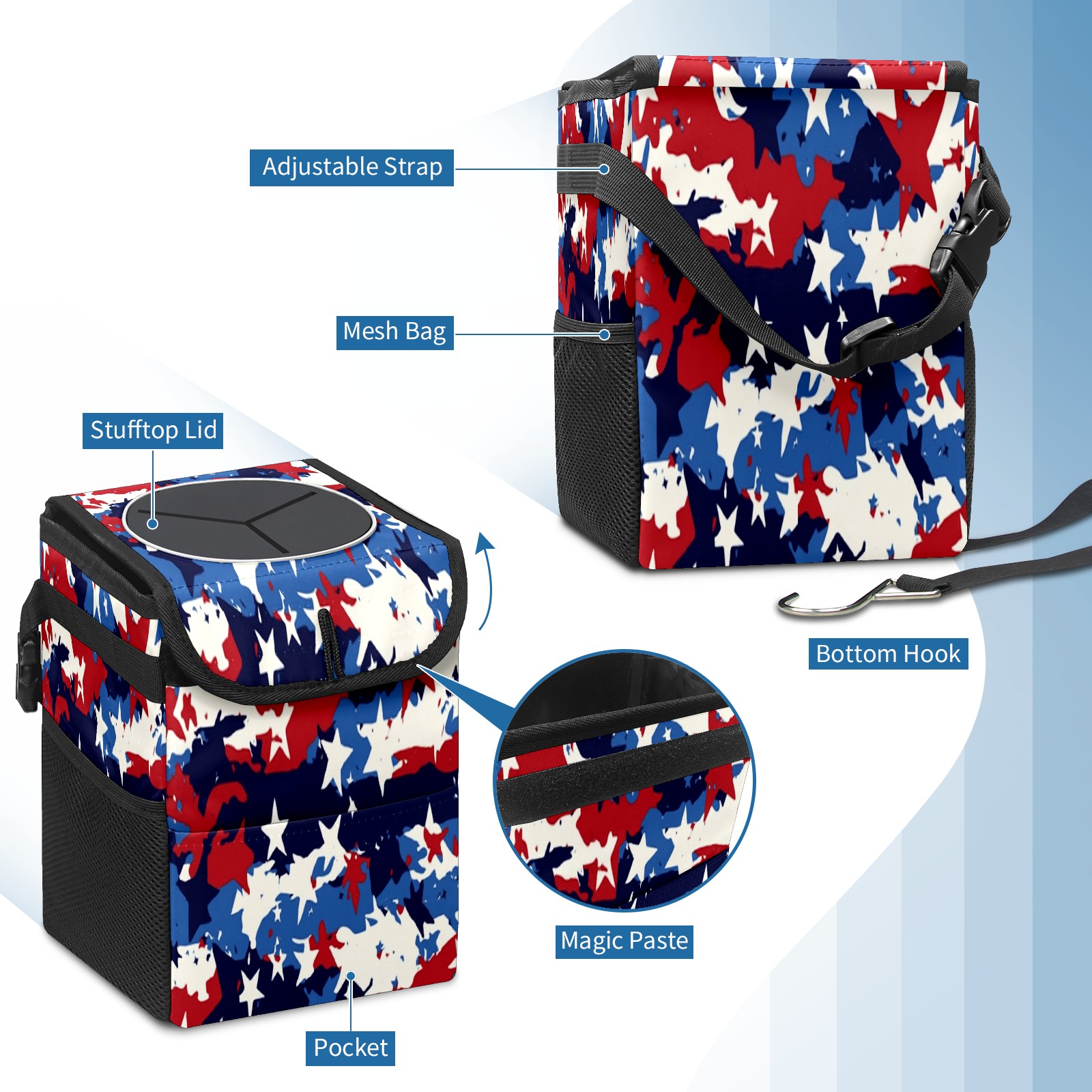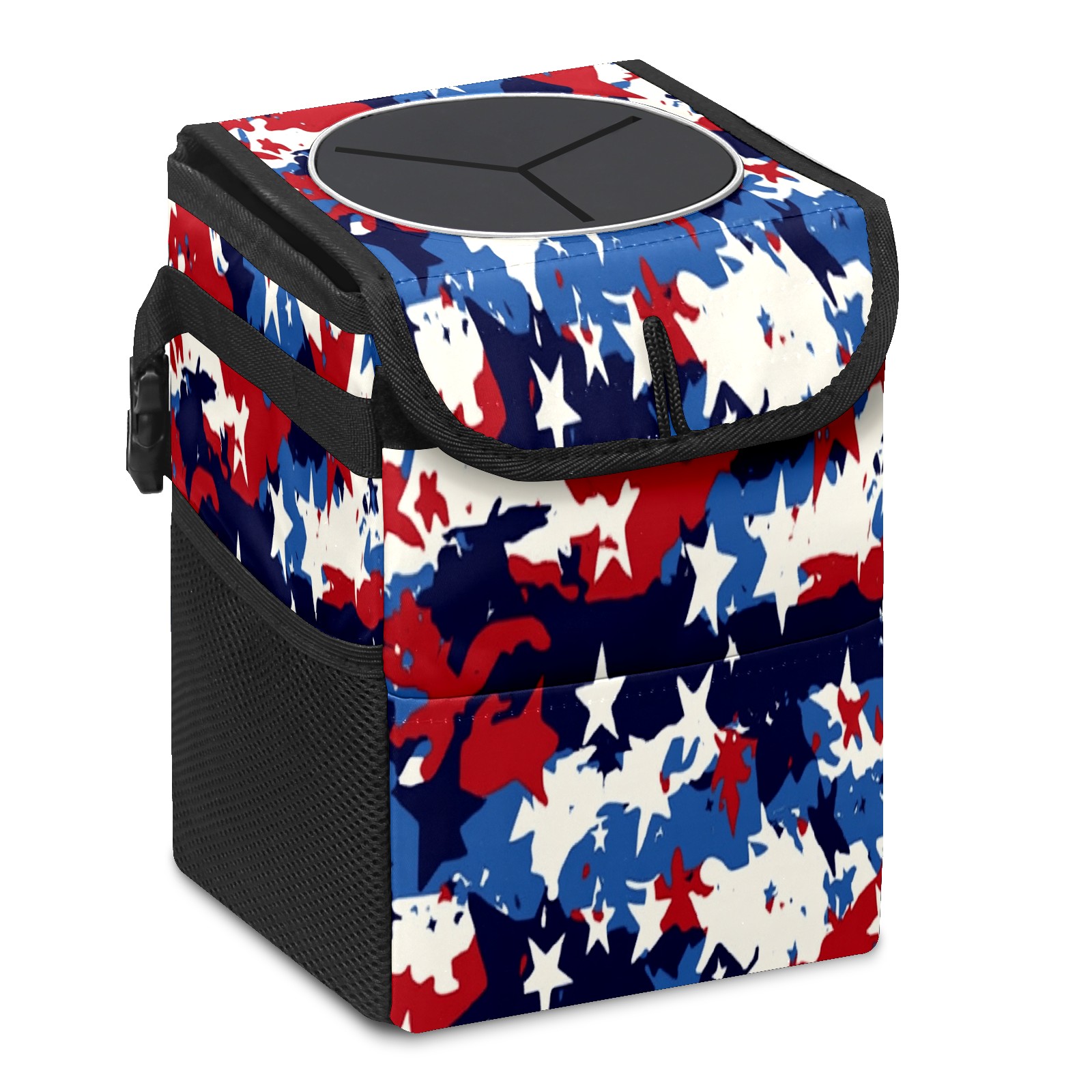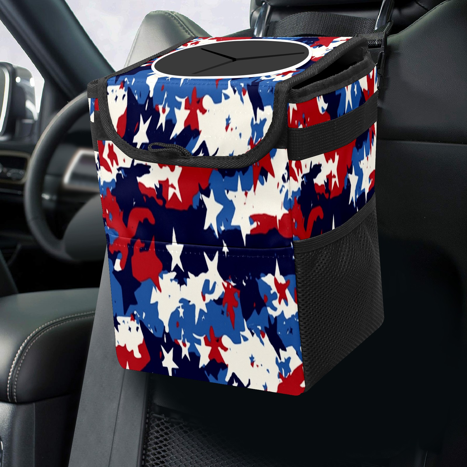 Car Trash Can with Lid, Small Portable Hanging Automotive Garbage Bin for Vehicles, Leakproof Waste Bag Container for SUV Truck Van Interior Auto Travel Road Trips(Red White And Blue Camouflage)