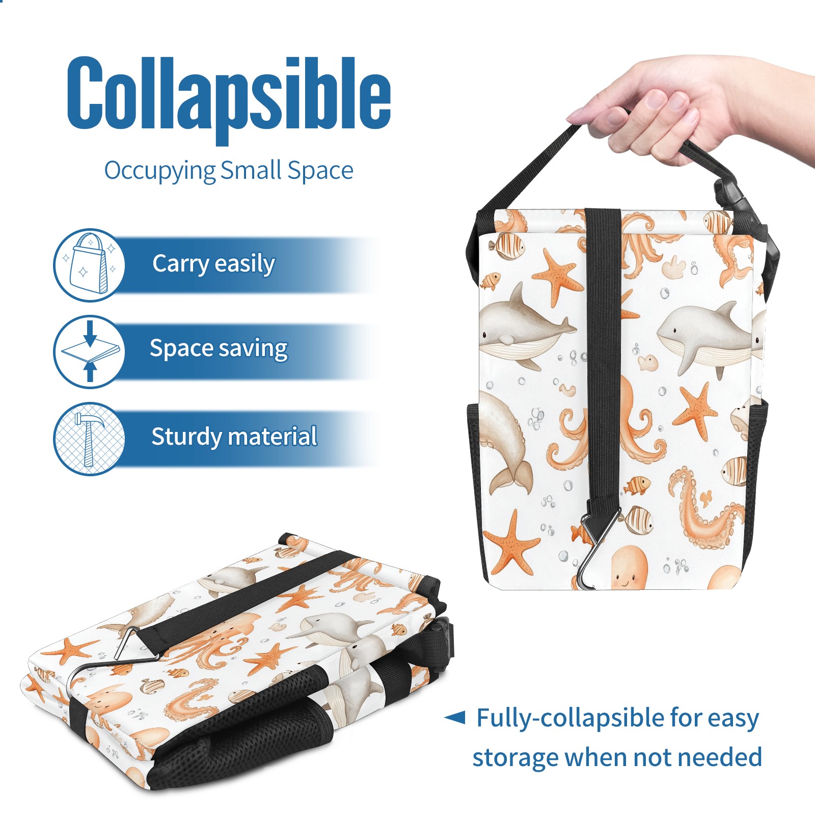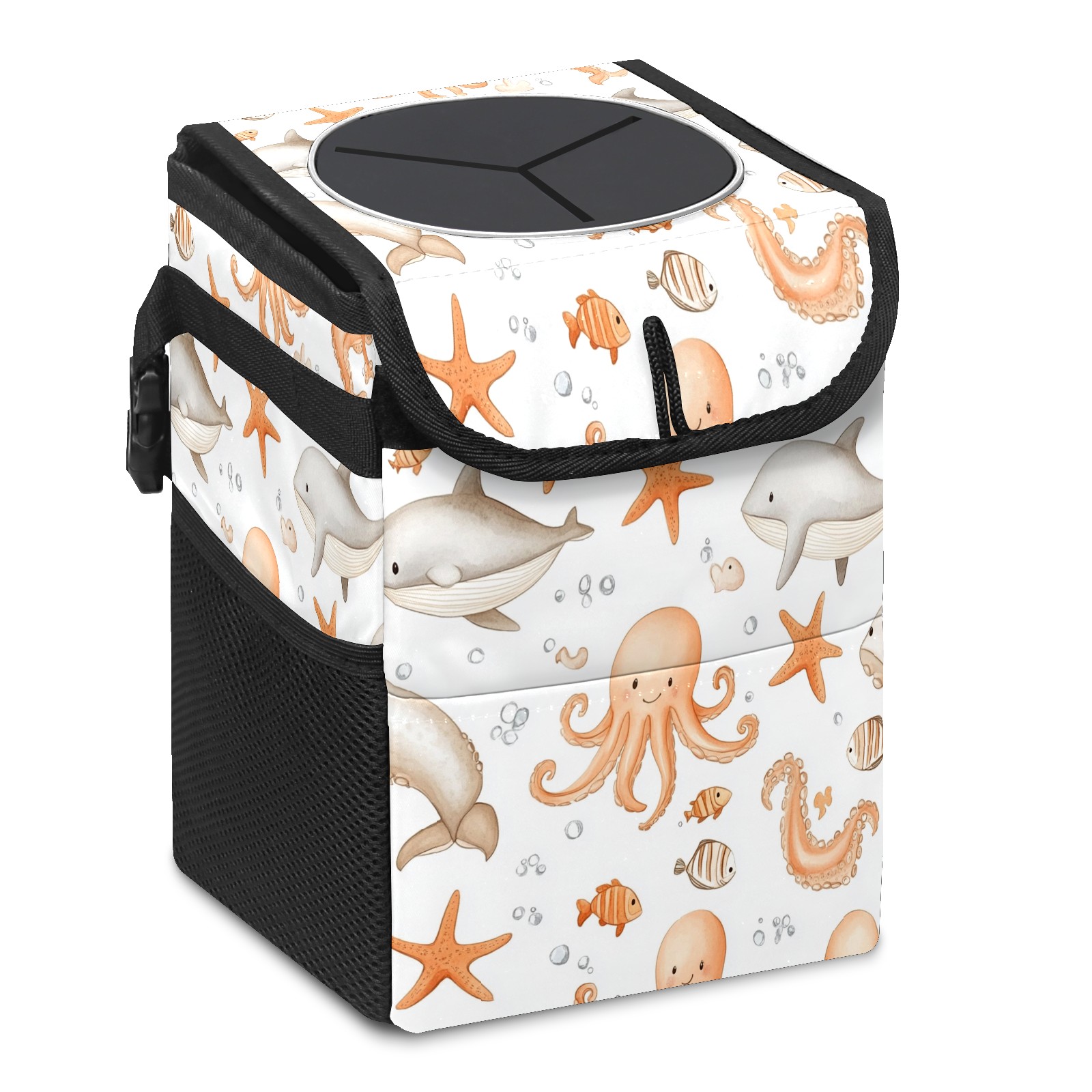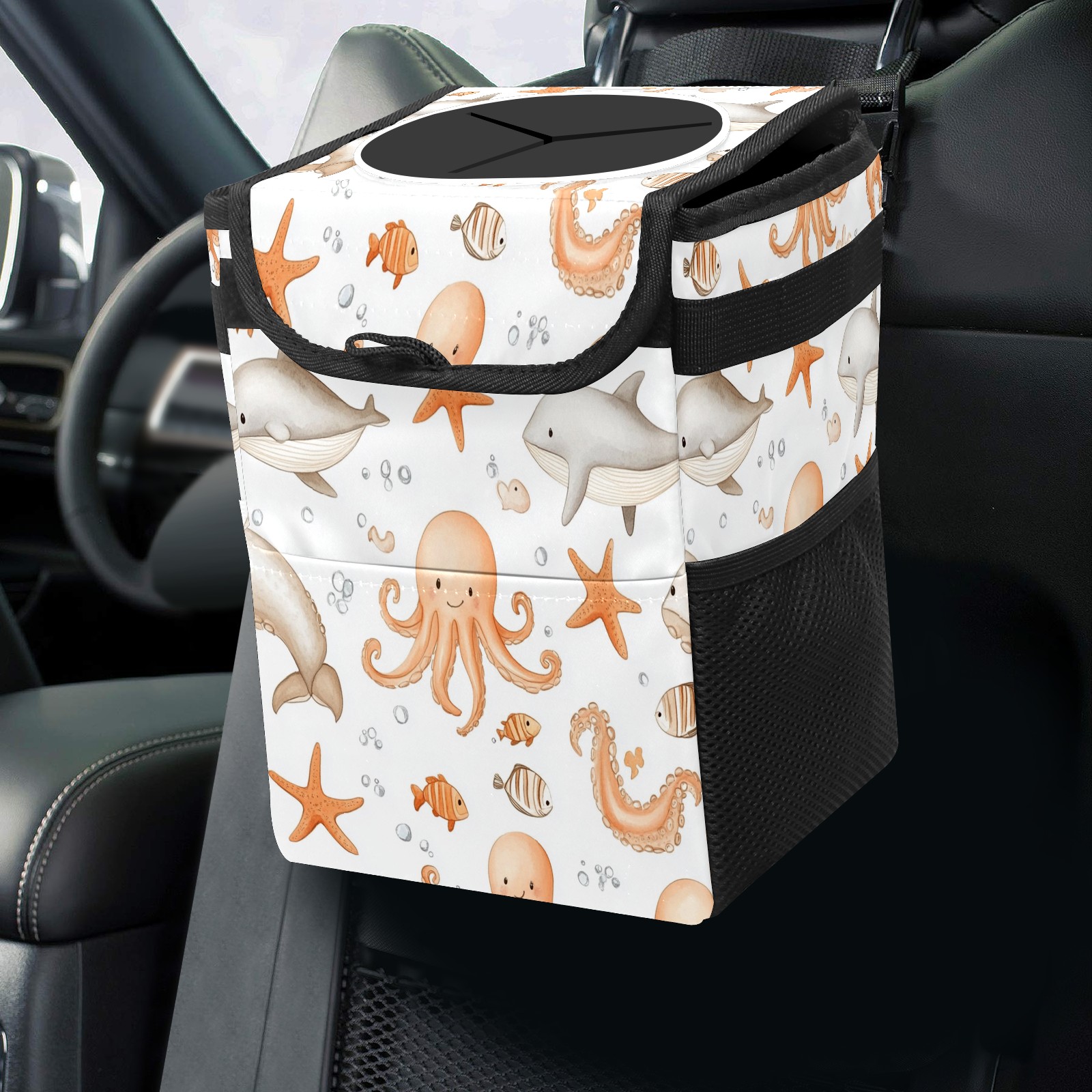 Car Trash Can with Lid, Small Portable Hanging Automotive Garbage Bin for Vehicles, Leakproof Waste Bag Container for SUV Truck Van Interior Auto Travel Road Trips(Whale And Starfish)