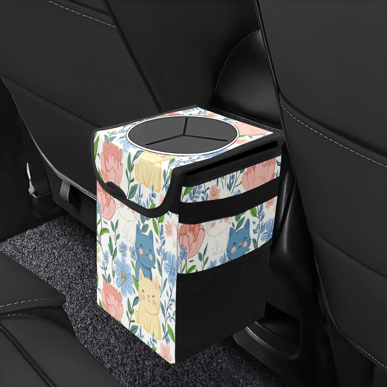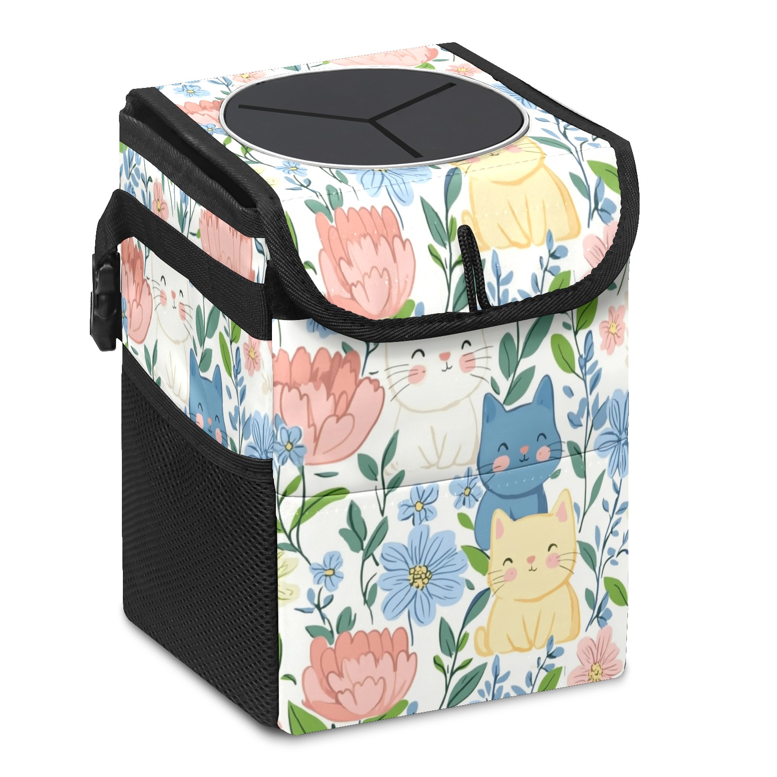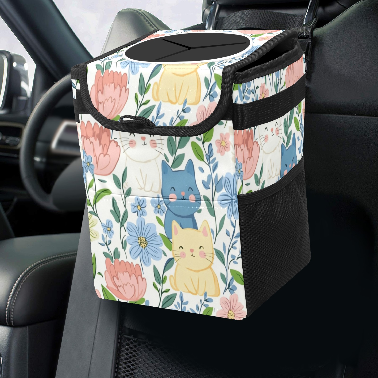 Car Trash Can with Lid, Small Portable Hanging Automotive Garbage Bin for Vehicles, Leakproof Waste Bag Container for SUV Truck Van Interior Auto Travel Road Trips(Cats In Flowers)
