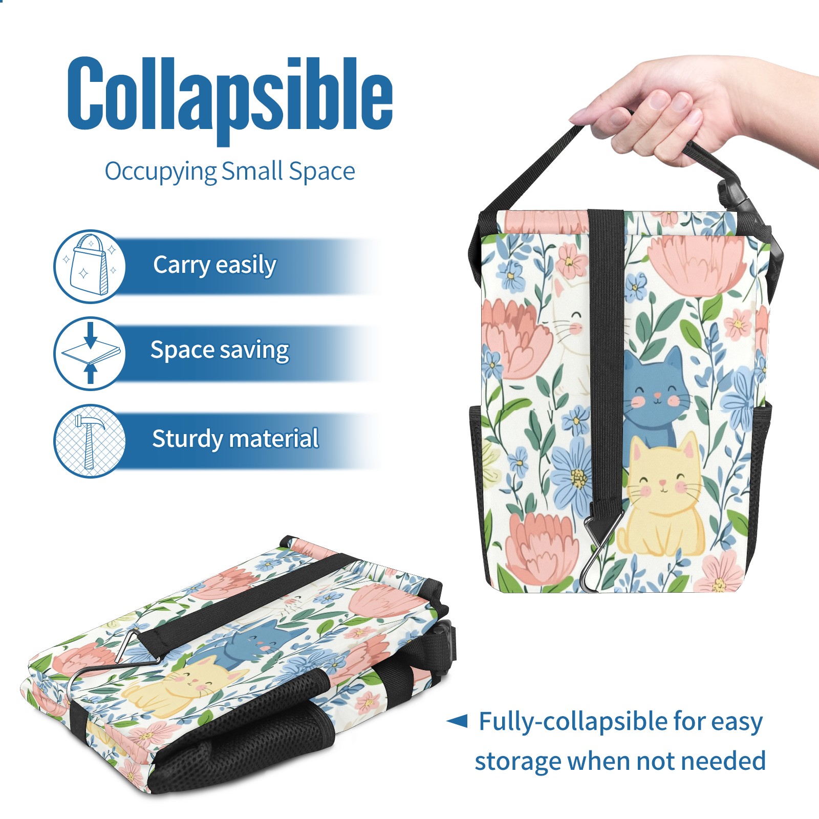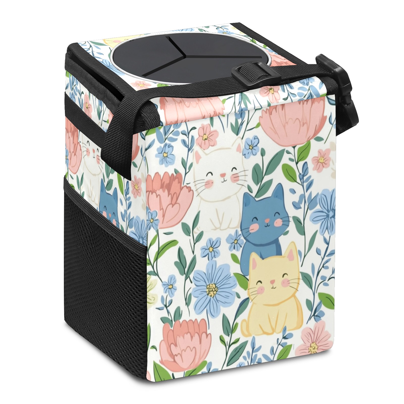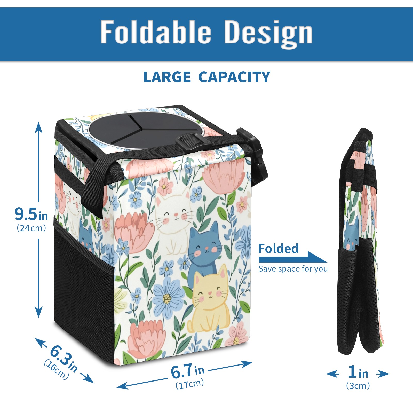 Car Trash Can with Lid, Small Portable Hanging Automotive Garbage Bin for Vehicles, Leakproof Waste Bag Container for SUV Truck Van Interior Auto Travel Road Trips(Cats In Flowers)