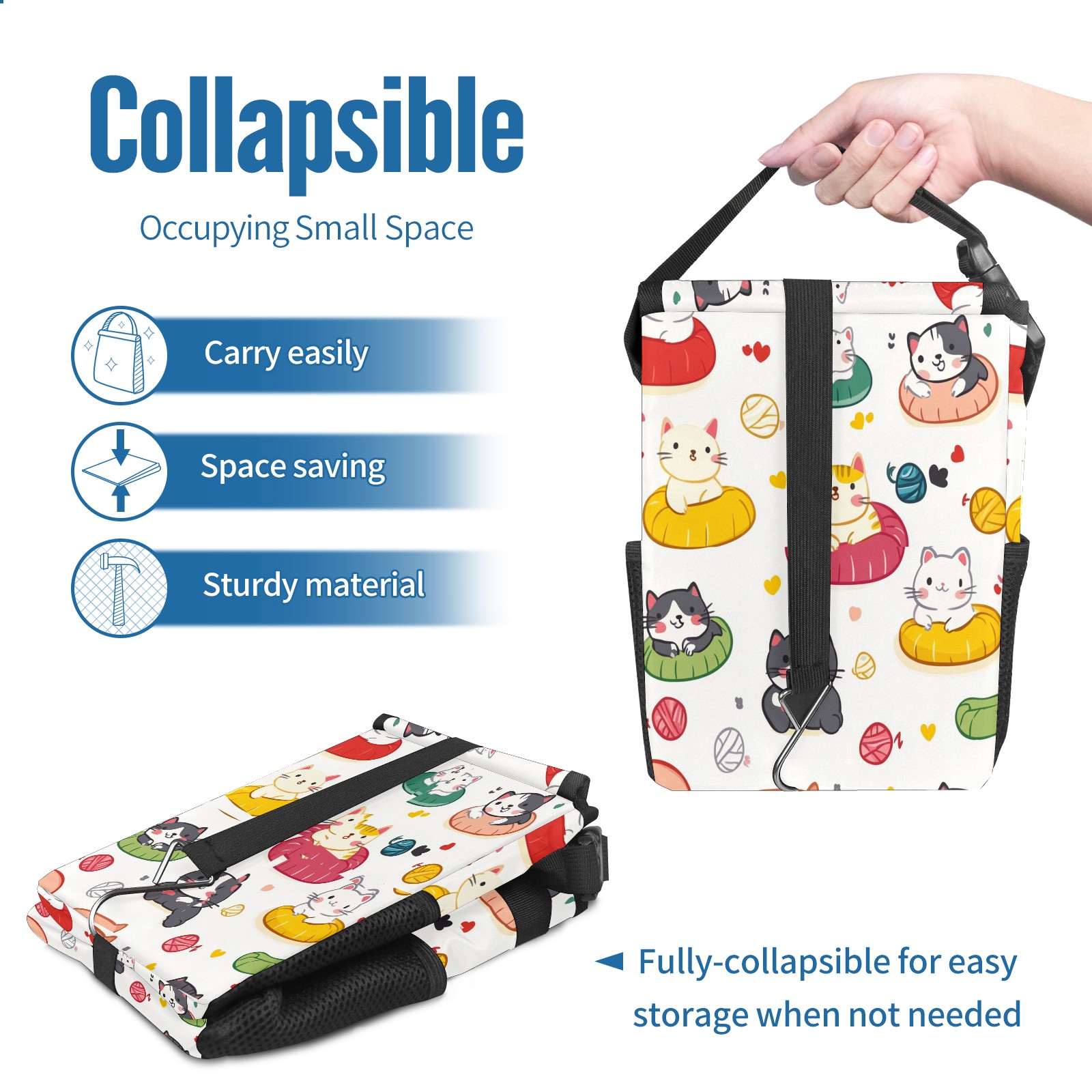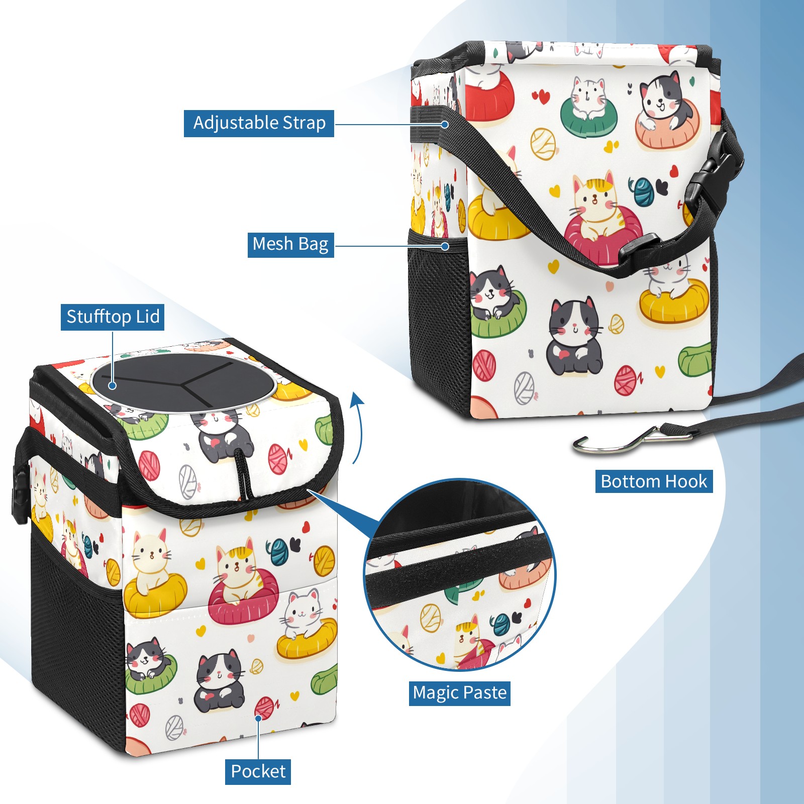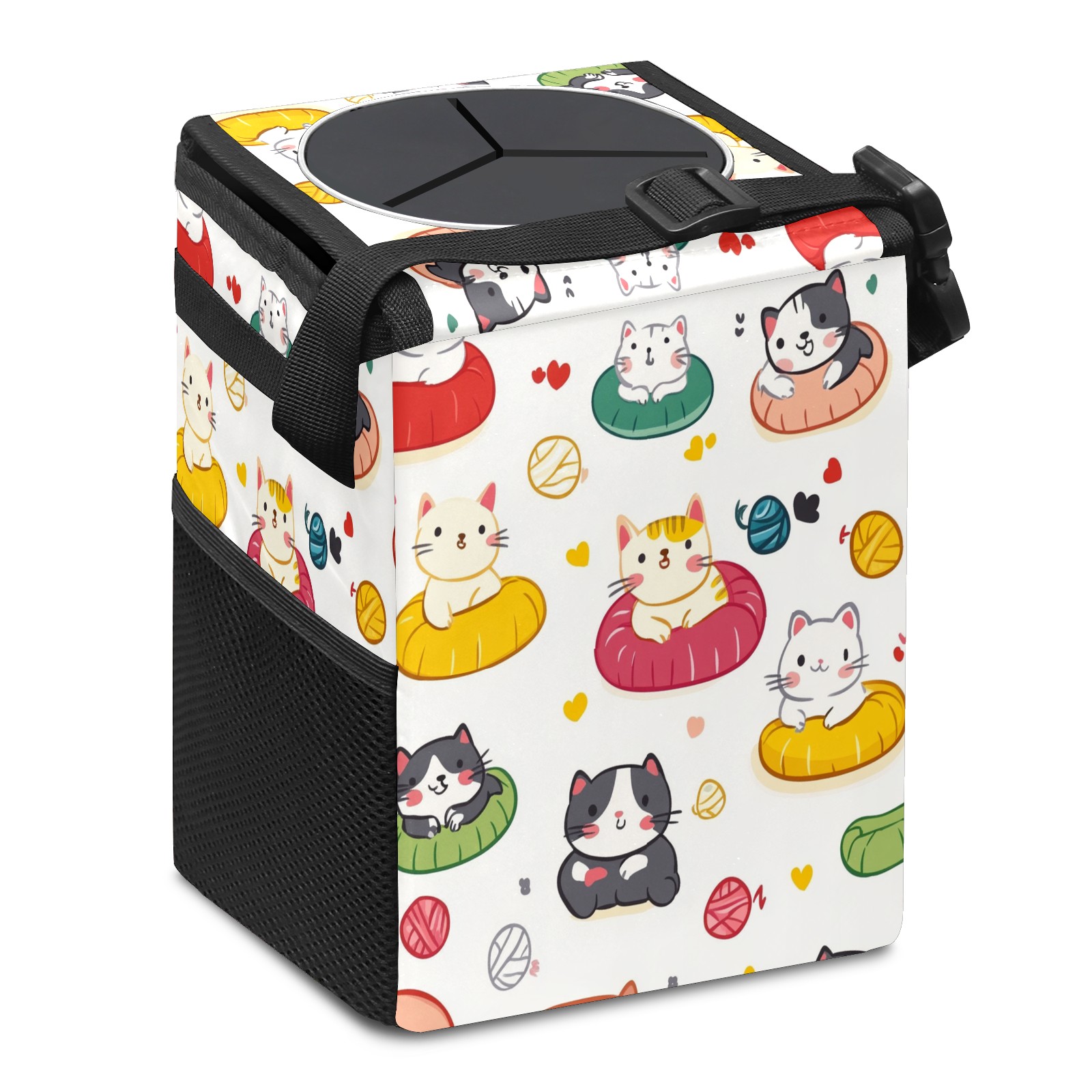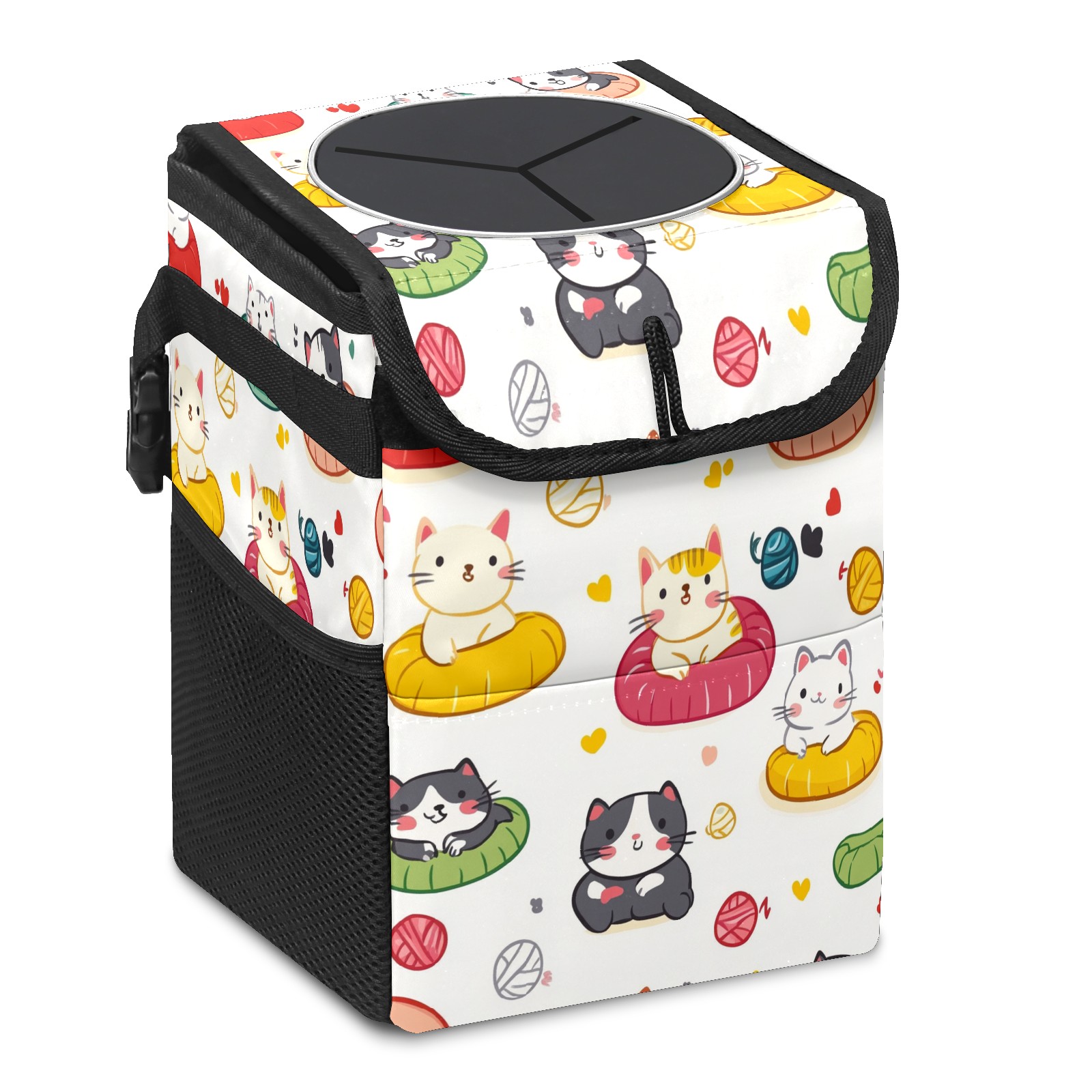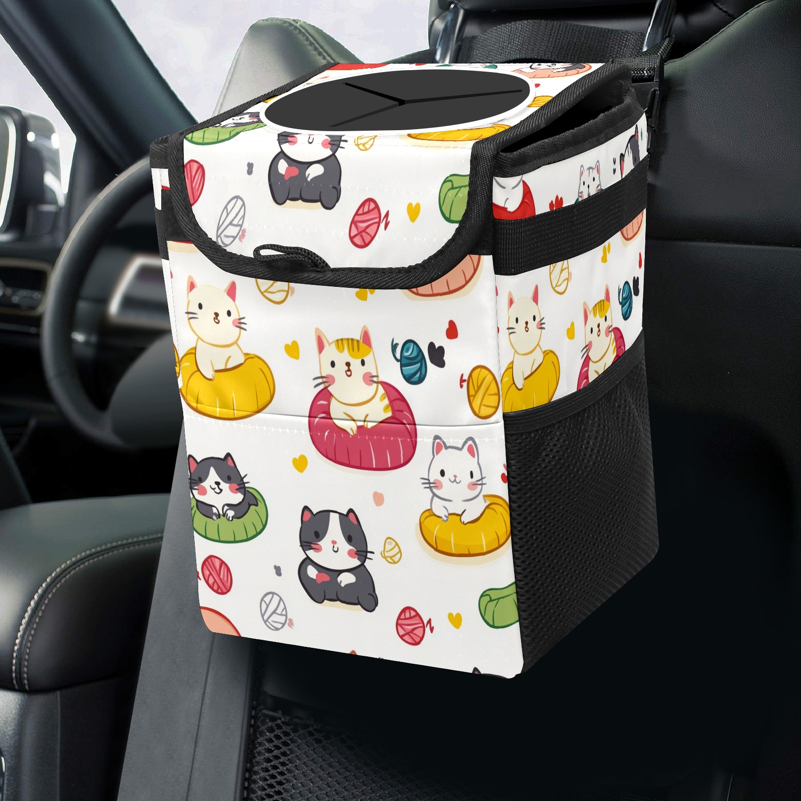 Car Trash Can with Lid, Small Portable Hanging Automotive Garbage Bin for Vehicles, Leakproof Waste Bag Container for SUV Truck Van Interior Auto Travel Road Trips(Cats Playing With Toys)