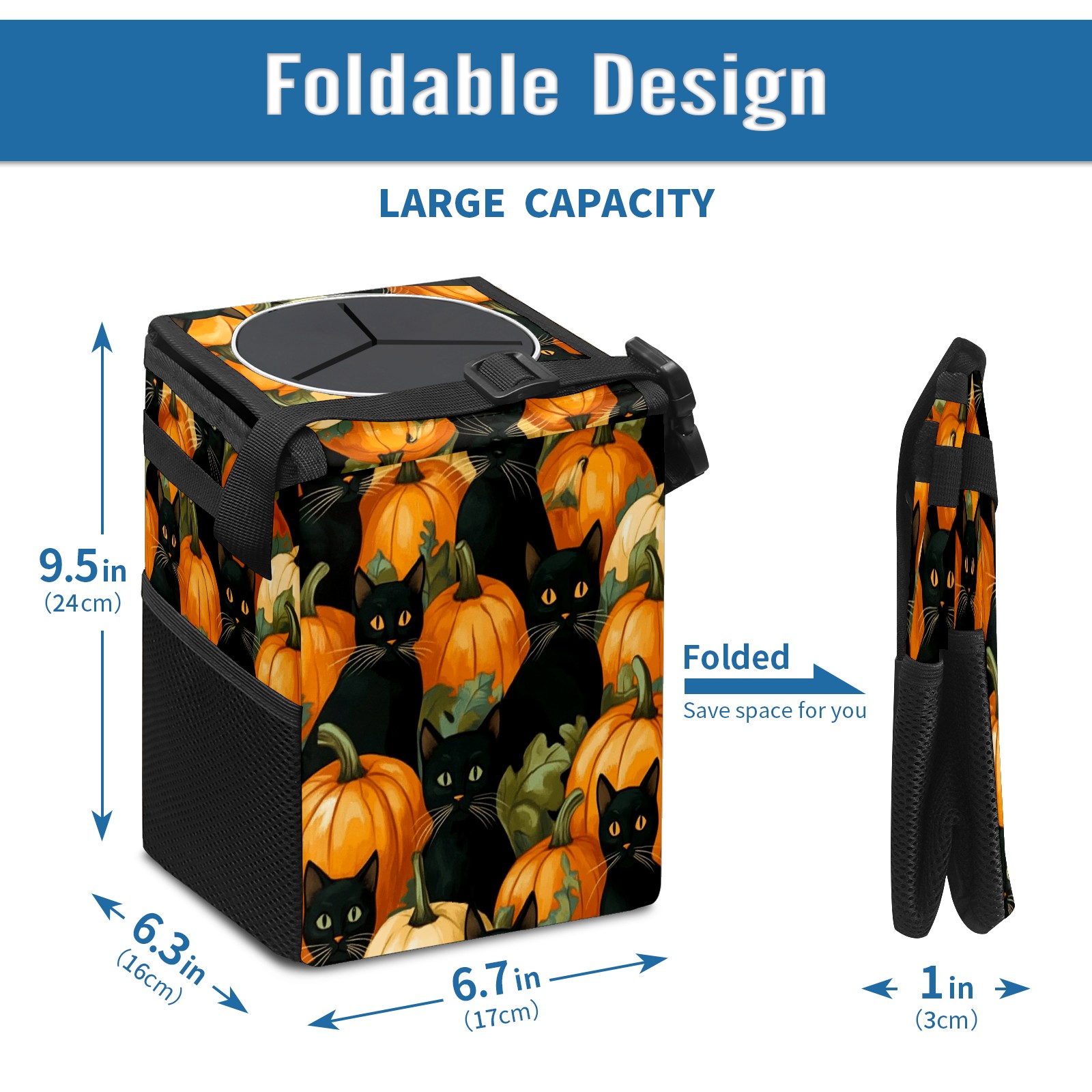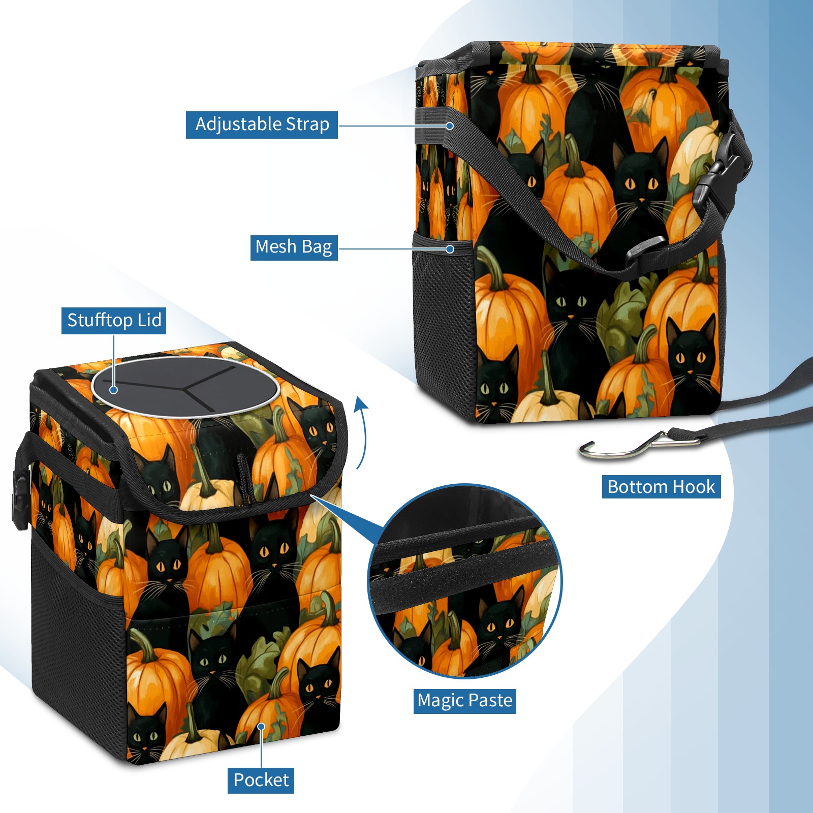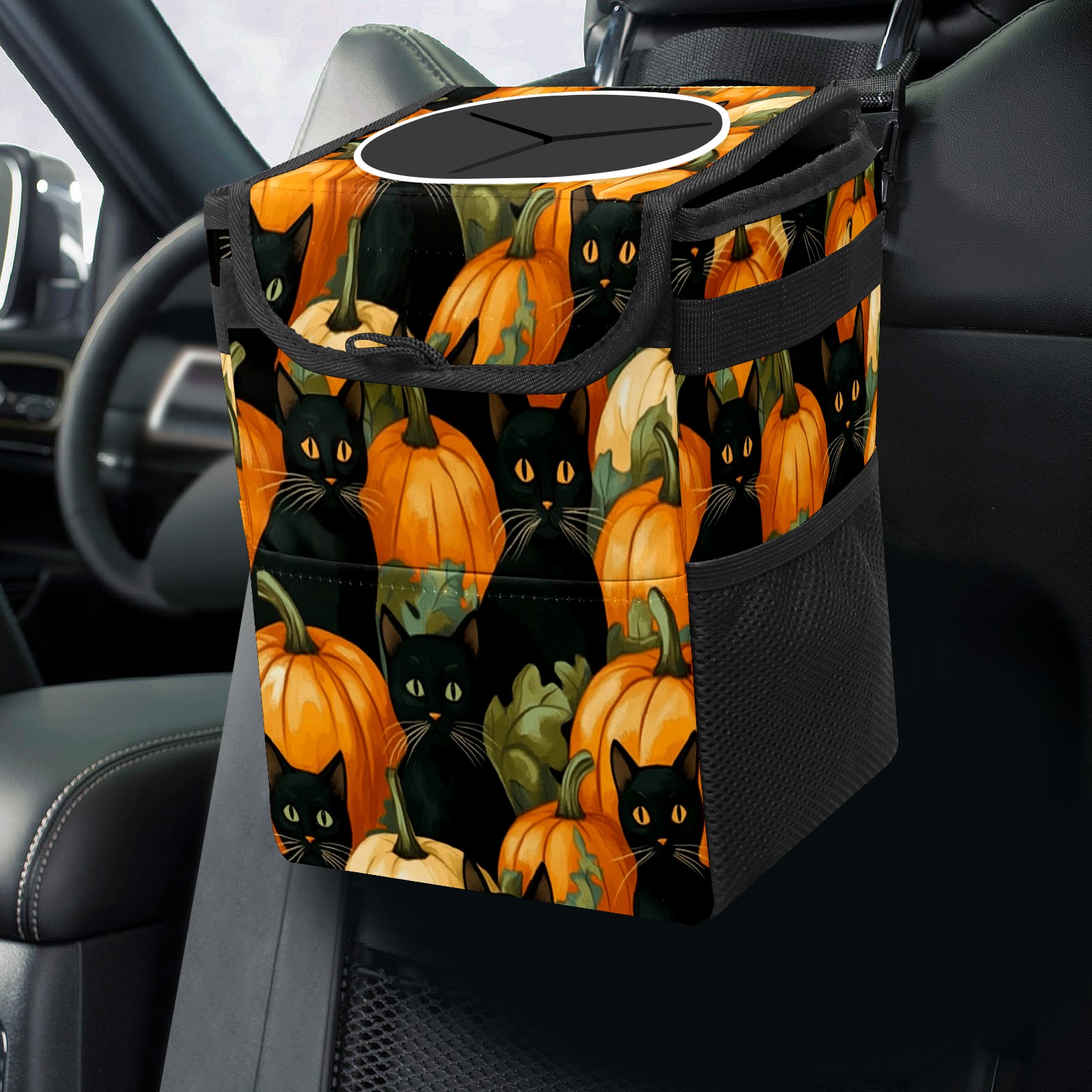 Car Trash Can with Lid, Small Portable Hanging Automotive Garbage Bin for Vehicles, Leakproof Waste Bag Container for SUV Truck Van Interior Auto Travel Road Trips(Black Cats And Pumpkins)