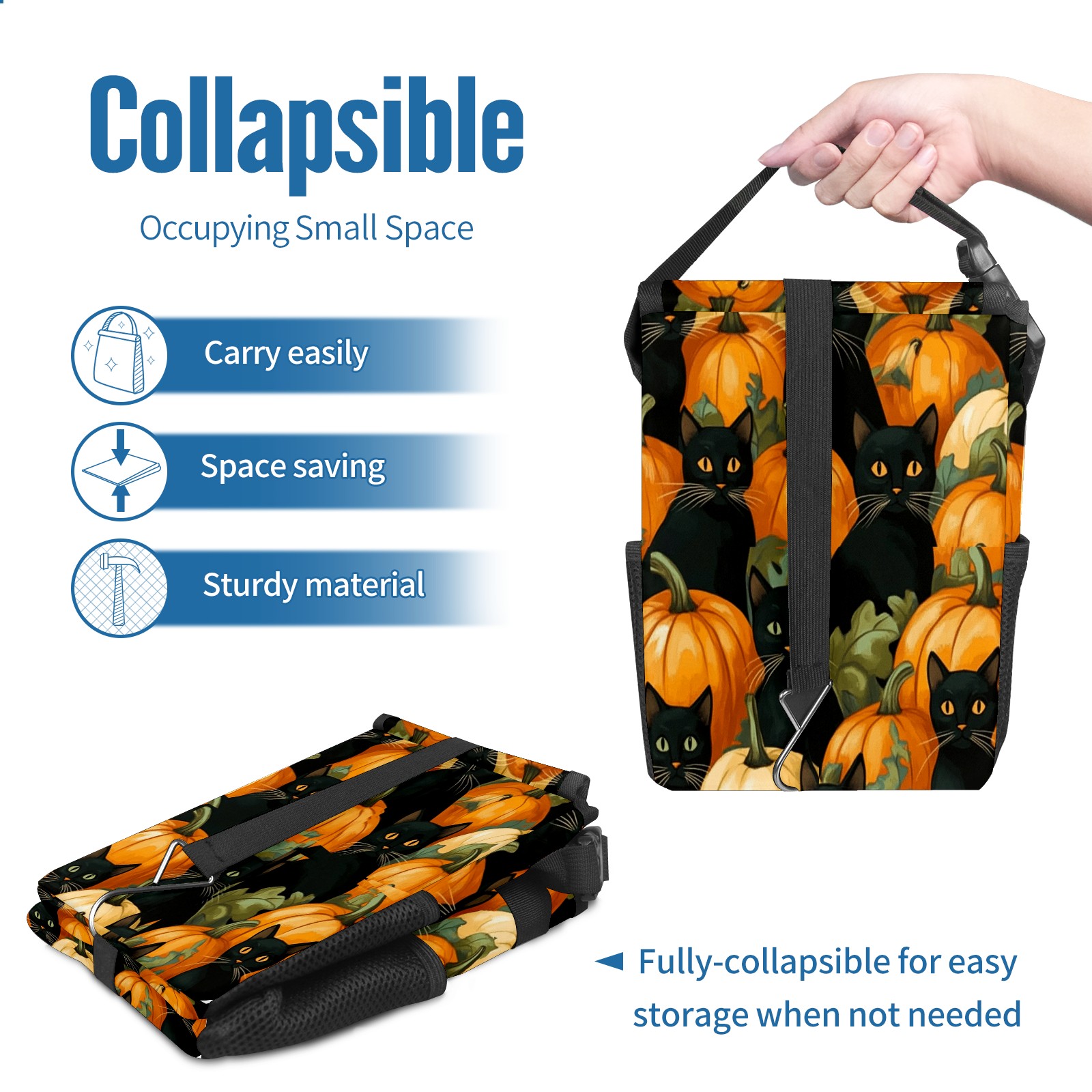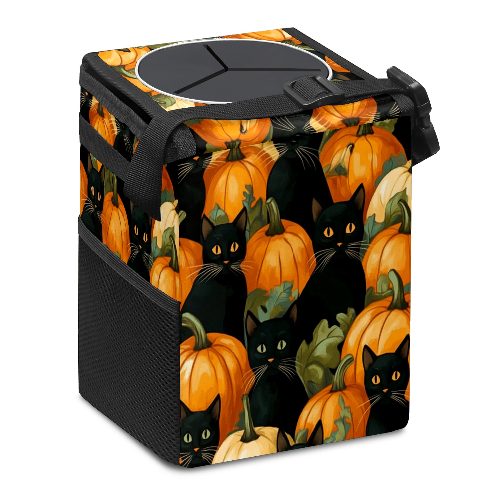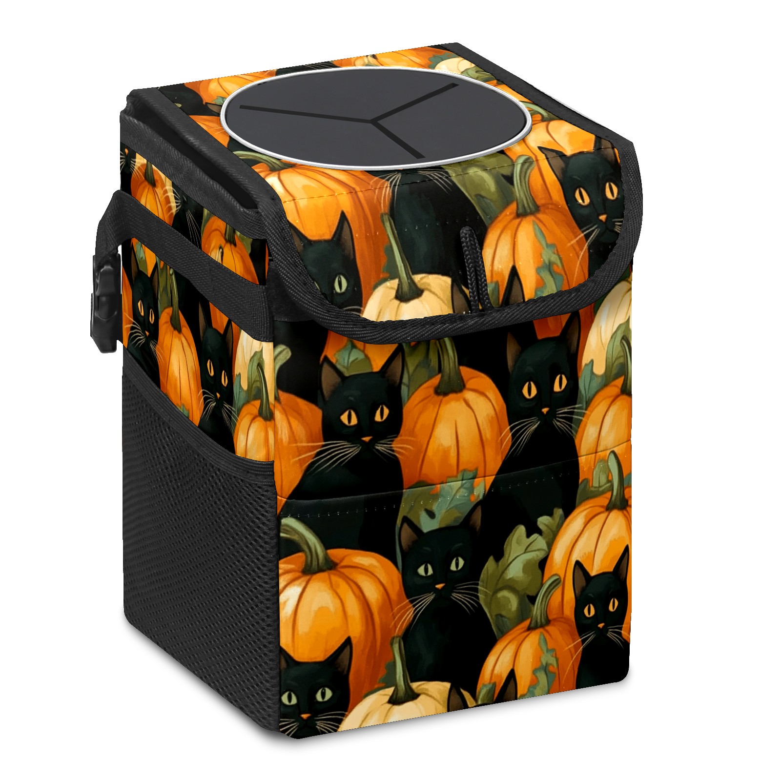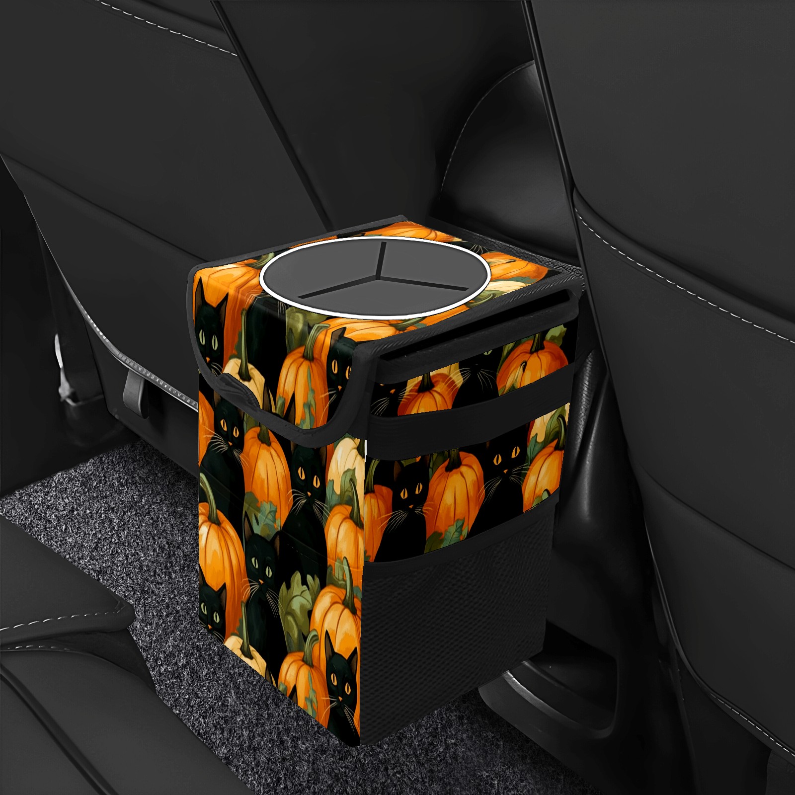 Car Trash Can with Lid, Small Portable Hanging Automotive Garbage Bin for Vehicles, Leakproof Waste Bag Container for SUV Truck Van Interior Auto Travel Road Trips(Black Cats And Pumpkins)