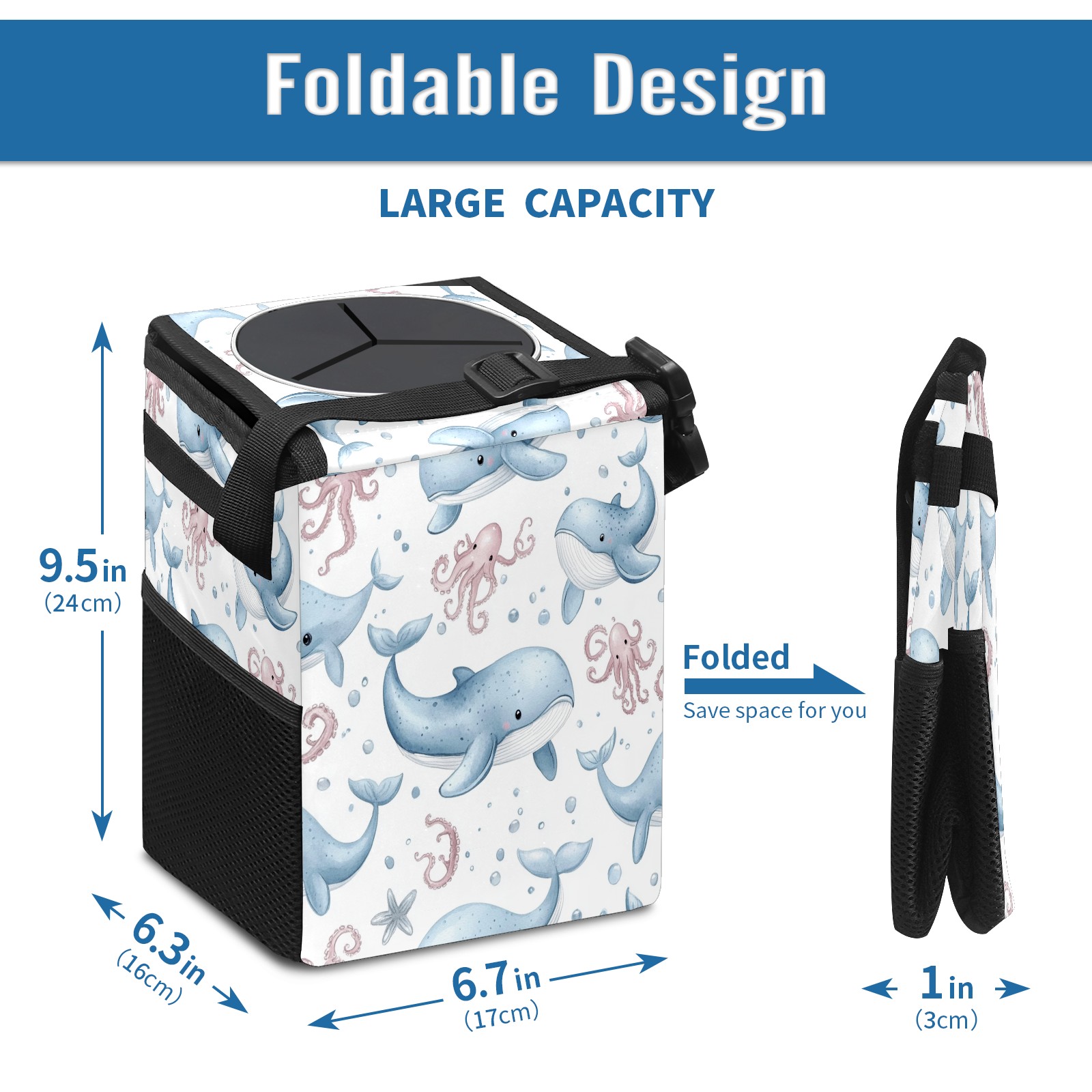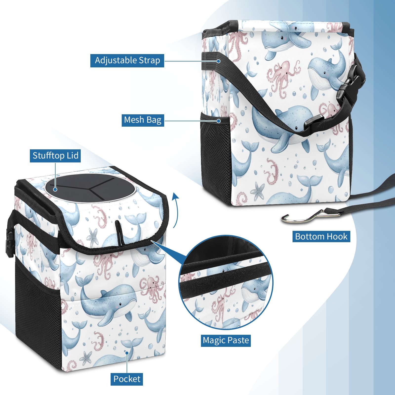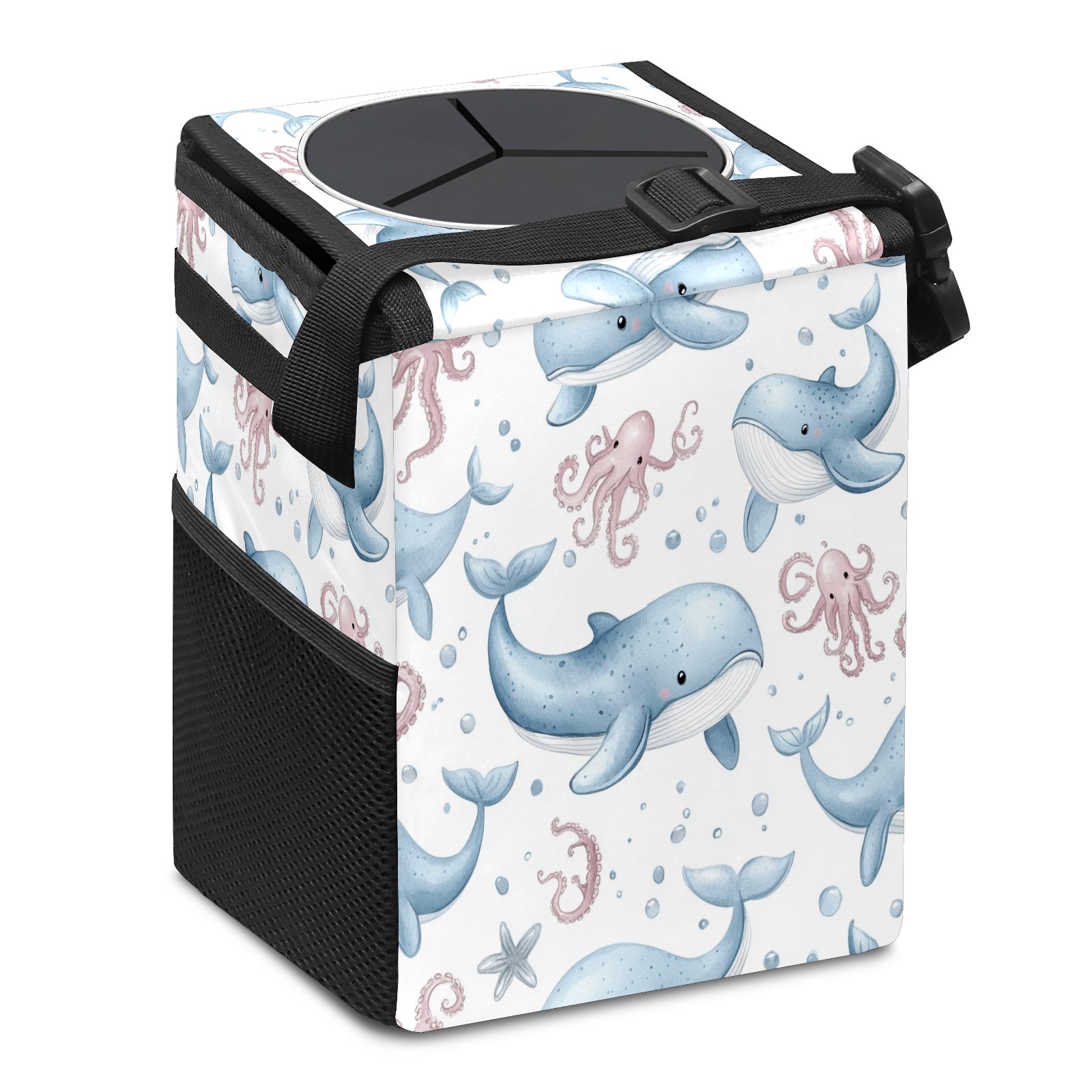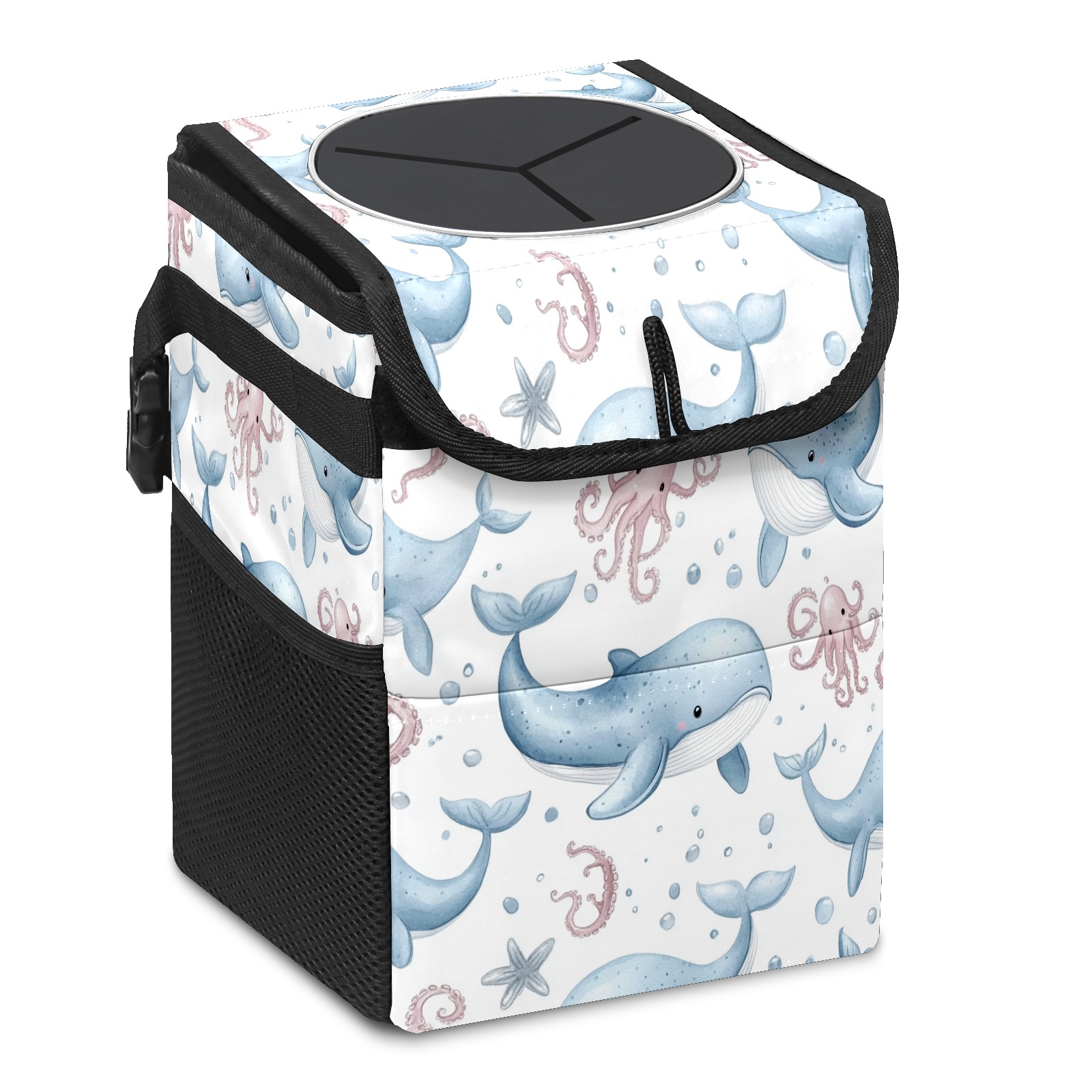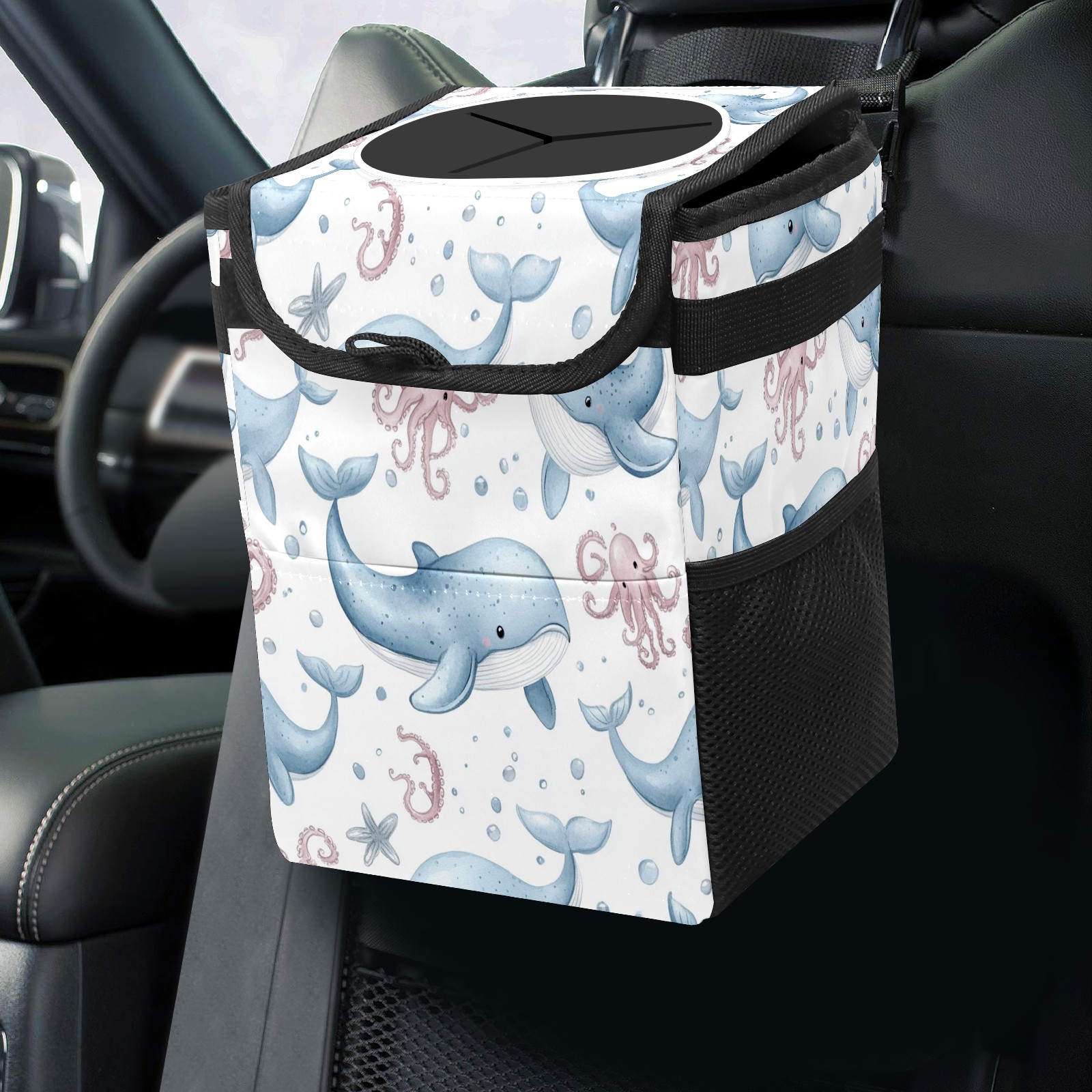 Car Trash Can with Lid, Small Portable Hanging Automotive Garbage Bin for Vehicles, Leakproof Waste Bag Container for SUV Truck Van Interior Auto Travel Road Trips(Whales Octopus)