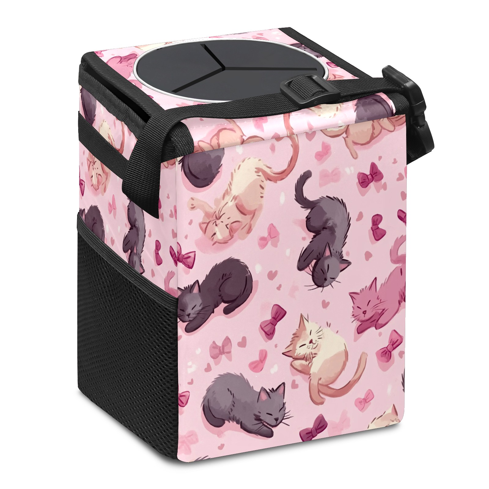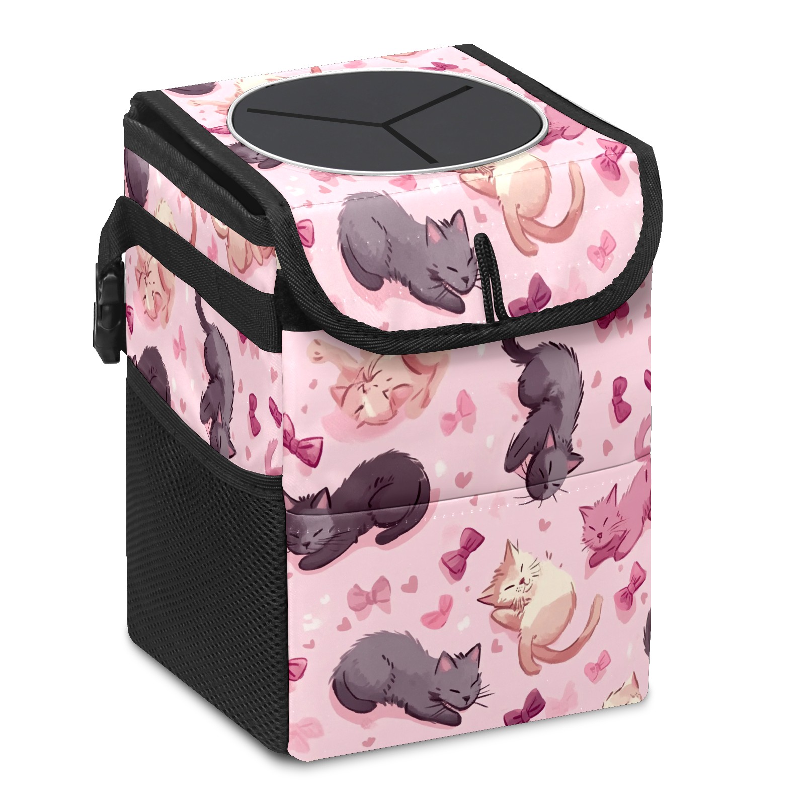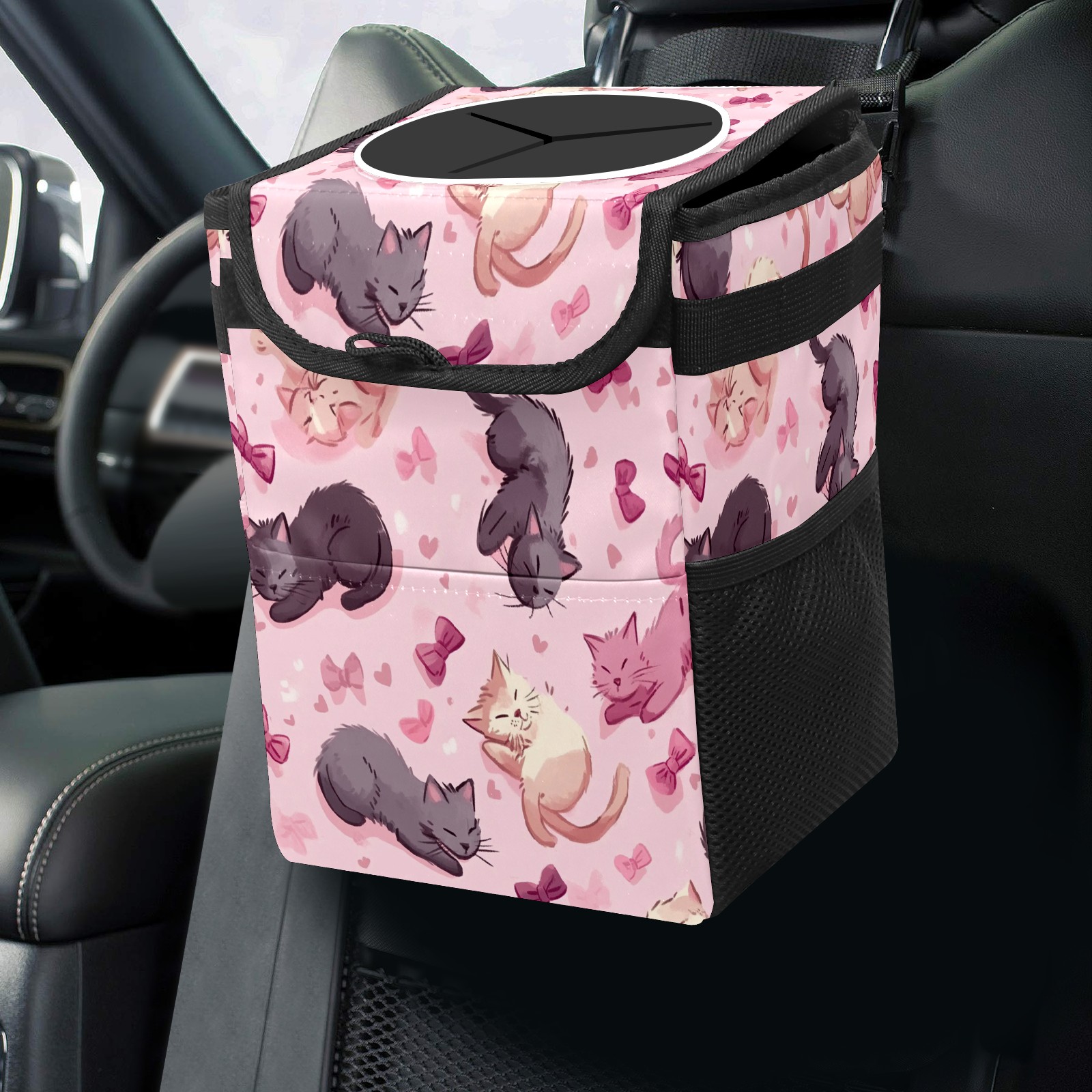 Car Trash Can with Lid, Small Portable Hanging Automotive Garbage Bin for Vehicles, Leakproof Waste Bag Container for SUV Truck Van Interior Auto Travel Road Trips(Cats Play And Sleep)