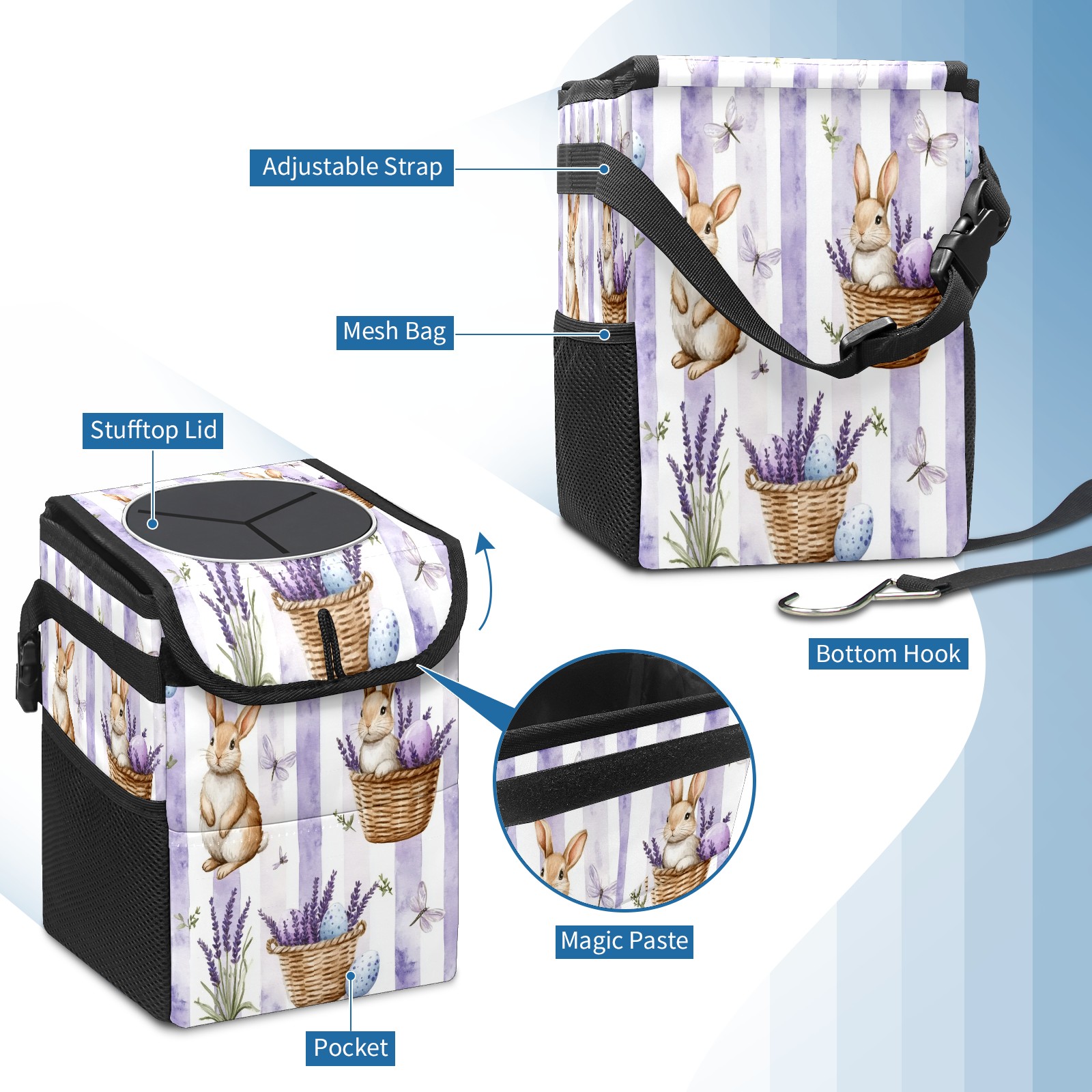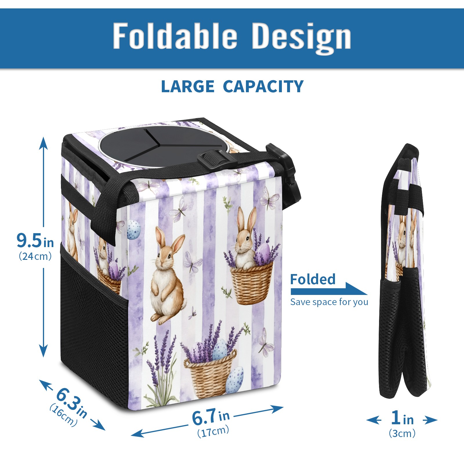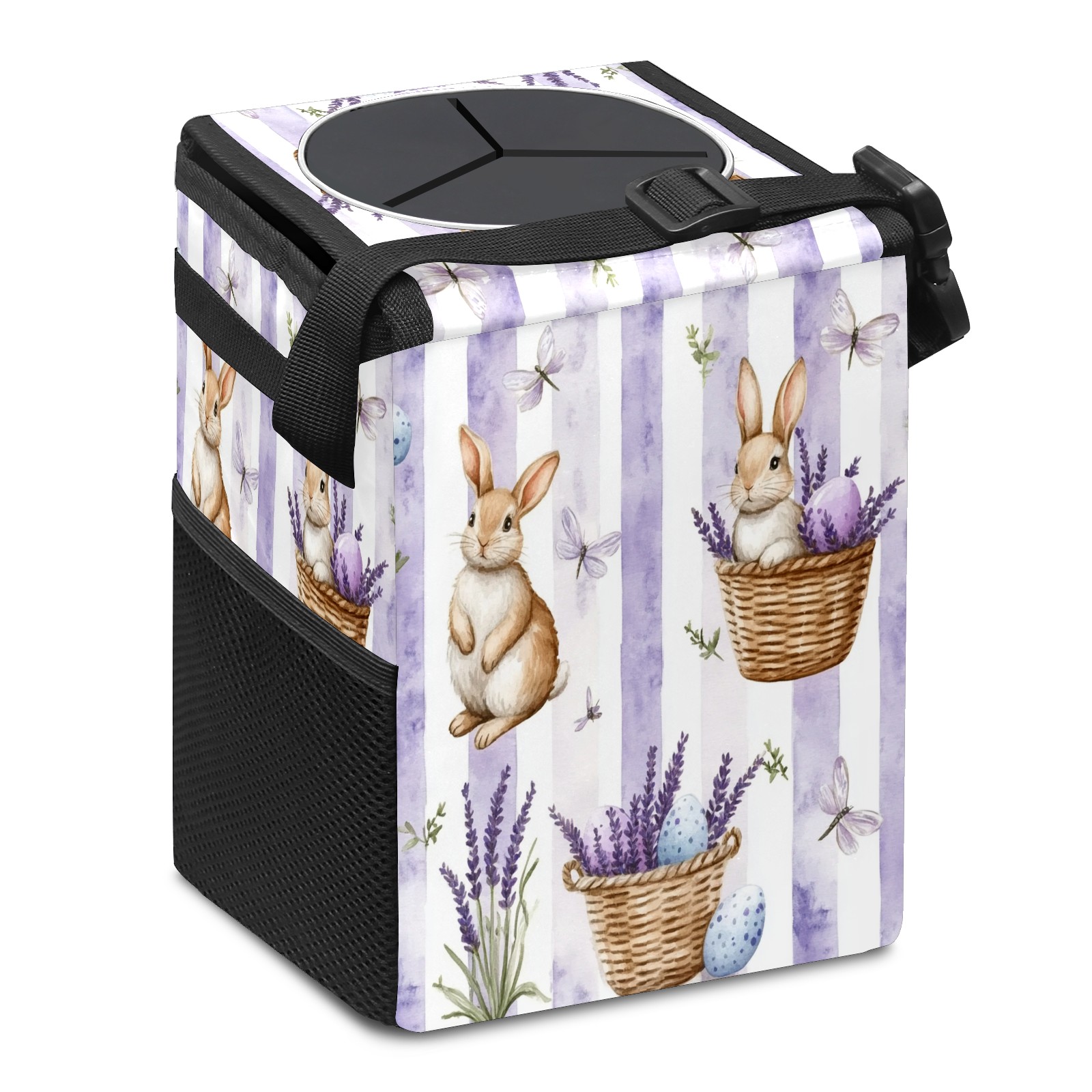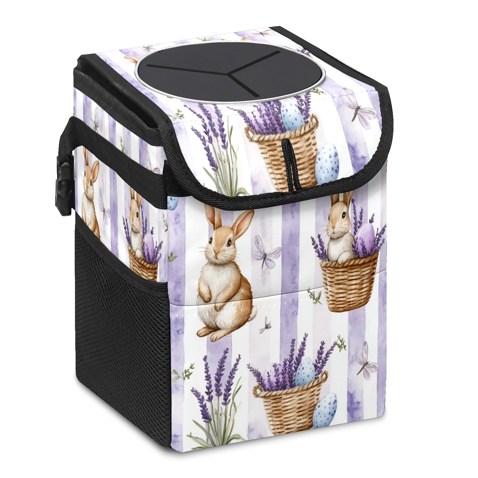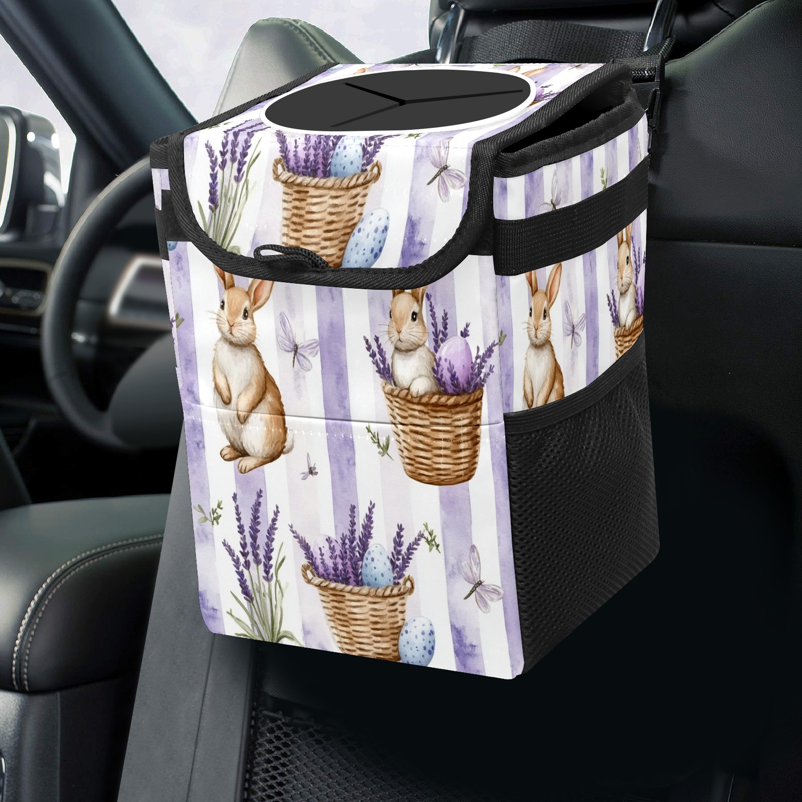 Car Trash Can with Lid, Small Portable Hanging Automotive Garbage Bin for Vehicles, Leakproof Waste Bag Container for SUV Truck Van Interior Auto Travel Road Trips(Bunnies And Lavender)