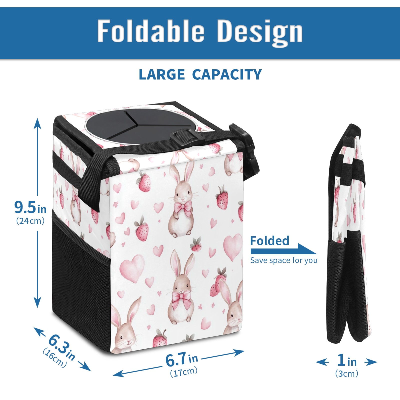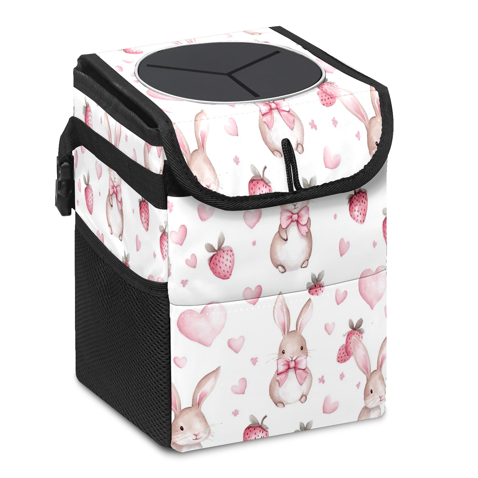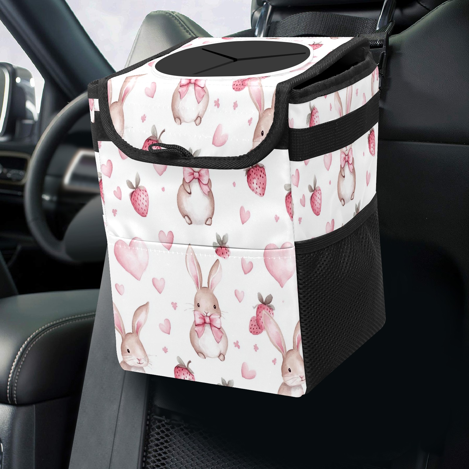 Car Trash Can with Lid, Small Portable Hanging Automotive Garbage Bin for Vehicles, Leakproof Waste Bag Container for SUV Truck Van Interior Auto Travel Road Trips(Bunnies And Strawberry)